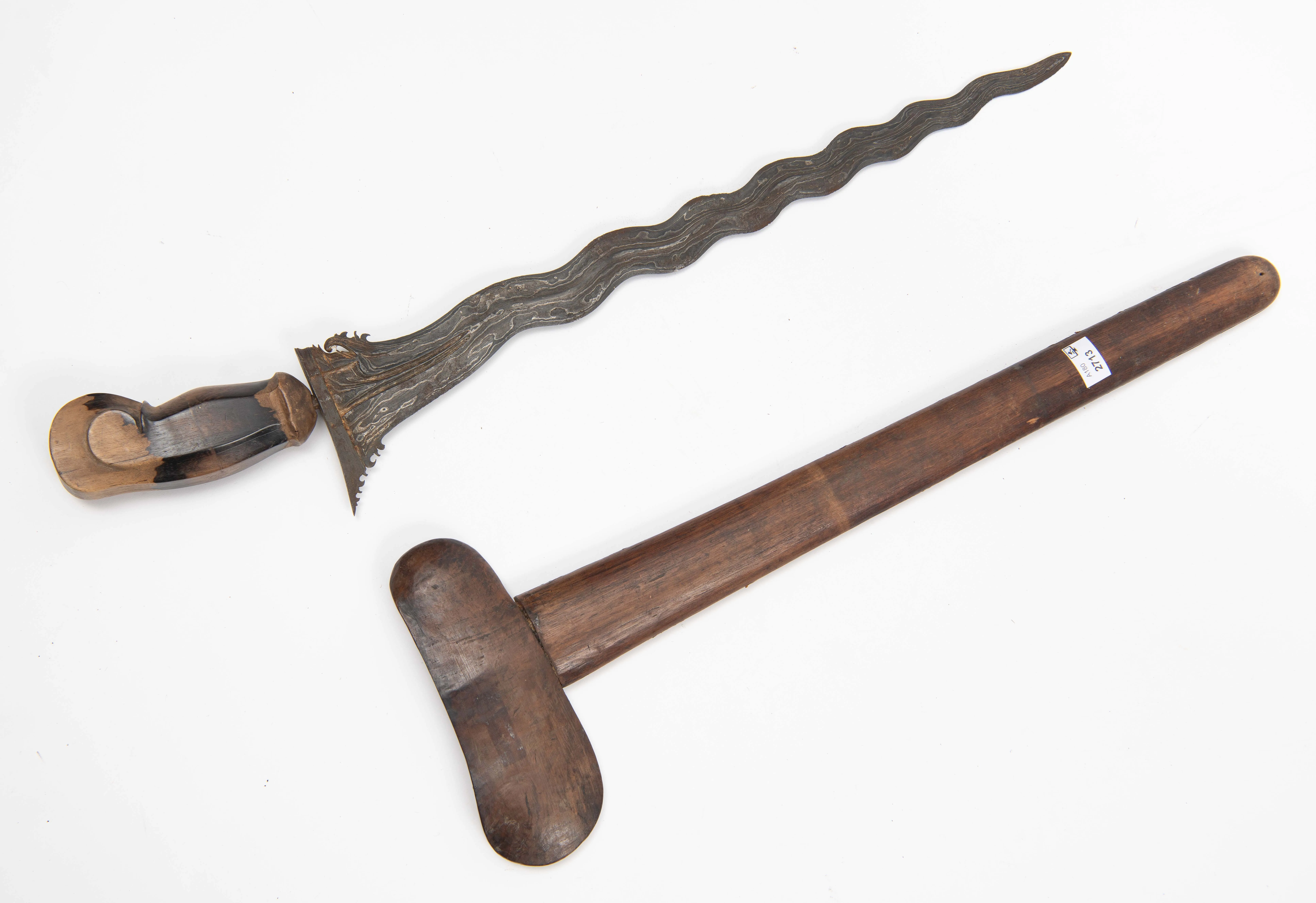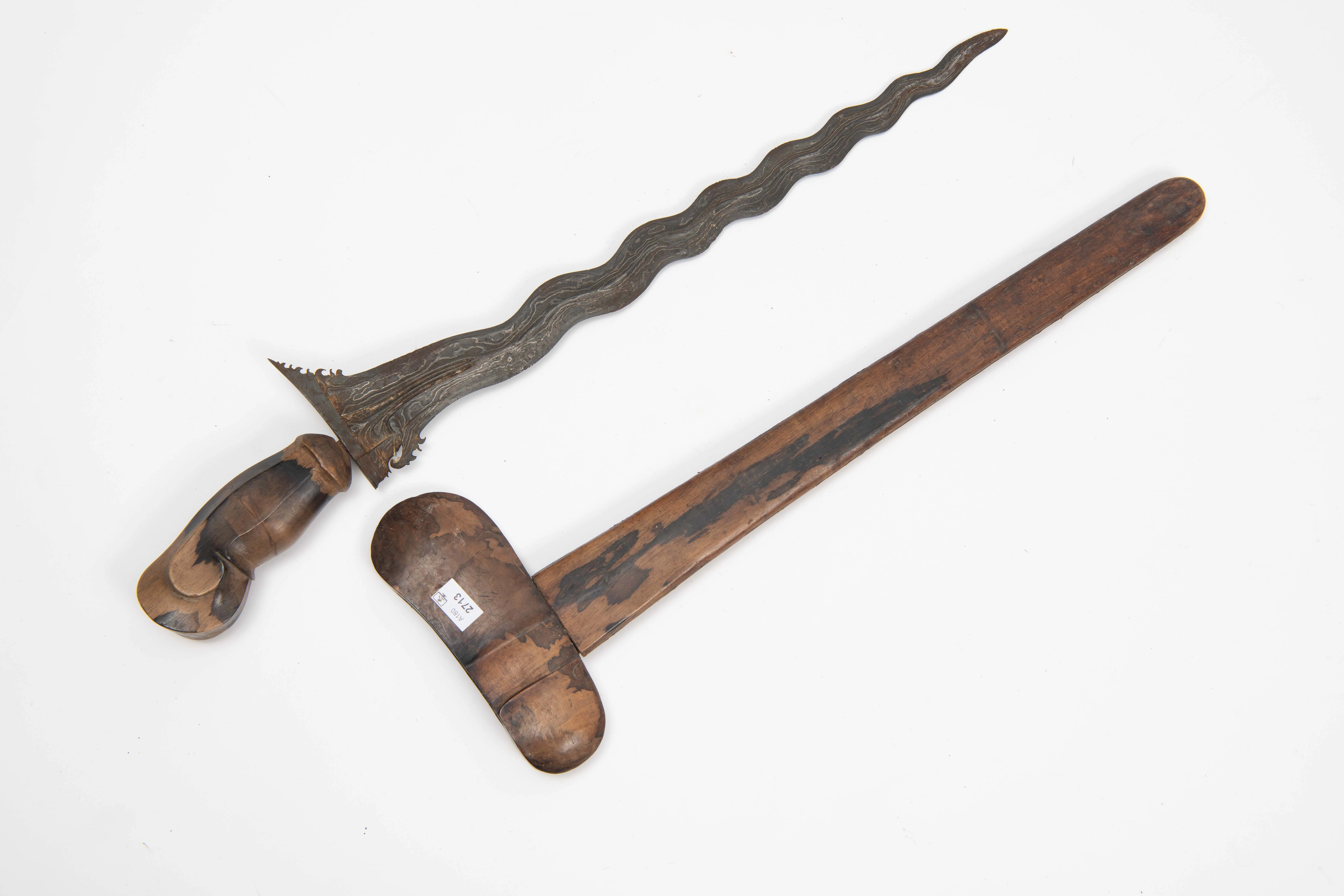 Indonesien, Bali, um 1900. Dekorativ gemaserter Holzgriff, sitzt lose auf der Angel. Geflammte Klinge (L 46 cm) aus schön gemasertem Pamor mit stellenweise Flugrost. L 59 cm. Holzscheide en suite mit Griffstück. L 58,5 cm.