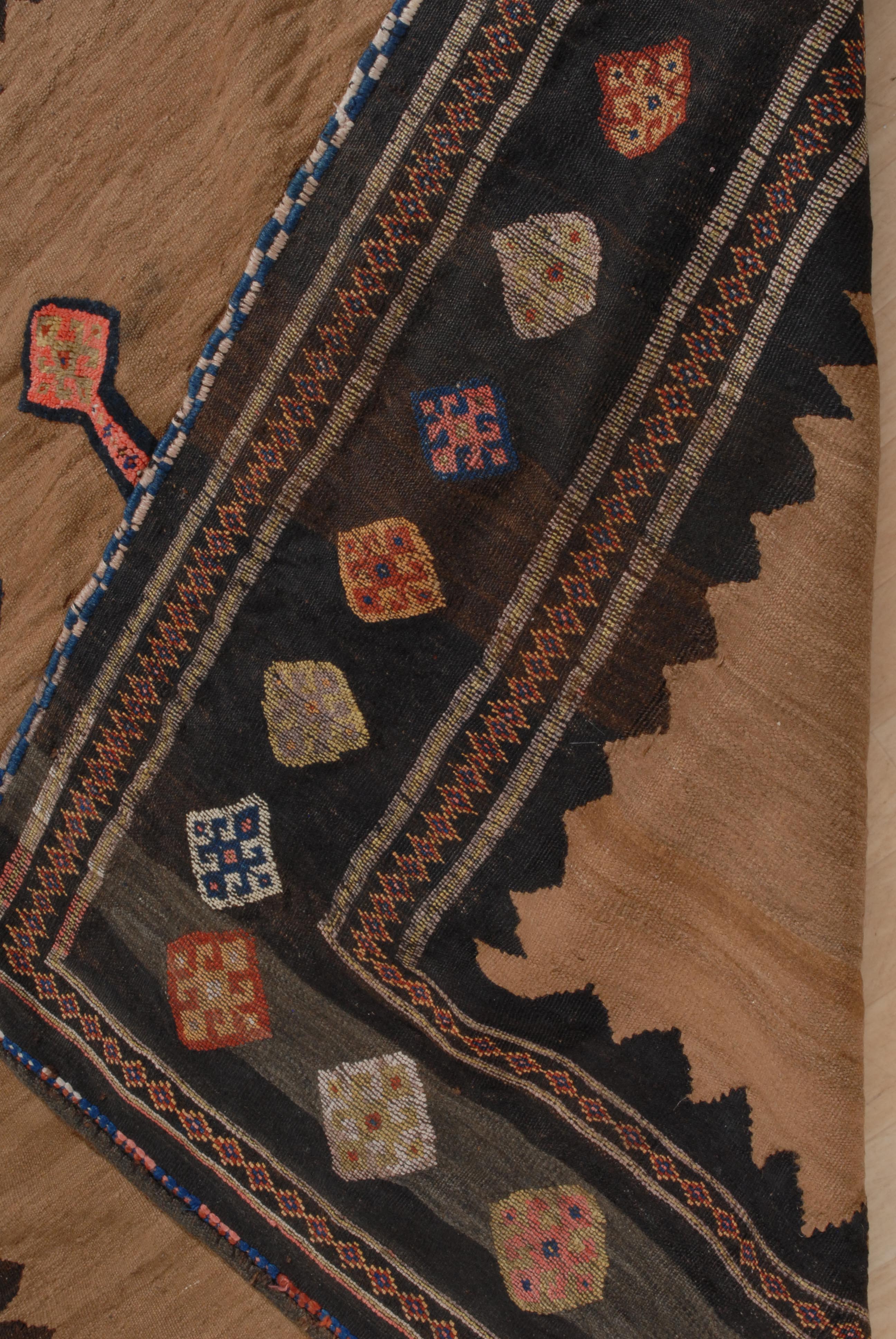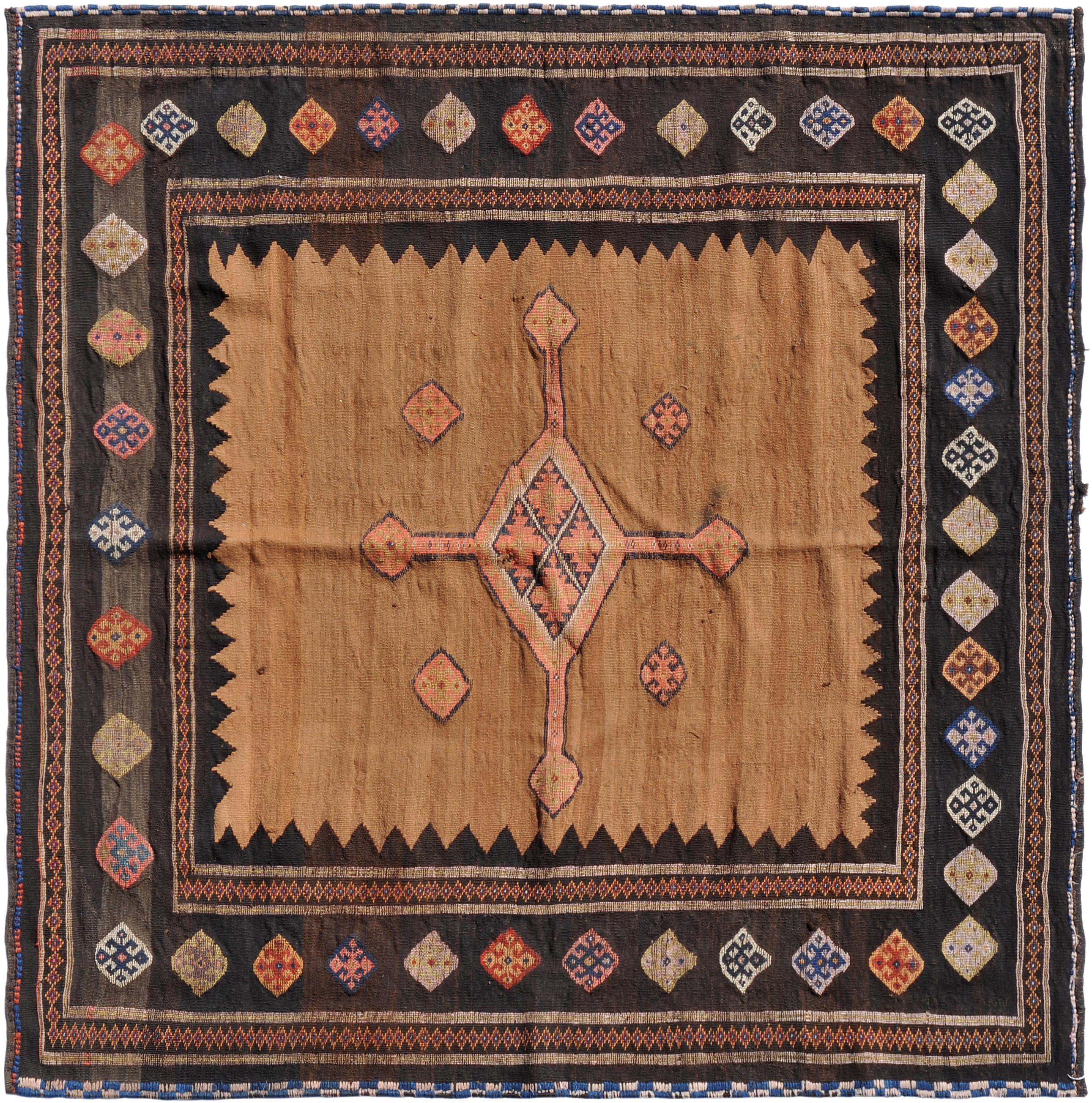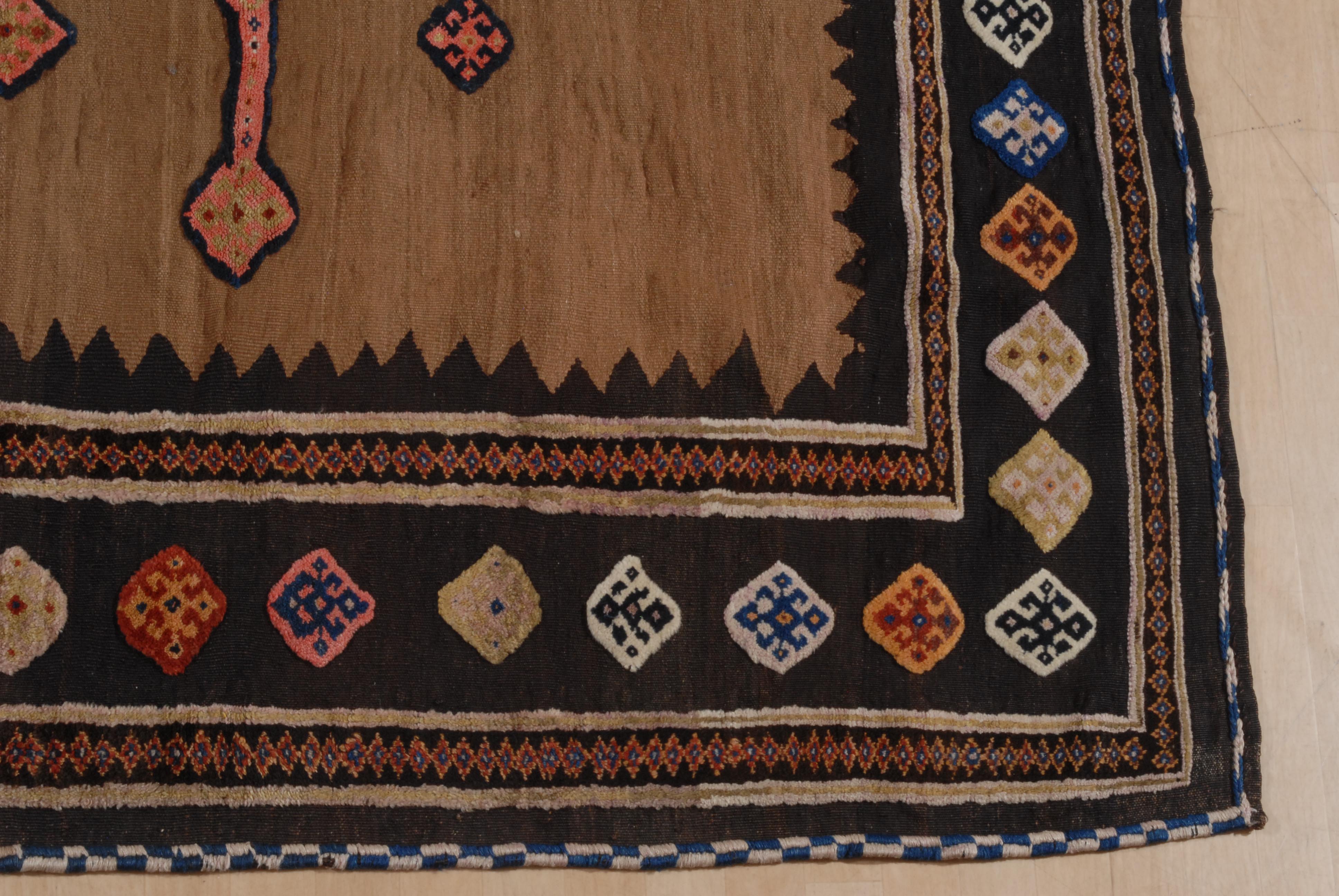Z-Iran, um 1920. Reliefarbeit. Sehr elegantes und zeitgenössisches modernes Flachgewebe. Im kamelhaarfarbenen Mittelfeld figuriert ein kreuzförmiges Rautenmedaillon mit 4 langen, rautenbesetzten Ausläufern. Eine schwarze Zickzack-Borte trennt das Innenfeld von der Hauptbordüre, die mit vielfarbigen alternierenden Hakenrauten in unendlichem Rapport belegt ist. Gebrauchsspuren. 185x190 cm (ft. 6.1x6.3).