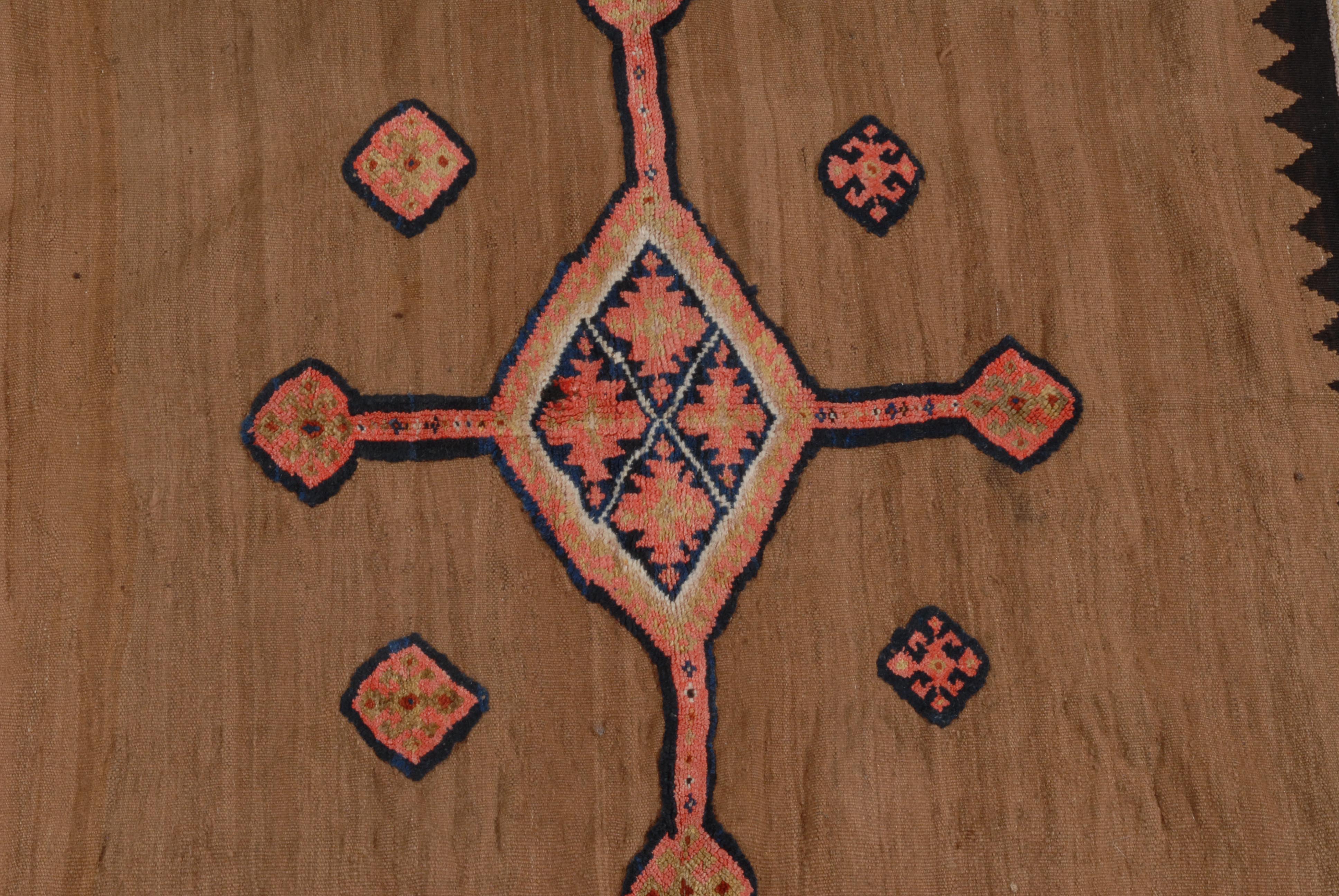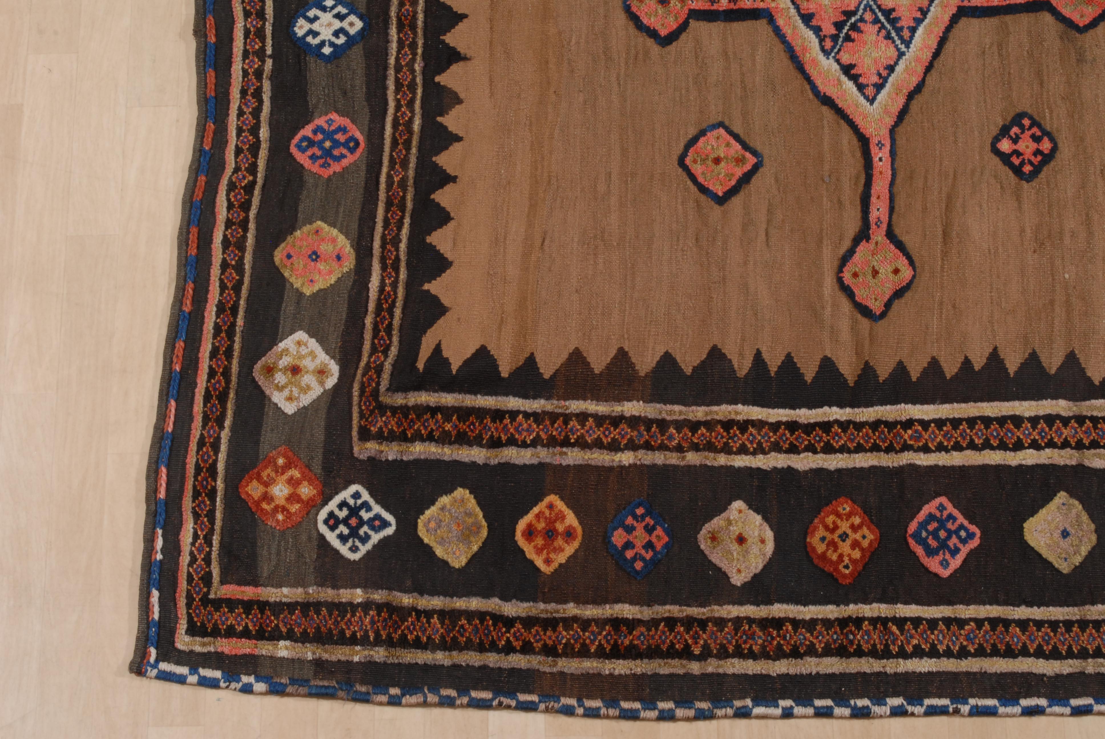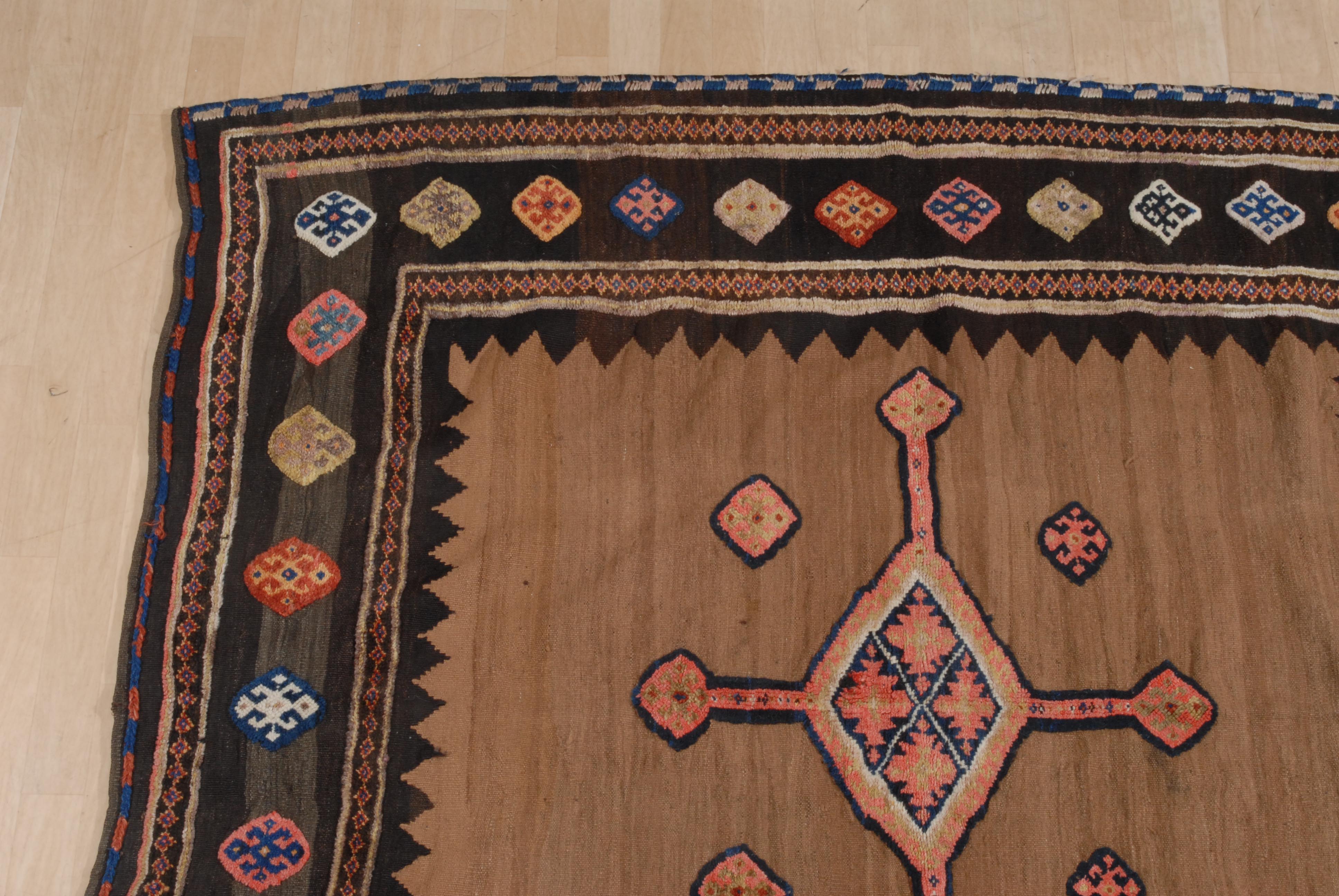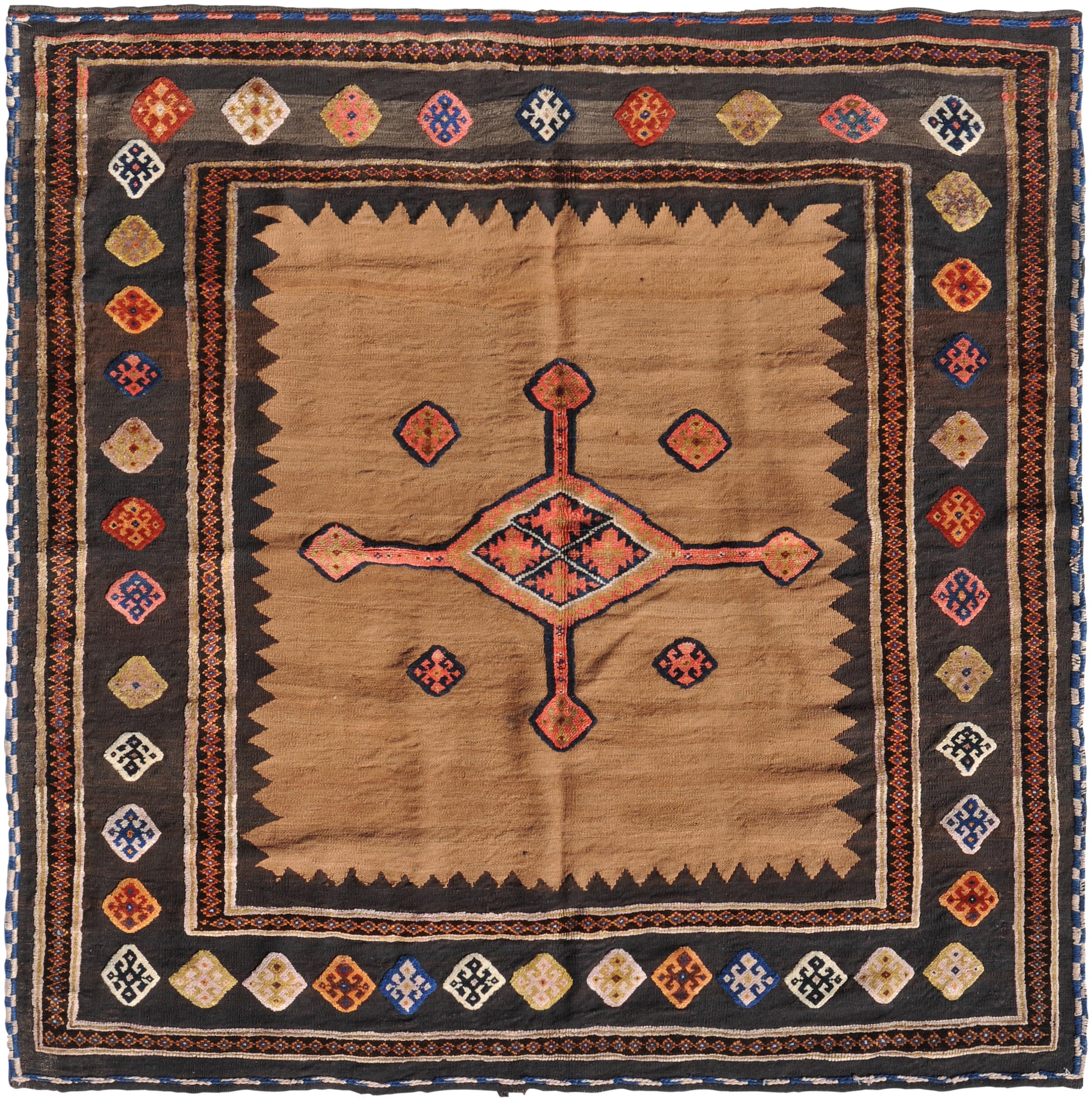 Z-Iran, um 1920. Reliefarbeit. Sehr elegantes und zeitgenössisches modernes Flachgewebe. Im kamelhaarfarbenen Mittelfeld figuriert ein kreuzförmiges Rautenmedaillon mit 4 langen, rautenbesetzten Ausläufern. Eine schwarze Zickzack-Borte trennt das Innenfeld von der Hauptbordüre, die mit vielfarbigen alternierenden Hakenrauten in unendlichem Rapport belegt ist. Gebrauchsspuren. 185x190 cm (ft. 6.1x6.3).