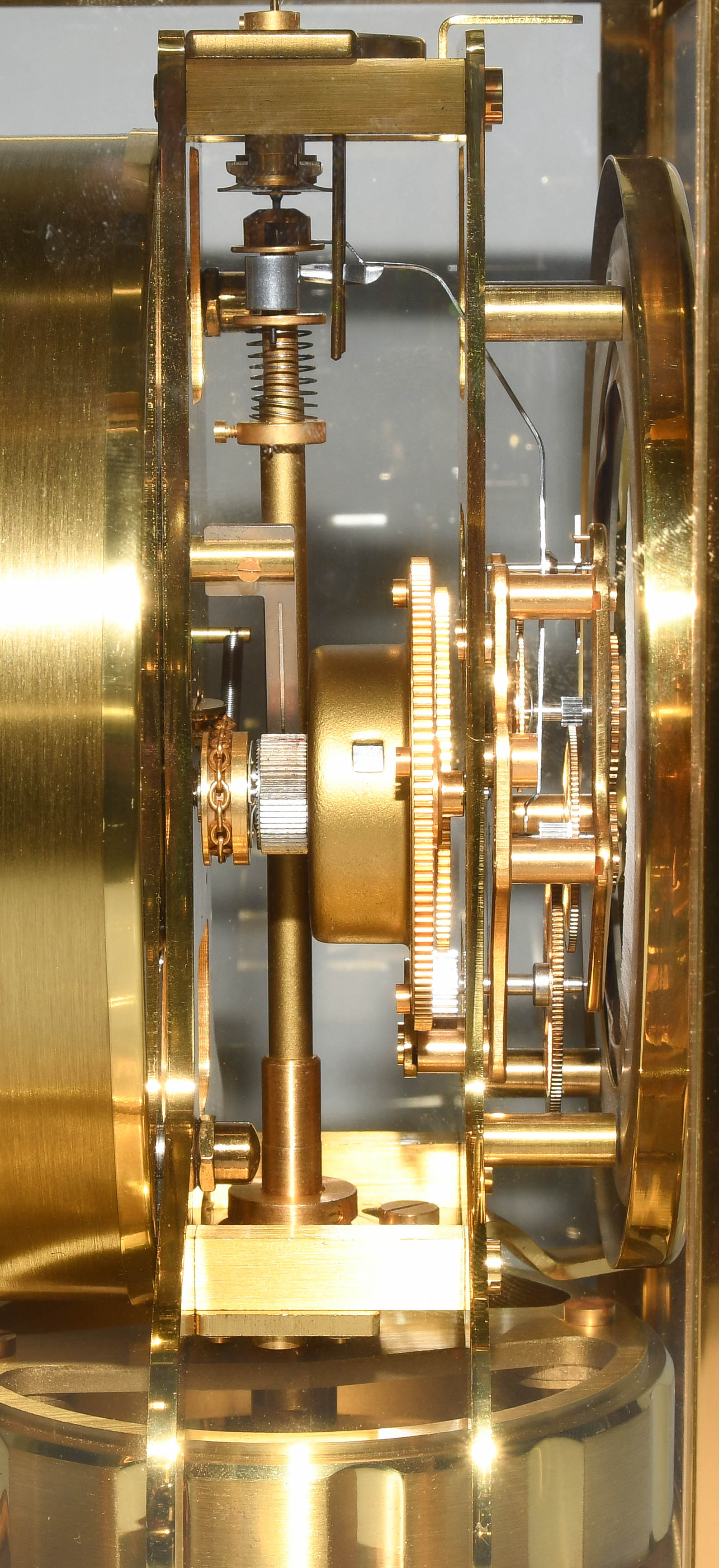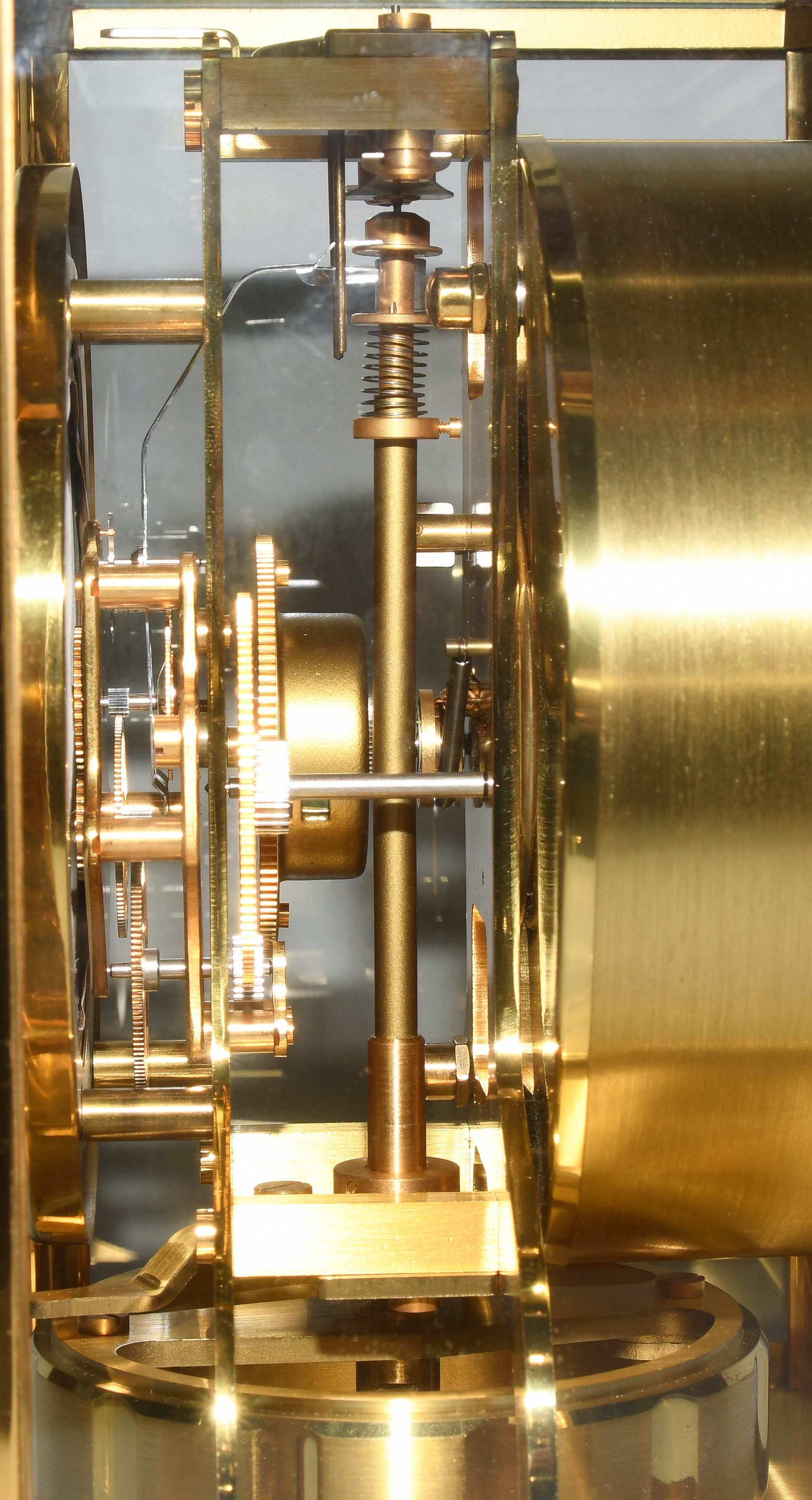 Schweiz, 2.Hälfte 20.Jh. Vierseitig mit Glas bestücktes, vergoldetes Messinggehäuse. Weisser, runder Zifferring mit arabischer Viertelstundenanzeige und Indizes. Aneroid-Dose. Torsionspendel mit Elinvar-Draht. Sperrhebel. Justierschrauben und Libelle. Temperaturschwankung von einem Grad reicht für eine Gangdauer von 48 Stunden. Gehfähig. 22,5x18 cm.