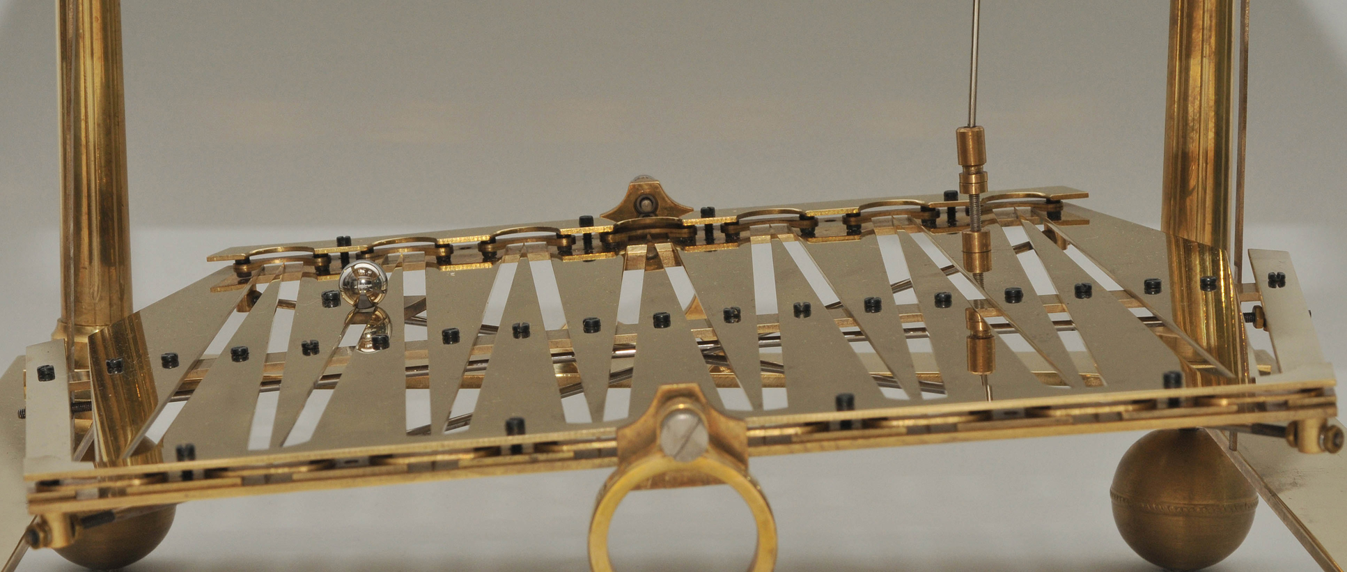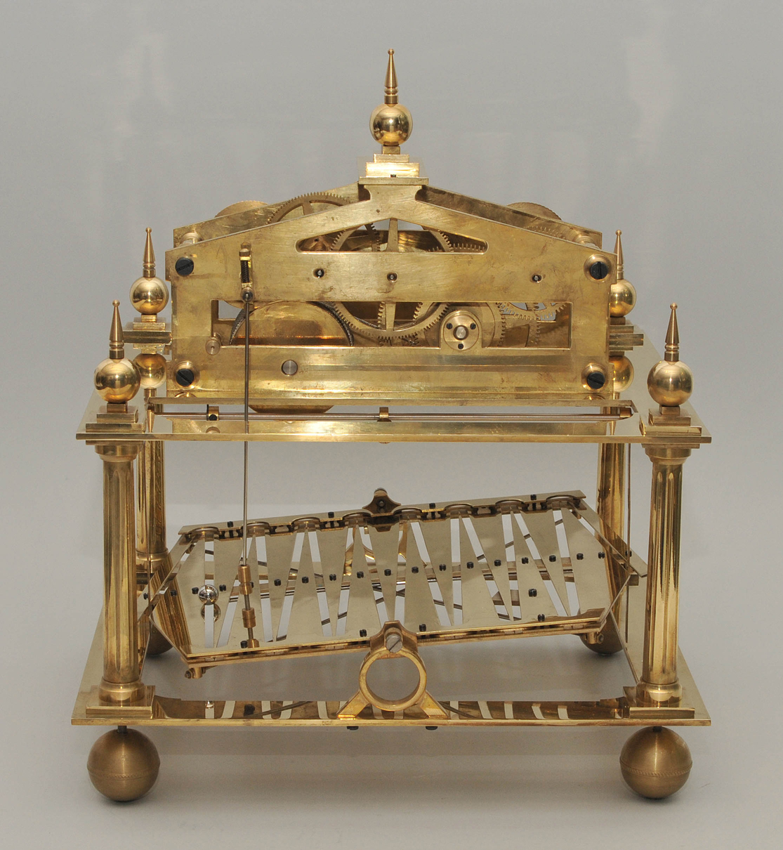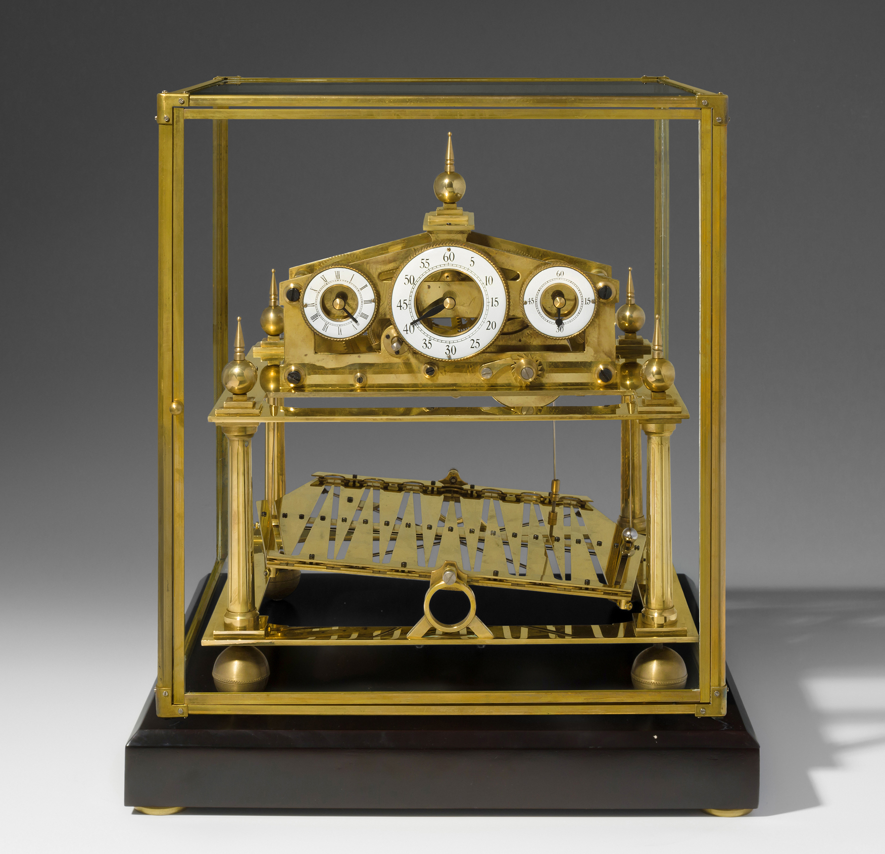 England, 1808 von Congreve erfunden und im 19. bis ins 20.Jh. nachgebaut. Skelettiertes, vergoldetes Messingwerk. Die Kraft wird von einer Feder über eine Schnecke mit Seil übertragen und dient zur Umkehrung der Kugellaufrichtung. Die Kugel läuft 30 Sekunden in eine Richtung und wird dann durch den Kippmechanismus auf die andere Seite geschickt. Die Uhr hat drei Zifferringe mit arabischen Zahlen für die Stunden, Minuten und Sekunden. Die Uhr steht auf einem Mahagoni Sockel. Dazu gehört die originale Glasvitriene mit einer verglasten Türe. Gehfähig. 48x42x40 cm. Vitrine 43x39x38 cm.