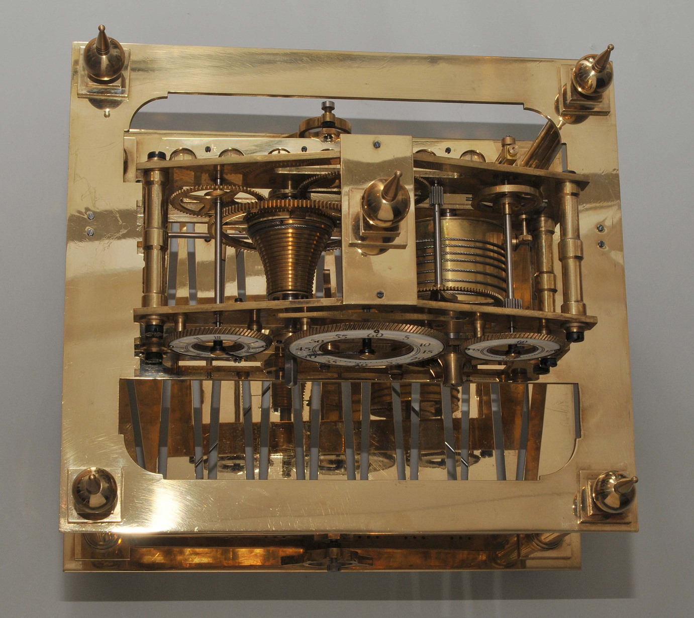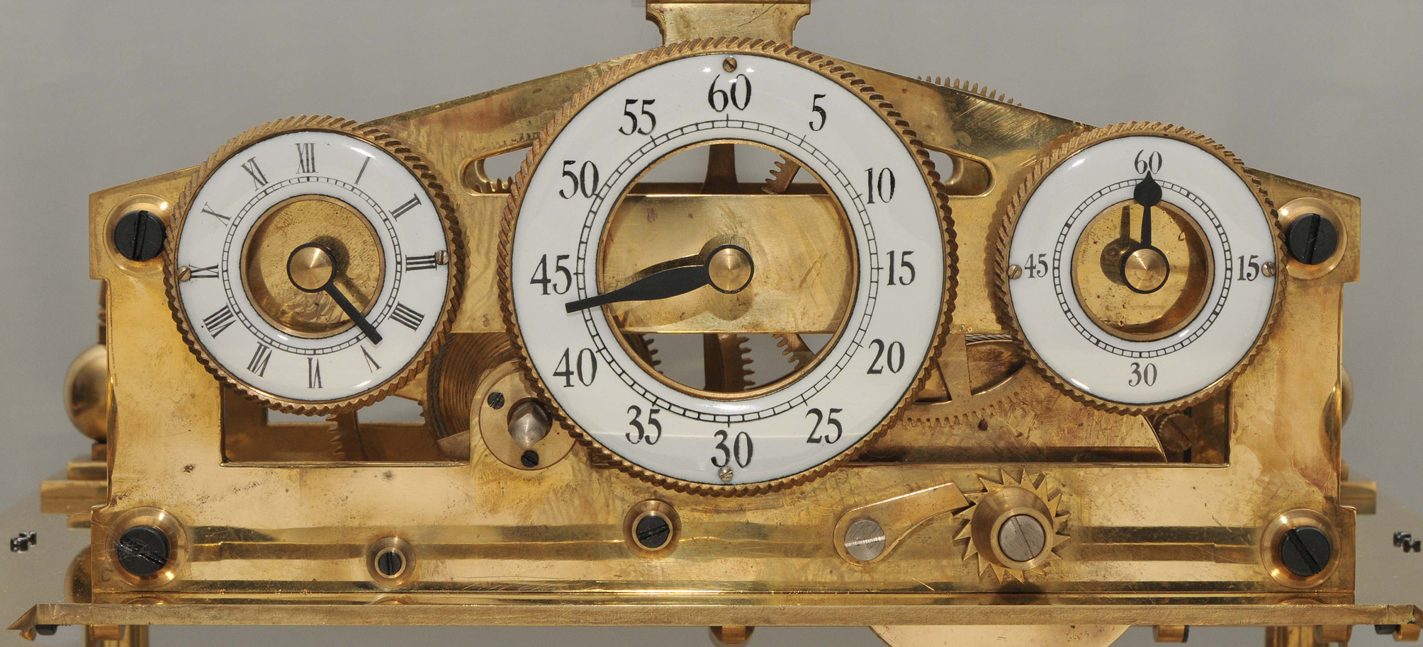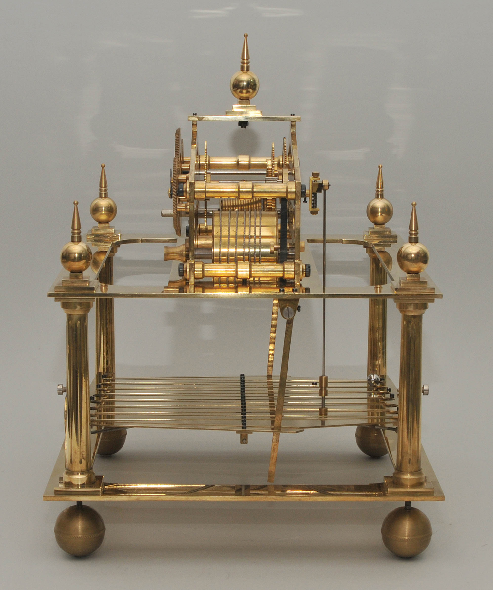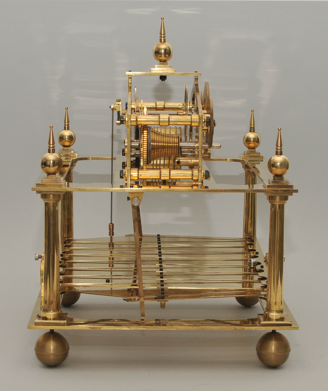 England, 1808 von Congreve erfunden und im 19. bis ins 20.Jh. nachgebaut. Skelettiertes, vergoldetes Messingwerk. Die Kraft wird von einer Feder über eine Schnecke mit Seil übertragen und dient zur Umkehrung der Kugellaufrichtung. Die Kugel läuft 30 Sekunden in eine Richtung und wird dann durch den Kippmechanismus auf die andere Seite geschickt. Die Uhr hat drei Zifferringe mit arabischen Zahlen für die Stunden, Minuten und Sekunden. Die Uhr steht auf einem Mahagoni Sockel. Dazu gehört die originale Glasvitriene mit einer verglasten Türe. Gehfähig. 48x42x40 cm. Vitrine 43x39x38 cm.