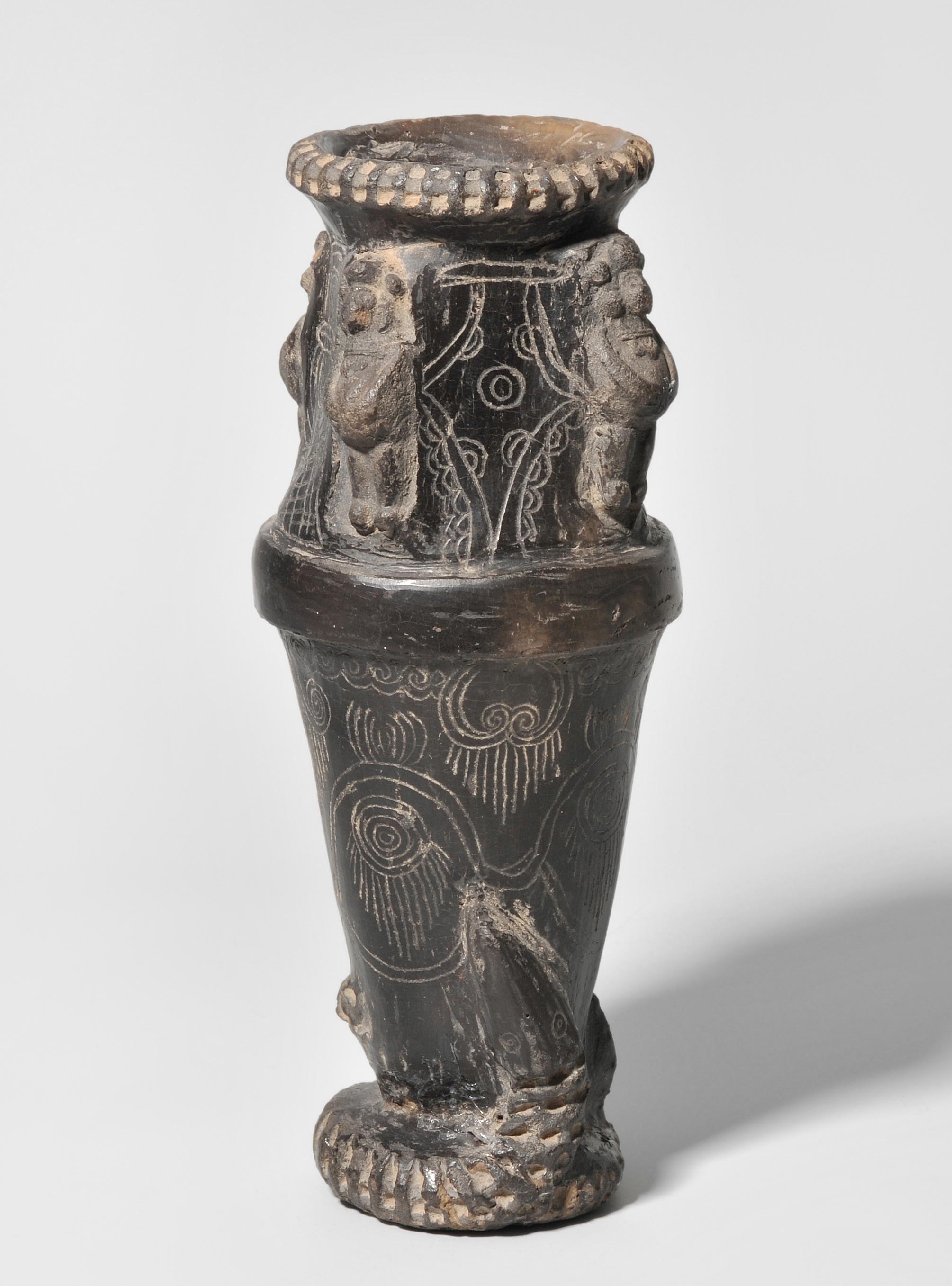 Wohl Mexiko, um 1300 A.D. Keramik. Hohes, schmales Gefäss, verziert mit vier reliefierten Figuren sowie graviertem geometrischen Dekor. Basis verziert mit Schlange. H 22 cm. - Teil des Bodens geklebt.