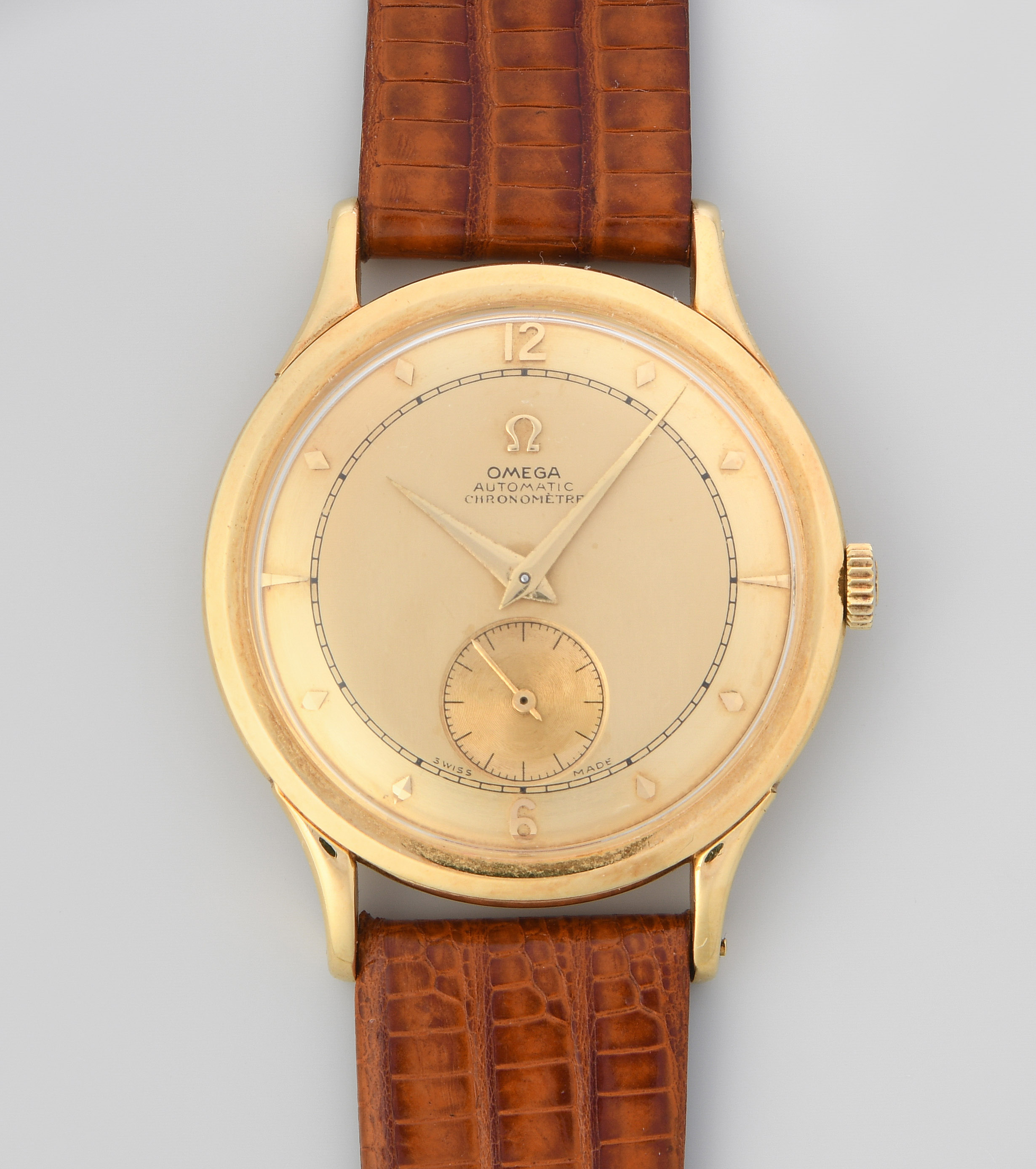 Runder, automatischer Herrenchronometer 1948 mit Hammerautomatik in 750 Gelbgoldgehäuse ca. 20 g. Boden gedrückt, Werknummer 10759352, Kaliber 30.10, Gehäusenummer 10724242, Referenznummer OT 2500, D 35 mm. Goldfarbenes Zifferblatt mit aufgesetzten, goldfarbenen Stundenindizes, arabischer 6 und 12, schwarze Minuten-, Sekundenindizes. Goldfarbene Dauphine-Zeiger, kleine Sekundenanzeige bei 6 Uhr. Krone bei 3 Uhr. Hellbraunes Lederarmband mit Original 750 Gelbgolddornschliesse. Zertifikat beigegeben. Gebrauchsspuren.