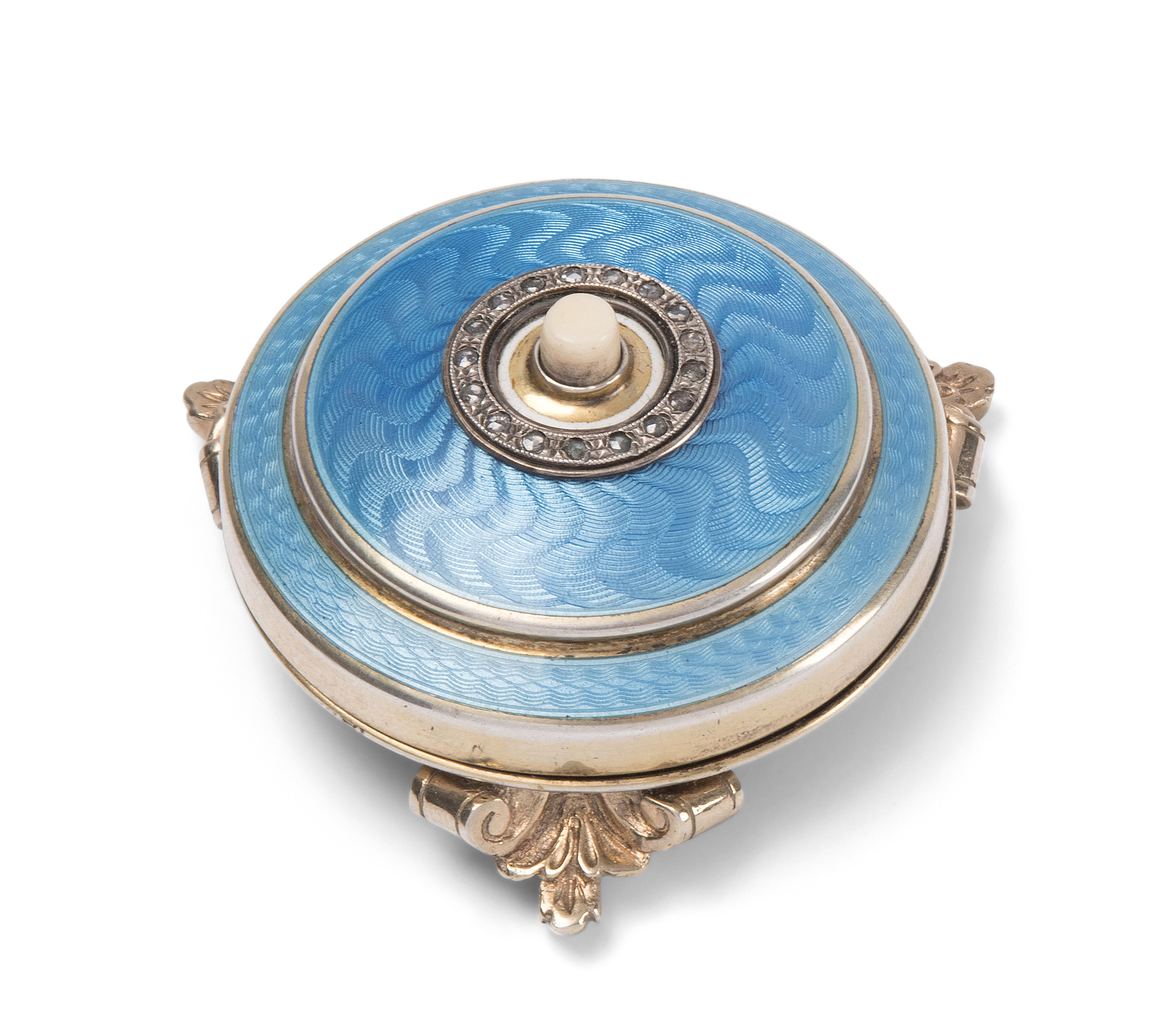 1908–1915. Silber, vergoldet/Email. Meistermarke August Frederik Hollming. Runde gestufte Kapselform auf 3 Volutenfüsschen, Elfenbein-Drücker für elektrischen Kontakt, umrahmt von Diamantrosen. Hellblaues Transluszidemail auf guillochiertem Grund. Beschau-, Meistermarke. D 4,5 cm.