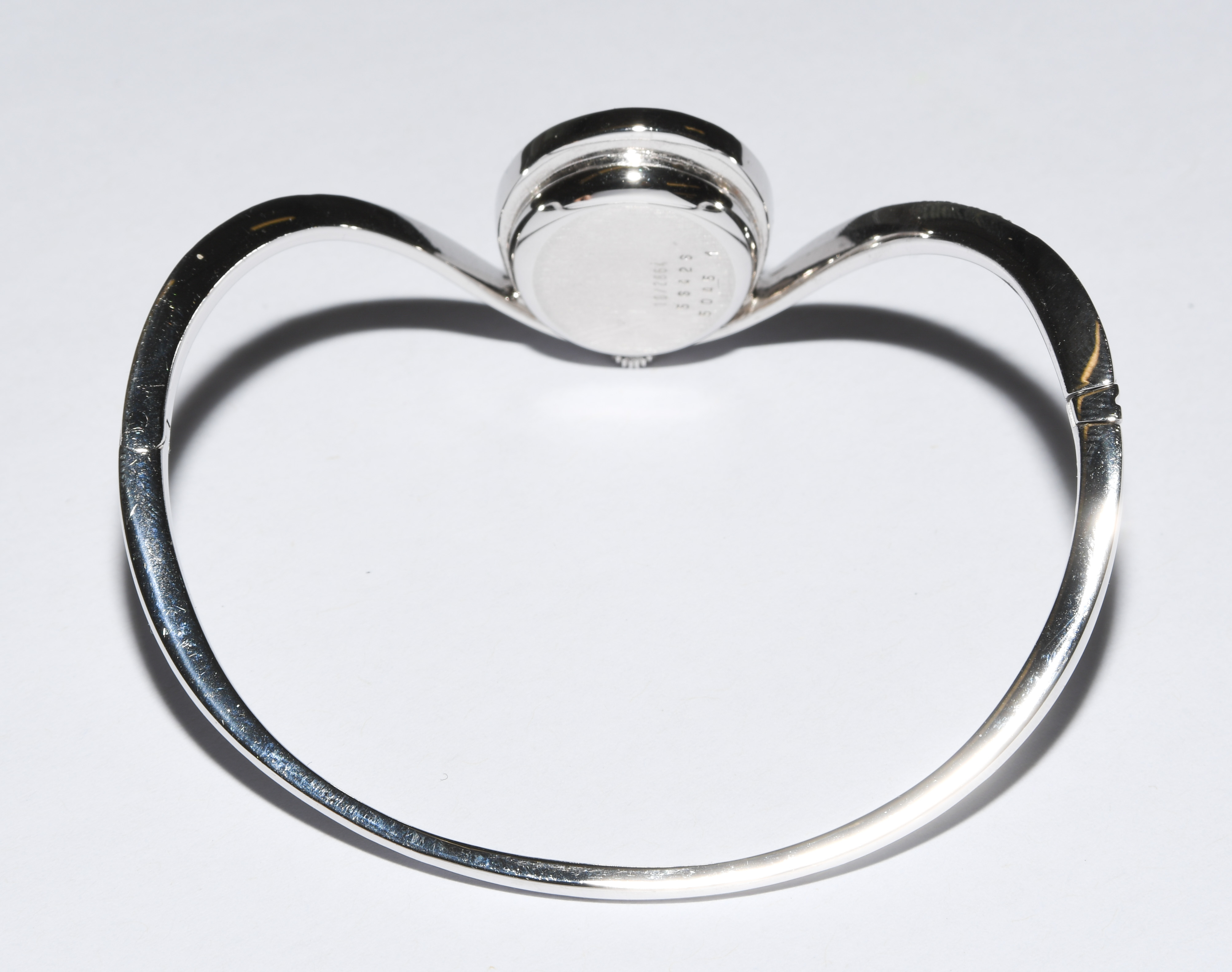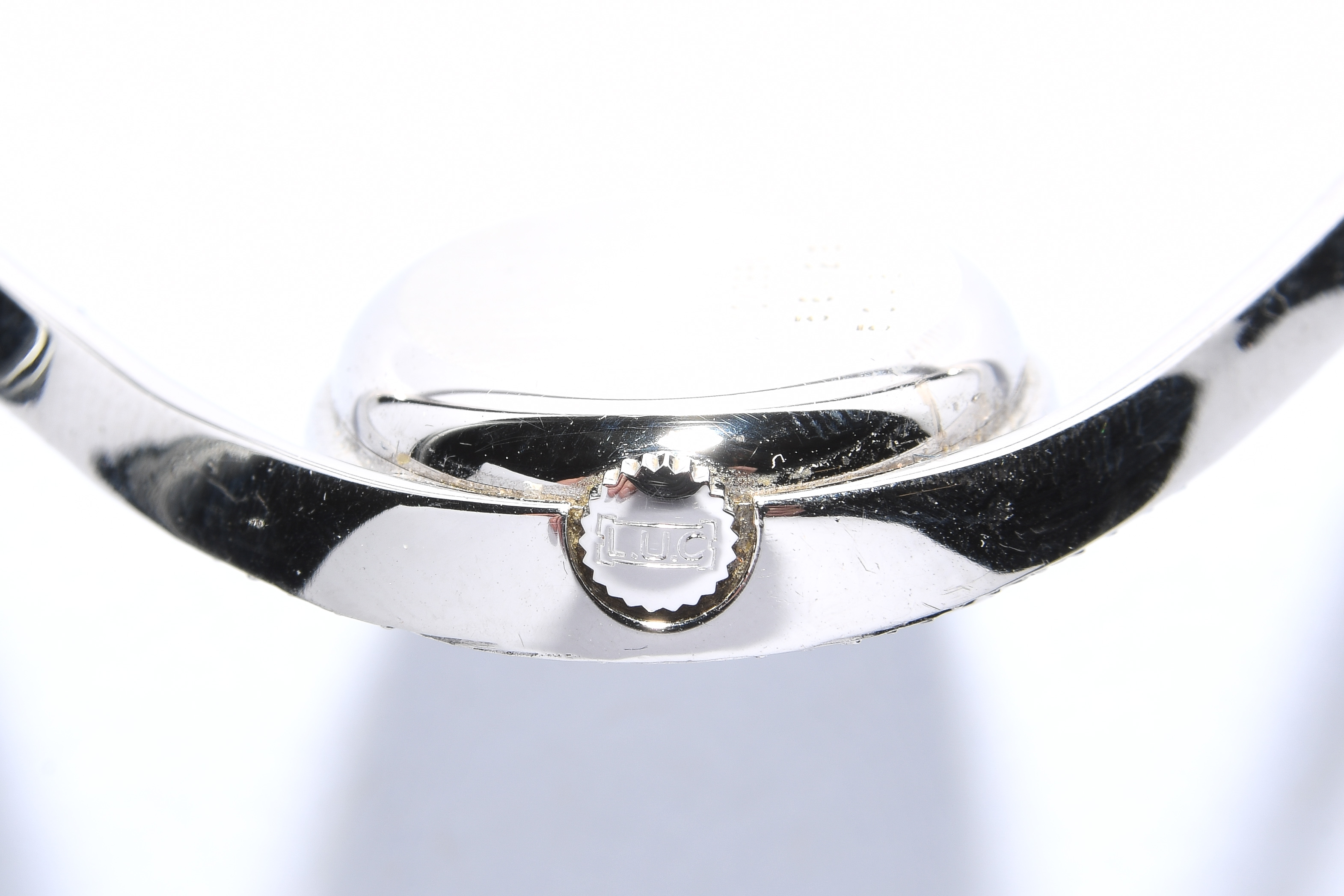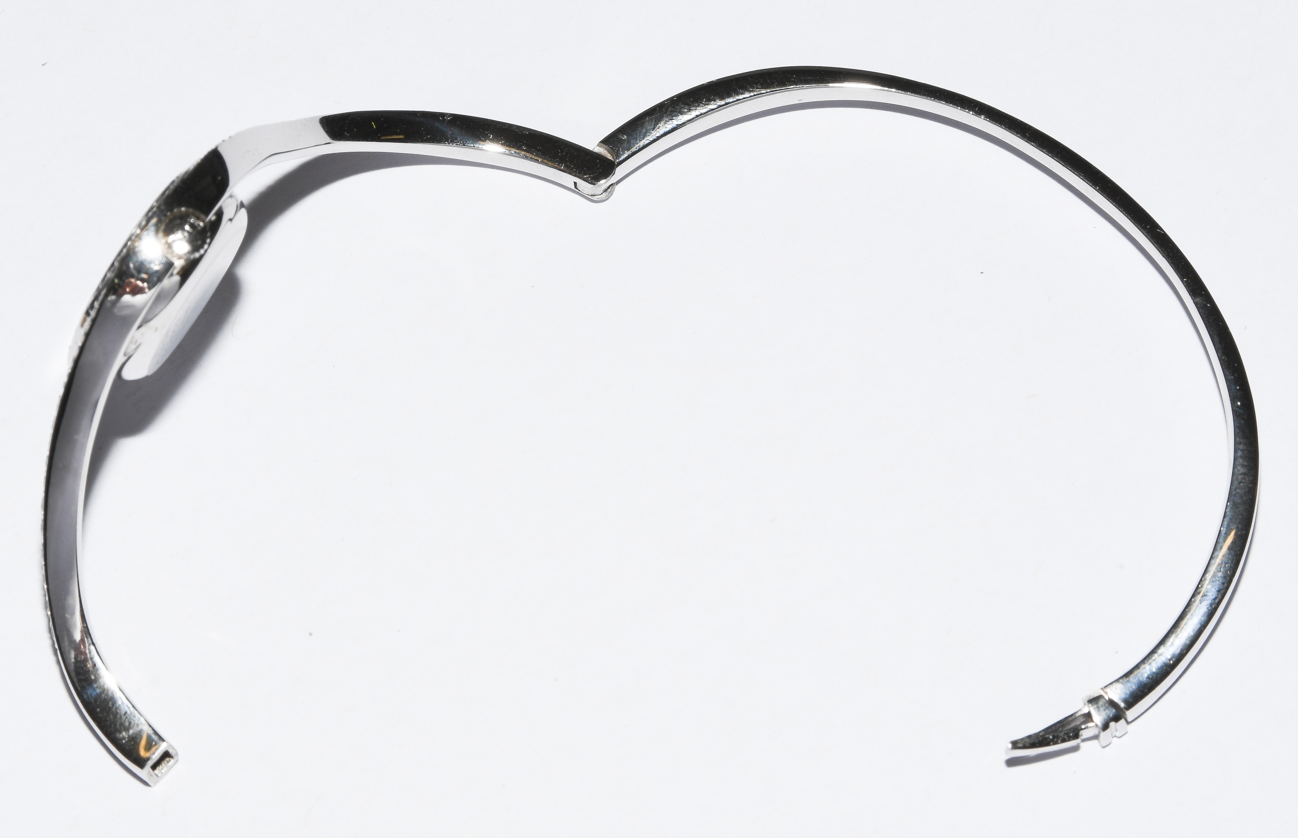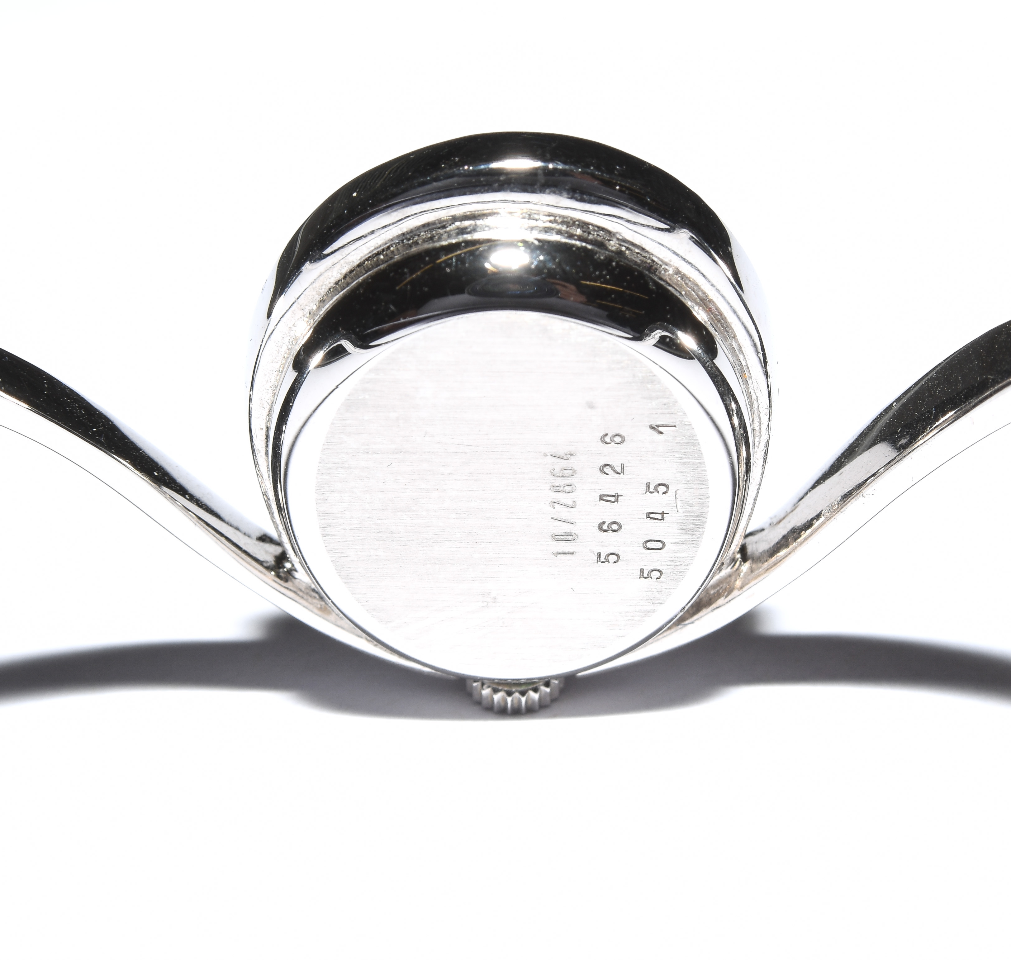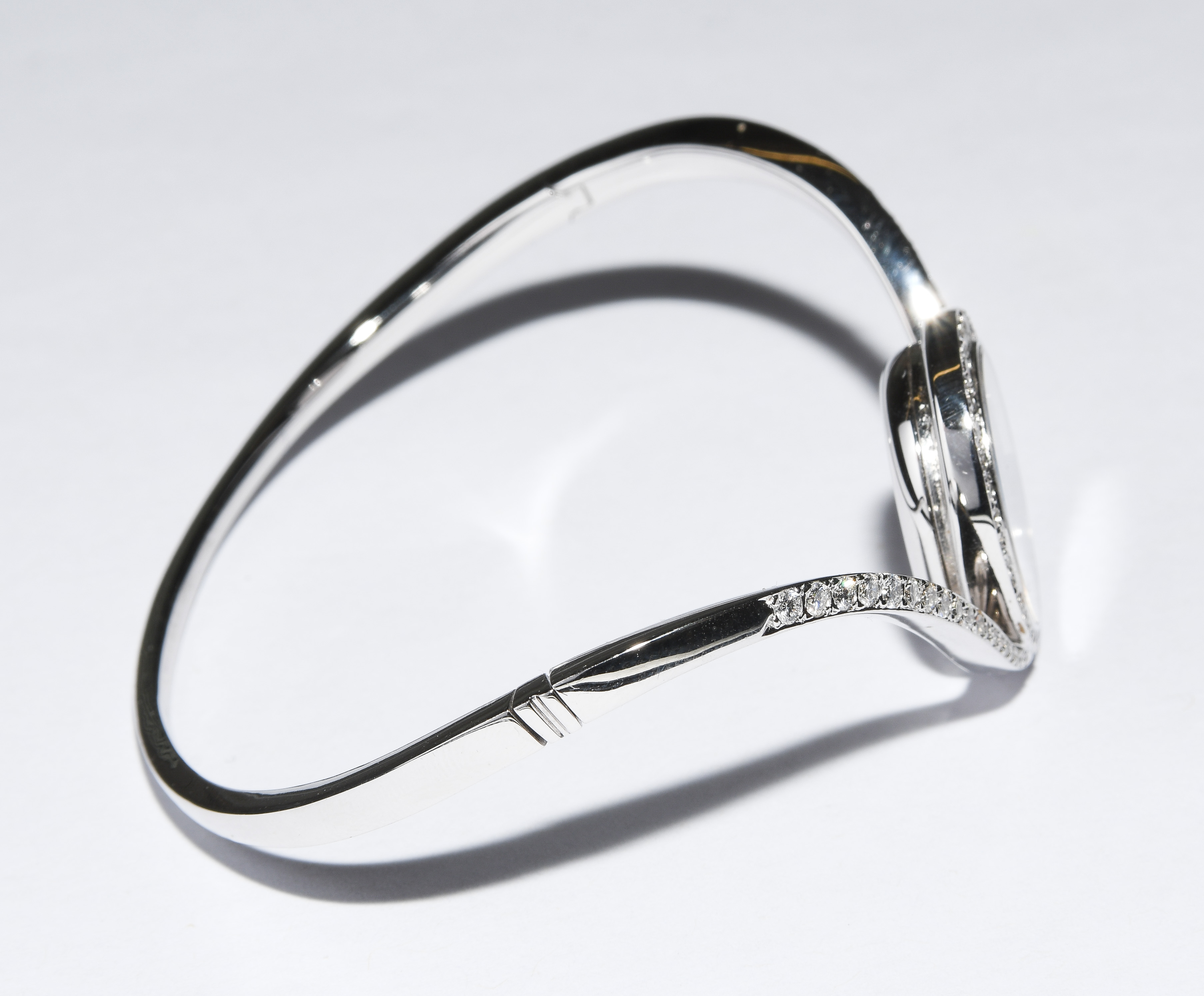 750 Weissgold. Ref. 10/2864. Nr. 56426 5045 1. Handaufzug. Ovales Gehäuse mit Diamantlunette. Saphirglas, Opal-Zifferblatt (Trockenrisse). Geschwungenes Band mit Brillantbesatz. Brillanten total 0.70 ct (1 fehlt). Innenumfang 18 cm, 36,7 g. Funktionstüchtig.