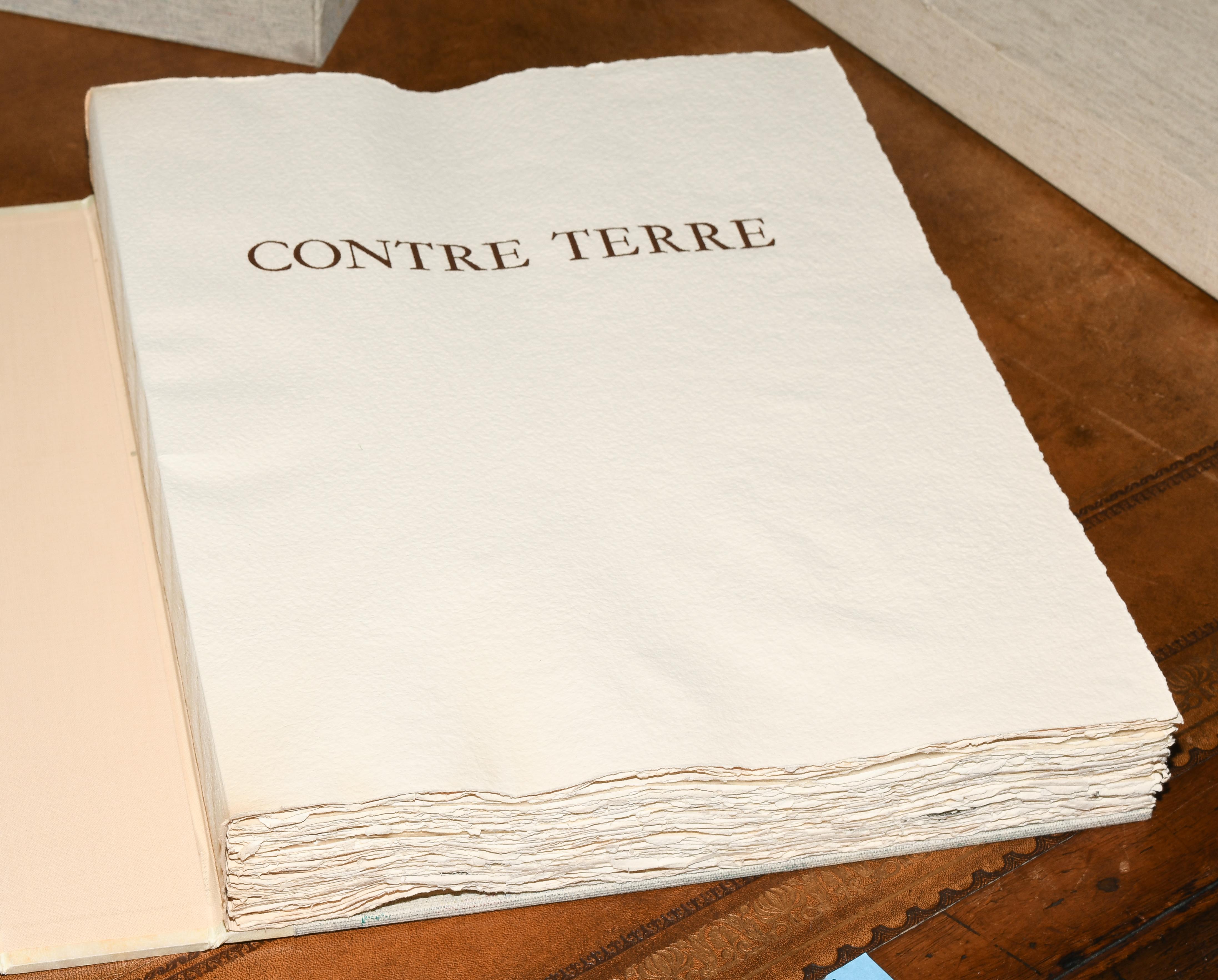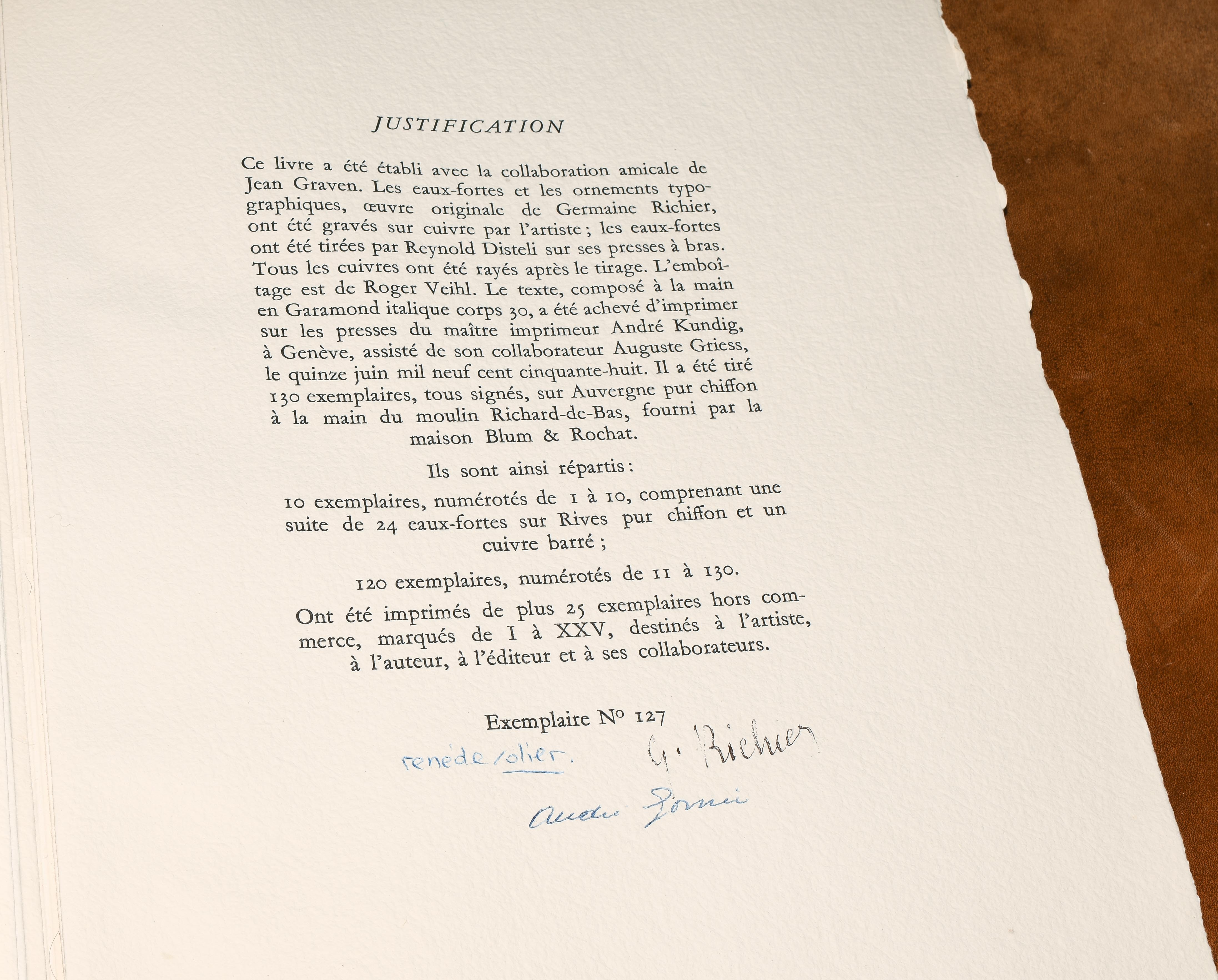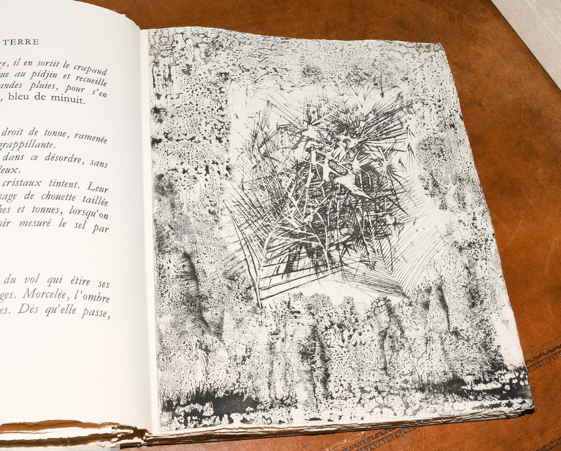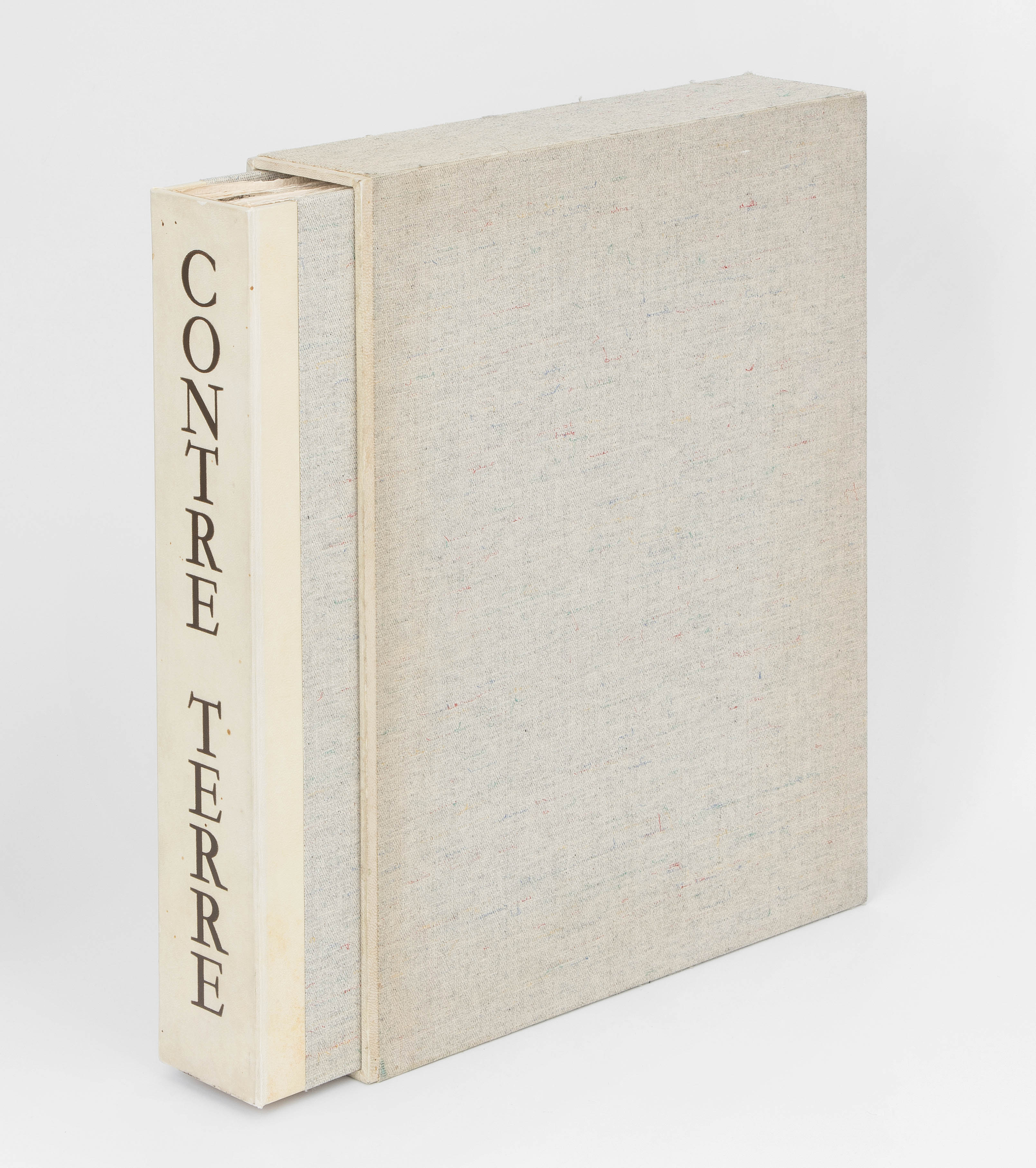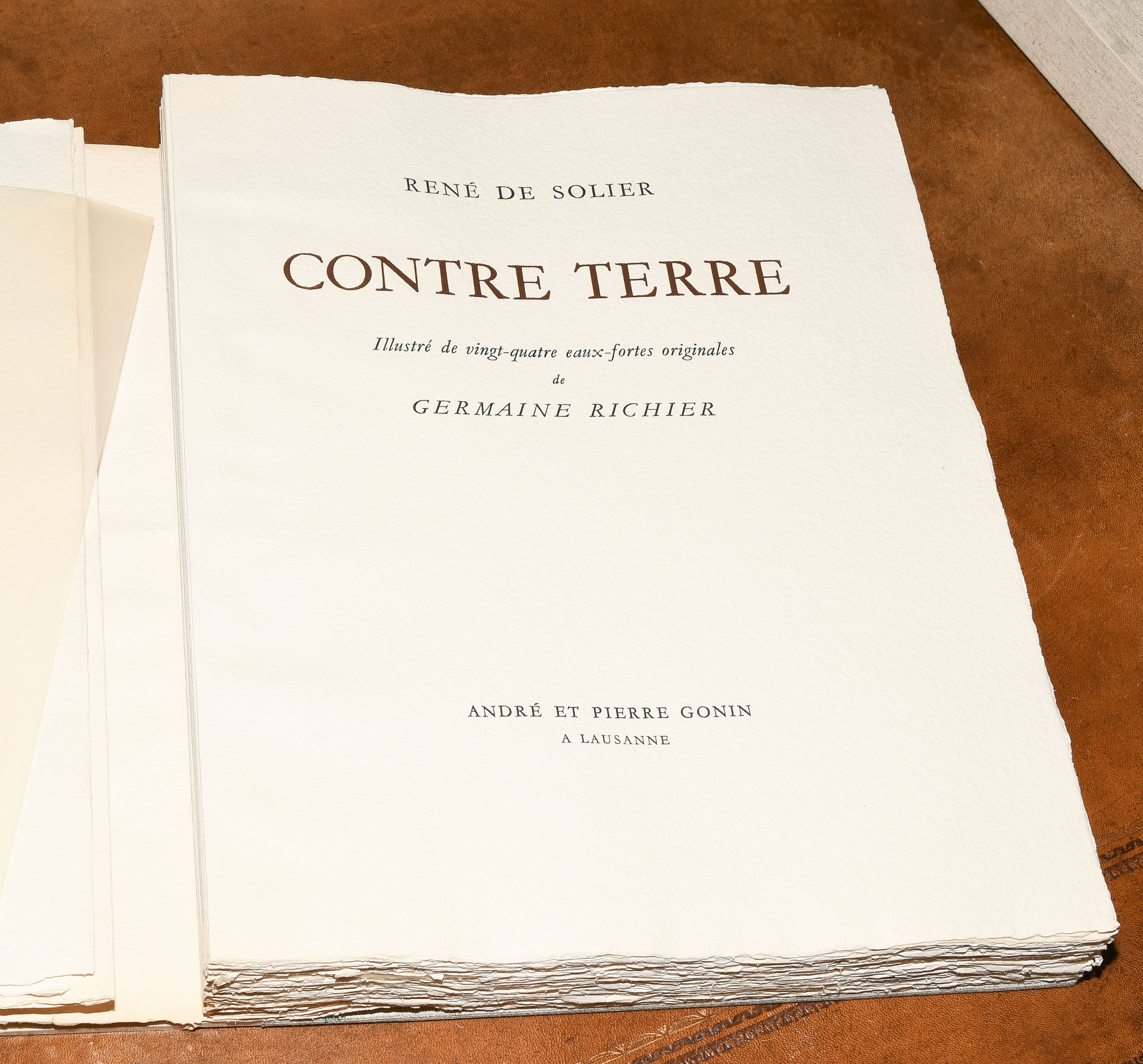 "Contre terre". Solier, René de. Illustré de vingt-quatre eaux-fortes originales de Germaine Richier. Lausanne, André et Pierre Gonin, 1958. Gr. 4°, 130 S. Mit 24 Orig.- Radierungen von Germaine Richier. Eins von 120 Ex. (GA 130). Lose Bll. in Orig. Umschlag in Orig. Halbpergament- Chemise und Orig.- Schuber. Von Richier, Solier und Gonin im Impressum signiert.
