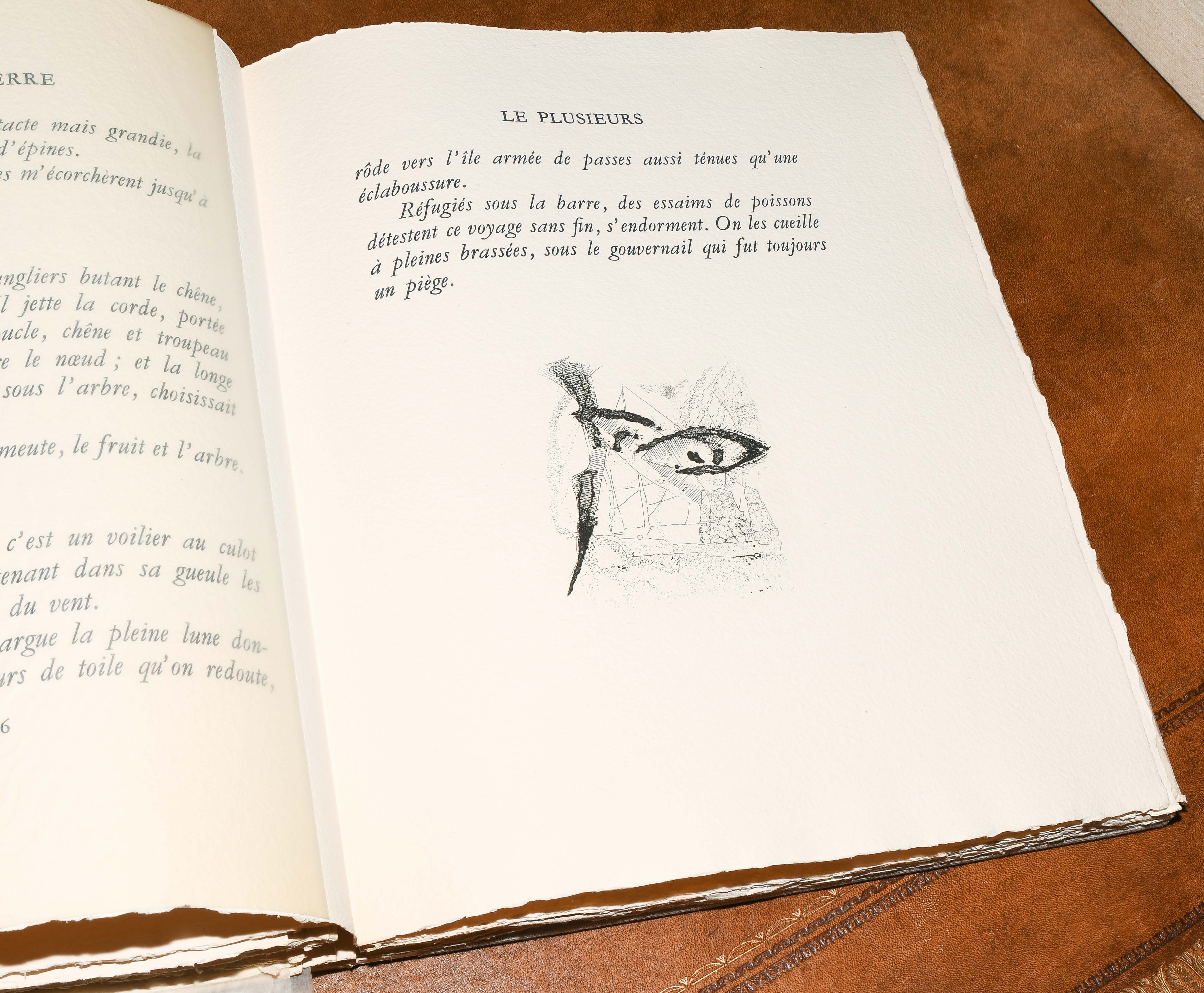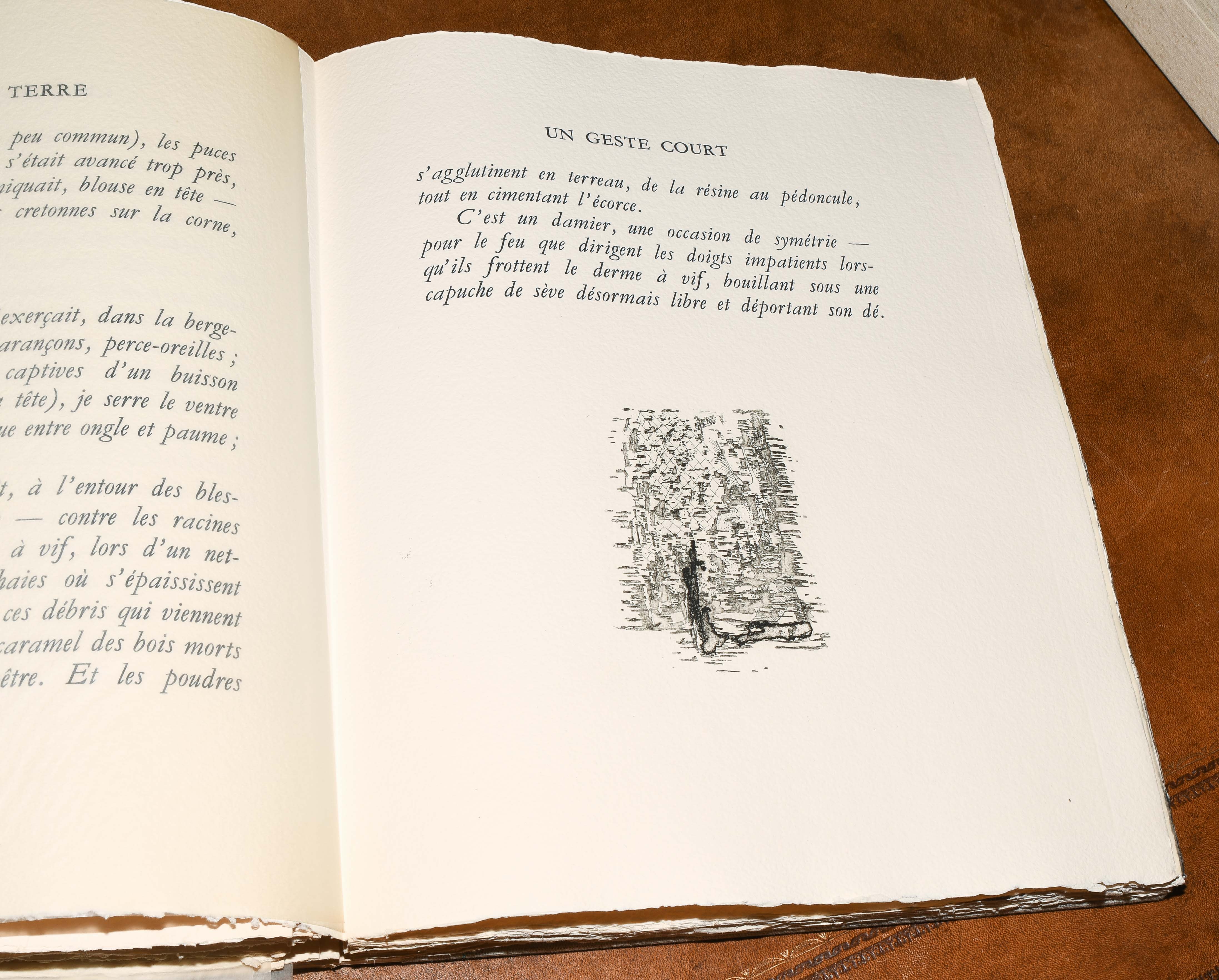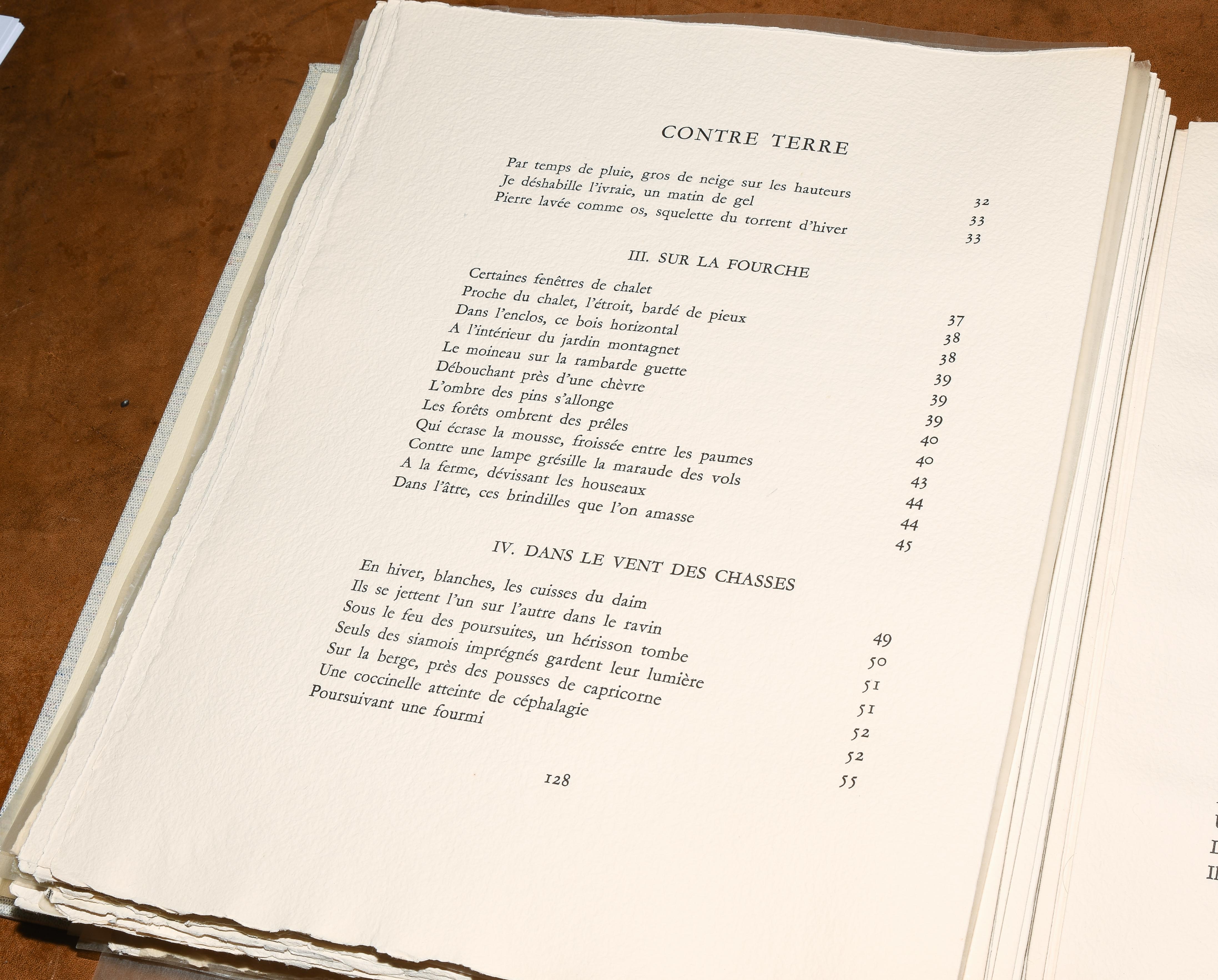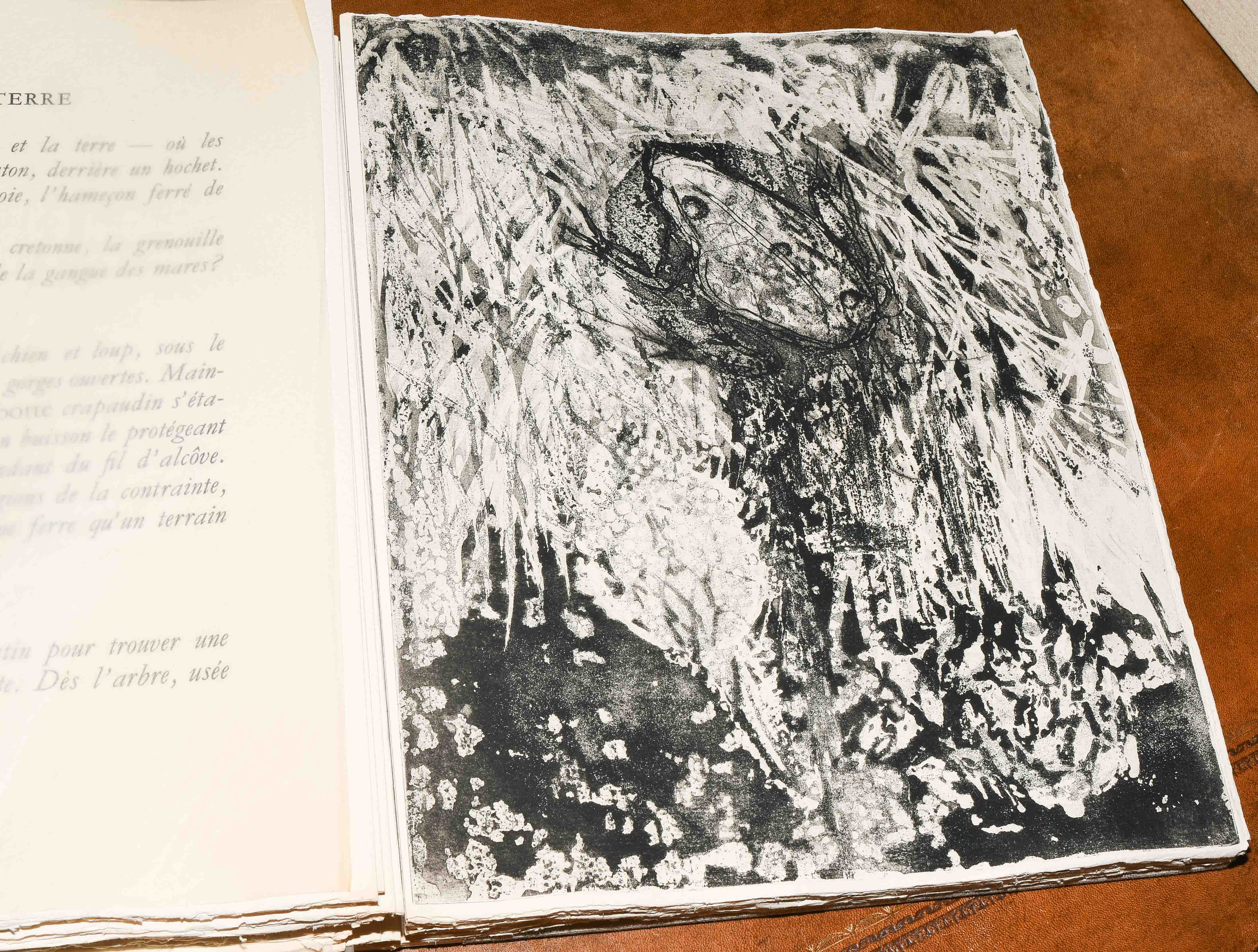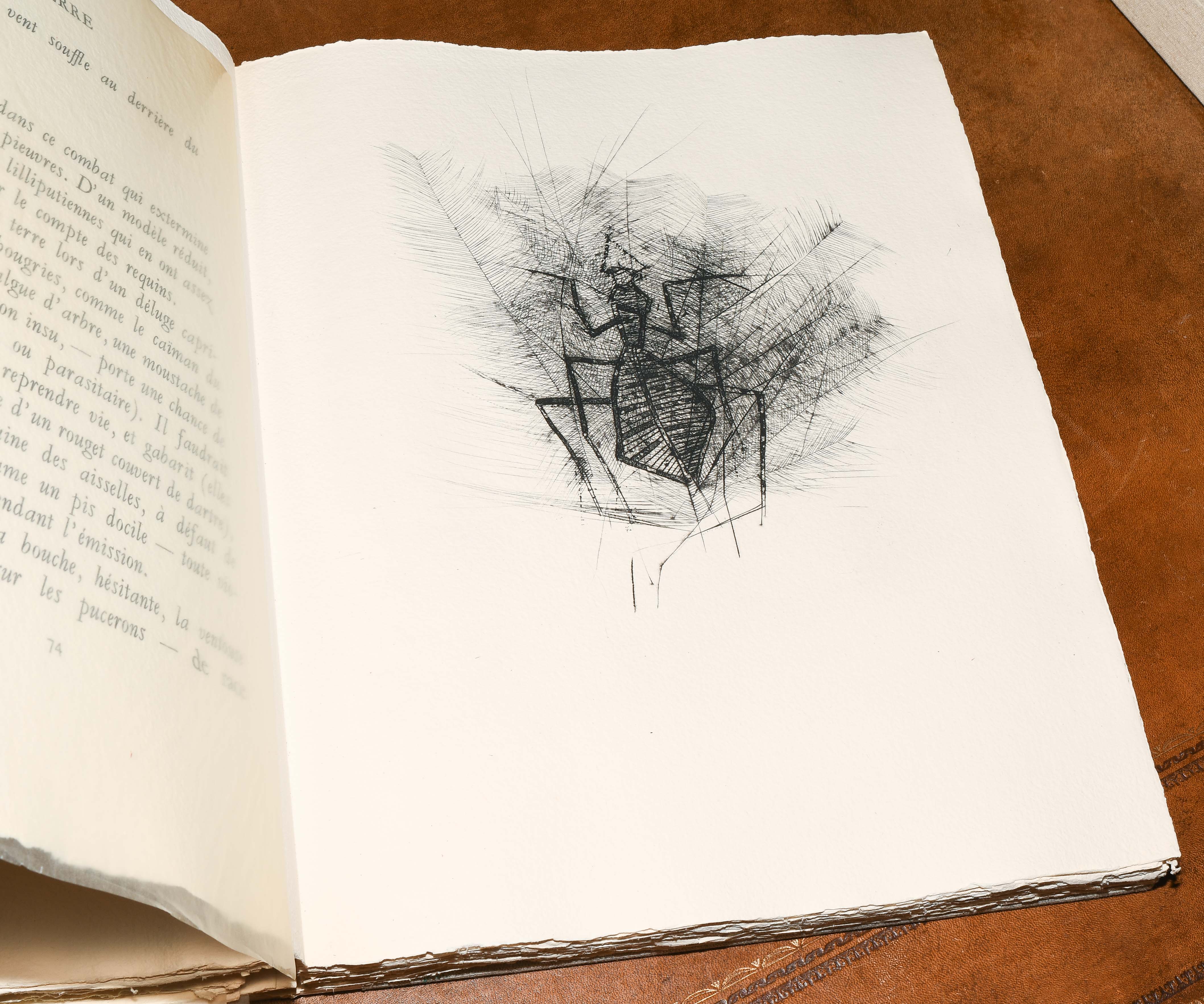 "Contre terre". Solier, René de. Illustré de vingt-quatre eaux-fortes originales de Germaine Richier. Lausanne, André et Pierre Gonin, 1958. Gr. 4°, 130 S. Mit 24 Orig.- Radierungen von Germaine Richier. Eins von 120 Ex. (GA 130). Lose Bll. in Orig. Umschlag in Orig. Halbpergament- Chemise und Orig.- Schuber. Von Richier, Solier und Gonin im Impressum signiert.