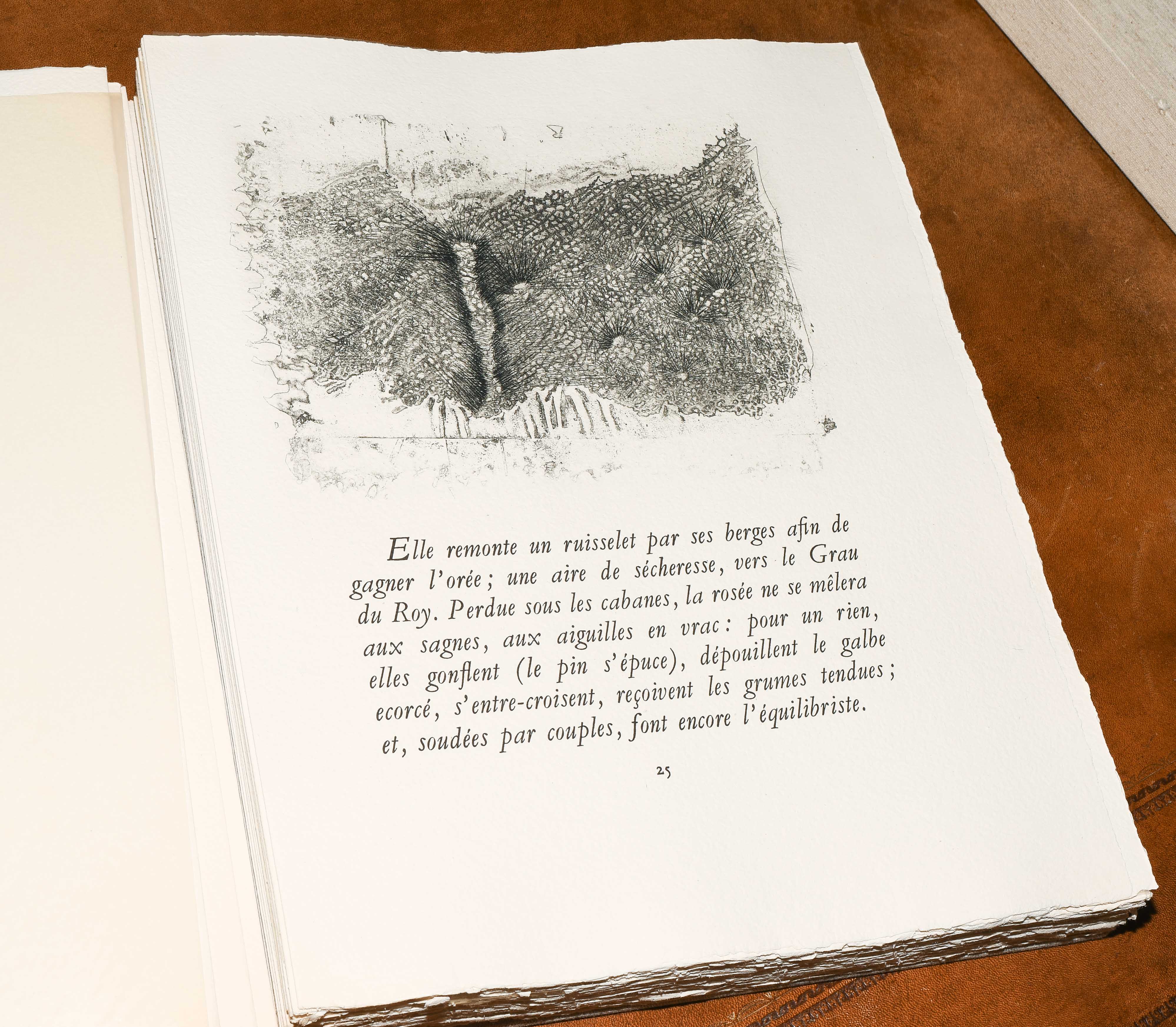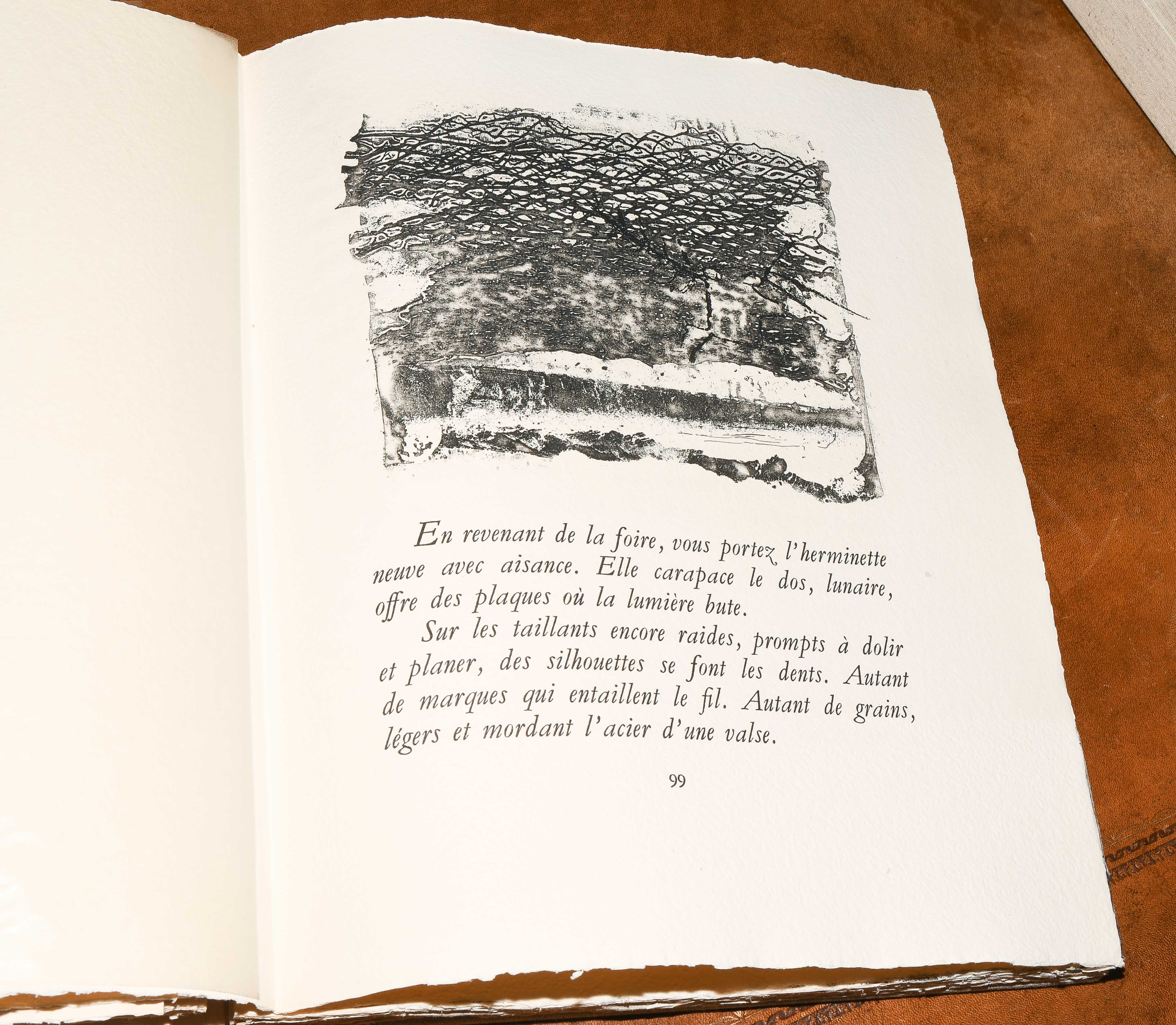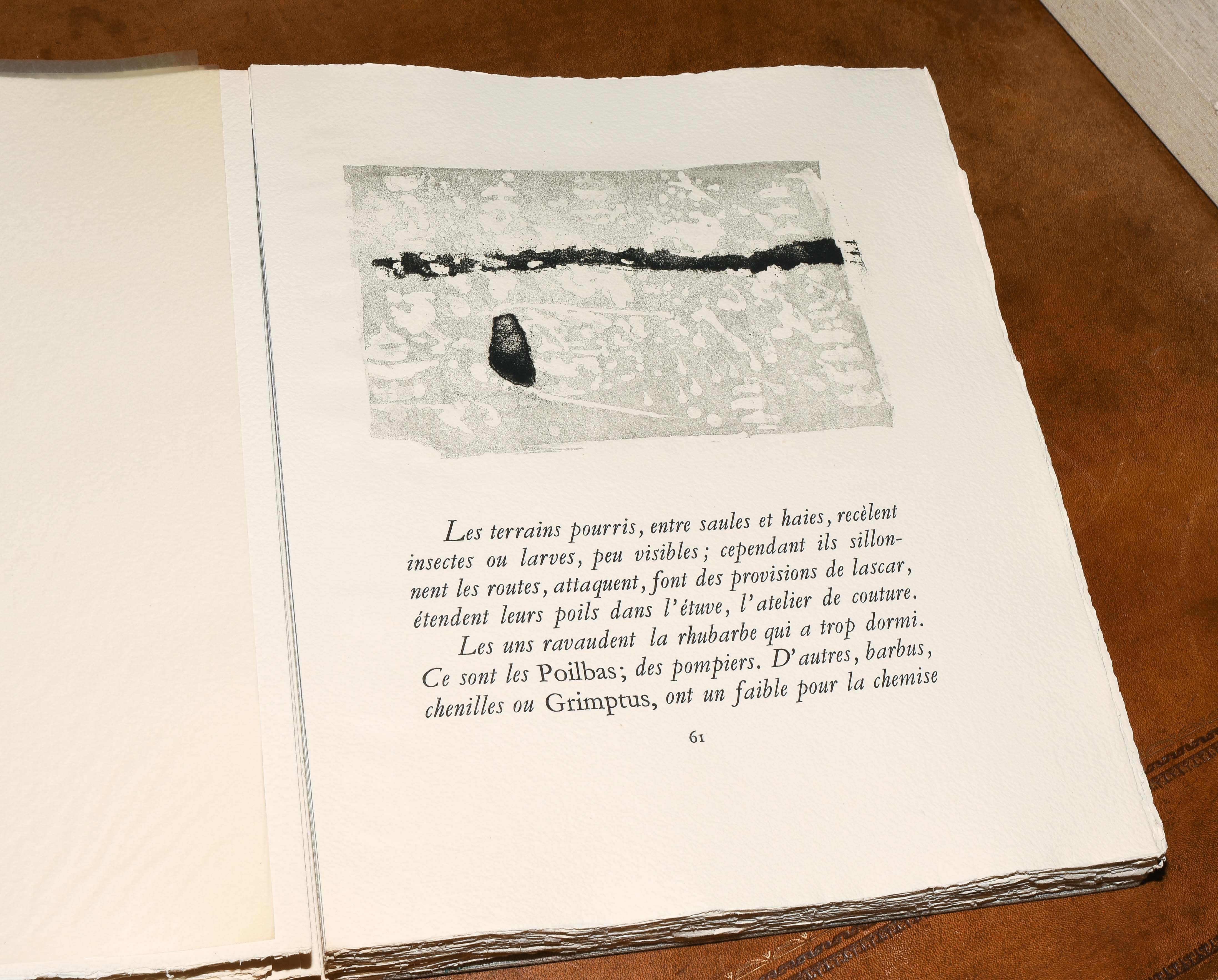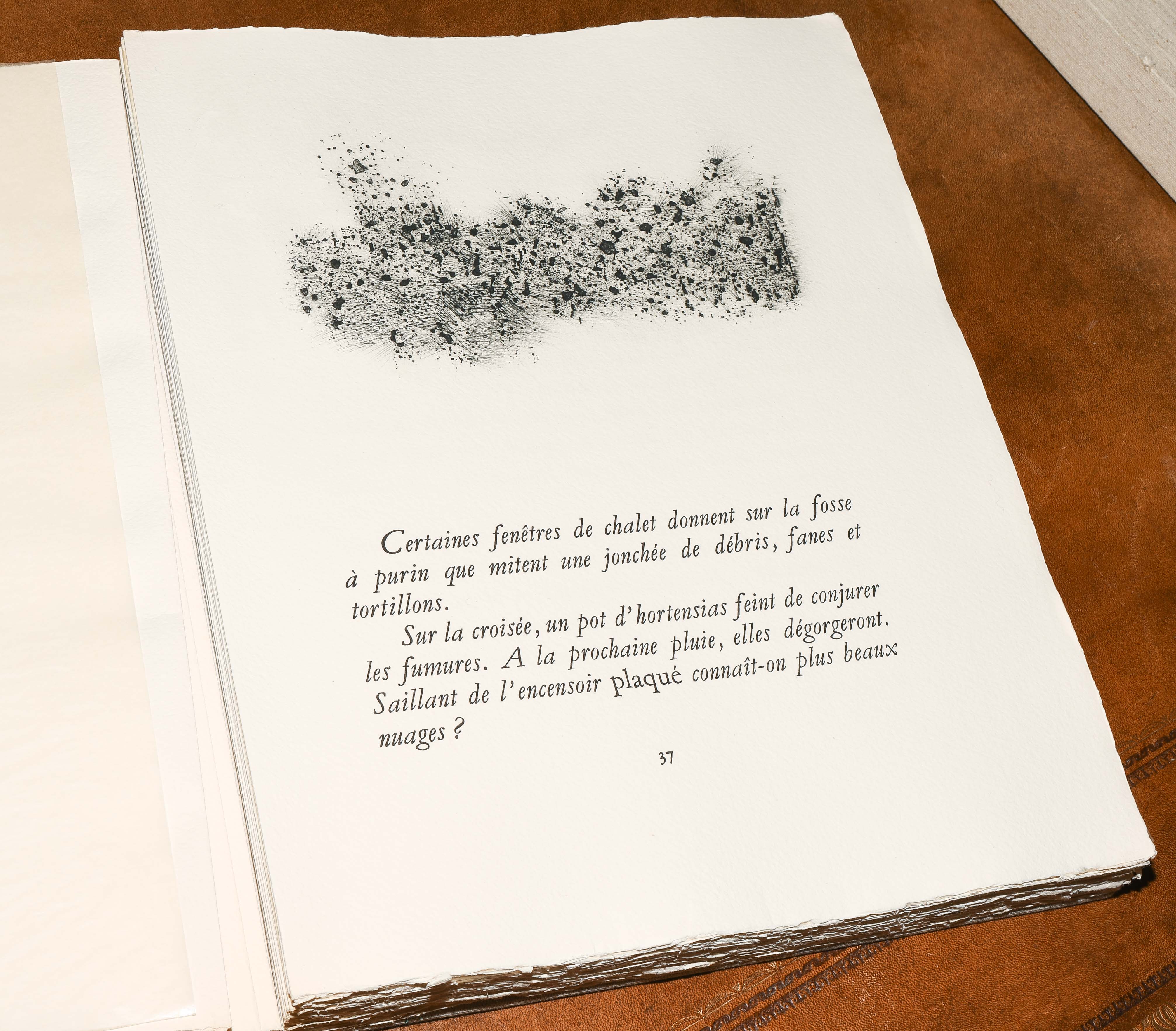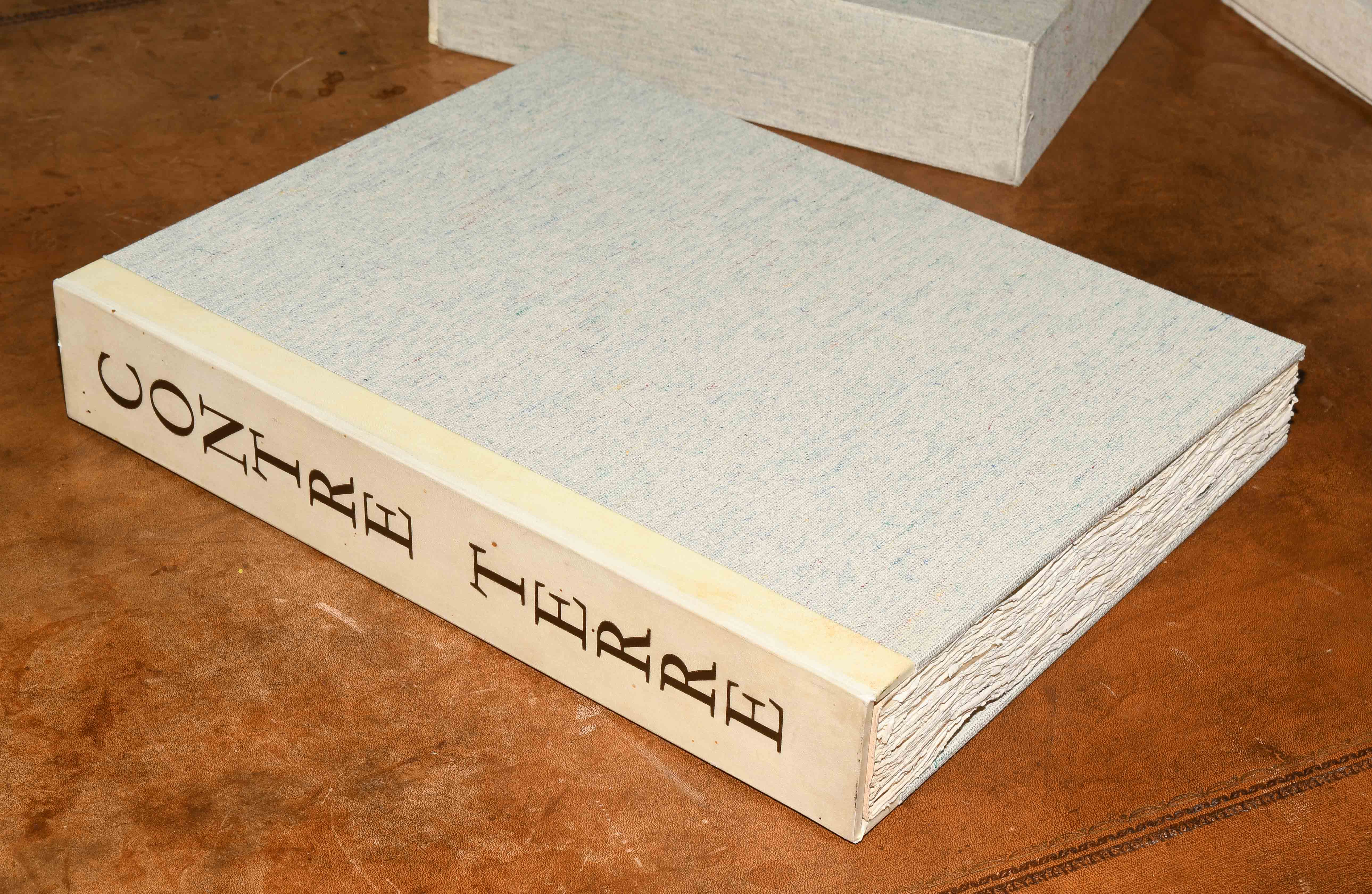 "Contre terre". Solier, René de. Illustré de vingt-quatre eaux-fortes originales de Germaine Richier. Lausanne, André et Pierre Gonin, 1958. Gr. 4°, 130 S. Mit 24 Orig.- Radierungen von Germaine Richier. Eins von 120 Ex. (GA 130). Lose Bll. in Orig. Umschlag in Orig. Halbpergament- Chemise und Orig.- Schuber. Von Richier, Solier und Gonin im Impressum signiert.