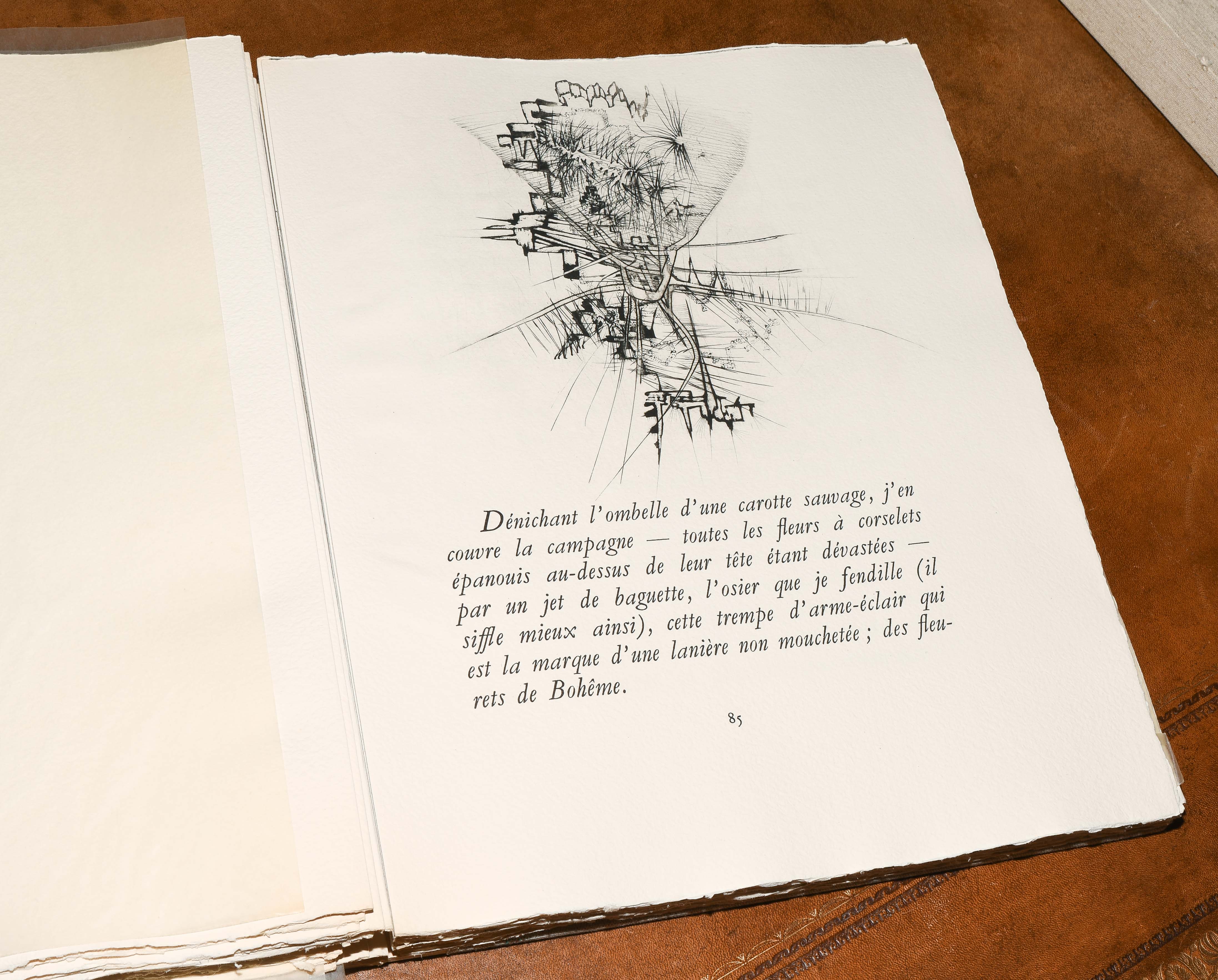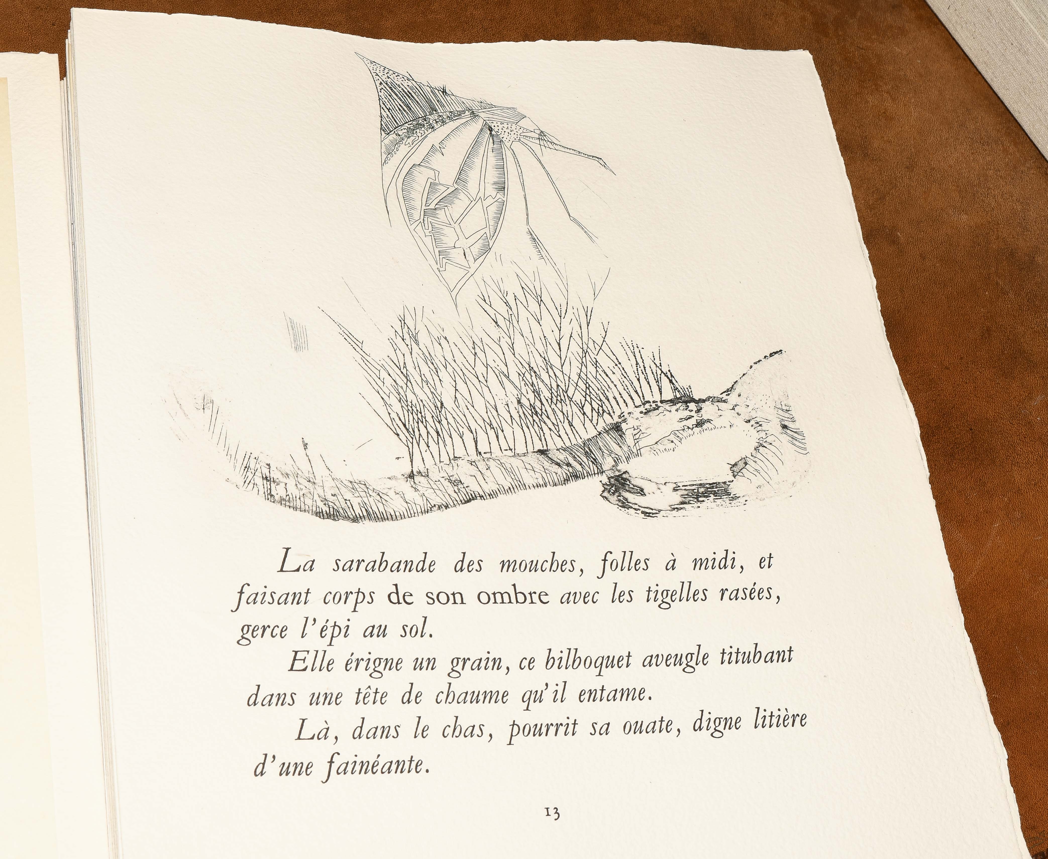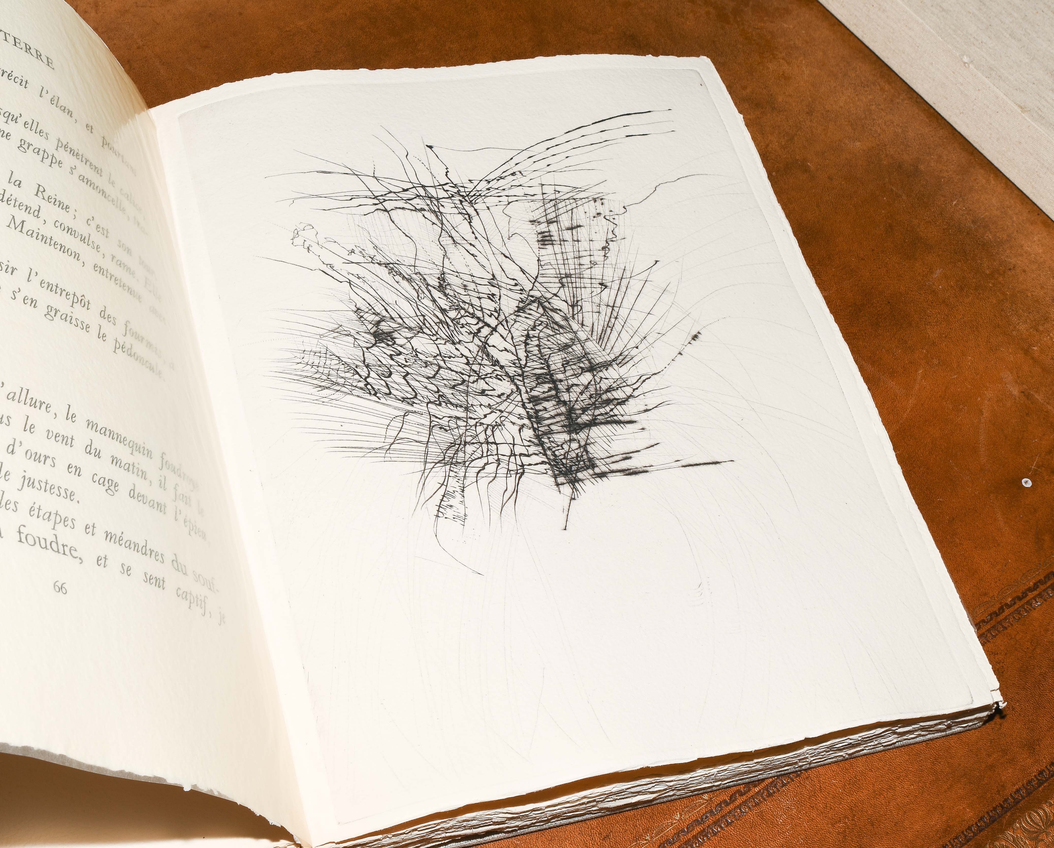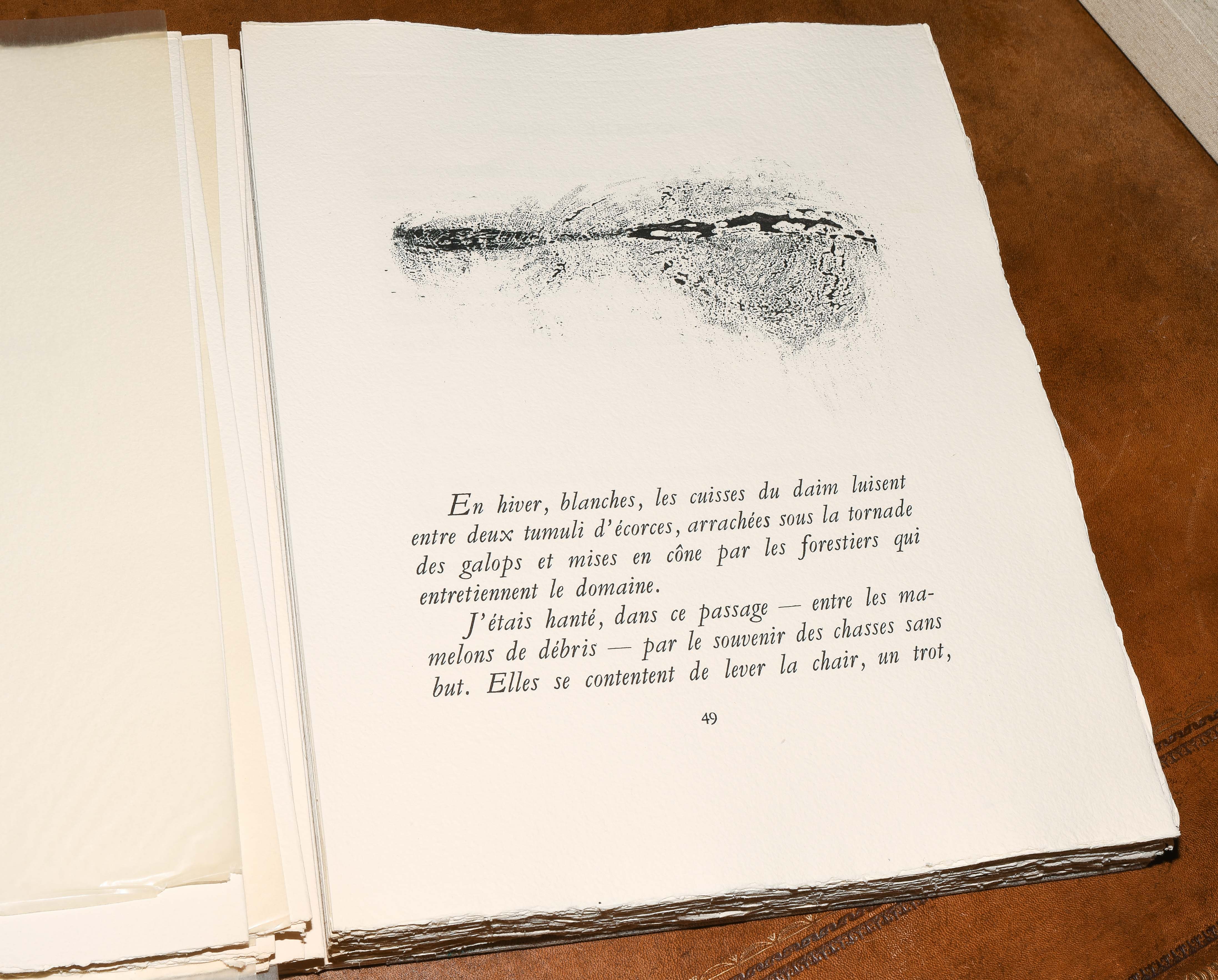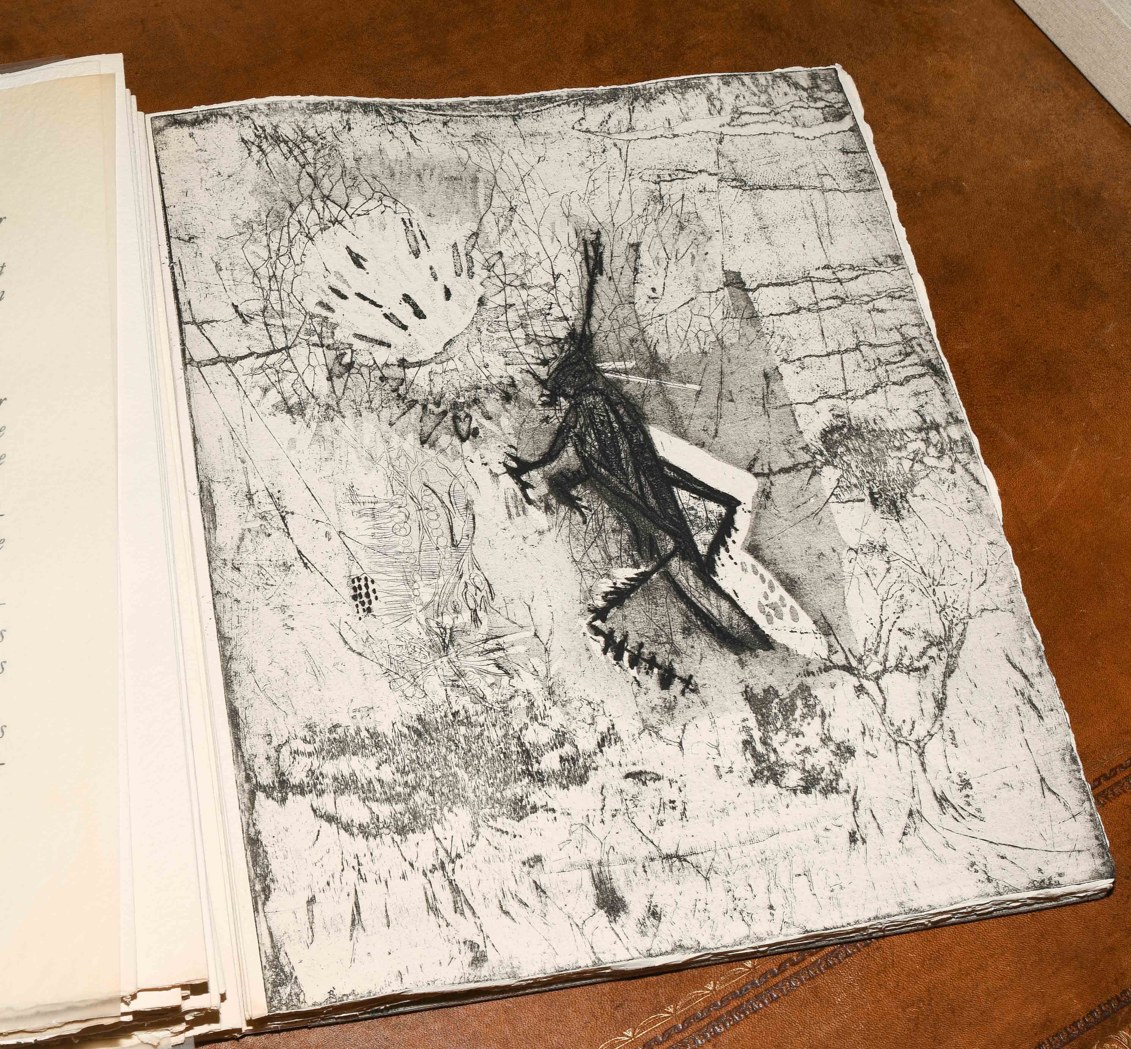"Contre terre". Solier, René de. Illustré de vingt-quatre eaux-fortes originales de Germaine Richier. Lausanne, André et Pierre Gonin, 1958. Gr. 4°, 130 S. Mit 24 Orig.- Radierungen von Germaine Richier. Eins von 120 Ex. (GA 130). Lose Bll. in Orig. Umschlag in Orig. Halbpergament- Chemise und Orig.- Schuber. Von Richier, Solier und Gonin im Impressum signiert.