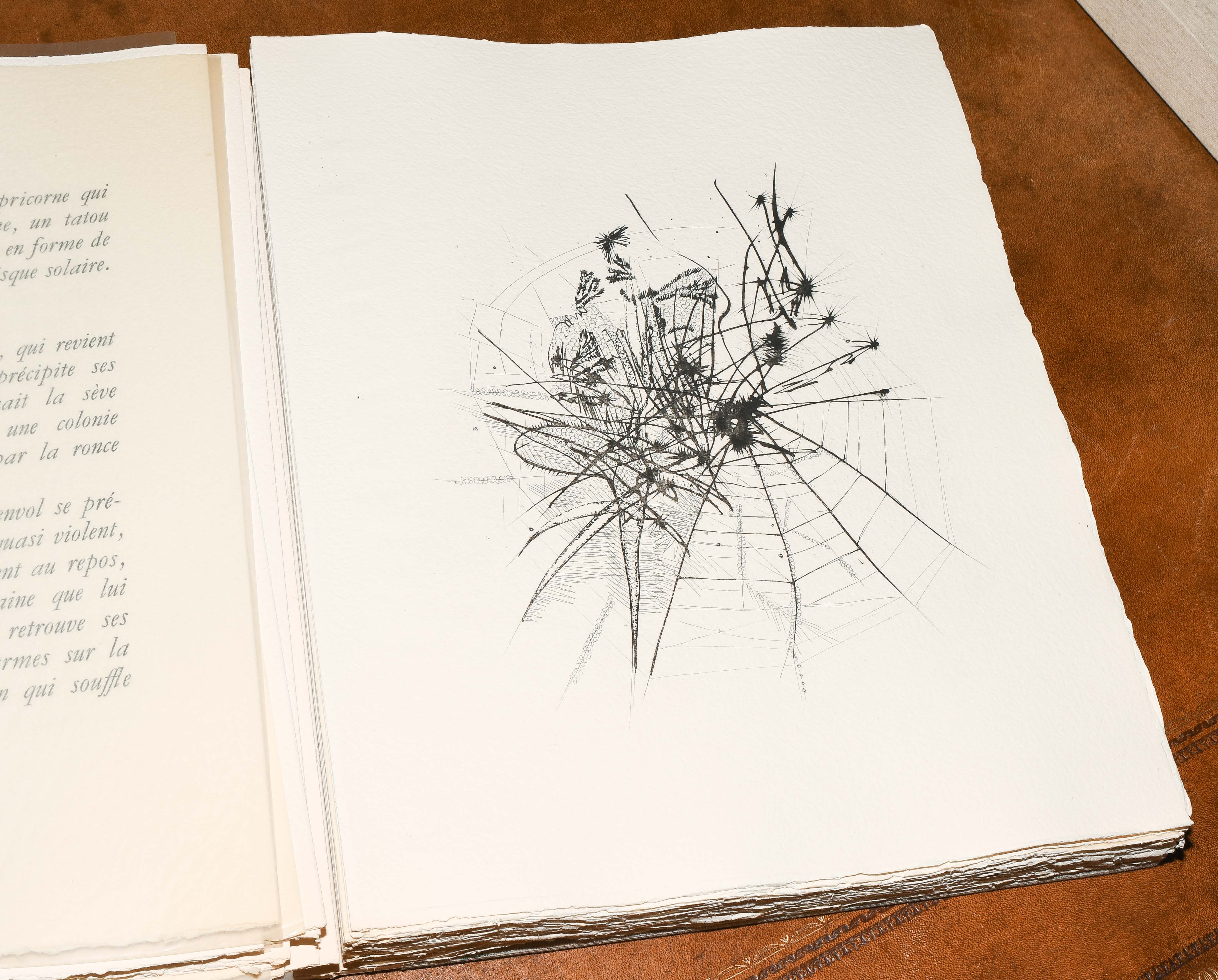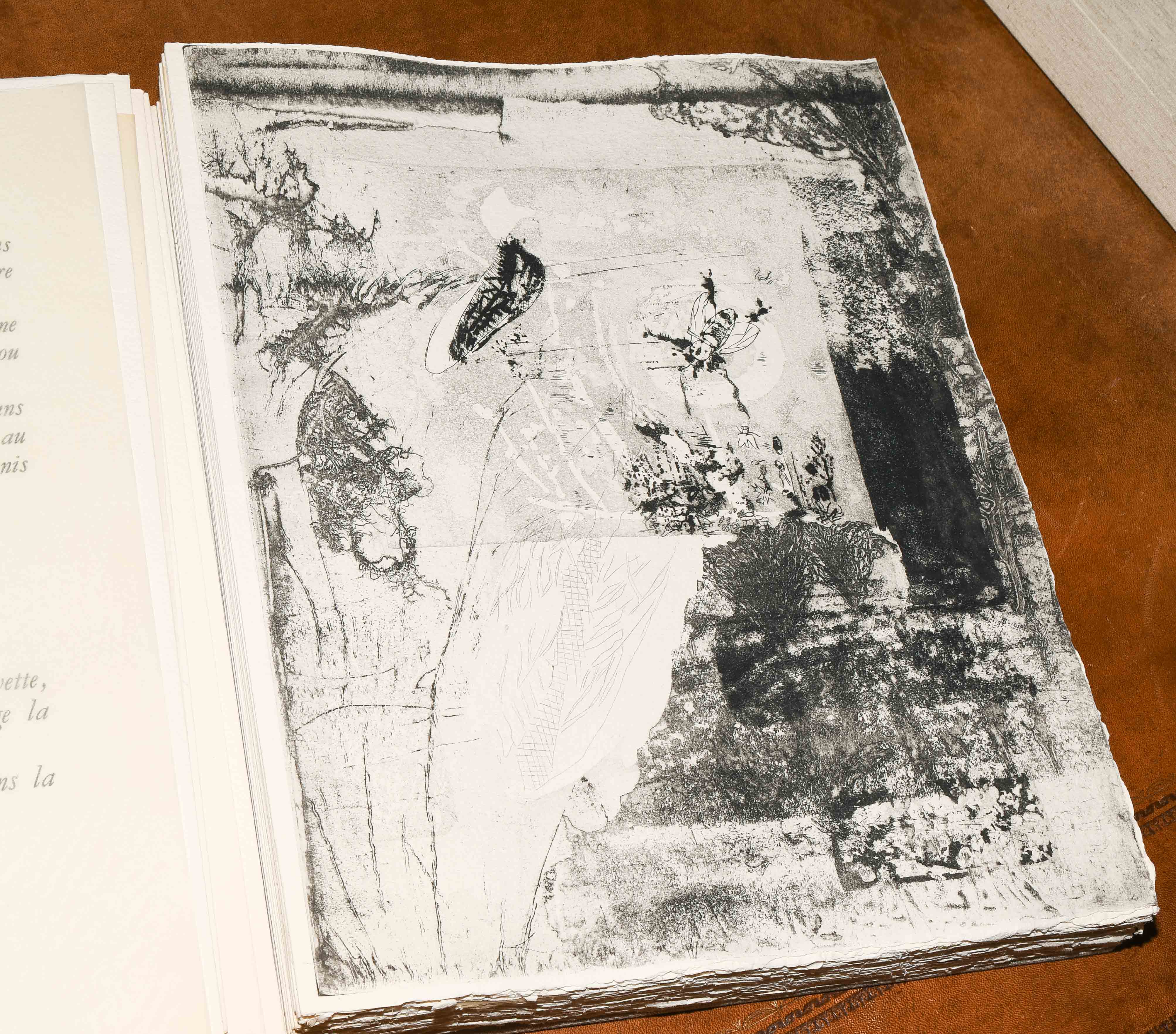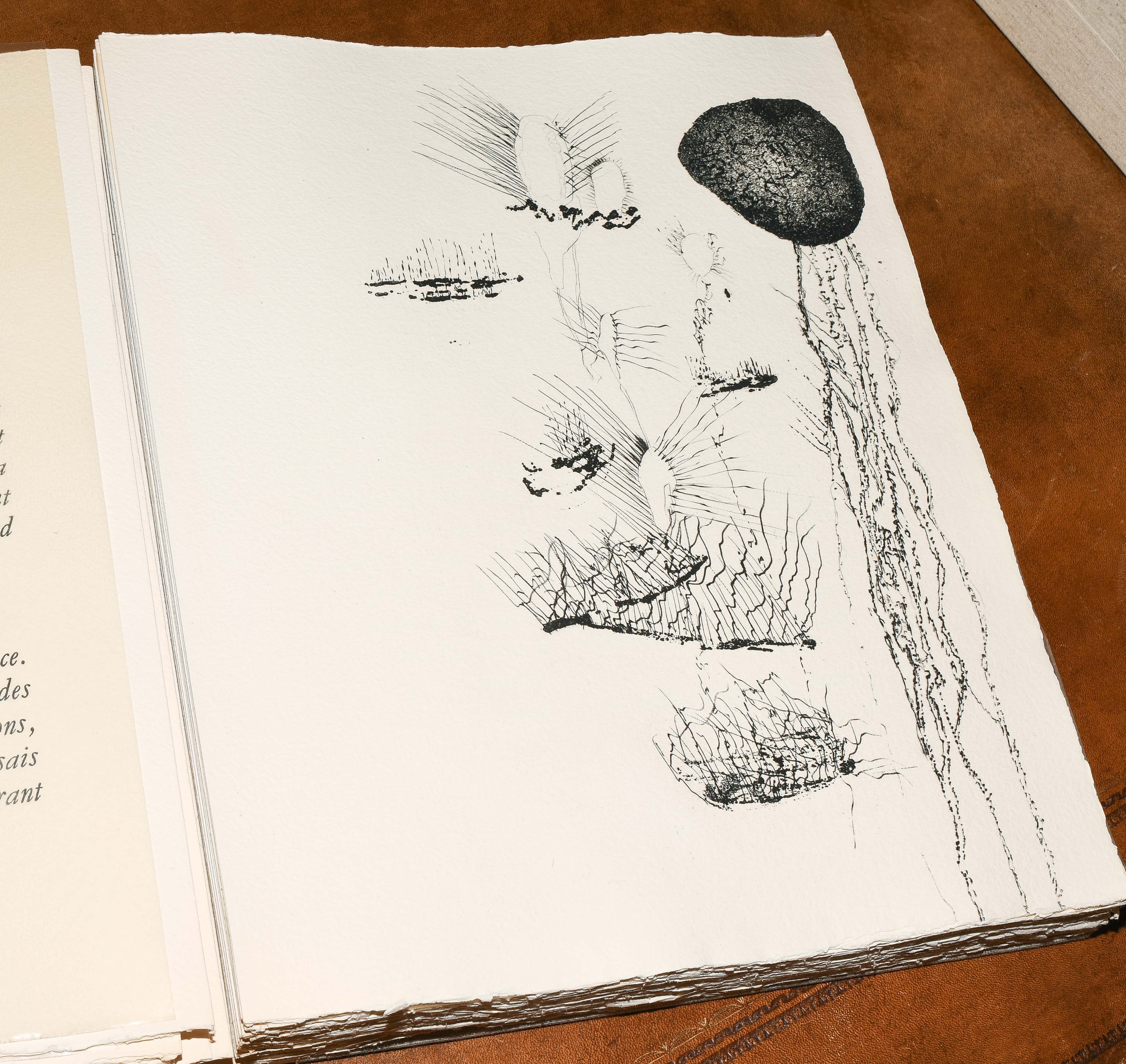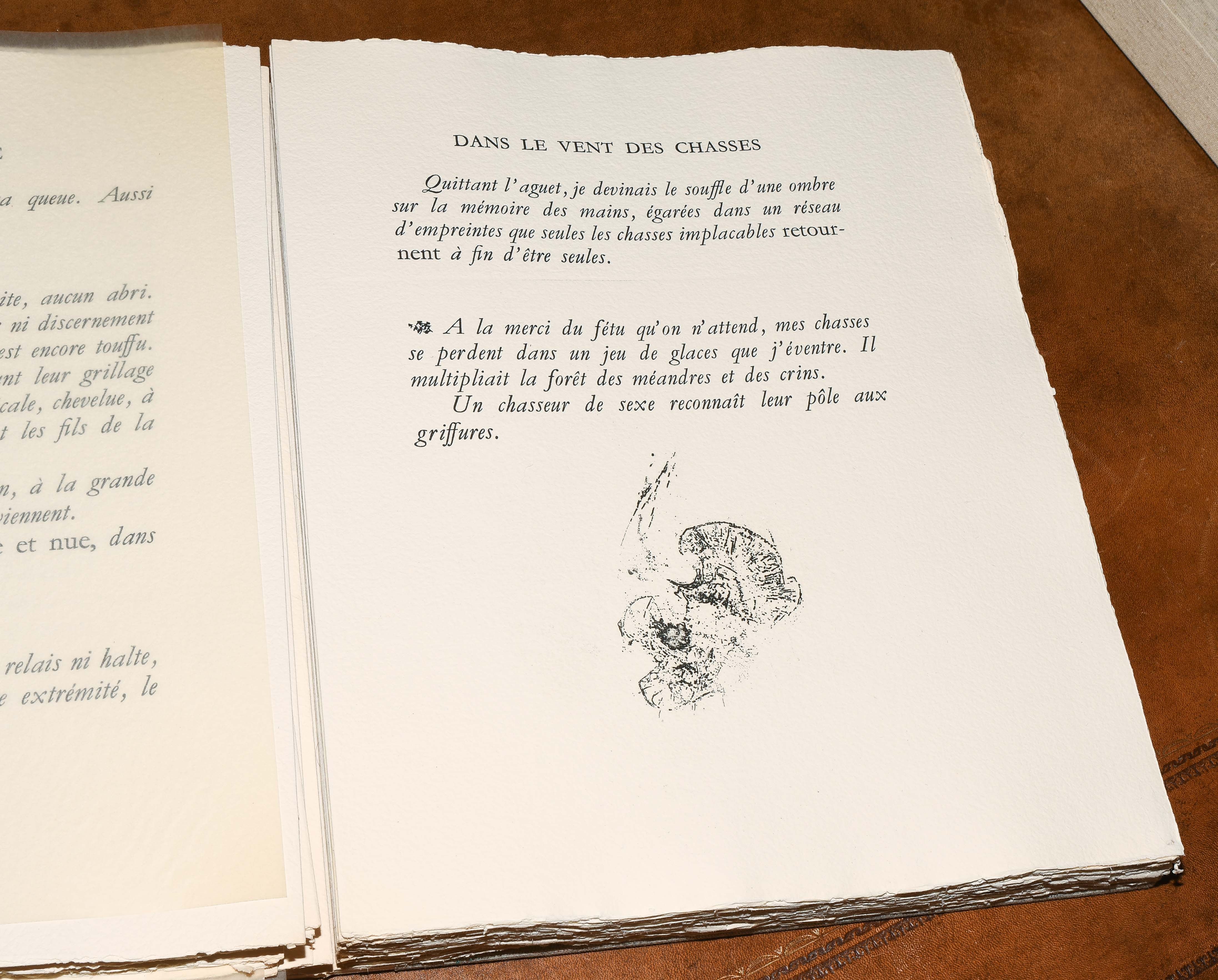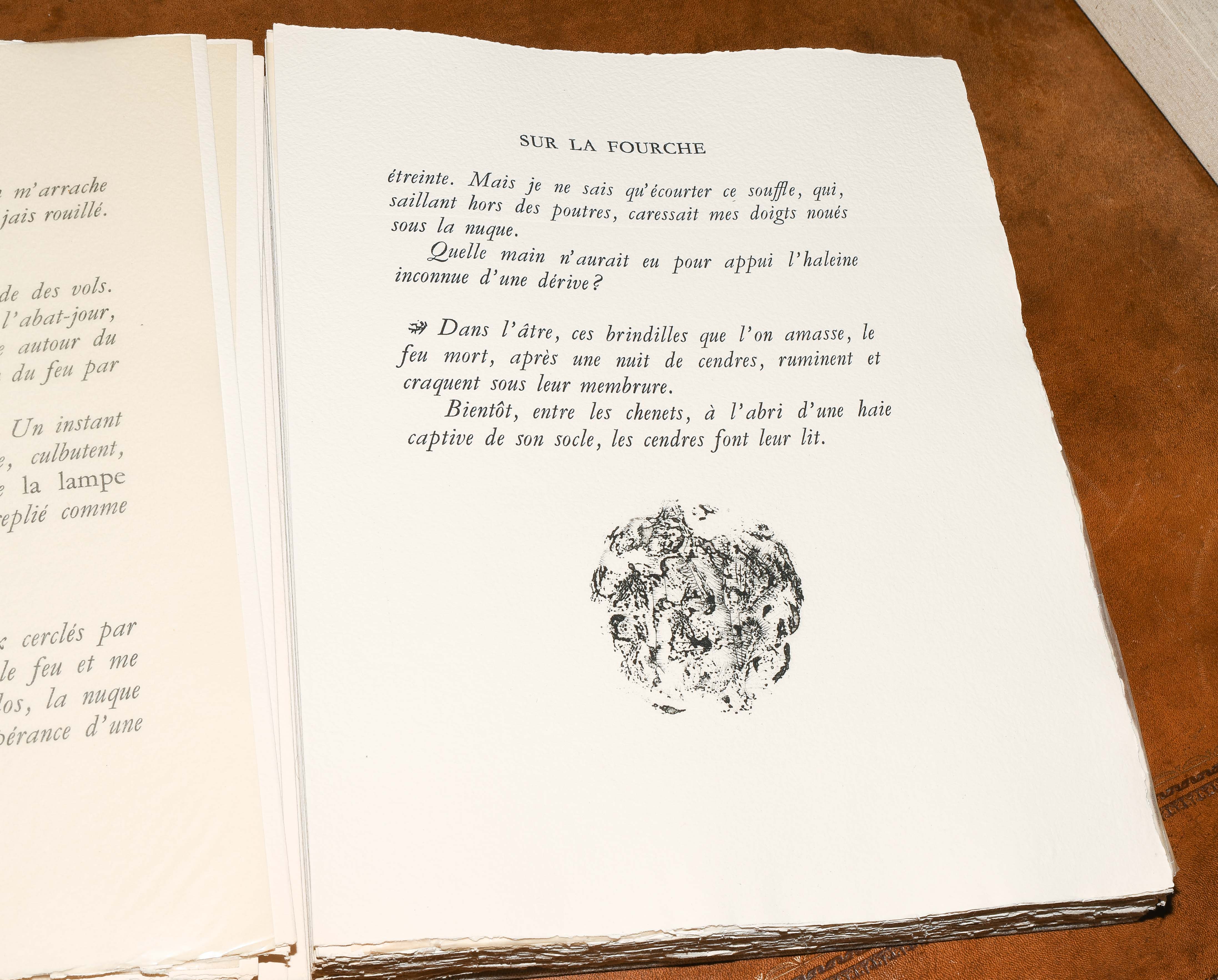 "Contre terre". Solier, René de. Illustré de vingt-quatre eaux-fortes originales de Germaine Richier. Lausanne, André et Pierre Gonin, 1958. Gr. 4°, 130 S. Mit 24 Orig.- Radierungen von Germaine Richier. Eins von 120 Ex. (GA 130). Lose Bll. in Orig. Umschlag in Orig. Halbpergament- Chemise und Orig.- Schuber. Von Richier, Solier und Gonin im Impressum signiert.