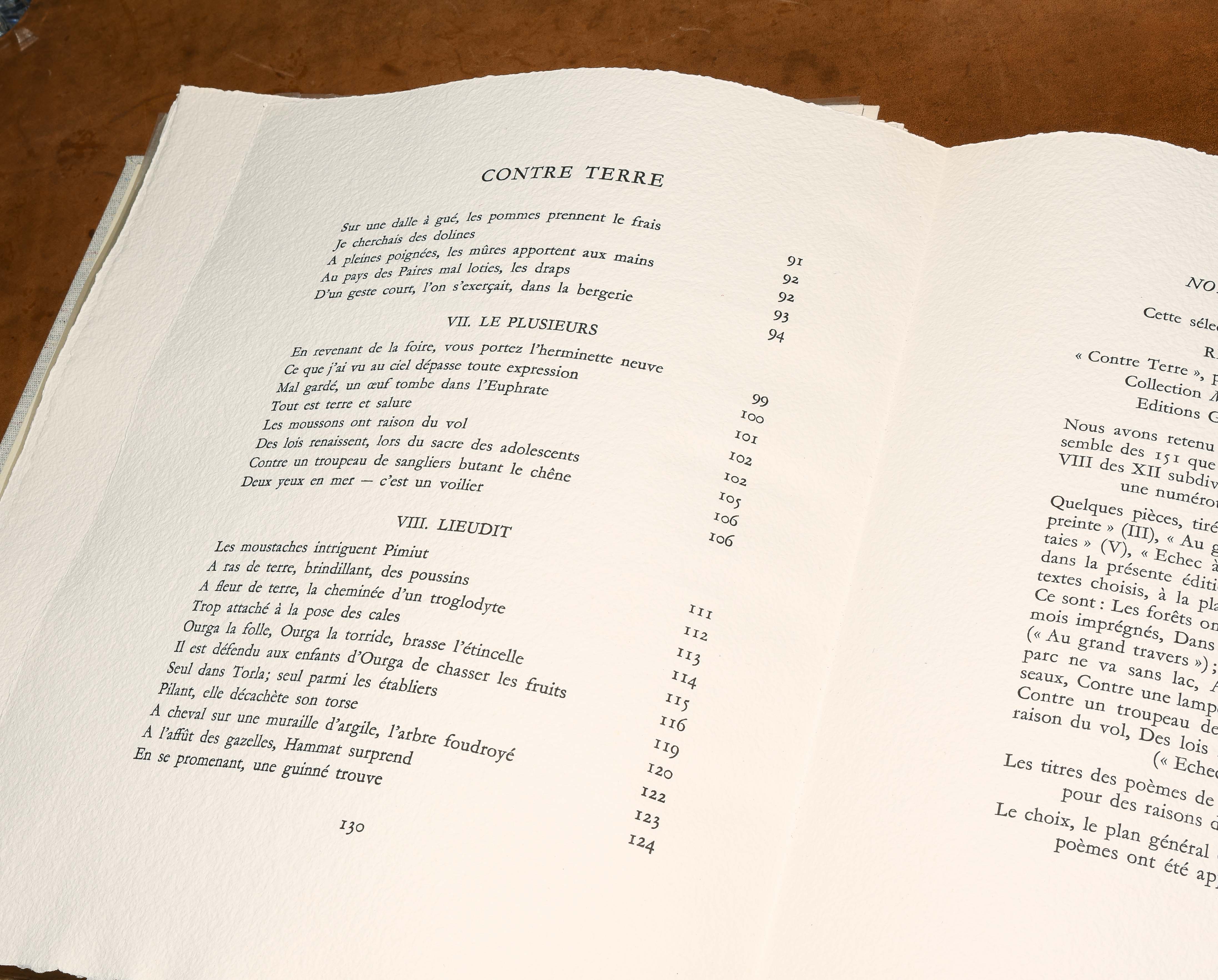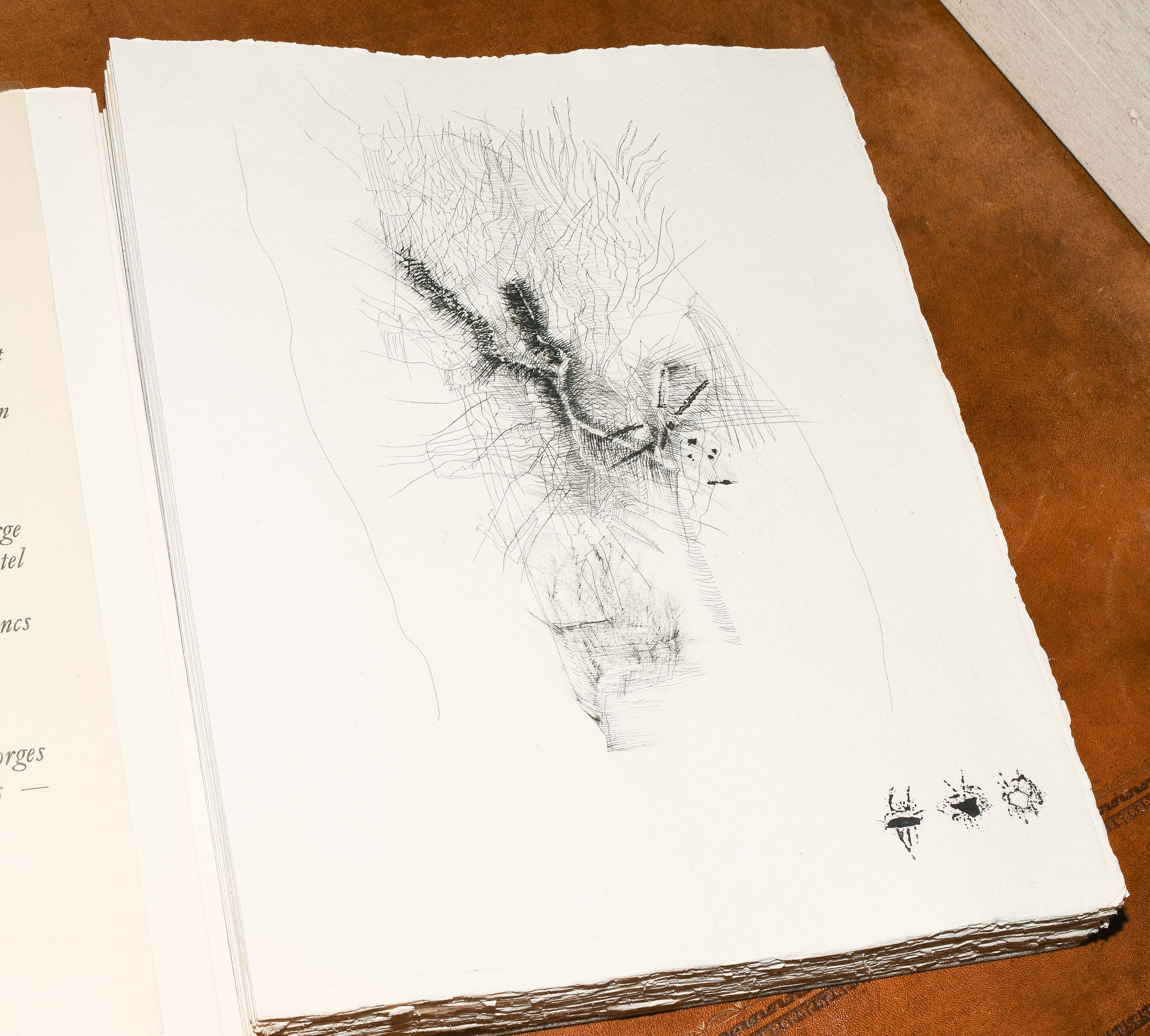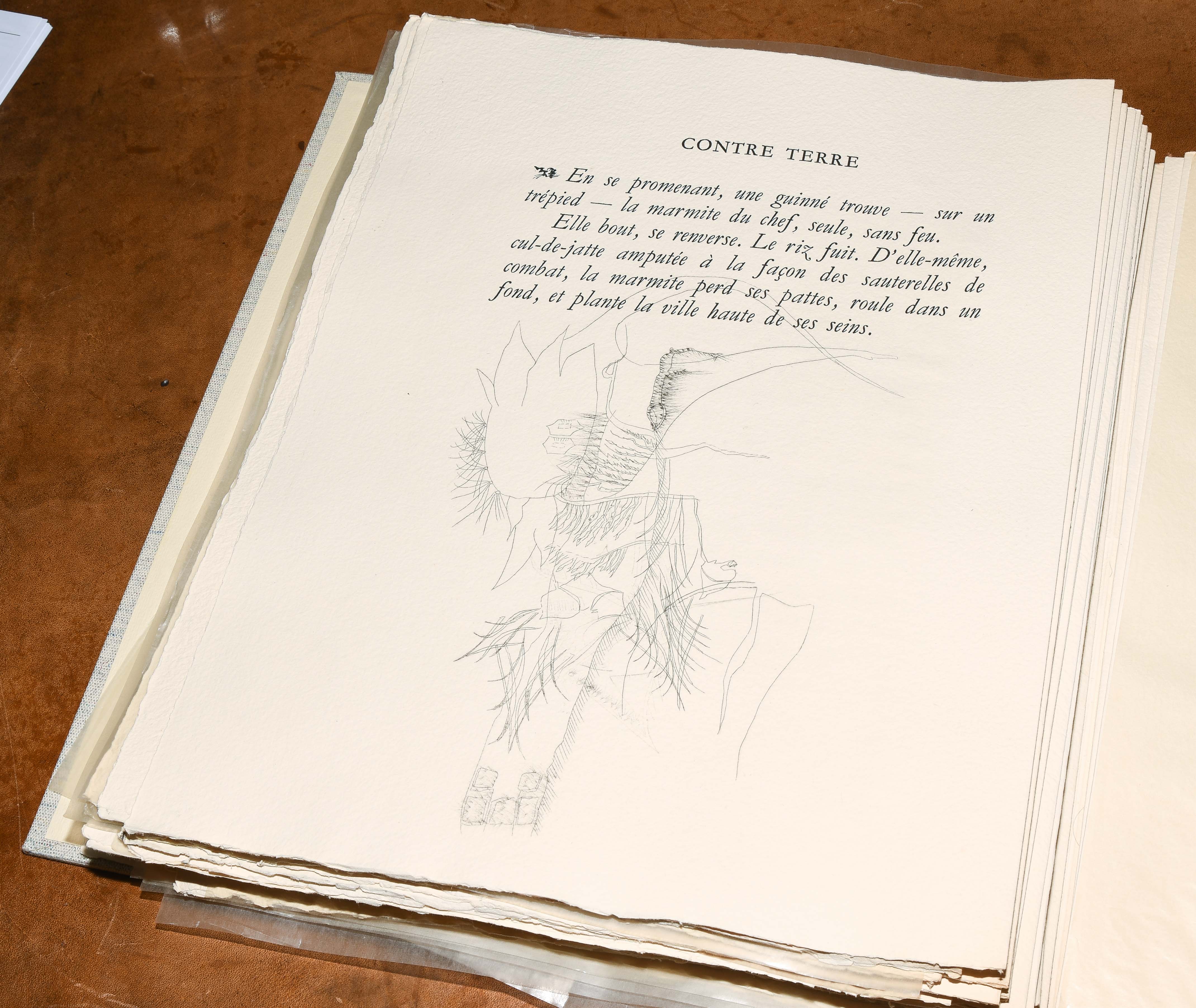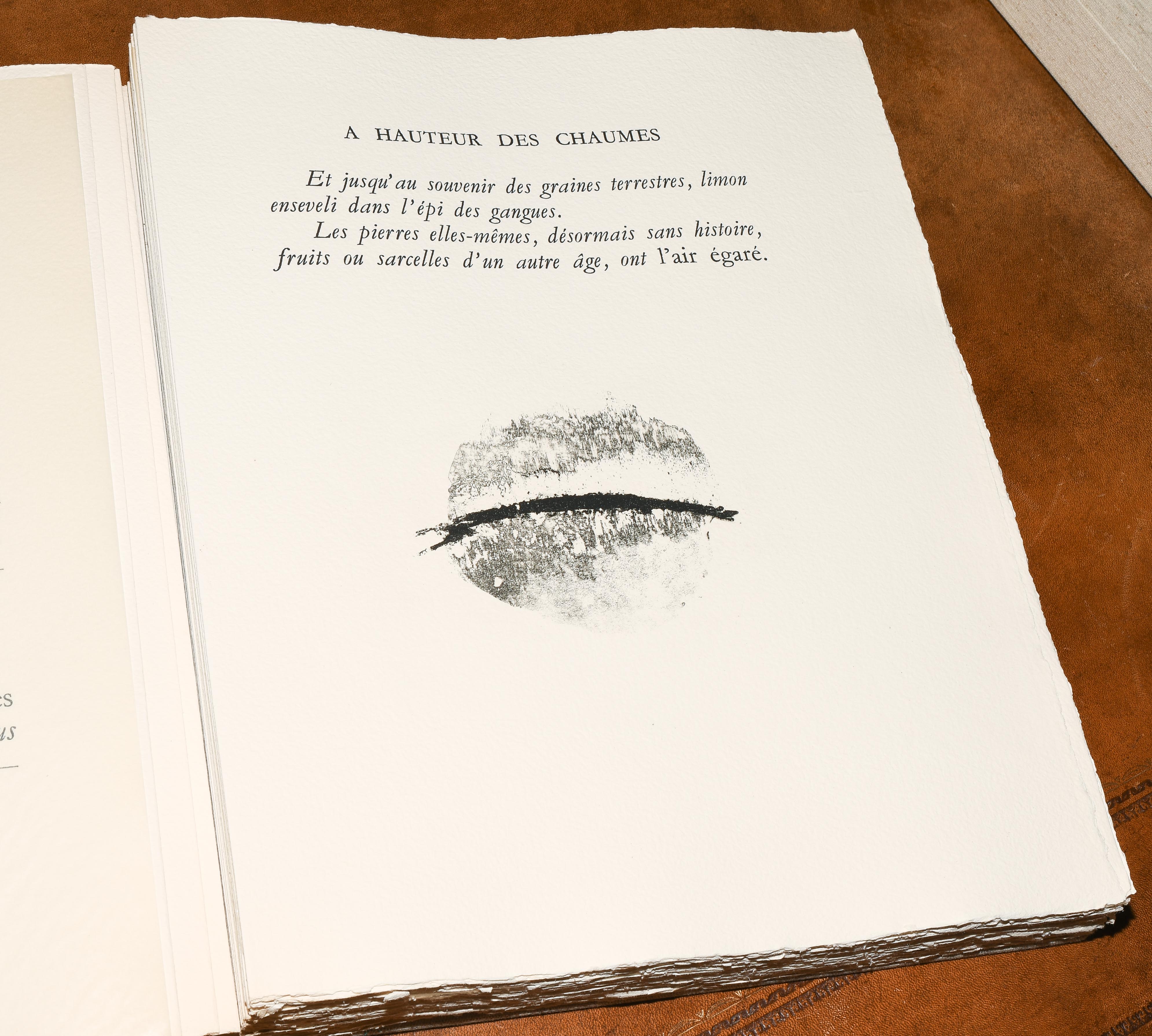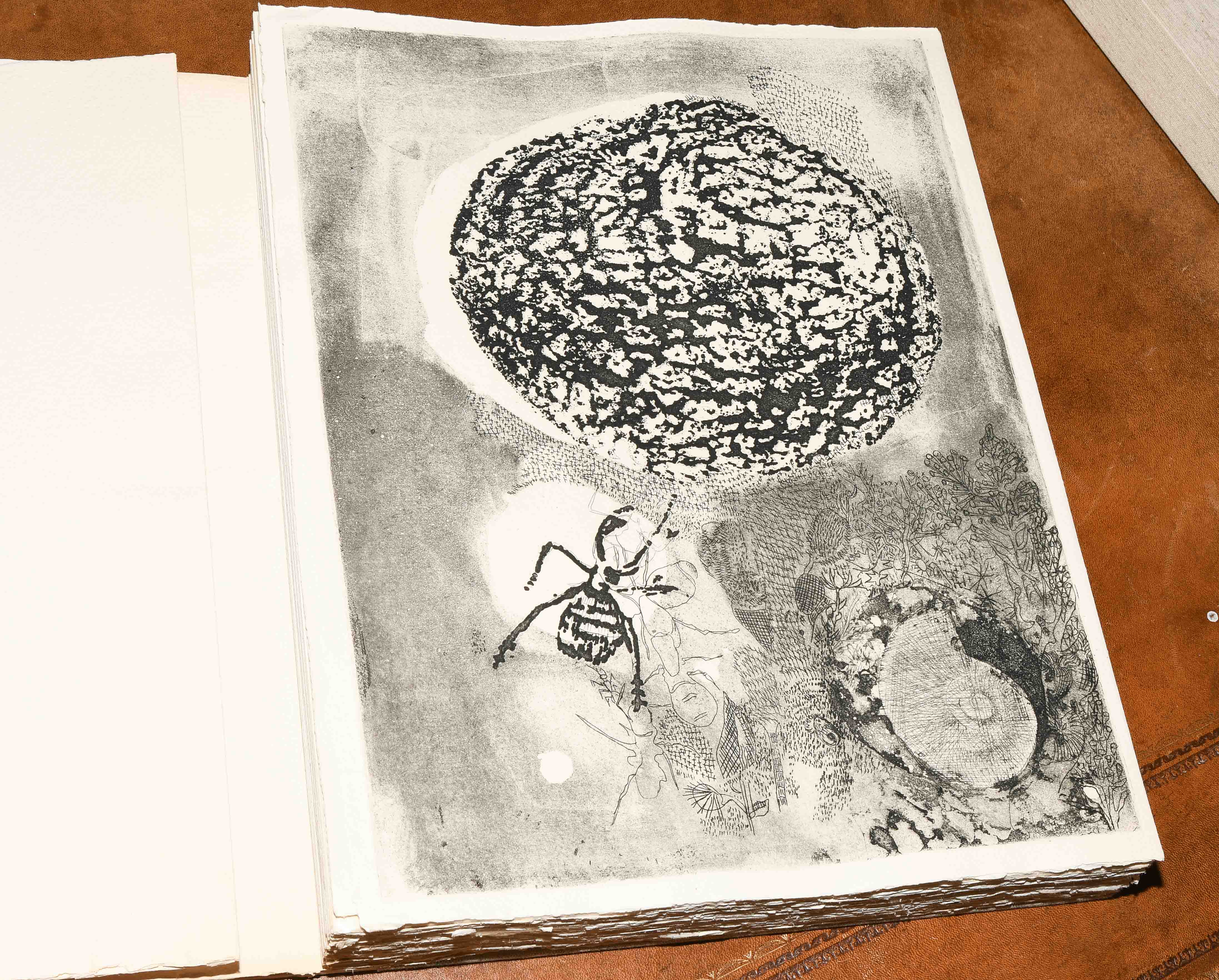 "Contre terre". Solier, René de. Illustré de vingt-quatre eaux-fortes originales de Germaine Richier. Lausanne, André et Pierre Gonin, 1958. Gr. 4°, 130 S. Mit 24 Orig.- Radierungen von Germaine Richier. Eins von 120 Ex. (GA 130). Lose Bll. in Orig. Umschlag in Orig. Halbpergament- Chemise und Orig.- Schuber. Von Richier, Solier und Gonin im Impressum signiert.