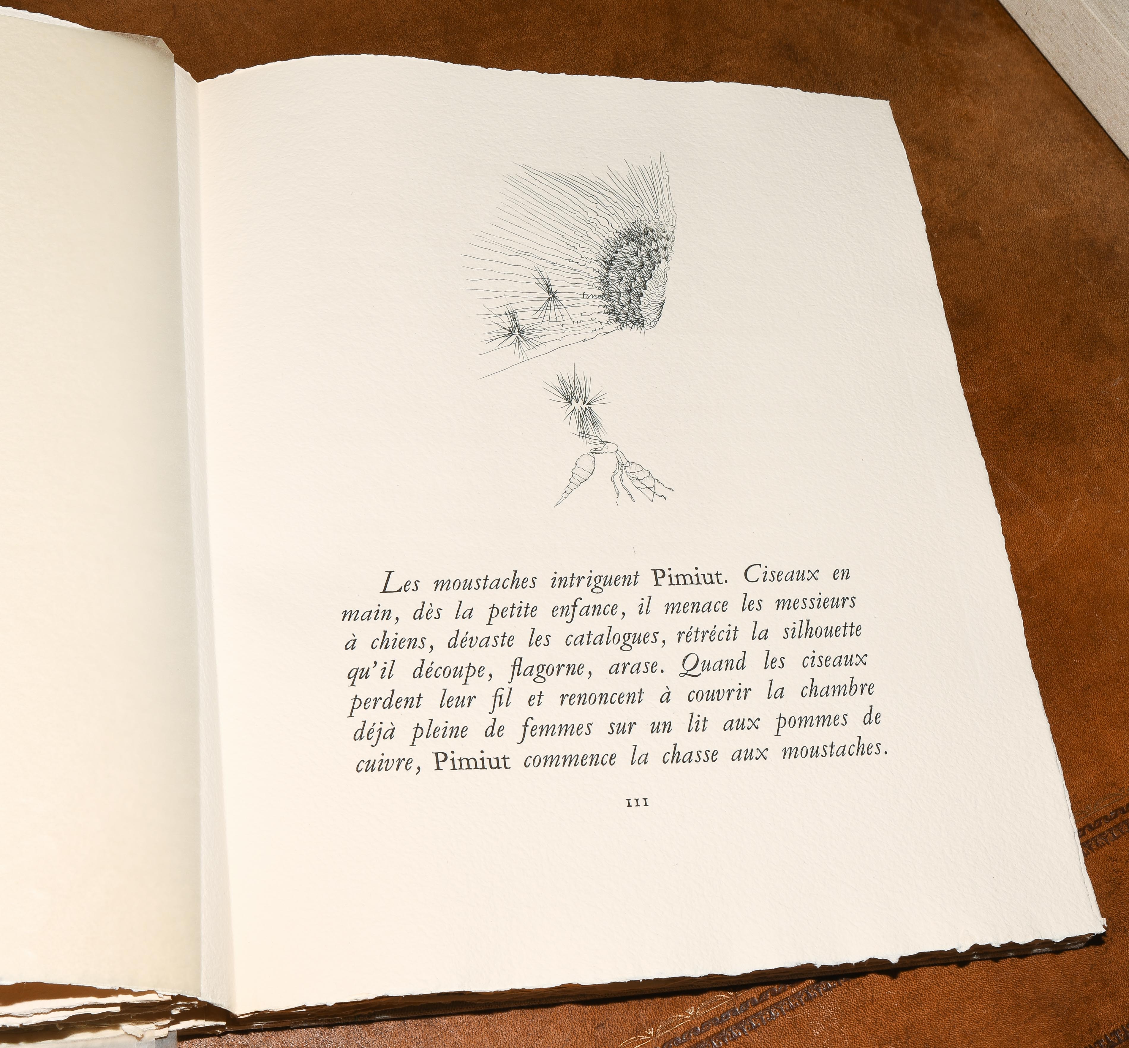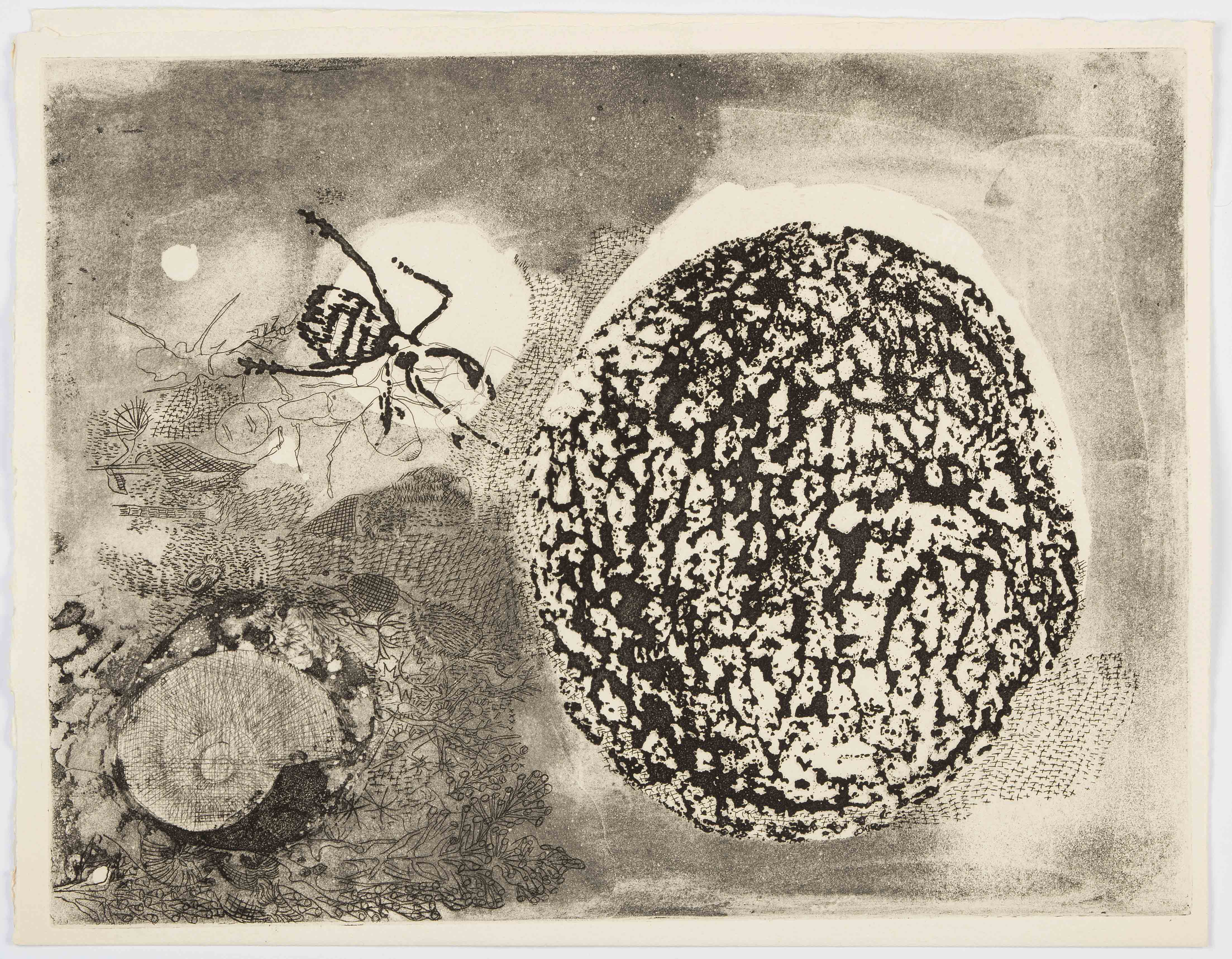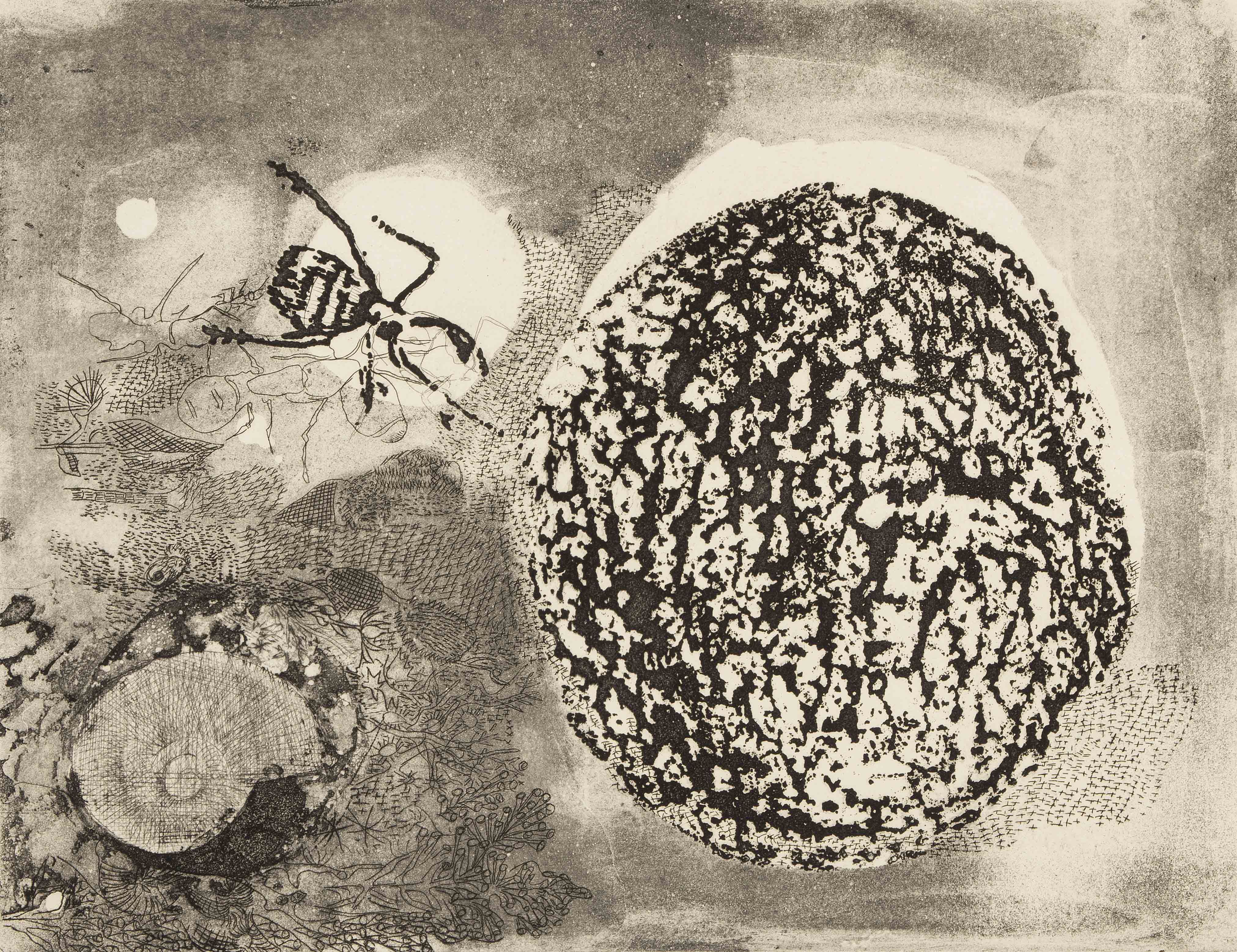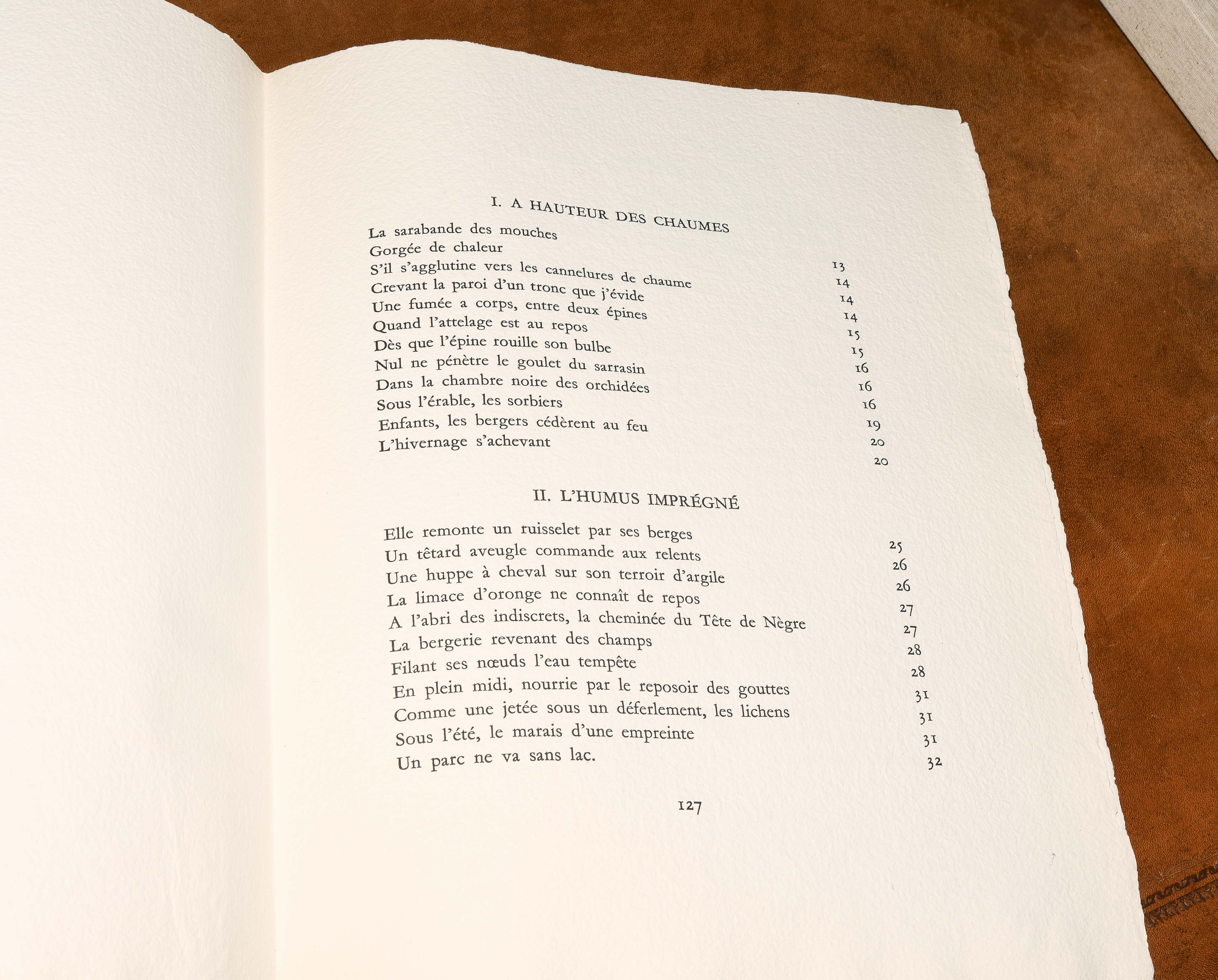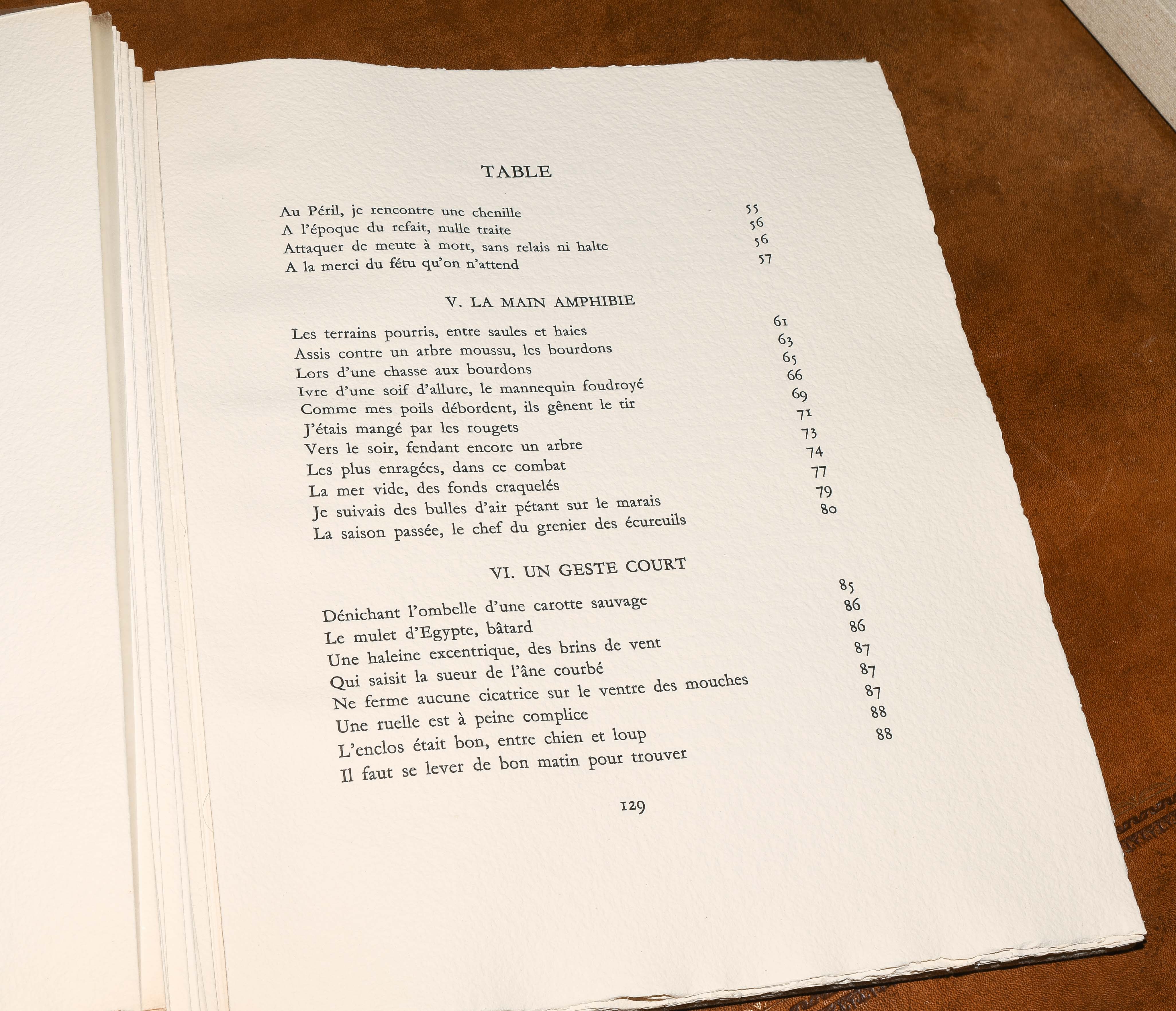 "Contre terre". Solier, René de. Illustré de vingt-quatre eaux-fortes originales de Germaine Richier. Lausanne, André et Pierre Gonin, 1958. Gr. 4°, 130 S. Mit 24 Orig.- Radierungen von Germaine Richier. Eins von 120 Ex. (GA 130). Lose Bll. in Orig. Umschlag in Orig. Halbpergament- Chemise und Orig.- Schuber. Von Richier, Solier und Gonin im Impressum signiert.