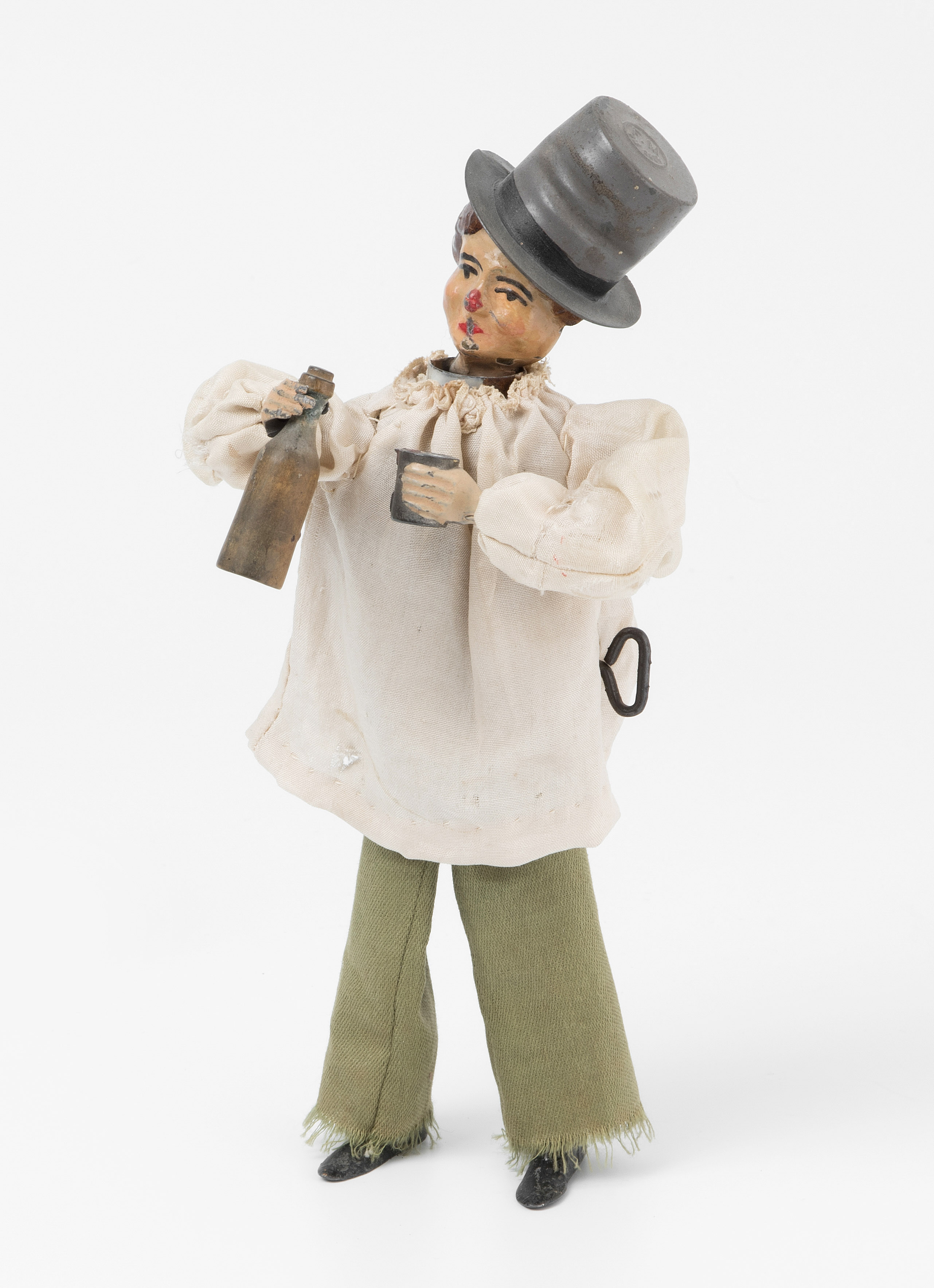Frankreich, um 1900/10. Körper aus Blech. Kopf, Hände und Füsse farbig lackiert. Kleidung aus Stoff, Hose wohl assortiert. Trinker mit Hut, Weinflasche und Trinkbecher. Uhrwerkantrieb. H 20 cm.