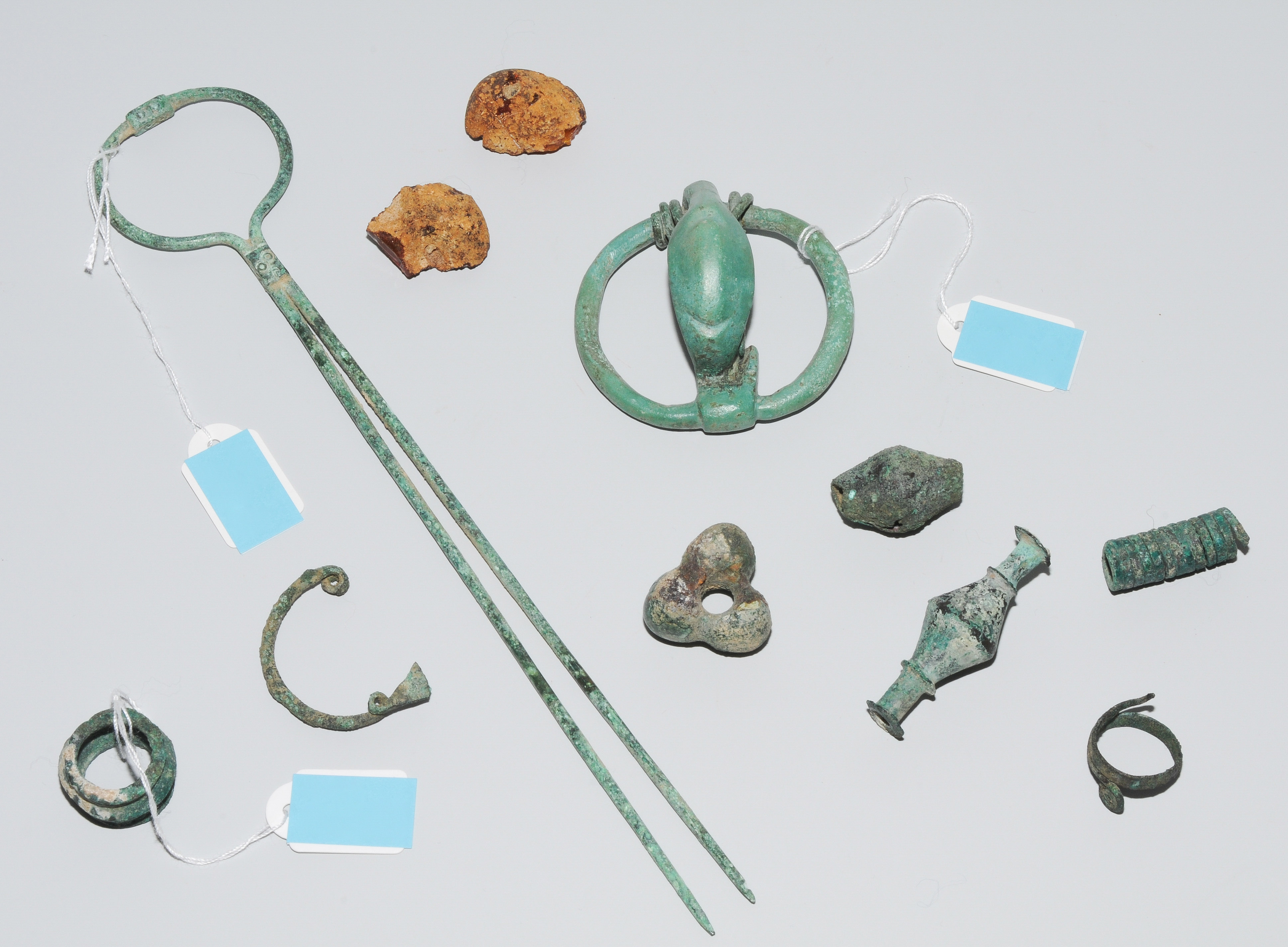 Gewandnadel, griechisch-geometrisch, 8.–6.Jh. v.C. Bronze. Rundbogen mit zwei langen Nadeln. L 22,5. Ringförmige Fibel mit kahnförmigem Bogen. Italisch, 7./6.Jh. v.C. B 6. Sieben kleine Bronzeobjekte: Spiralring, Spiralröhre, Bogen einer kleinen Fibel, vier Bronzeperlen in verschiedenen Formen. Dazu zwei durchbohrte Bersteinperlen-Fragmente. L 1,8–4 cm.