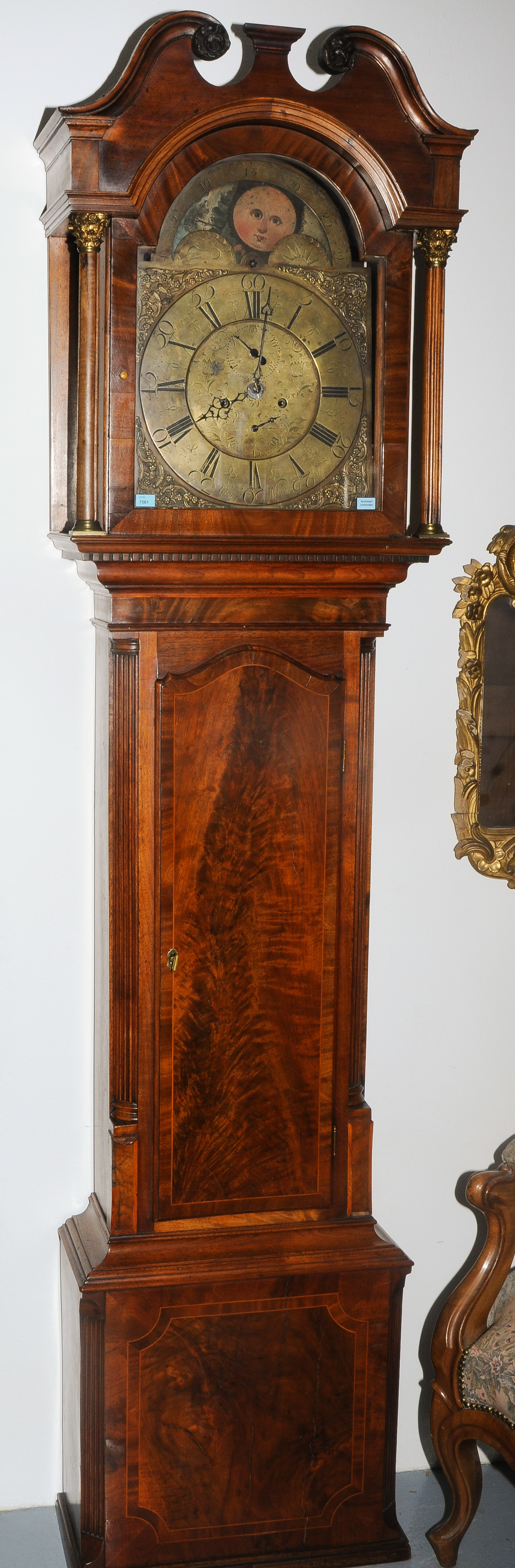 England, um 1800. Edelholzgehäuse mit intarsierter Fronttüre und verglaster Ziffertüre. Zwei seitliche Säulen mit verzierten Bronzeabschlüssen. Bronzezifferring mit römischen Stunden- und arabischen Minutenzahlen und Signatur "George Womurstey". Sekundenanzeige bei 12 Uhr. Mondphasenanzeige über dem Zifferring mit gravierter Datumsanzeige am Aussenrand. Mit Verzierungen geritztes Zifferblatt mit verzierten Appliken an den Ecken. Ankerwerk mit Stundenschlag auf Glocke. Schwerer Hinterpendel mit Gewichtsseilzug. Gehfähig. 215x52 cm. 2 Schlüssel beigegeben.