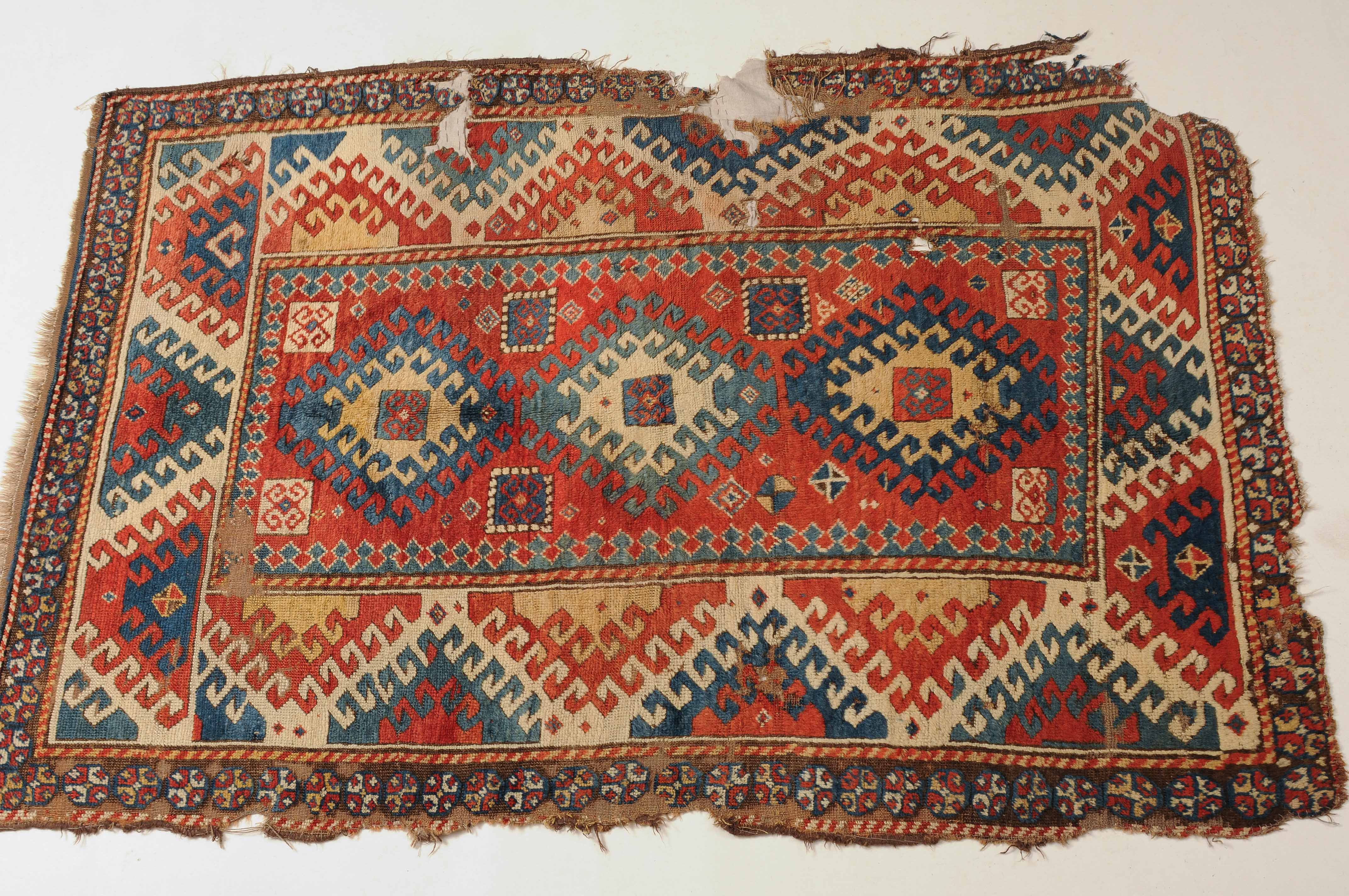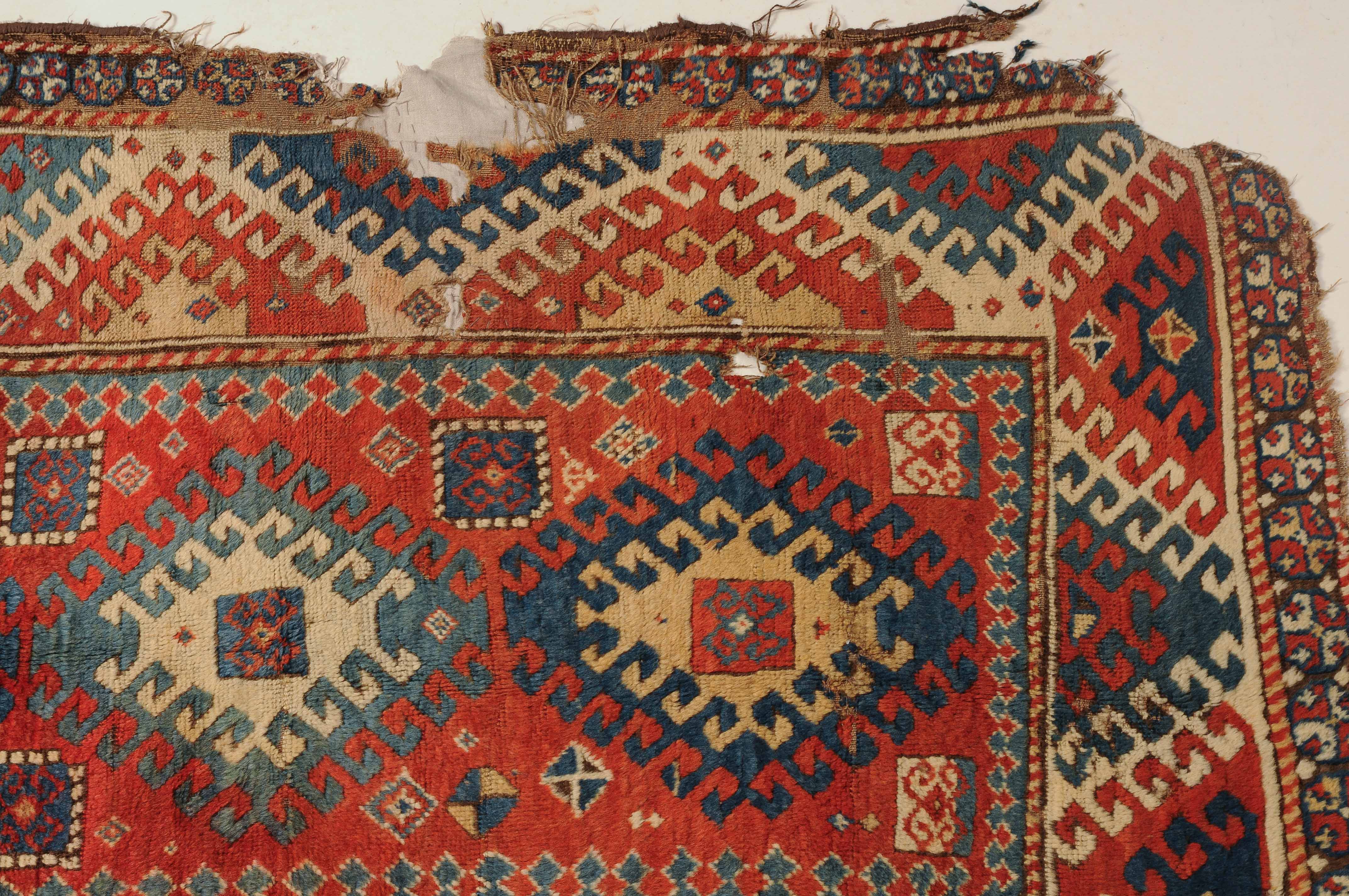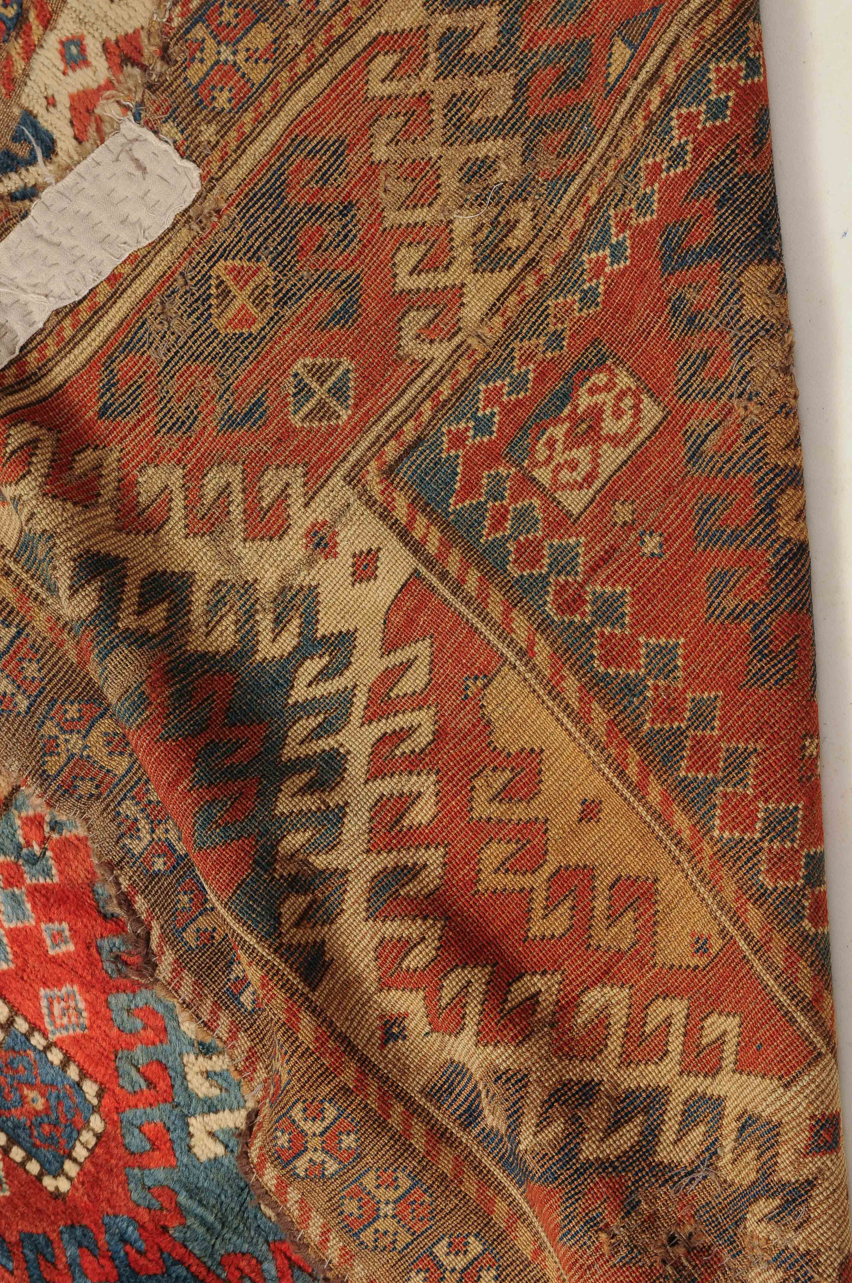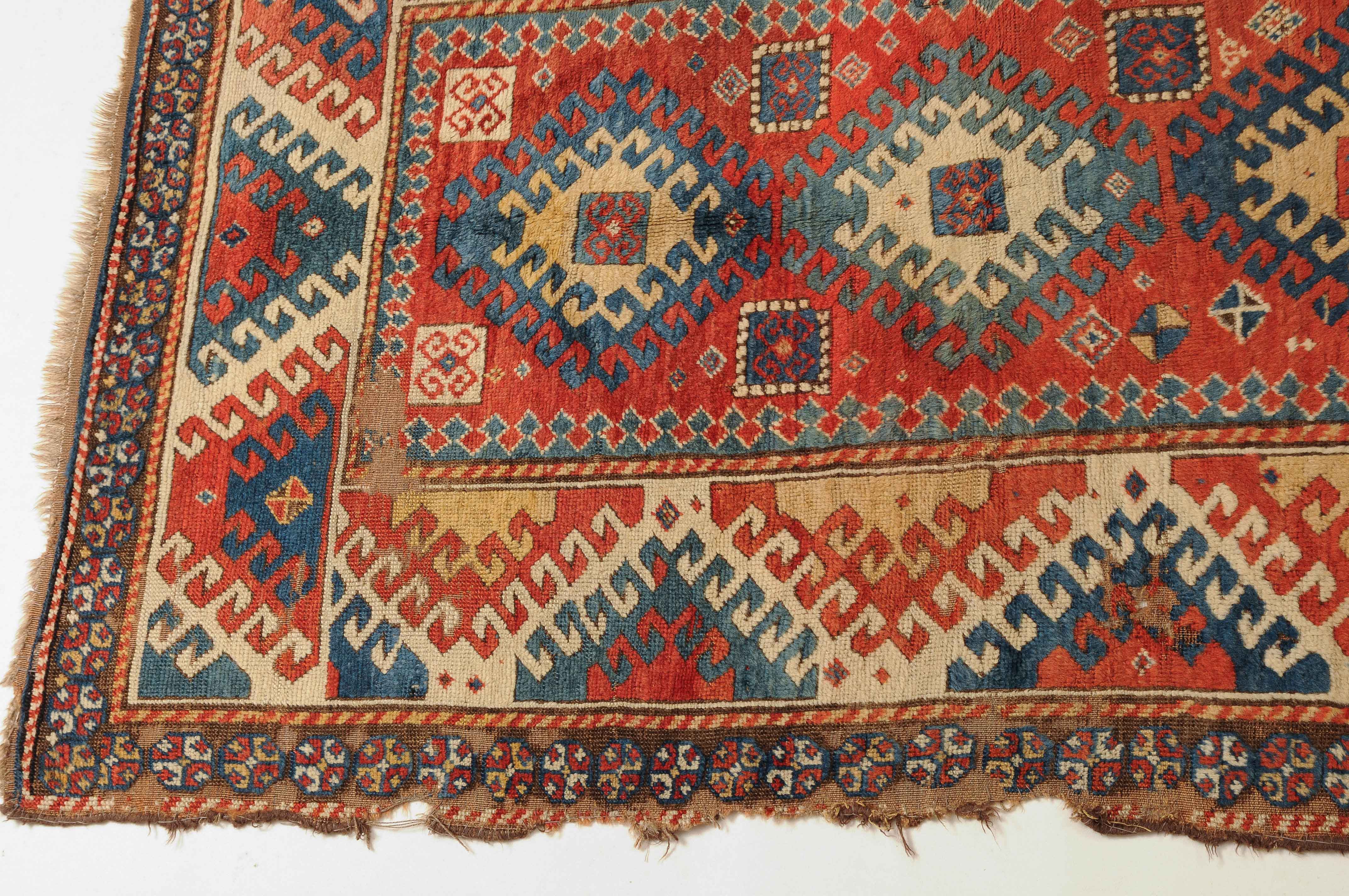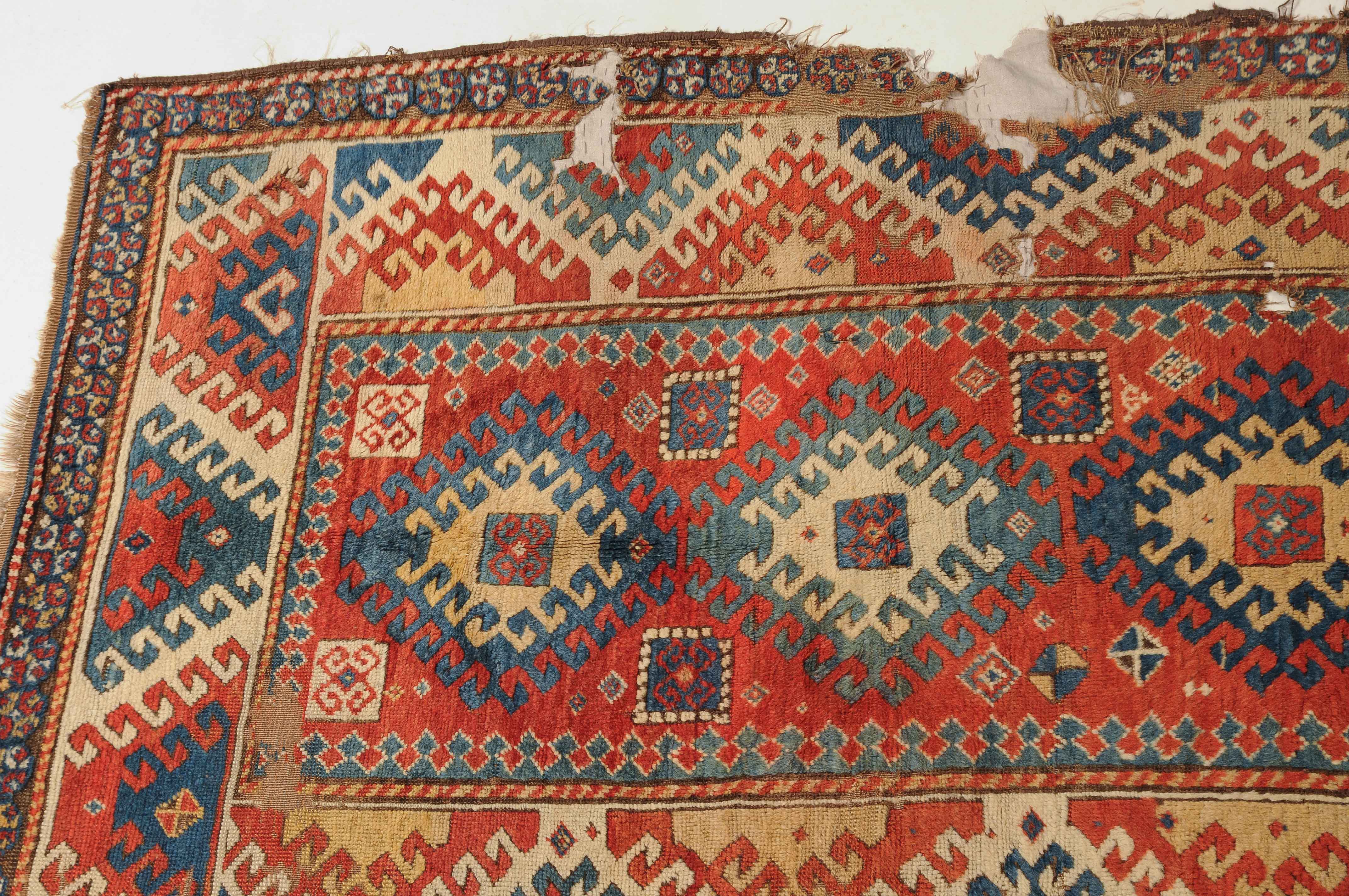 Z-Kaukasus, um 1900. Auf ziegelrotem Grund thronen 3 Hakenrauten-Medaillons, flankiert von effektvollen viergeteilten Rauten und Streudekor. Eine blaurote reziproke Medachyl-Innenborte und eine Blüten-Aussenborte umfassen die breite, für einen Bordjalou charakteristische Hauptbordüre. Starke Gebrauchsspuren, fehlende Teile. 121x184 cm (ft. 4x6.1).