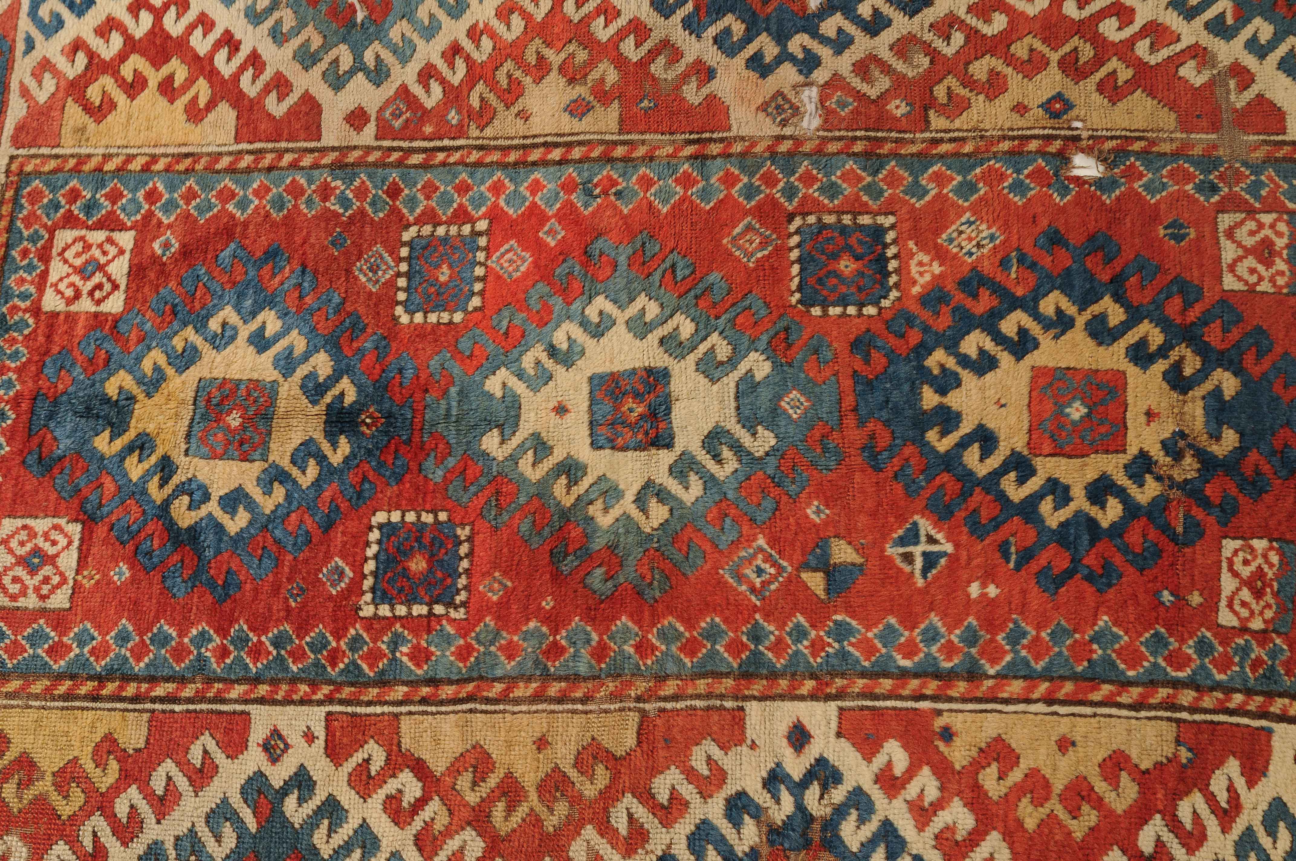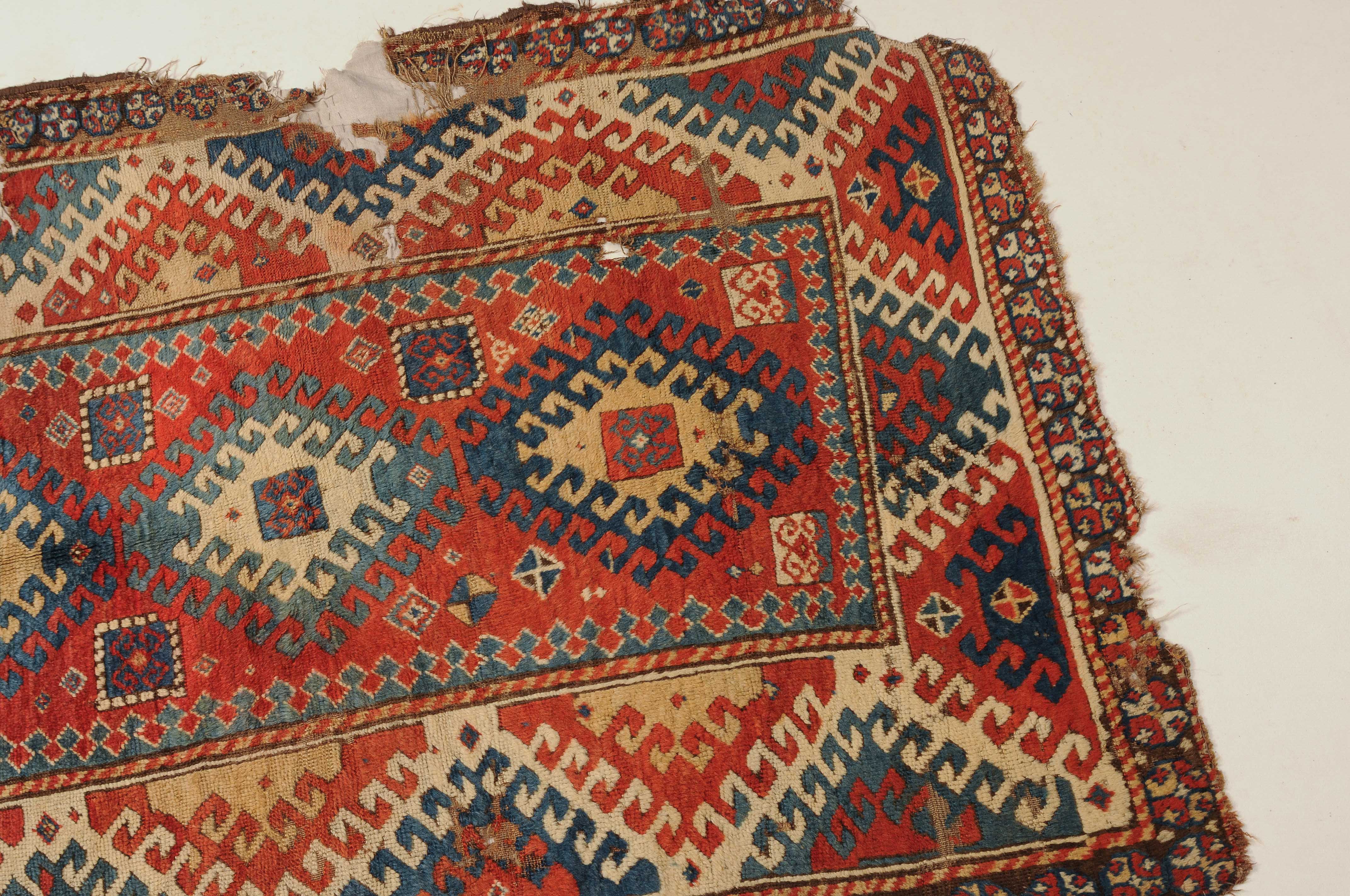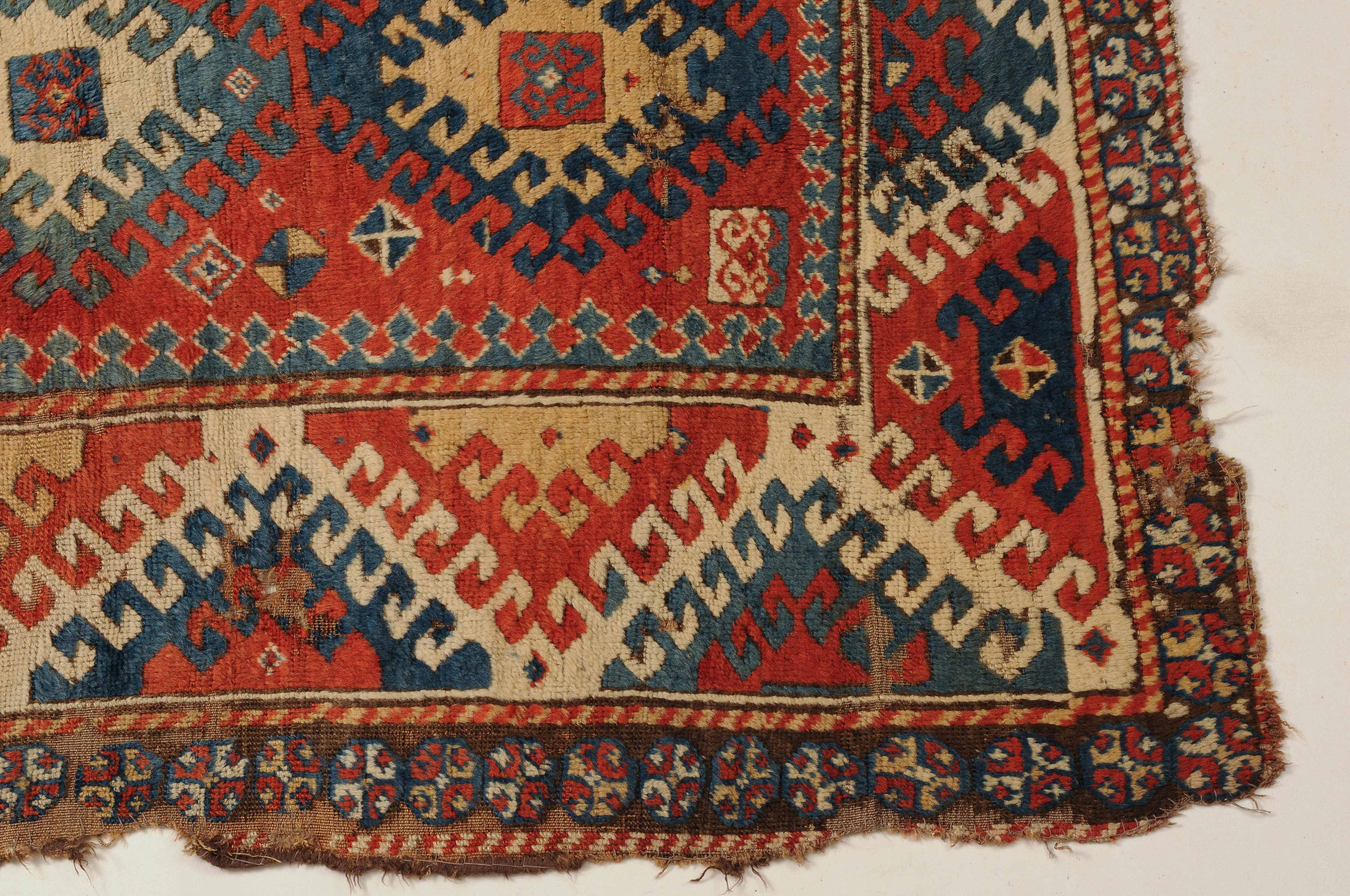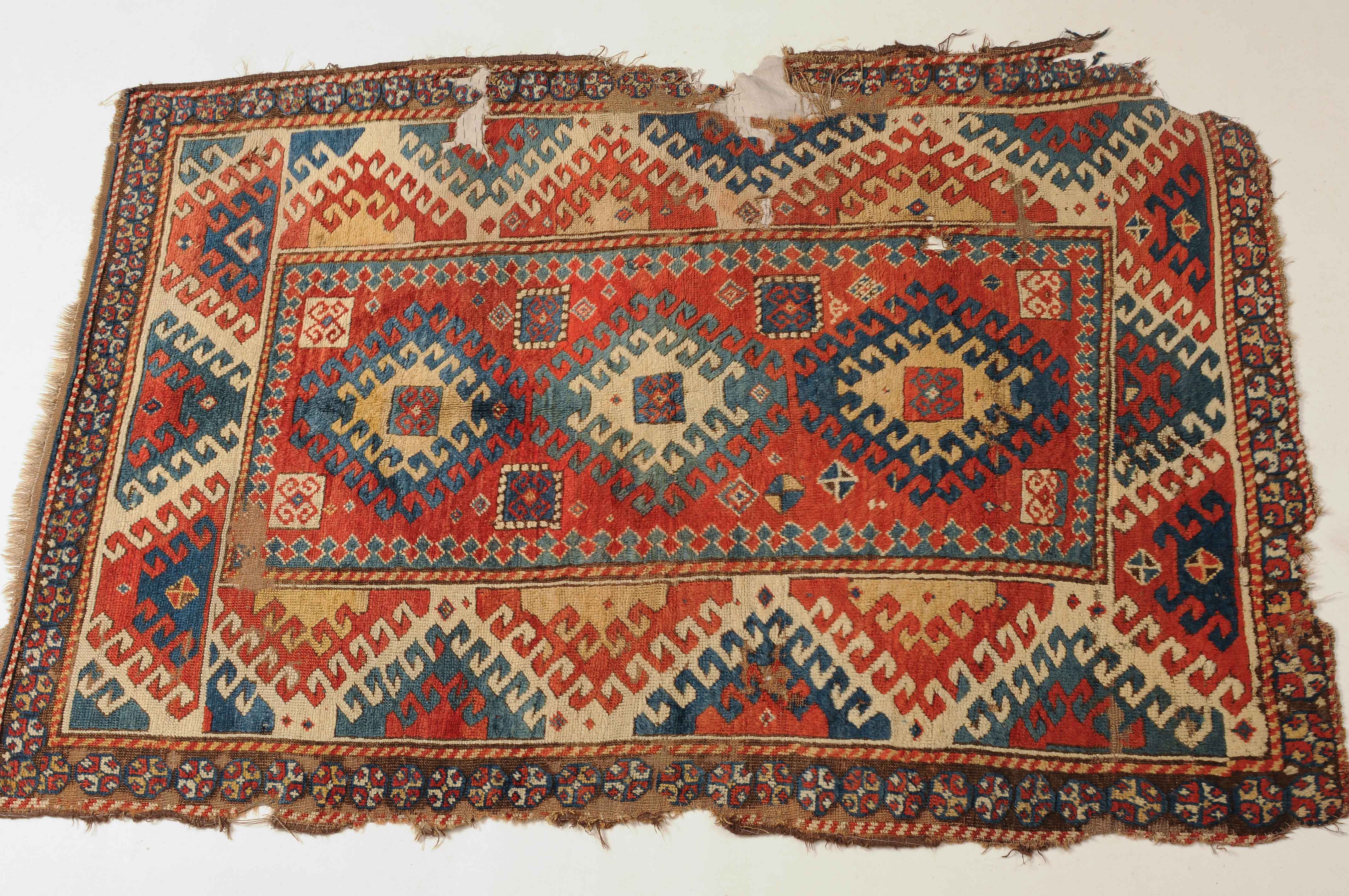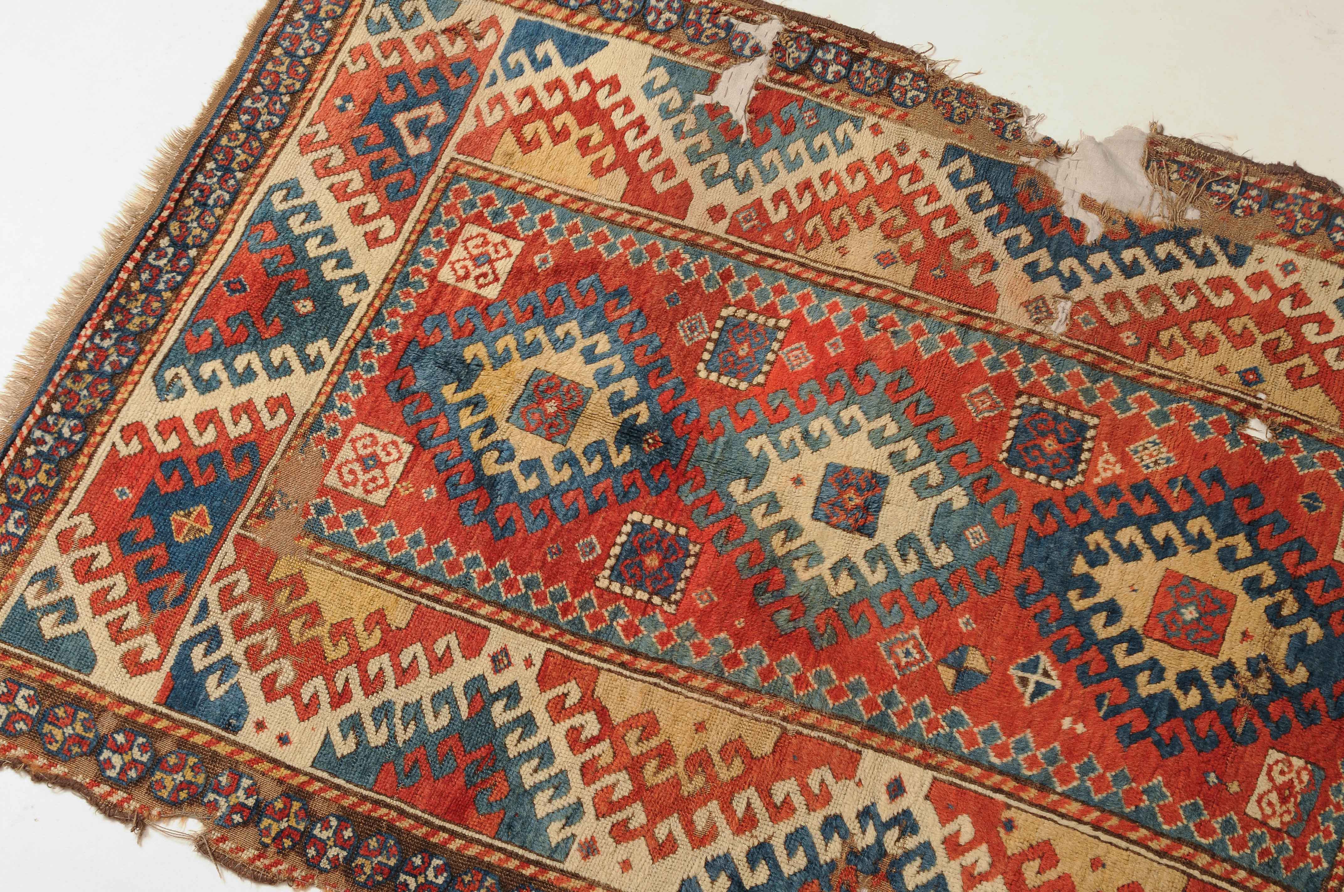 Z-Kaukasus, um 1900. Auf ziegelrotem Grund thronen 3 Hakenrauten-Medaillons, flankiert von effektvollen viergeteilten Rauten und Streudekor. Eine blaurote reziproke Medachyl-Innenborte und eine Blüten-Aussenborte umfassen die breite, für einen Bordjalou charakteristische Hauptbordüre. Starke Gebrauchsspuren, fehlende Teile. 121x184 cm (ft. 4x6.1).