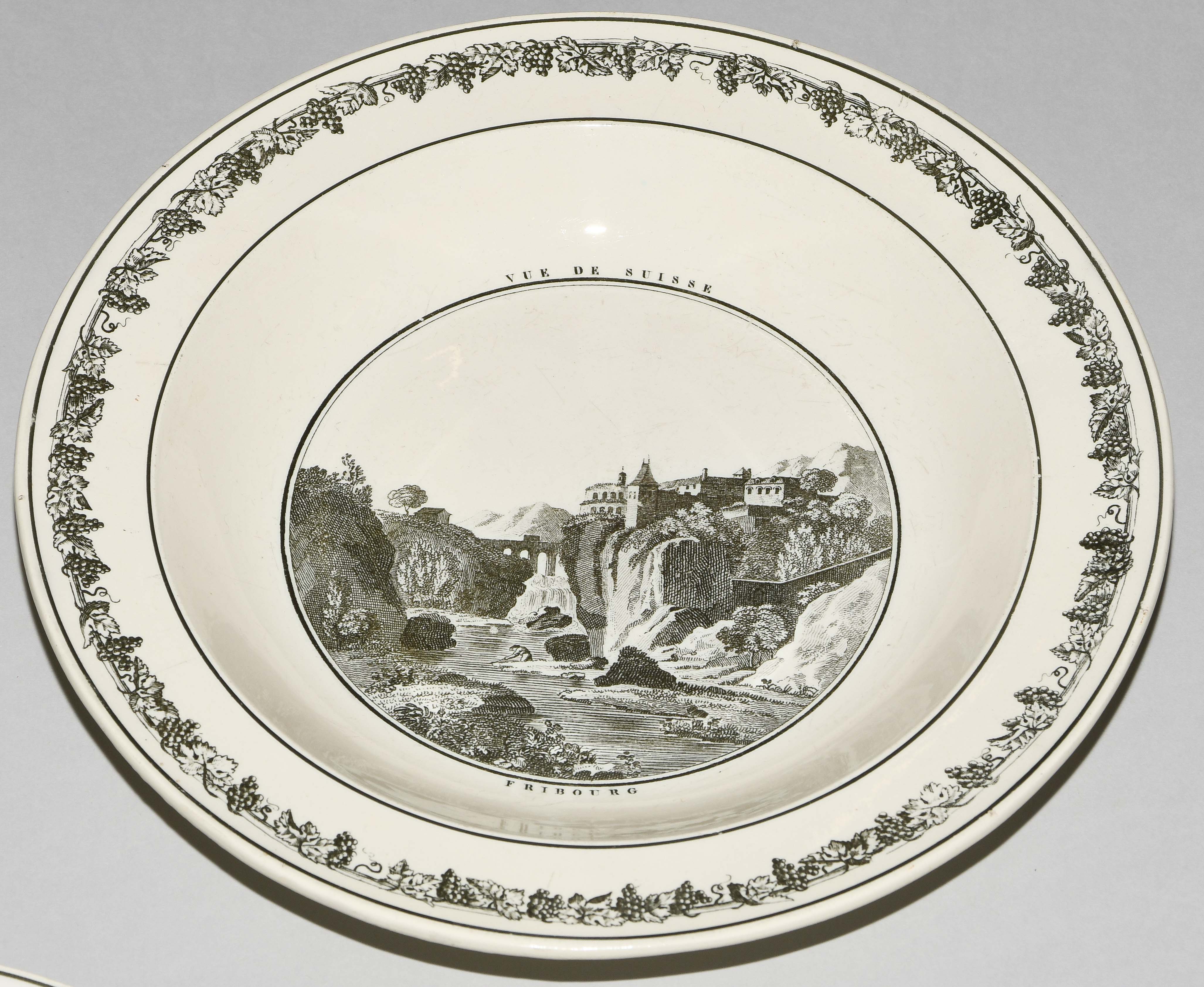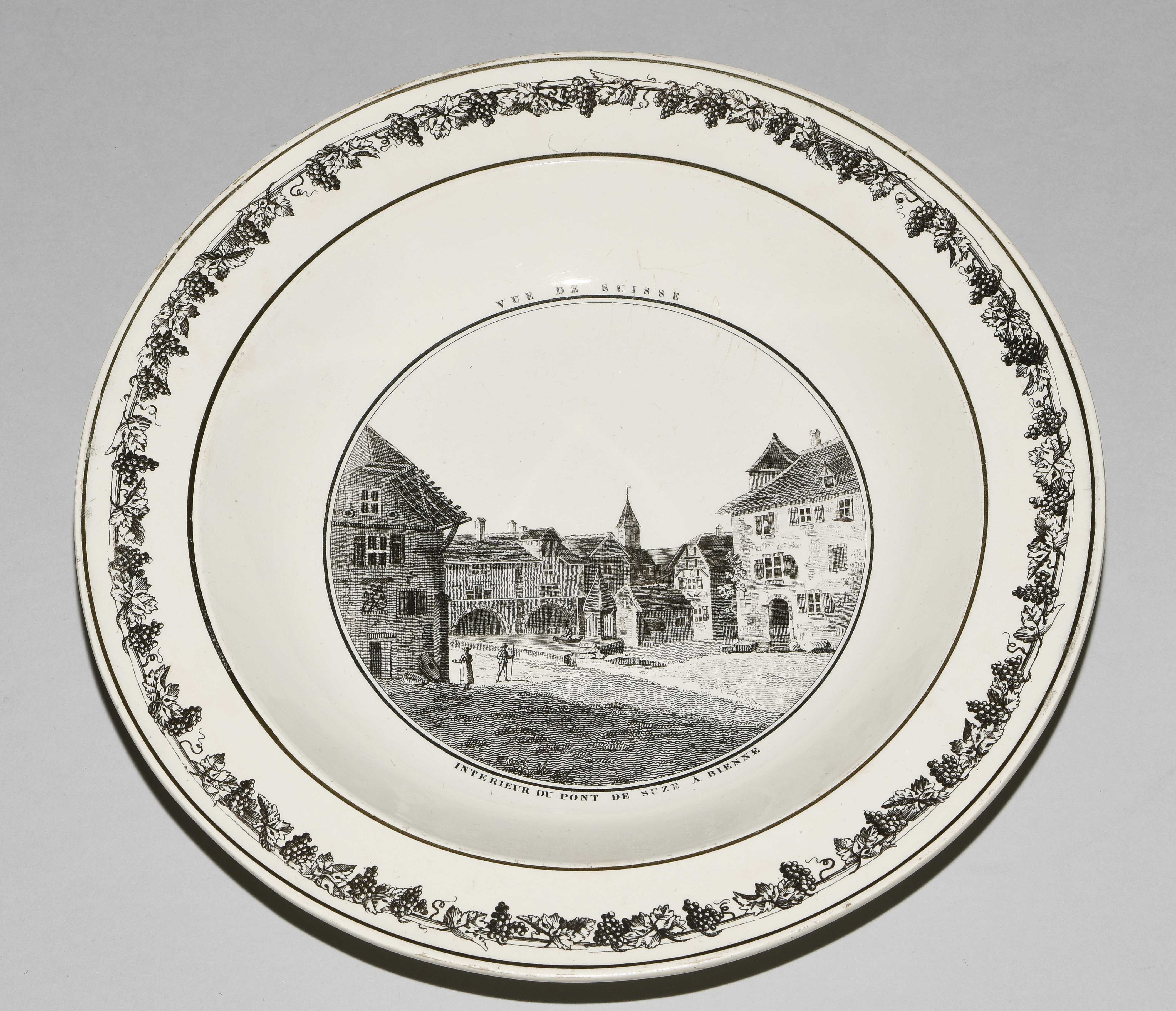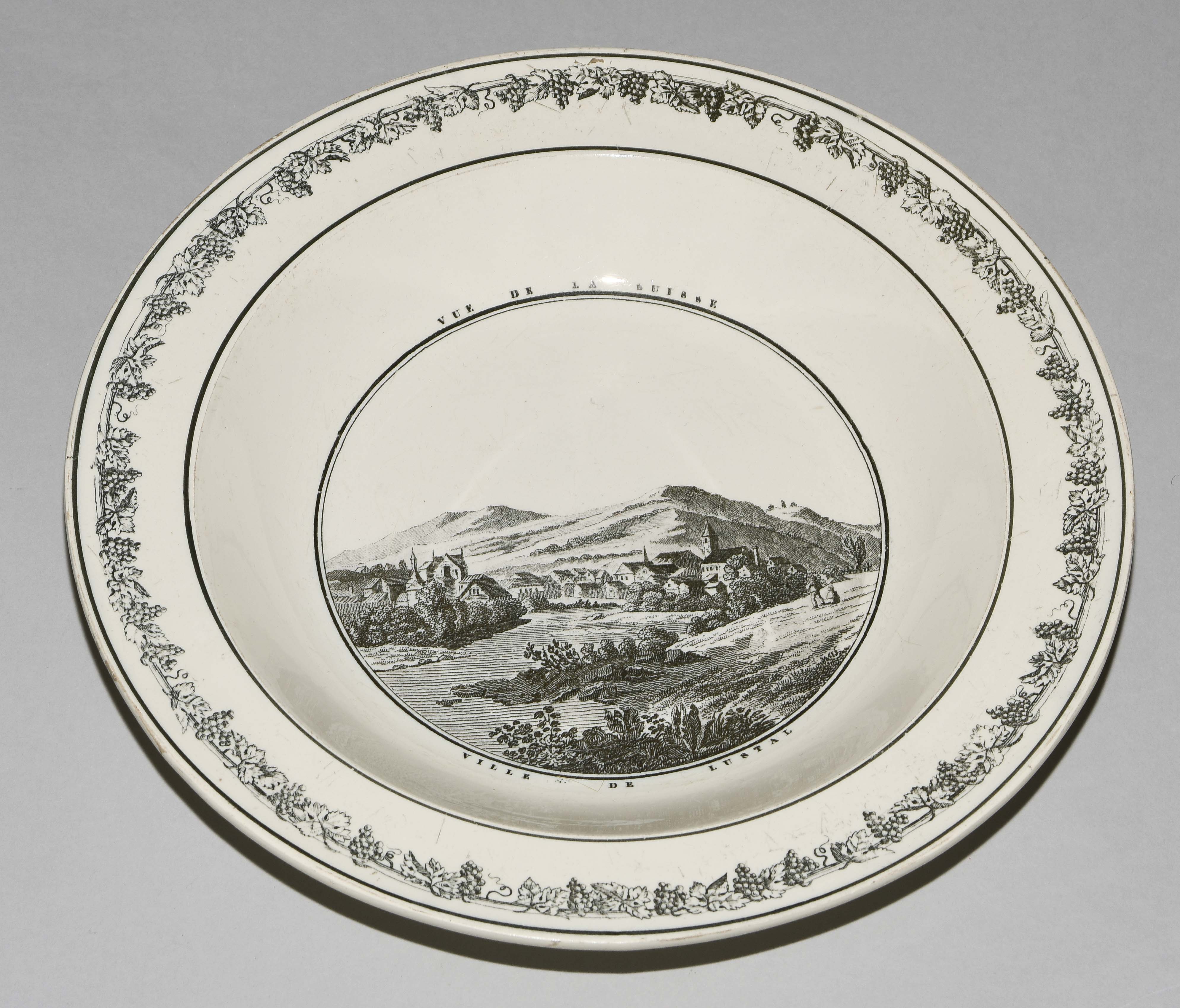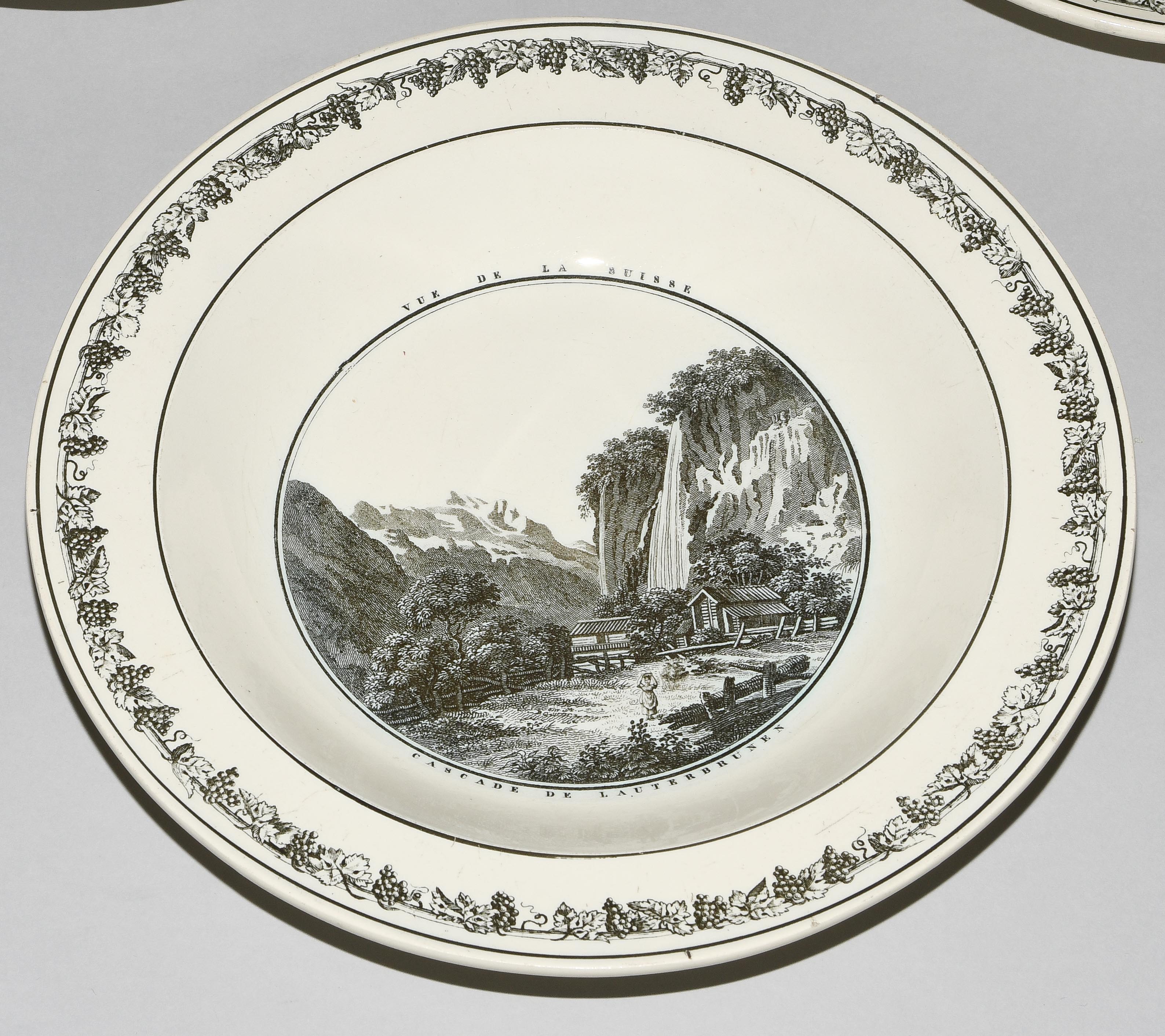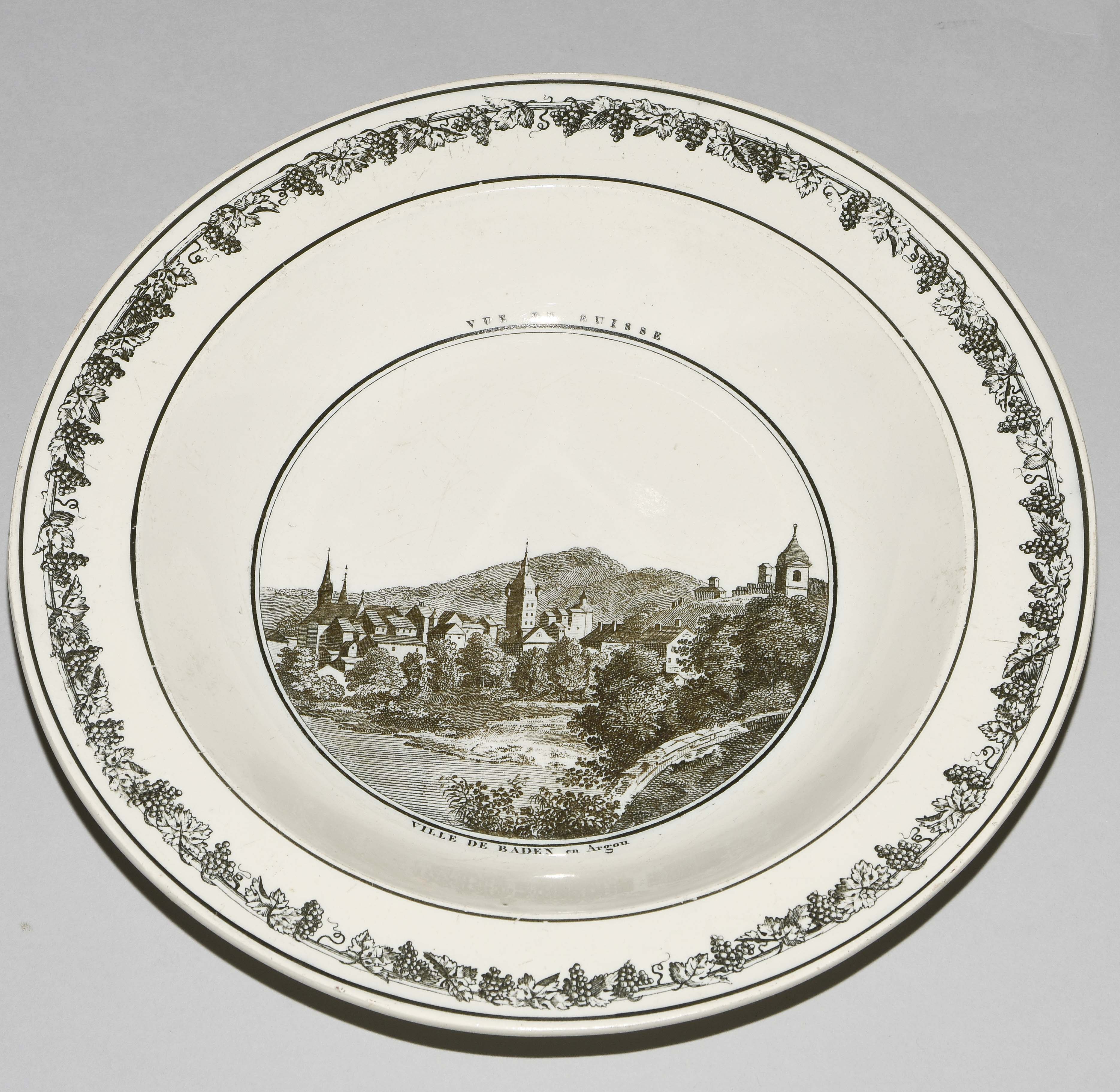 Um 1830. Fayence, beige glasiert. Monochromer, schwarzer Umdruck-Dekor. In Spiegel Landschaftsdarstellungen in beschrifteten Medaillons: Baden, Bellegarde, Biel, Freiburg, Grandson, Hospental, Liestal, Vevey bzw. diverse italienische Landschaften. D 24,5 cm.