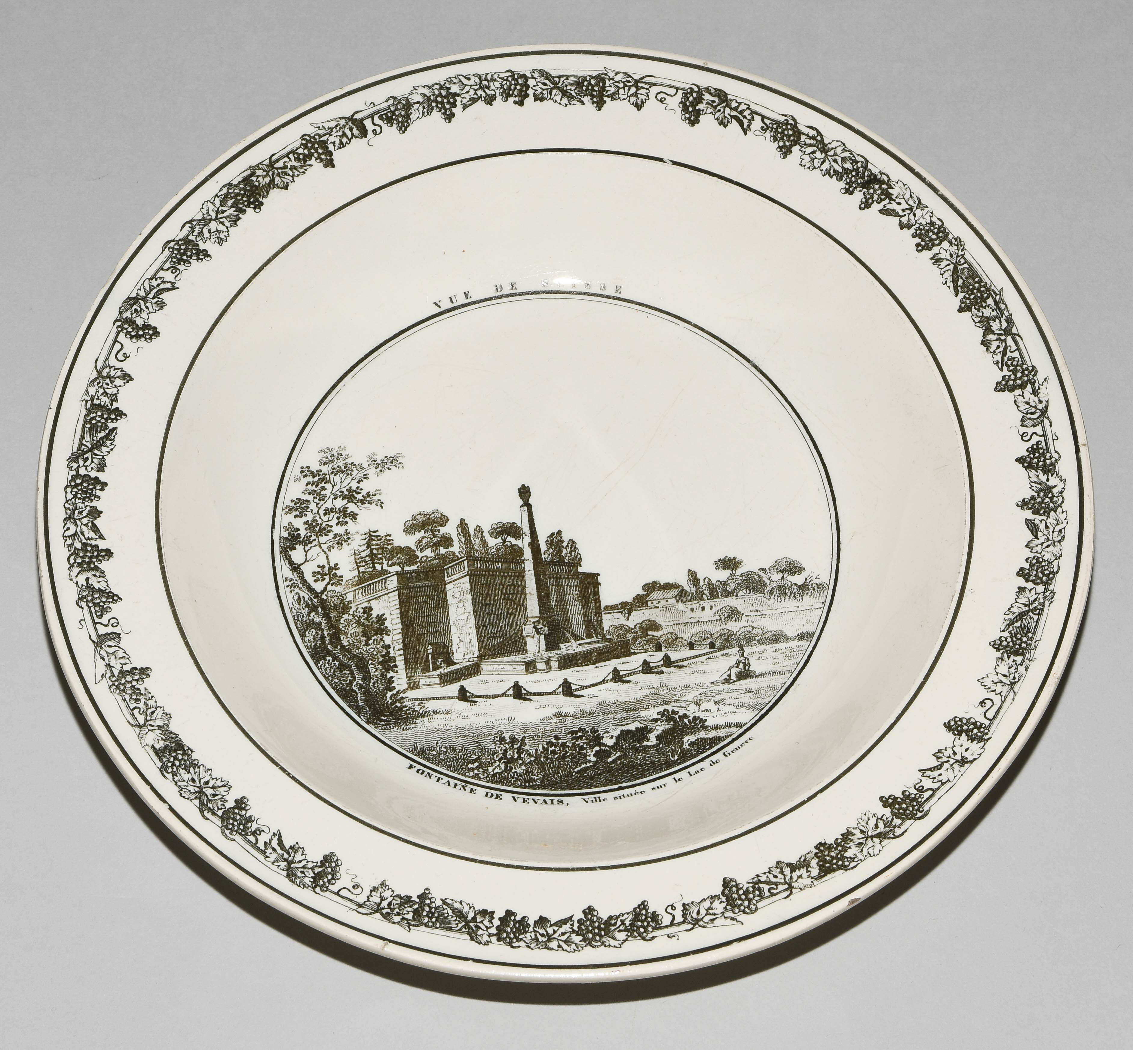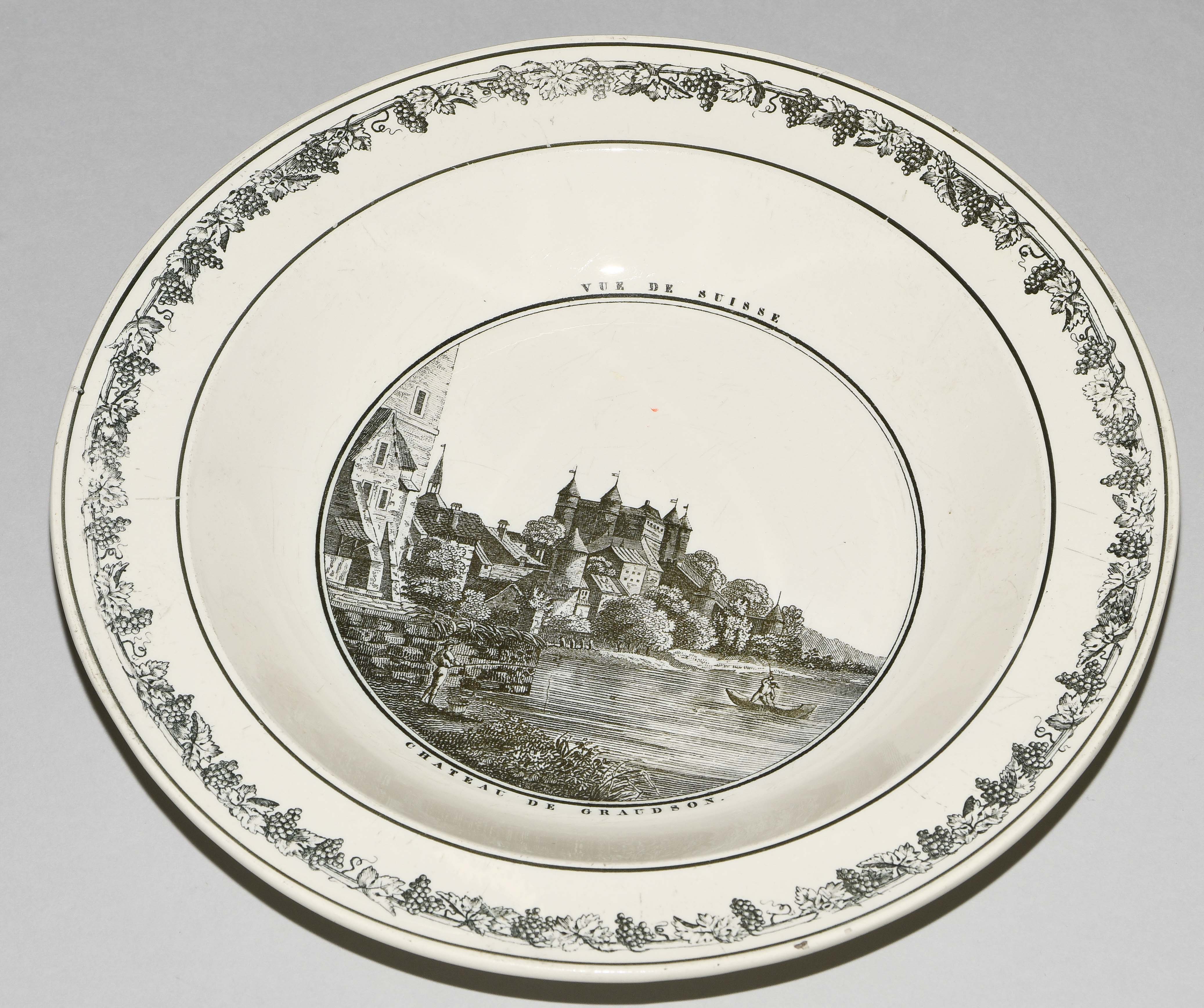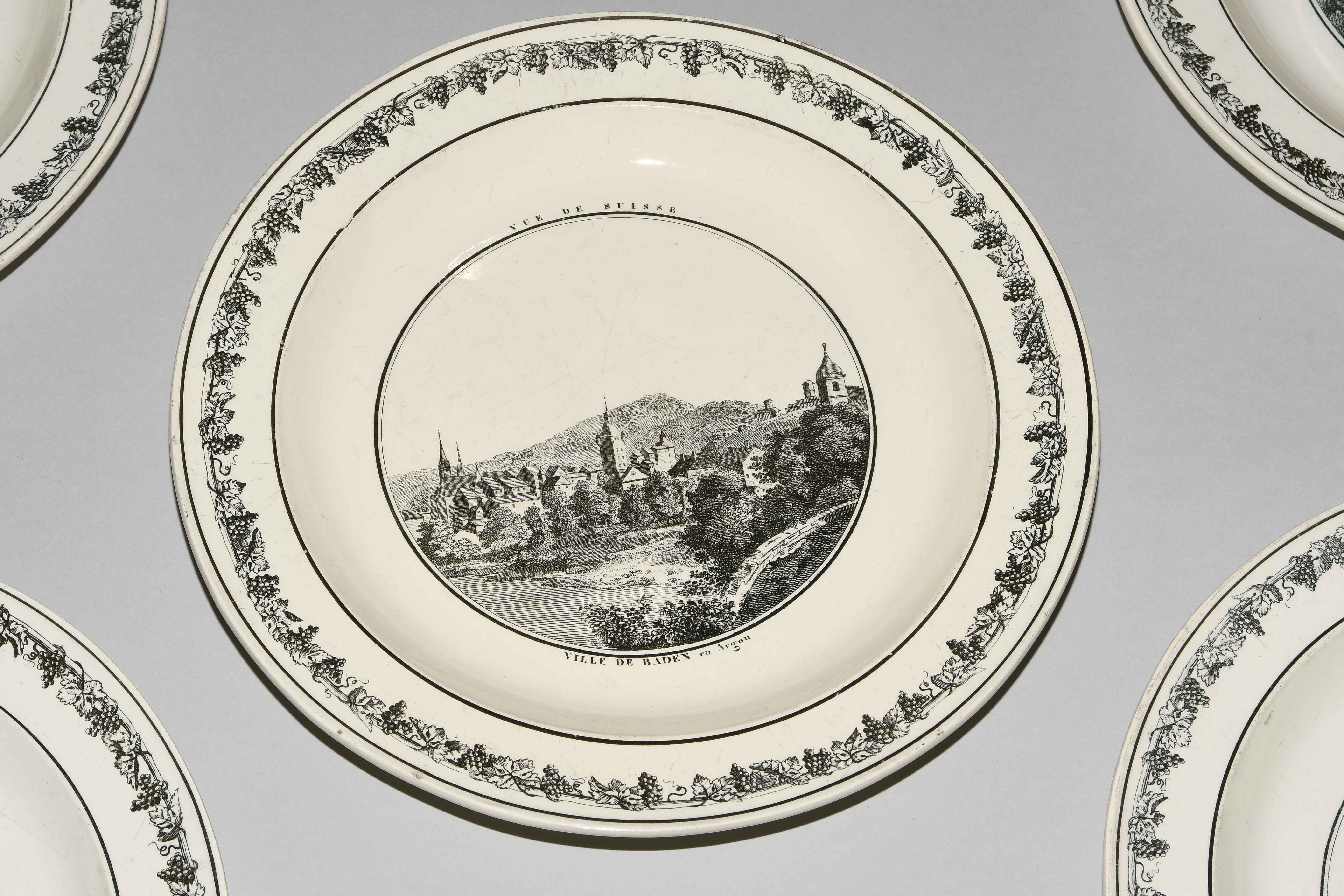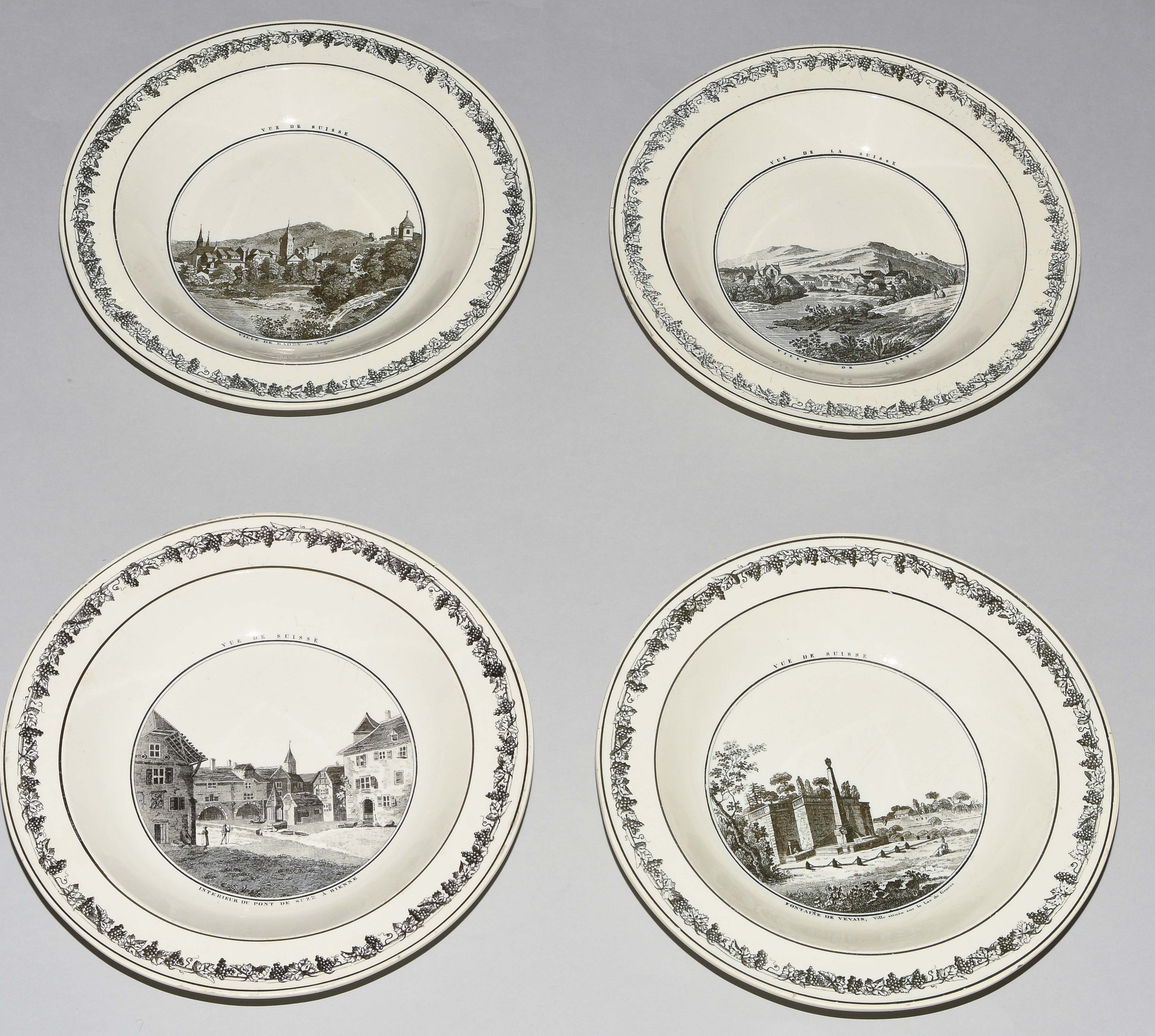Um 1830. Fayence, beige glasiert. Monochromer, schwarzer Umdruck-Dekor. In Spiegel Landschaftsdarstellungen in beschrifteten Medaillons: Baden, Bellegarde, Biel, Freiburg, Grandson, Hospental, Liestal, Vevey bzw. diverse italienische Landschaften. D 24,5 cm.