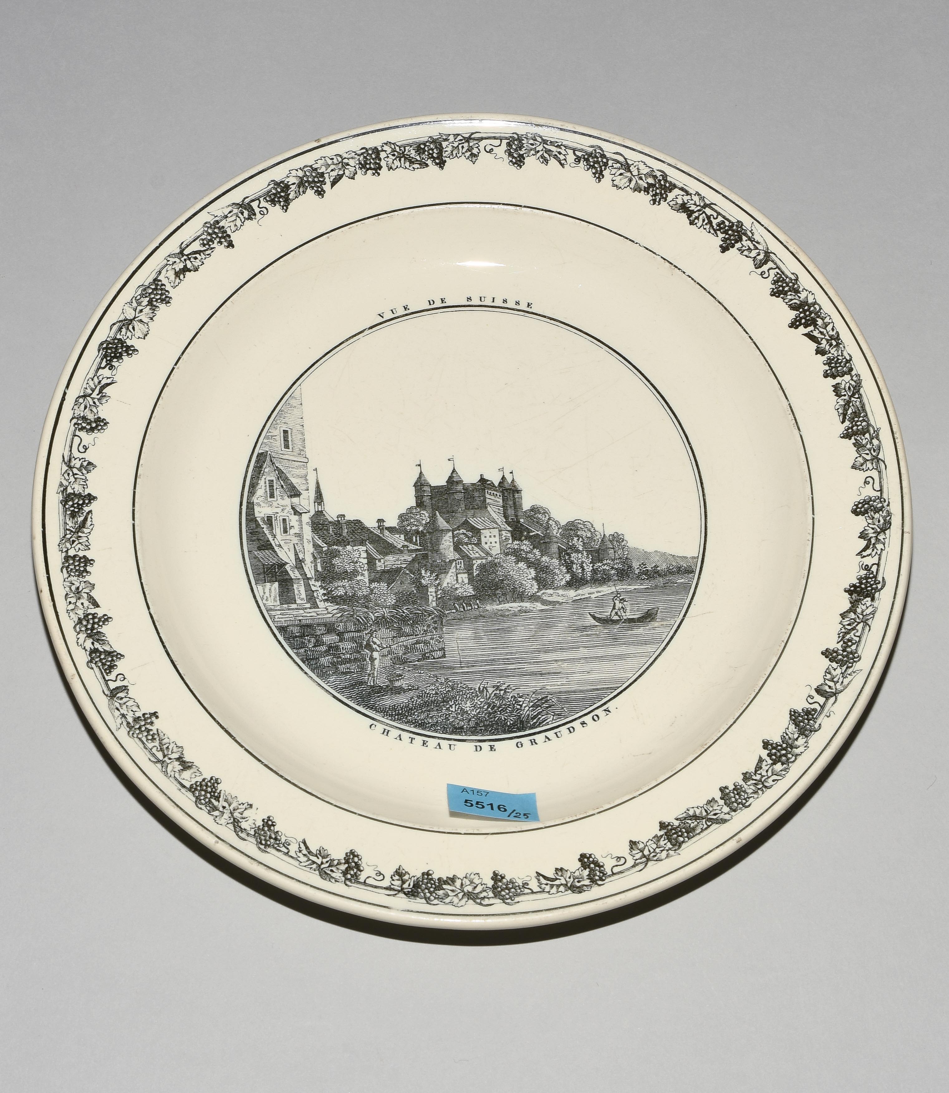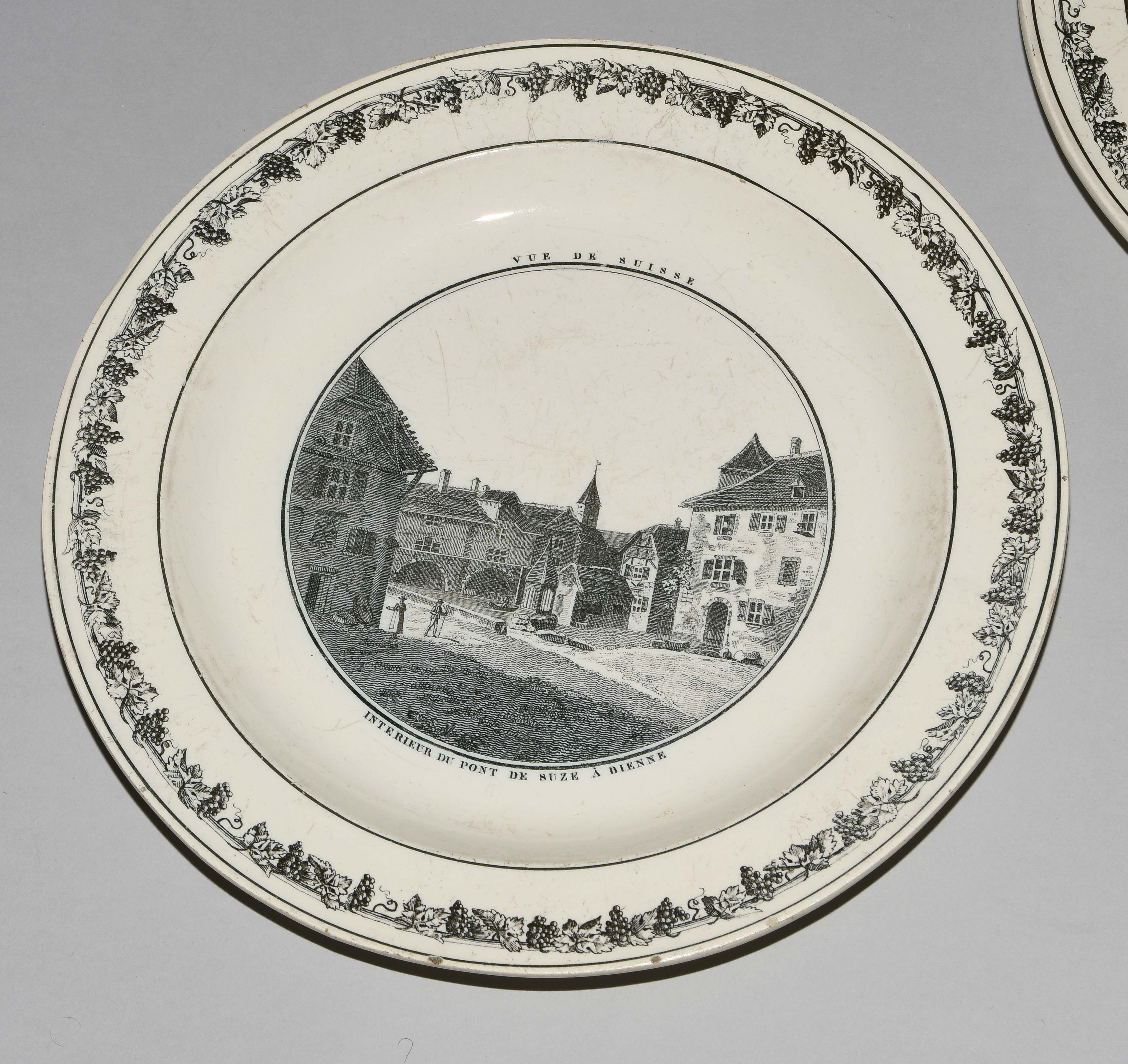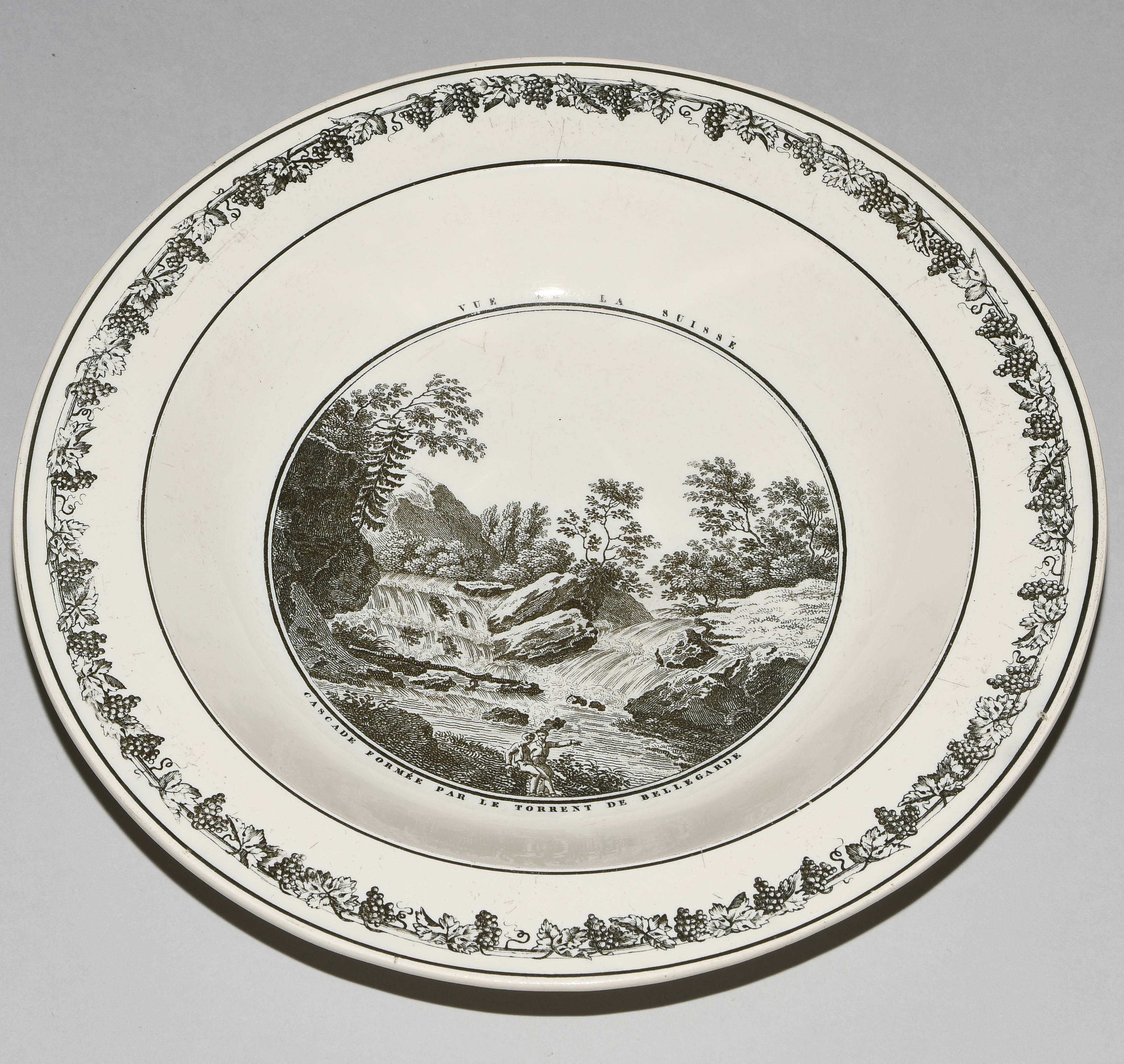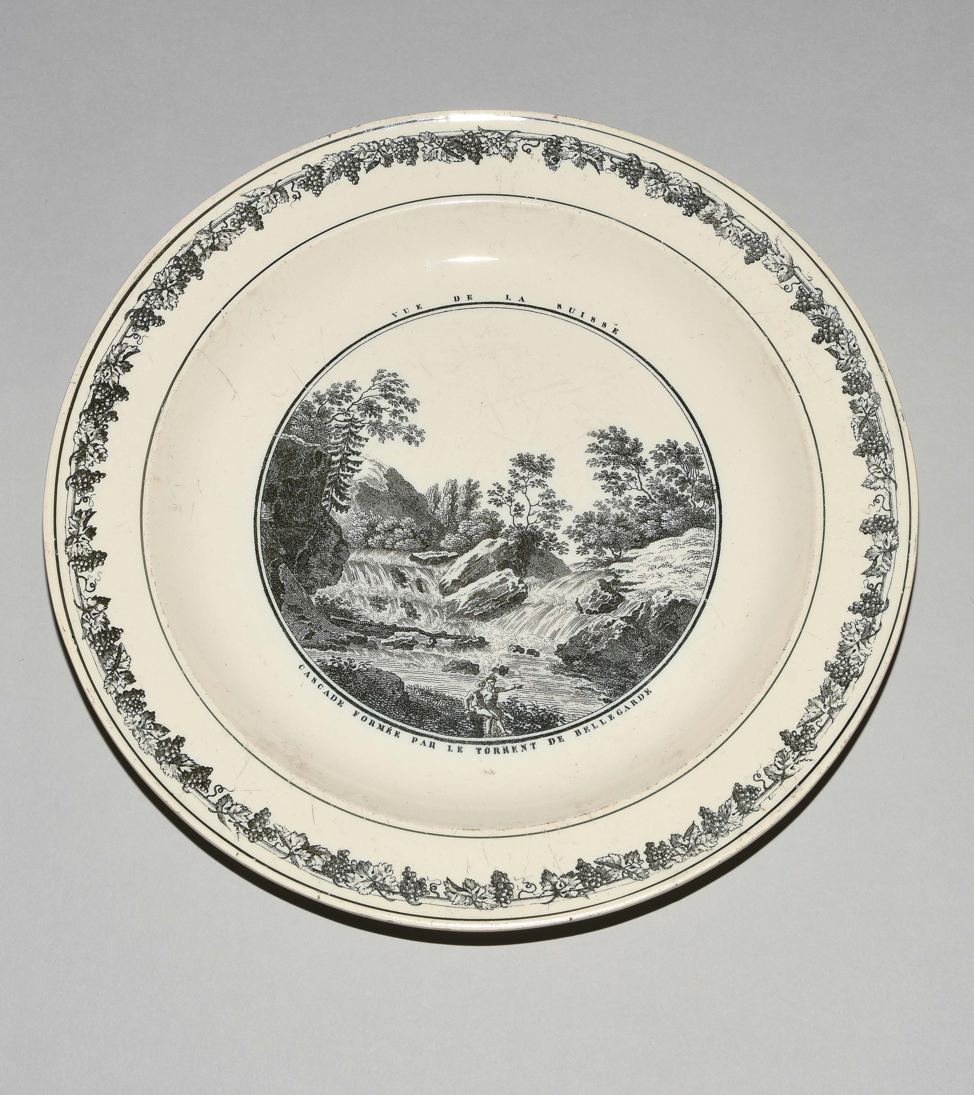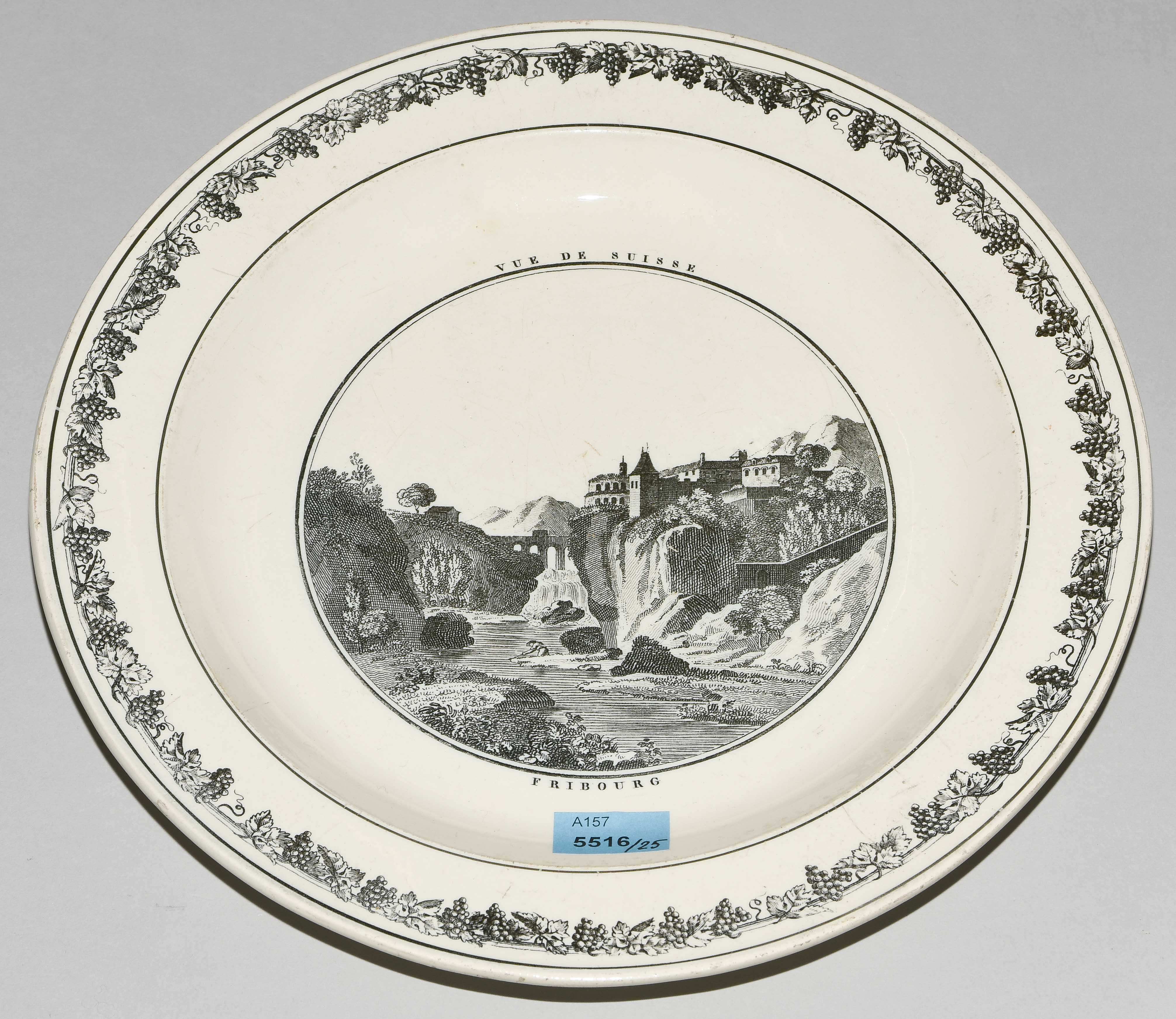 Um 1830. Fayence, beige glasiert. Monochromer, schwarzer Umdruck-Dekor. In Spiegel Landschaftsdarstellungen in beschrifteten Medaillons: Baden, Bellegarde, Biel, Freiburg, Grandson, Hospental, Liestal, Vevey bzw. diverse italienische Landschaften. D 24,5 cm.