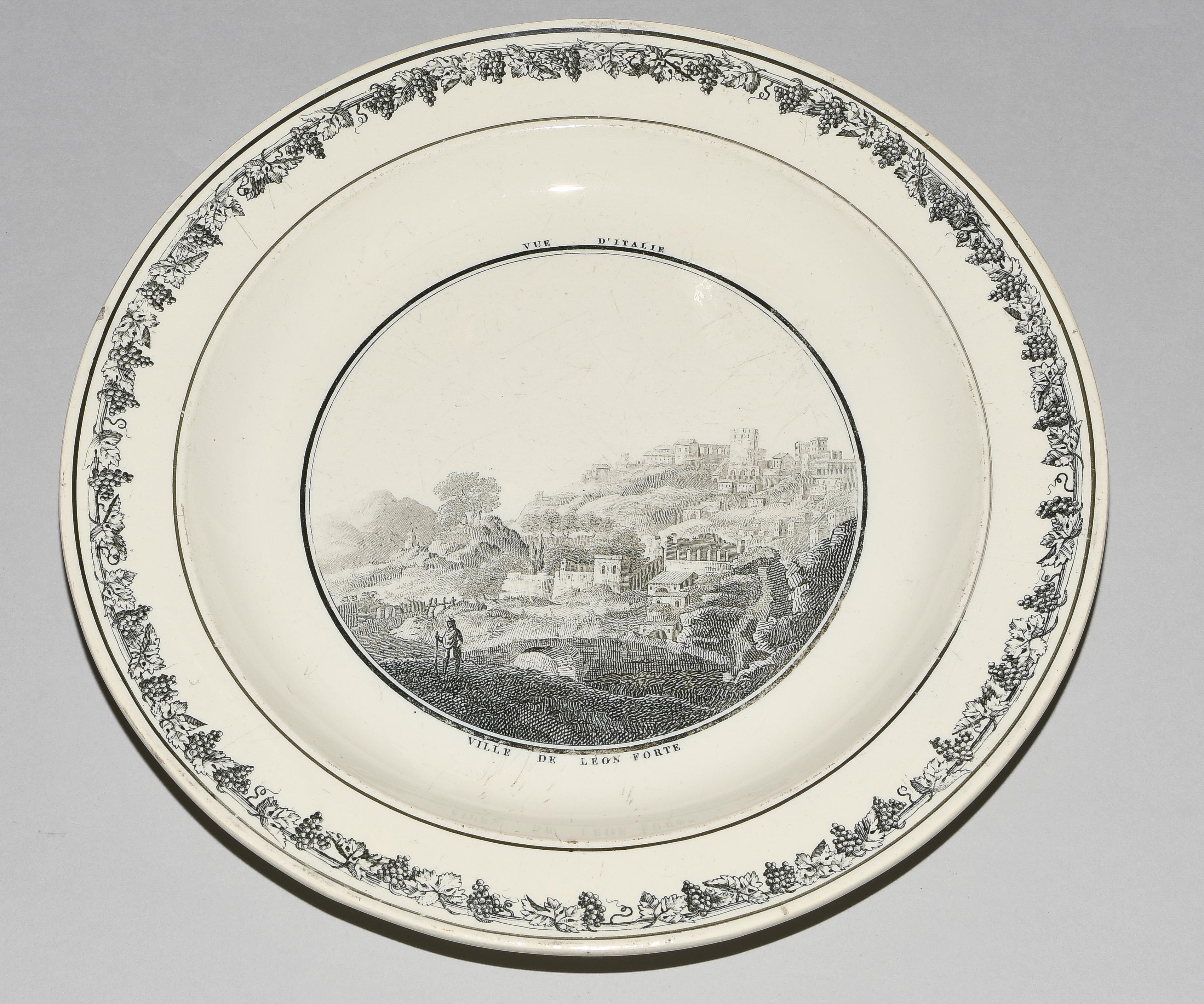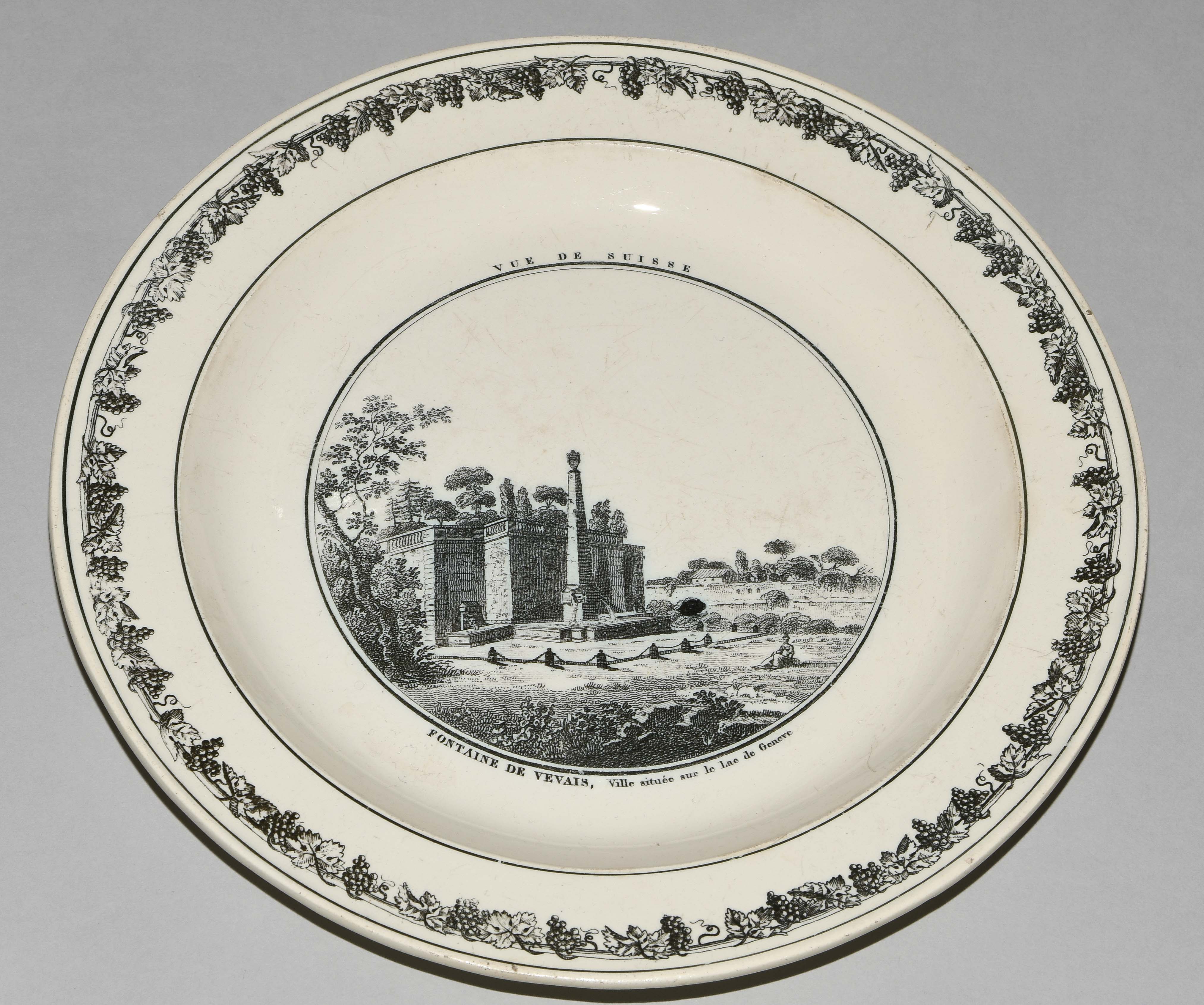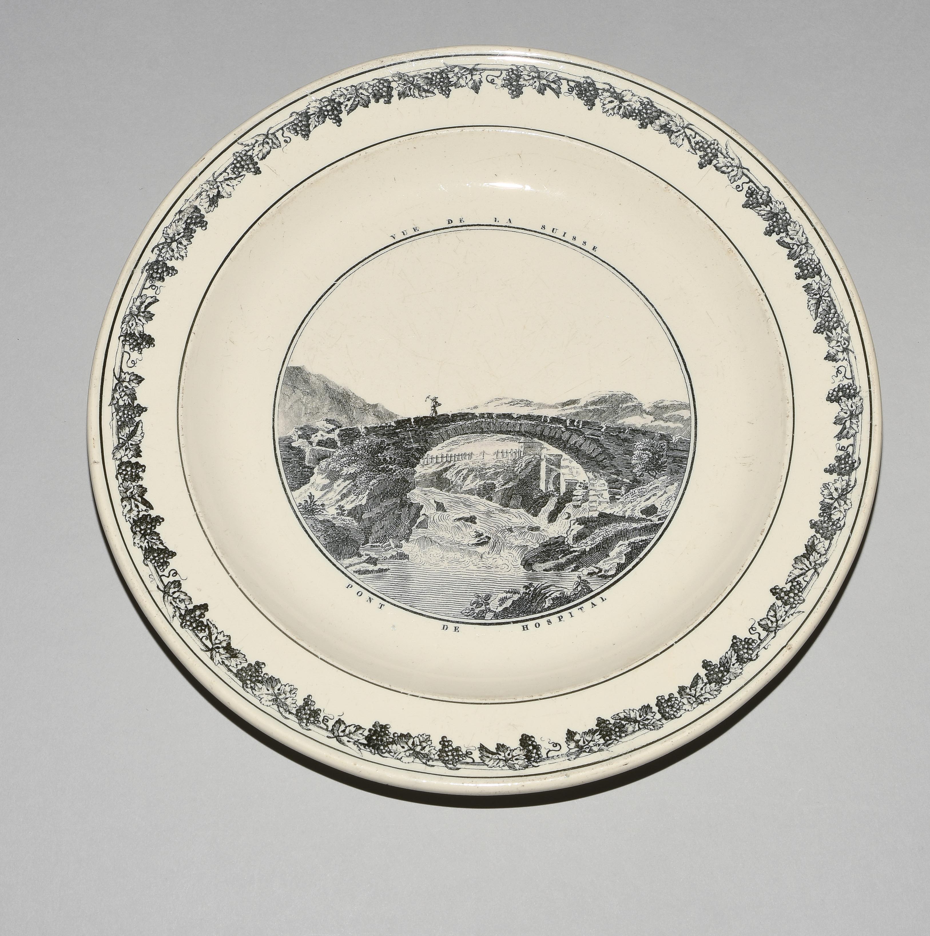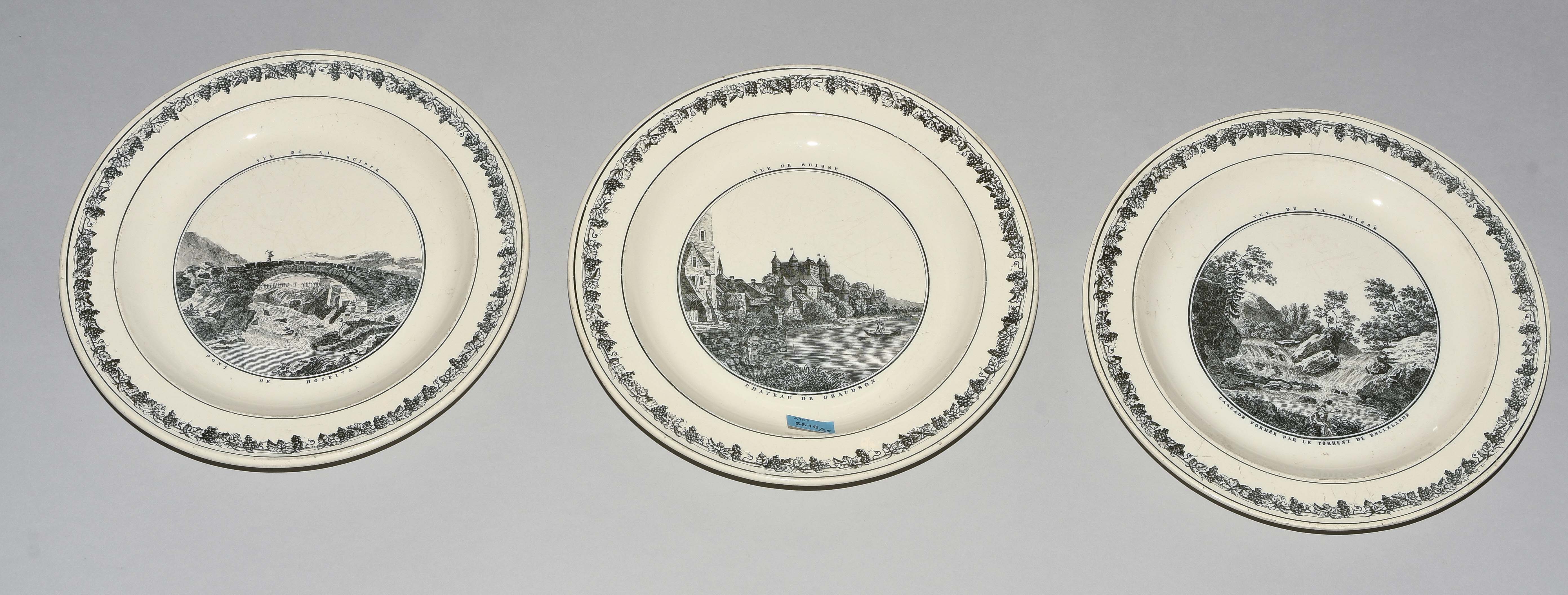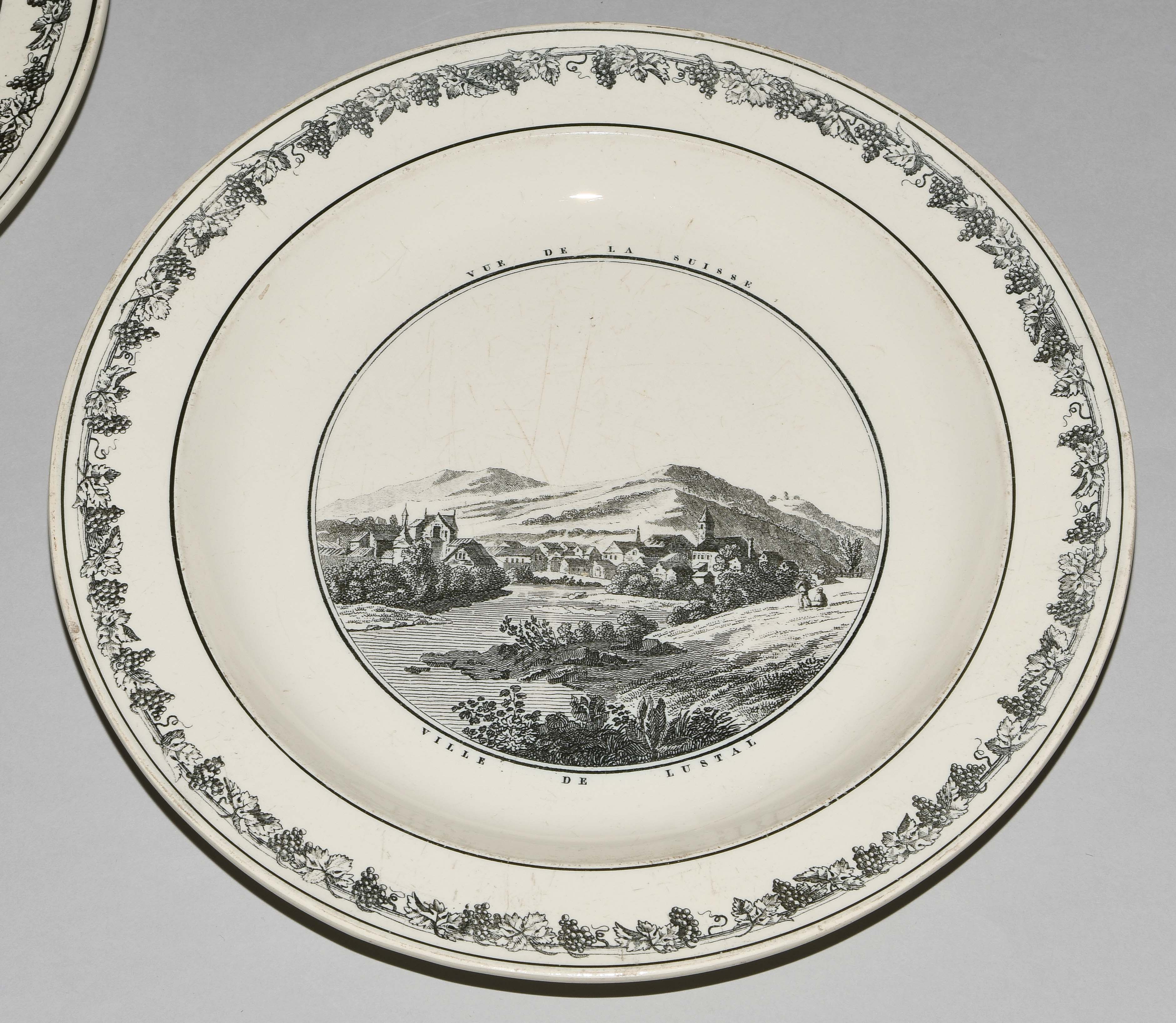 Um 1830. Fayence, beige glasiert. Monochromer, schwarzer Umdruck-Dekor. In Spiegel Landschaftsdarstellungen in beschrifteten Medaillons: Baden, Bellegarde, Biel, Freiburg, Grandson, Hospental, Liestal, Vevey bzw. diverse italienische Landschaften. D 24,5 cm.