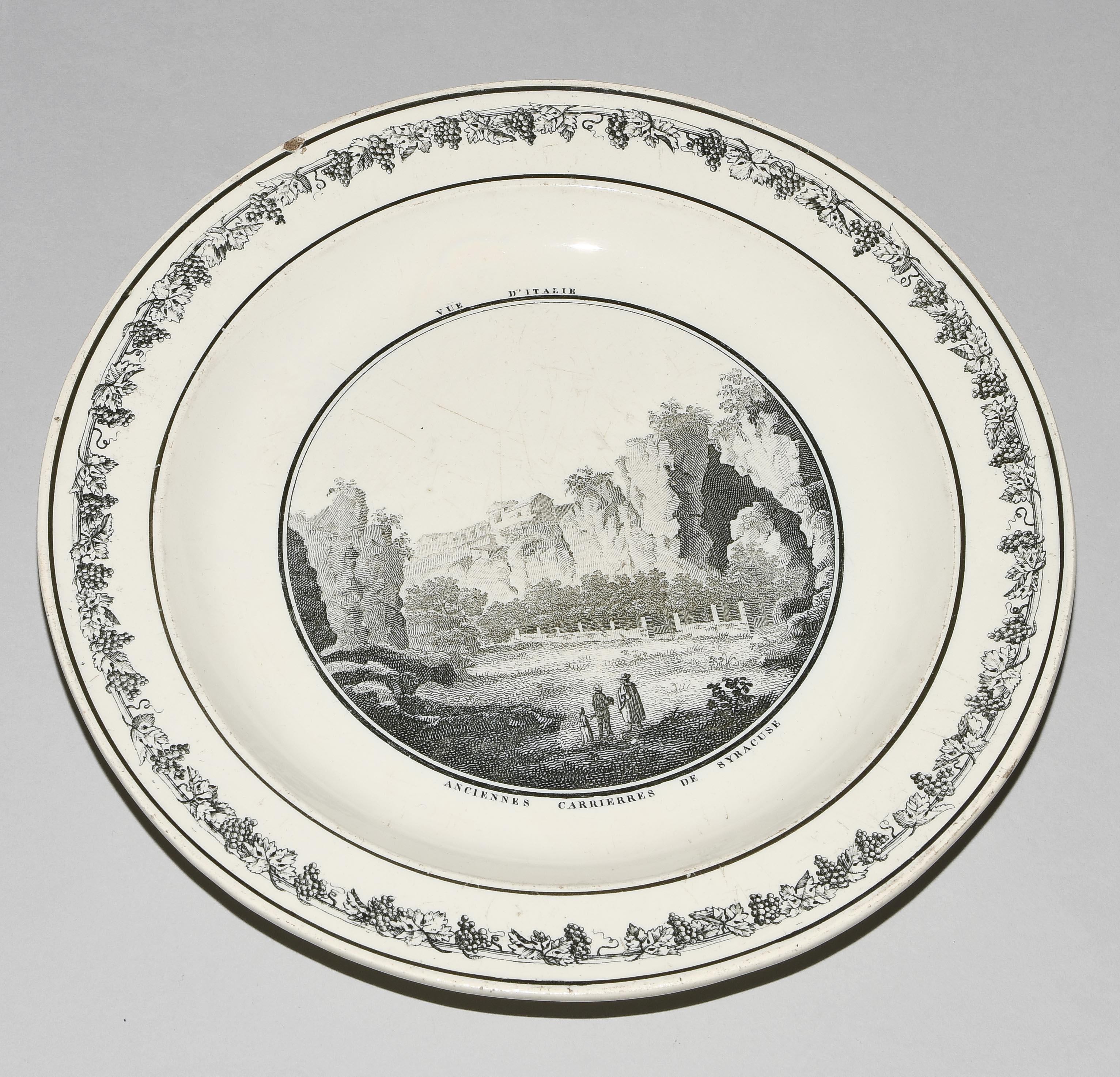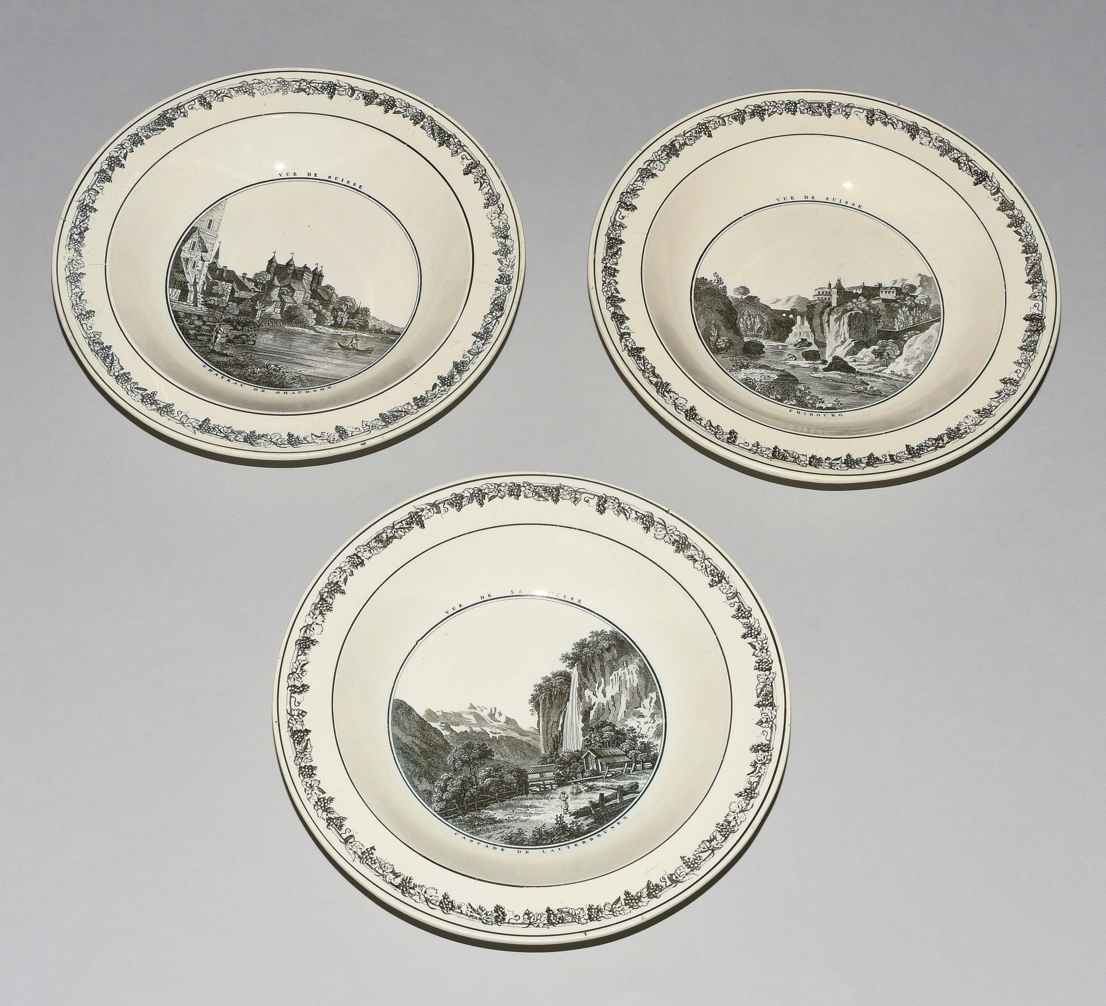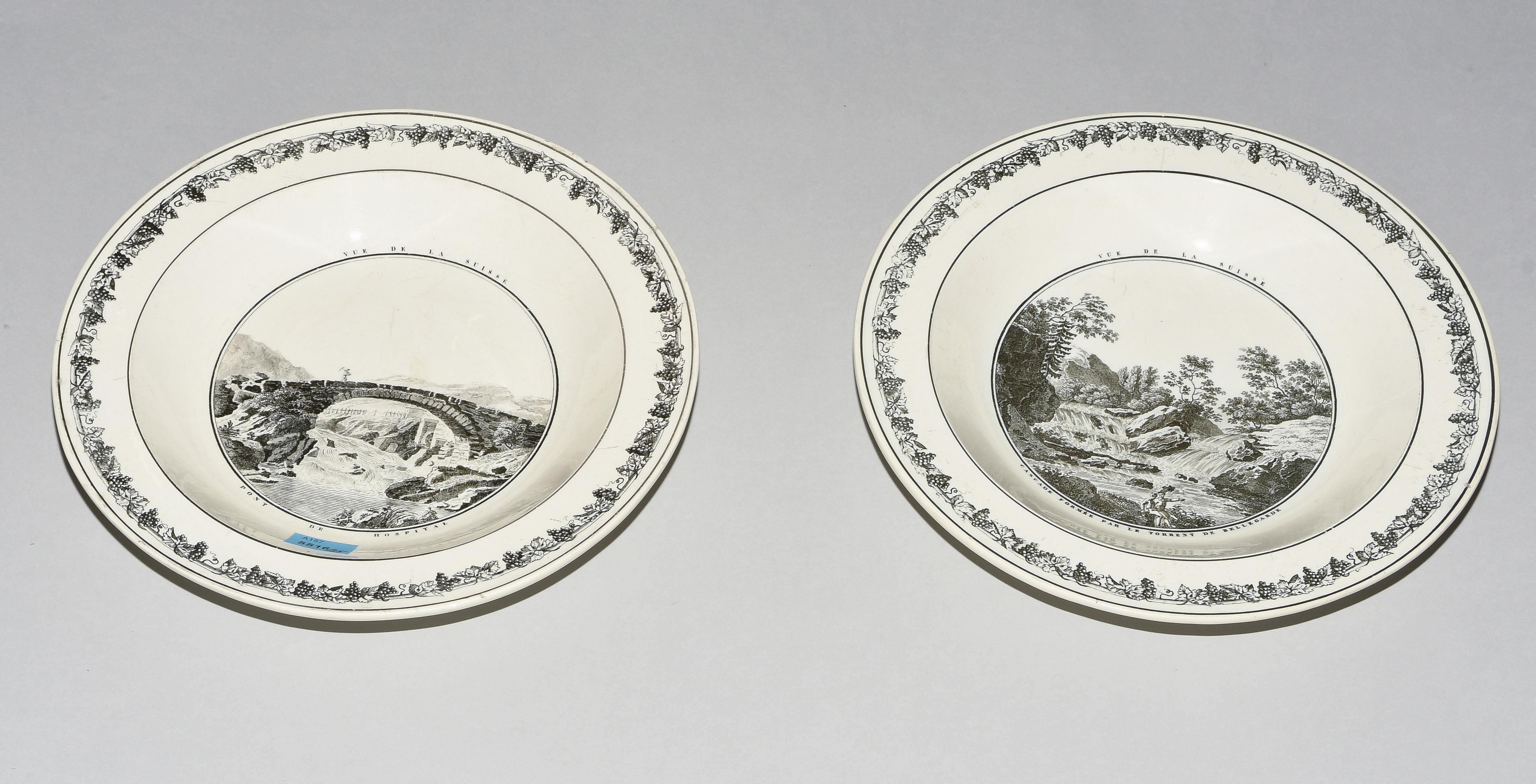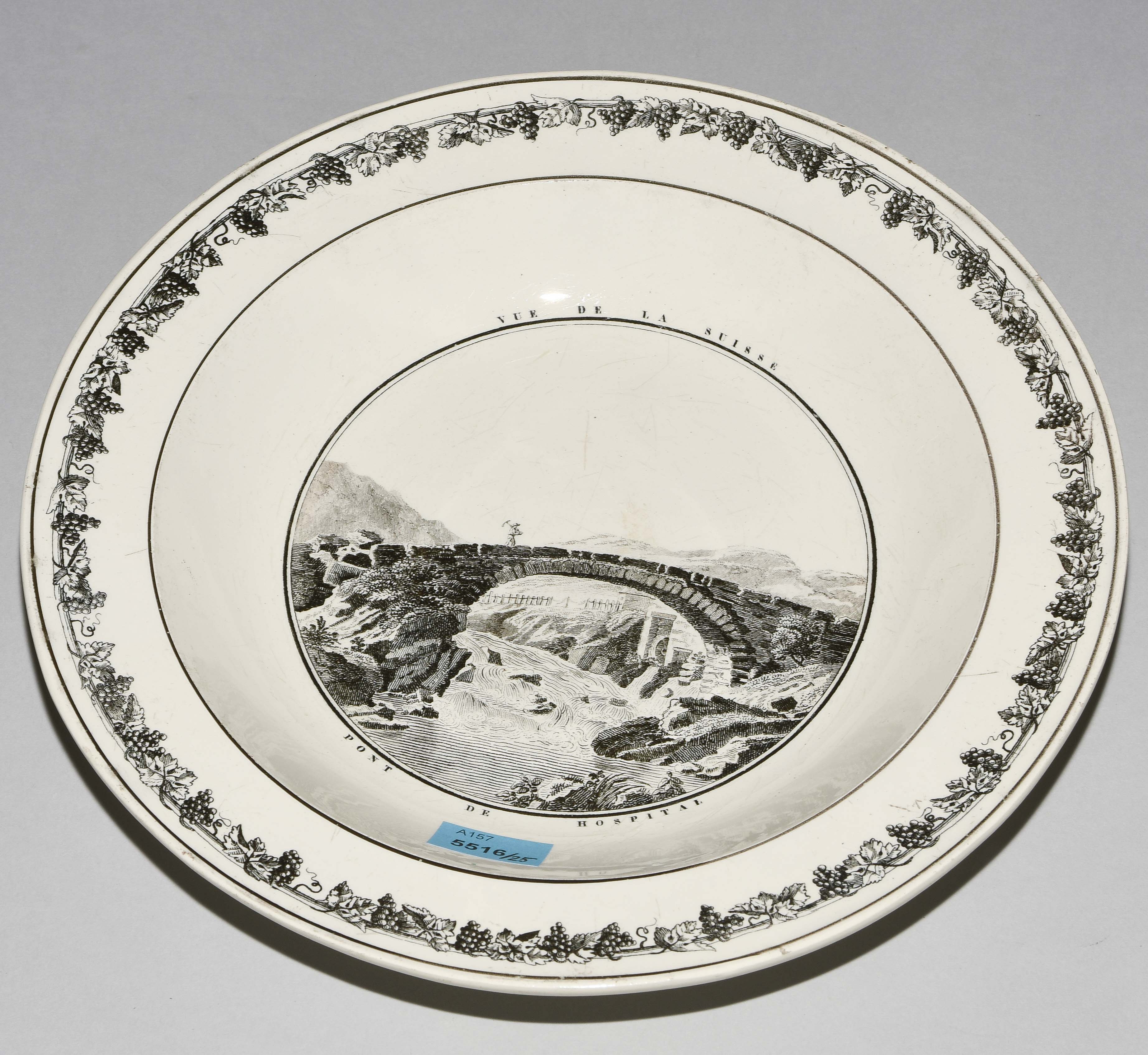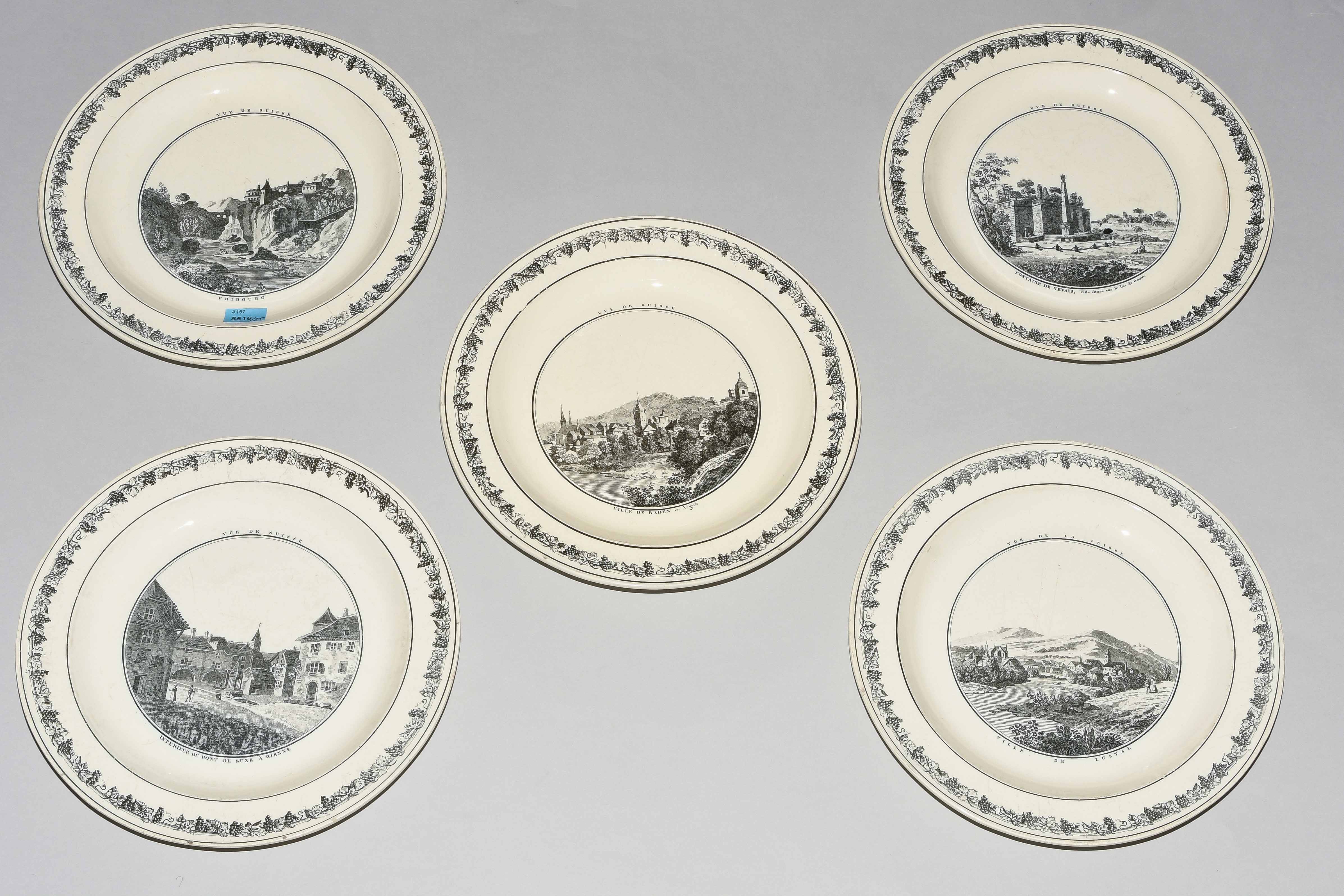 Um 1830. Fayence, beige glasiert. Monochromer, schwarzer Umdruck-Dekor. In Spiegel Landschaftsdarstellungen in beschrifteten Medaillons: Baden, Bellegarde, Biel, Freiburg, Grandson, Hospental, Liestal, Vevey bzw. diverse italienische Landschaften. D 24,5 cm.