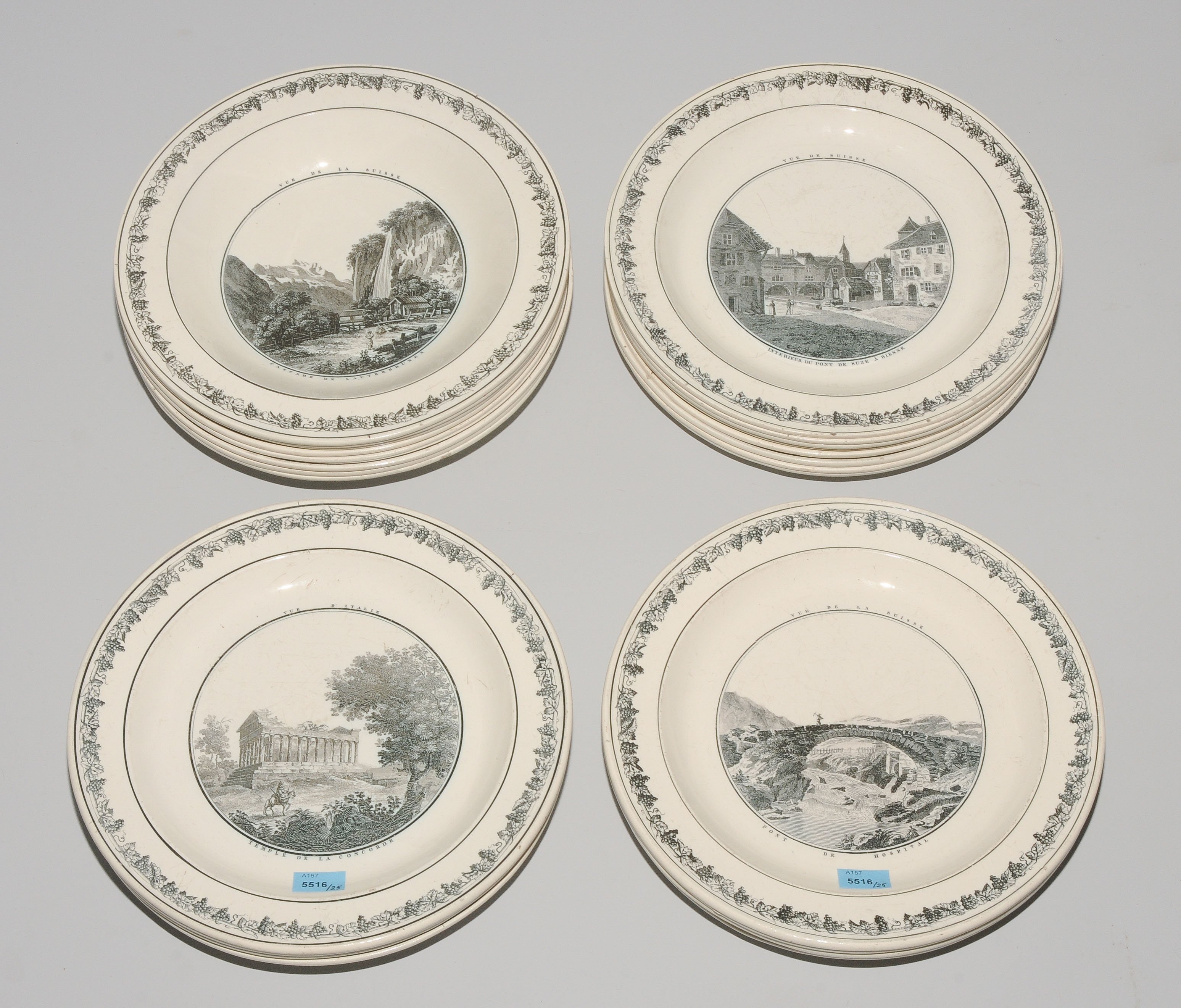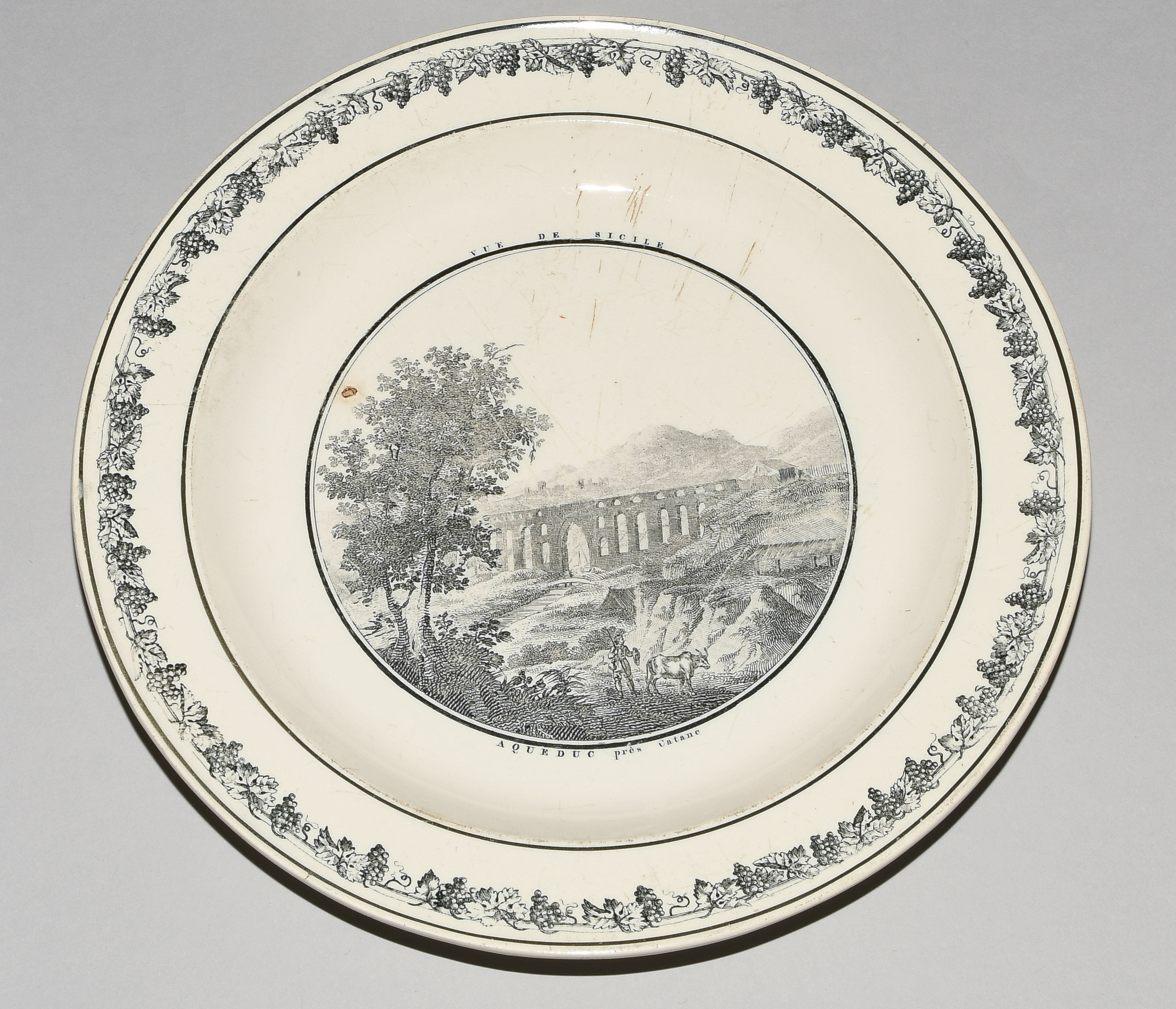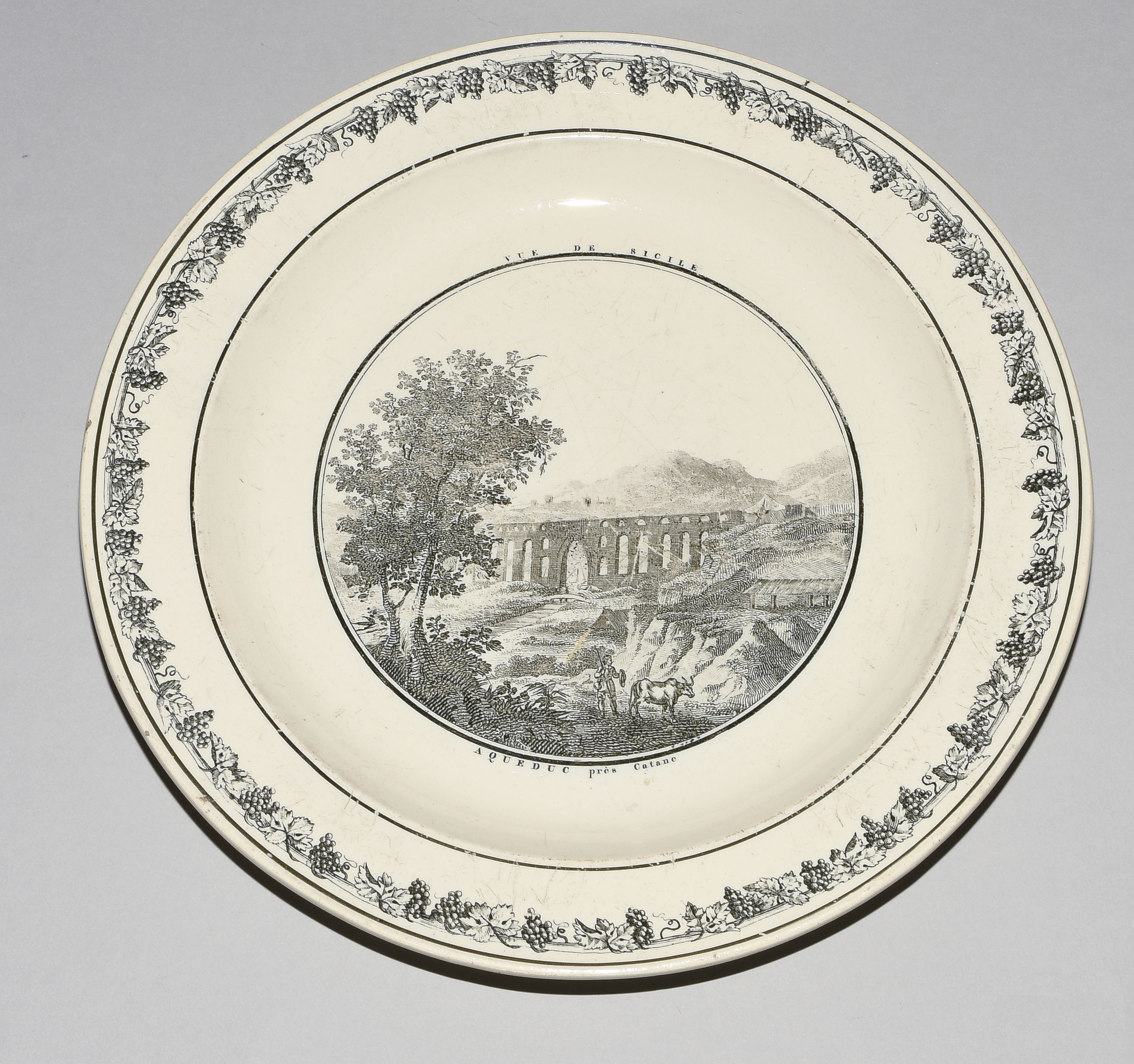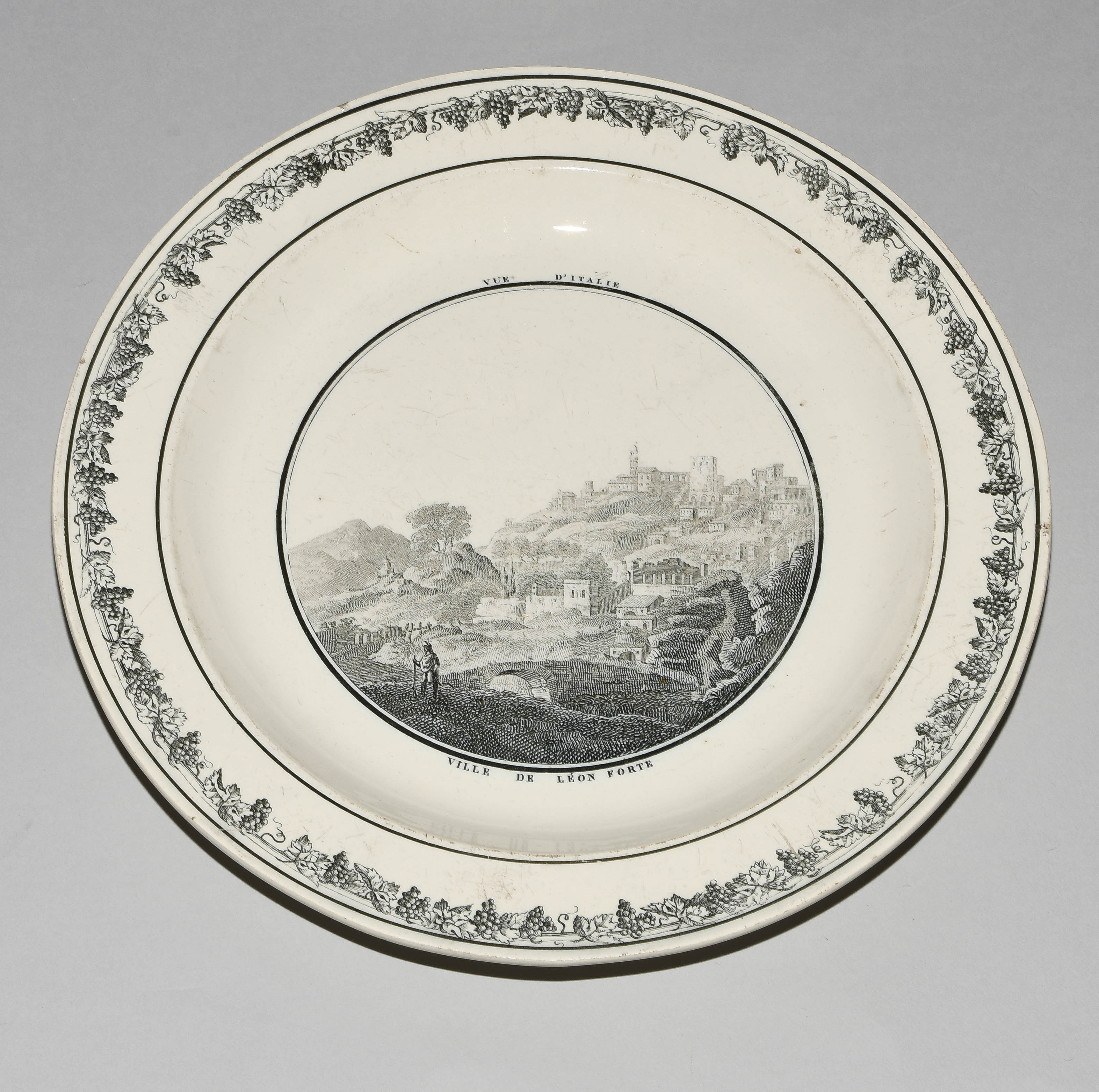 Um 1830. Fayence, beige glasiert. Monochromer, schwarzer Umdruck-Dekor. In Spiegel Landschaftsdarstellungen in beschrifteten Medaillons: Baden, Bellegarde, Biel, Freiburg, Grandson, Hospental, Liestal, Vevey bzw. diverse italienische Landschaften. D 24,5 cm.