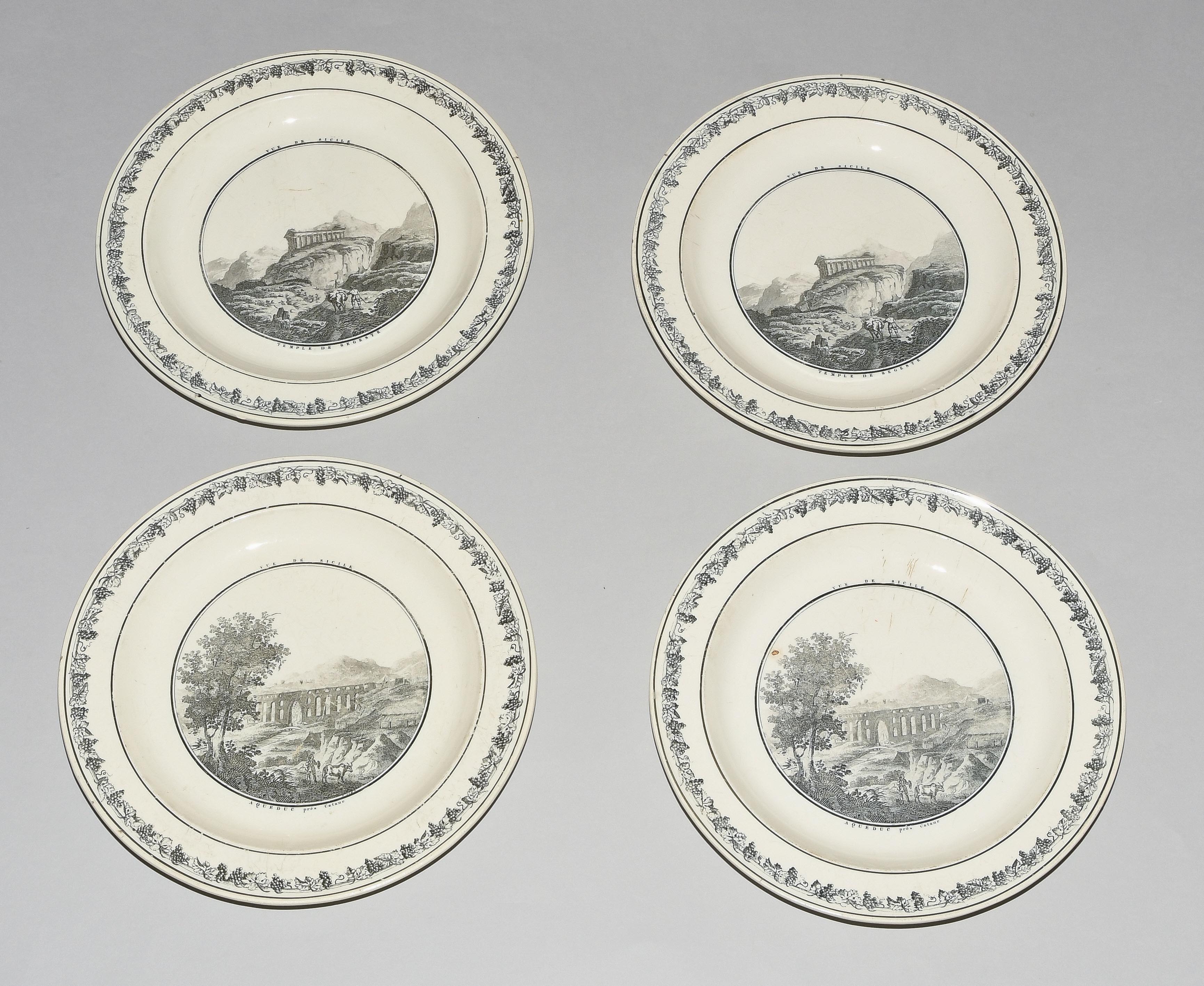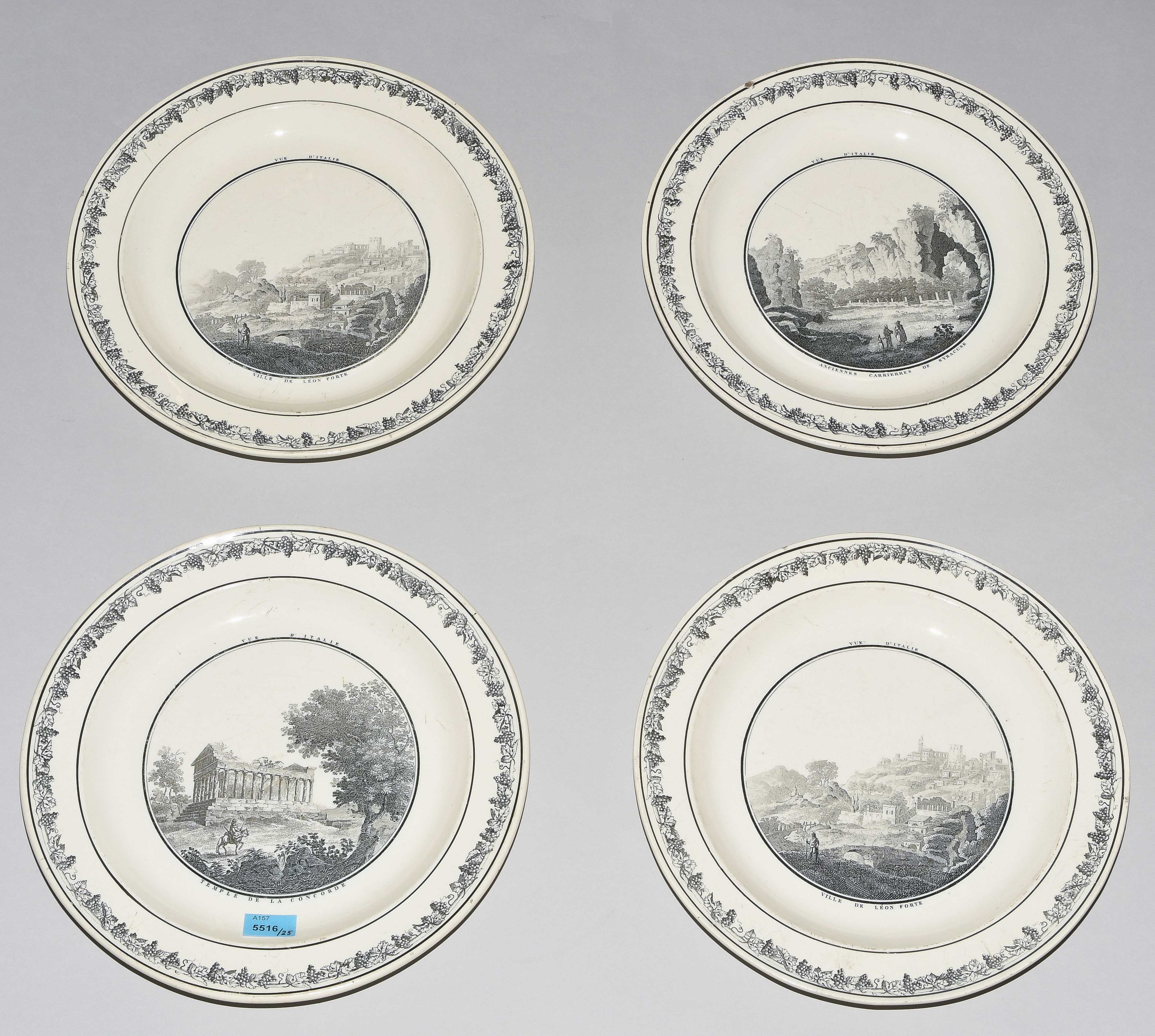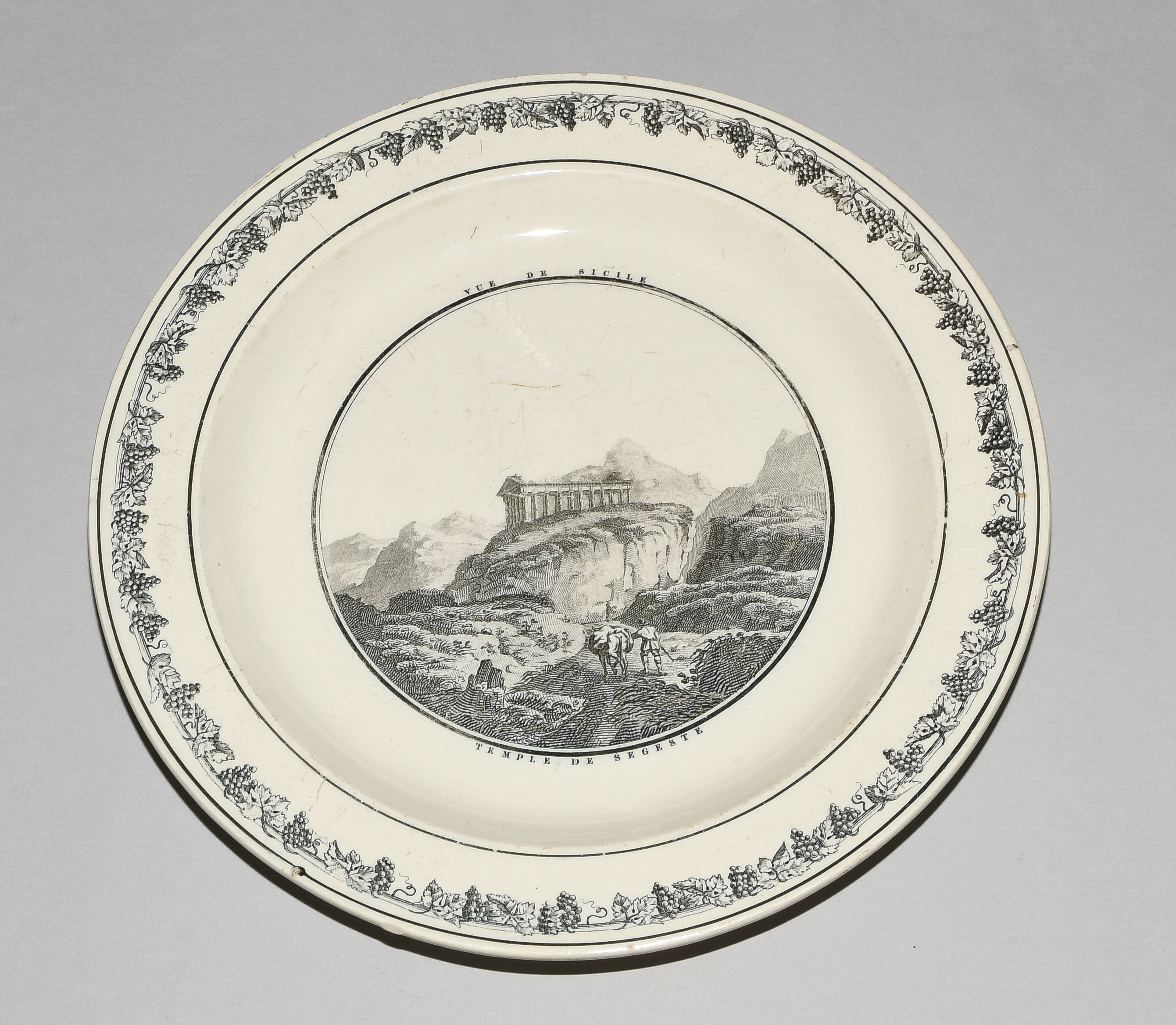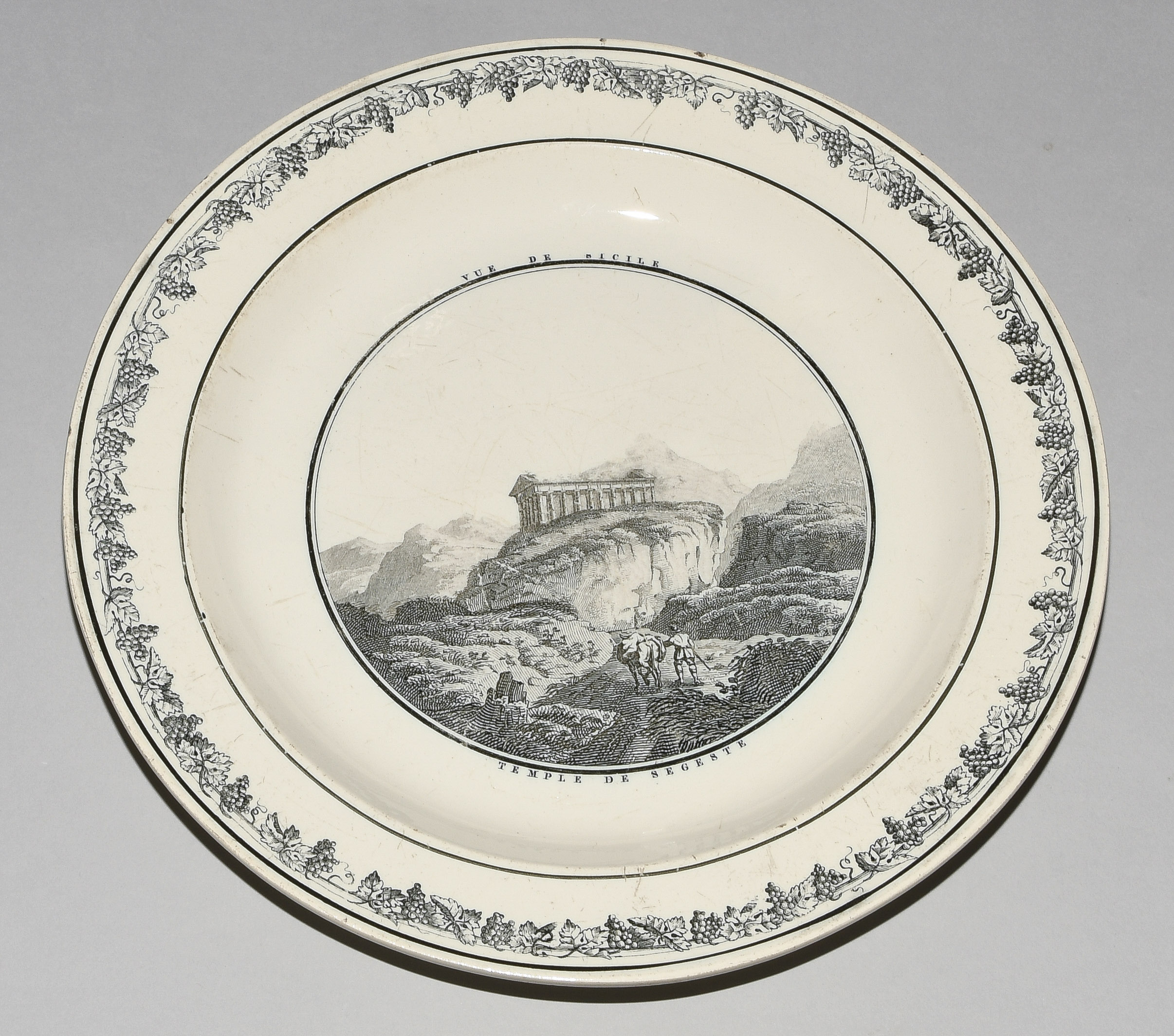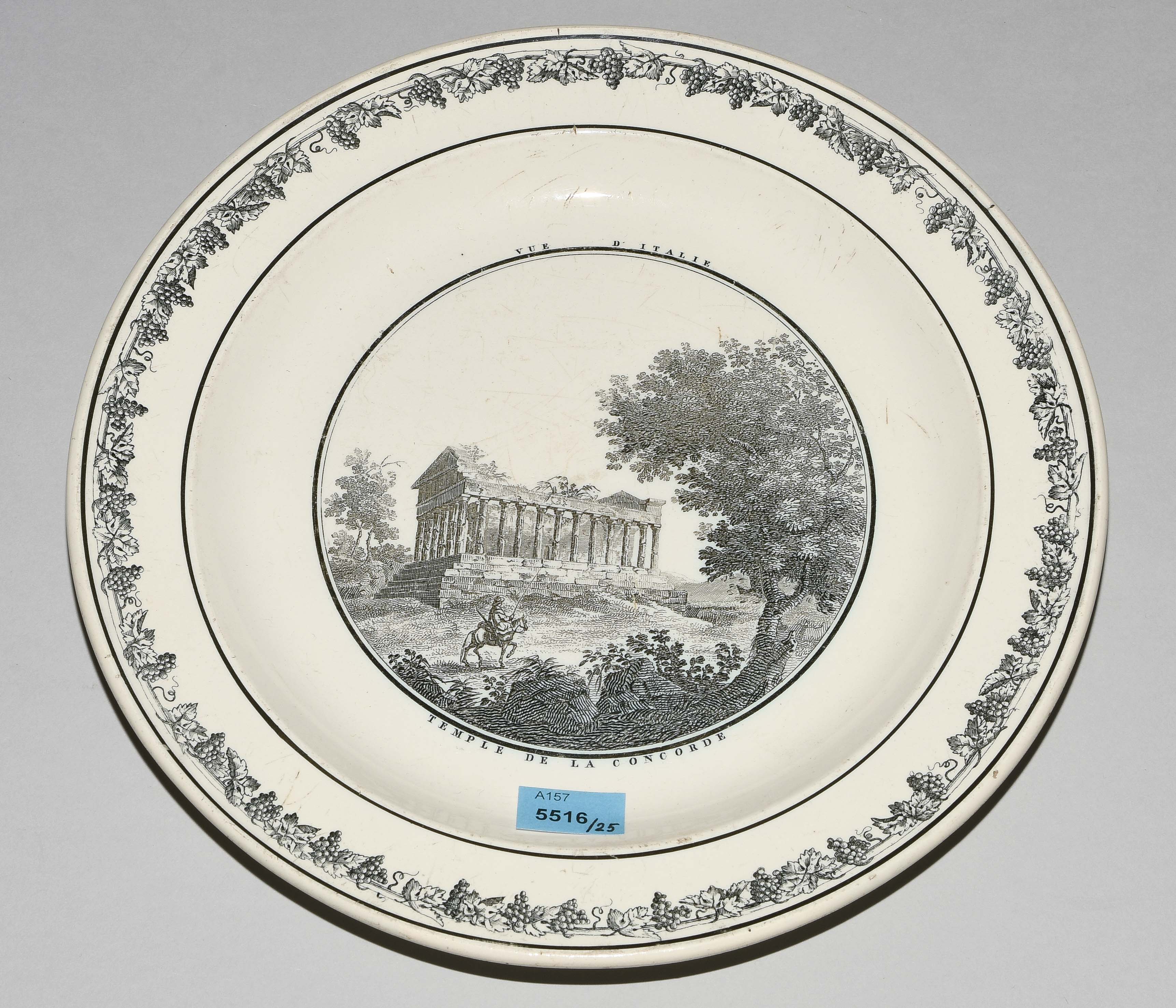 Um 1830. Fayence, beige glasiert. Monochromer, schwarzer Umdruck-Dekor. In Spiegel Landschaftsdarstellungen in beschrifteten Medaillons: Baden, Bellegarde, Biel, Freiburg, Grandson, Hospental, Liestal, Vevey bzw. diverse italienische Landschaften. D 24,5 cm.
