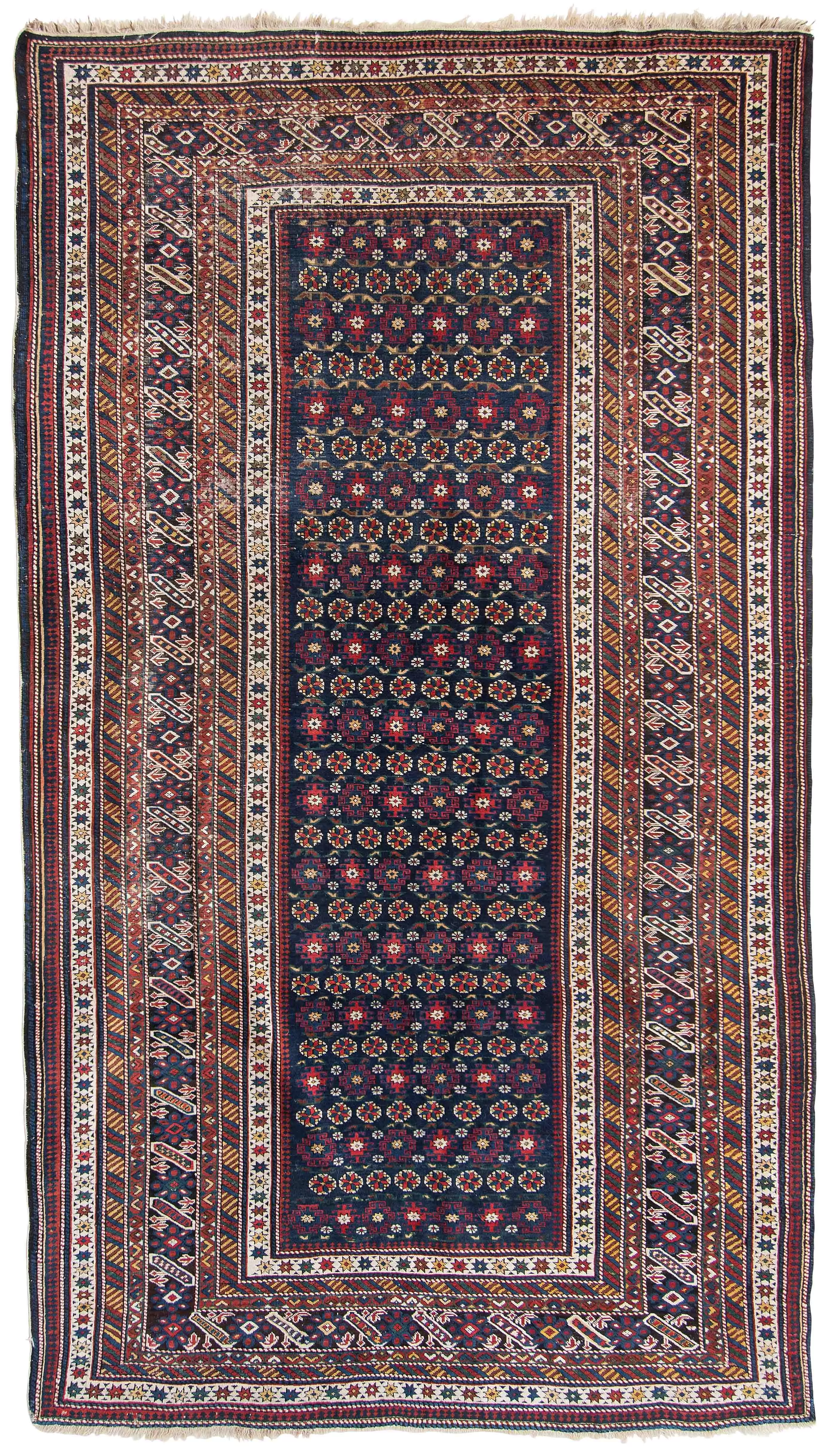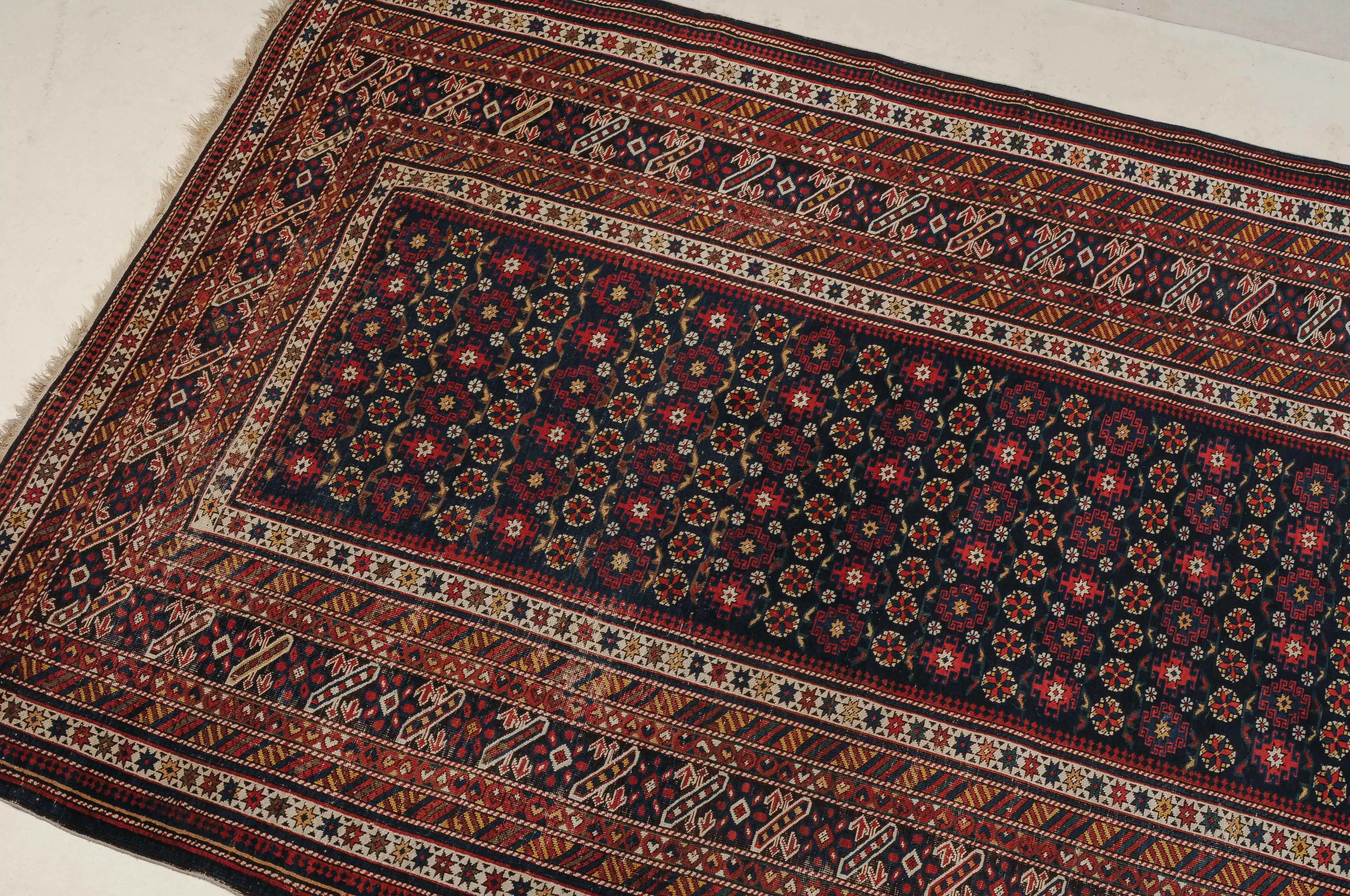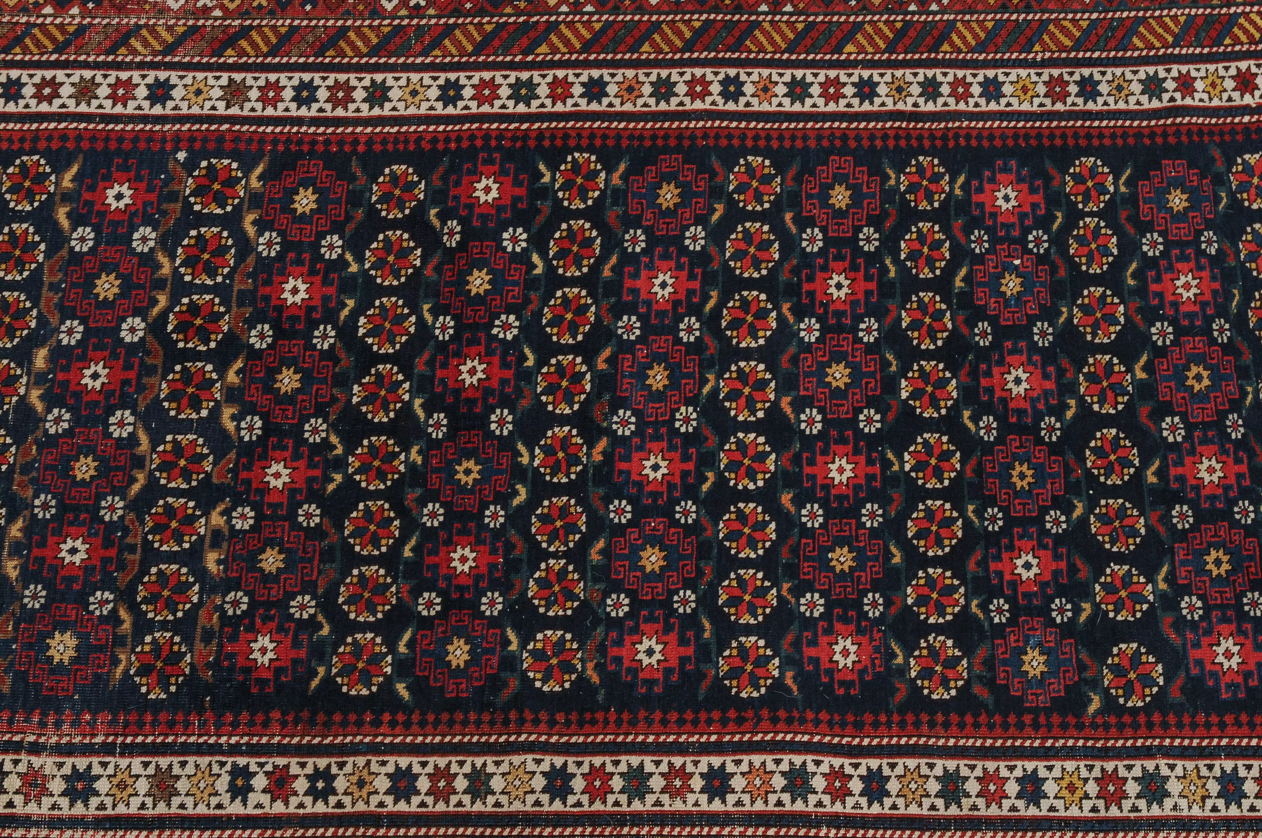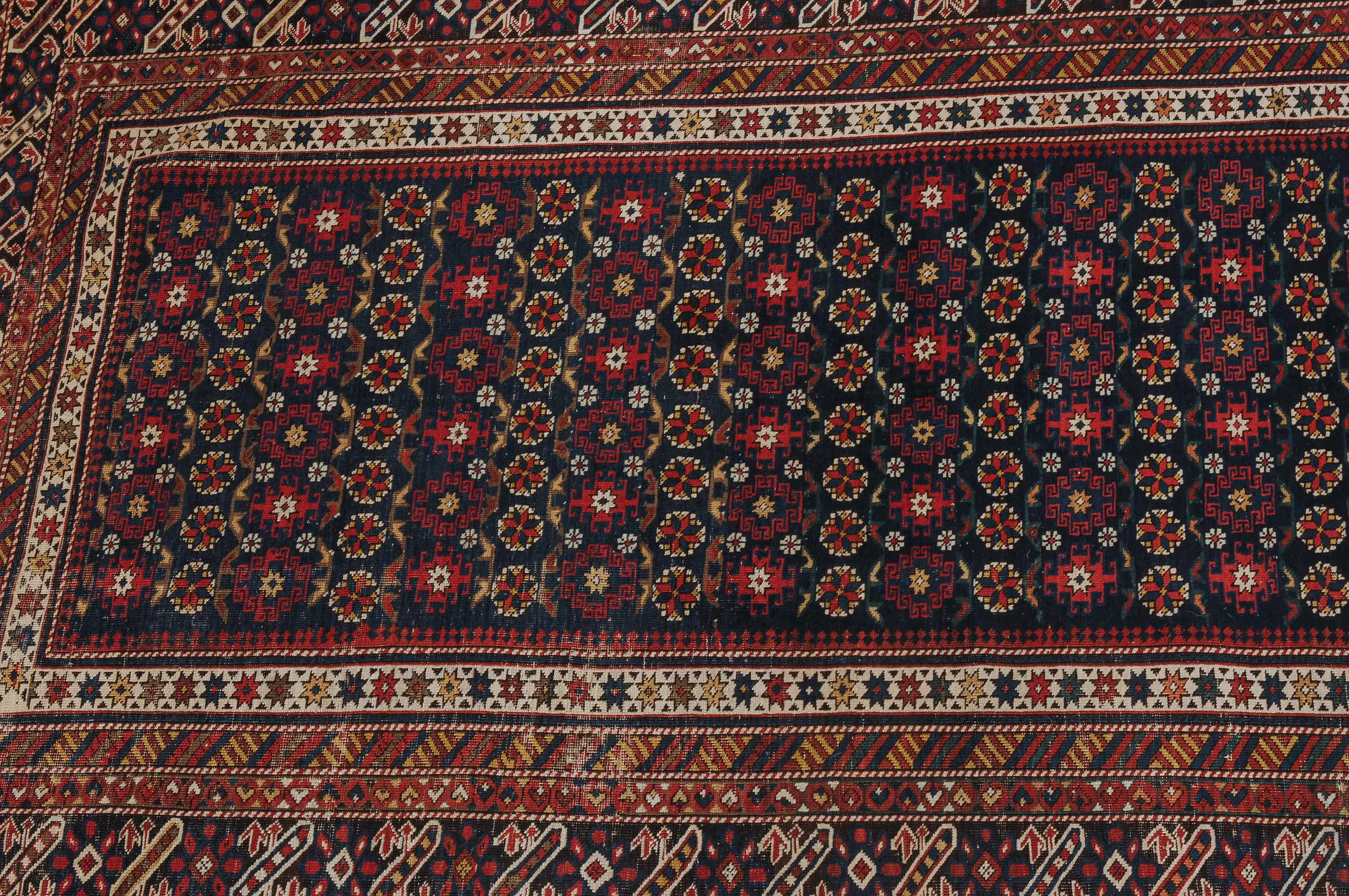 NO-Kaukasus, um 1900. Im langgezogenen nachtblauen Mittelfeld sind in horizontalen Reihen Tschitischi-Elemente auf dekorative Weise angelegt. Eine reziproke Medachyl-Aussenborte sowie Stern- und Streifenborten umgeben die ebenfalls nachtblaue, charakteristische Tschitschi-Bordüre. Gebrauchsspuren. 184x275 cm (ft. 6.1x9.1).