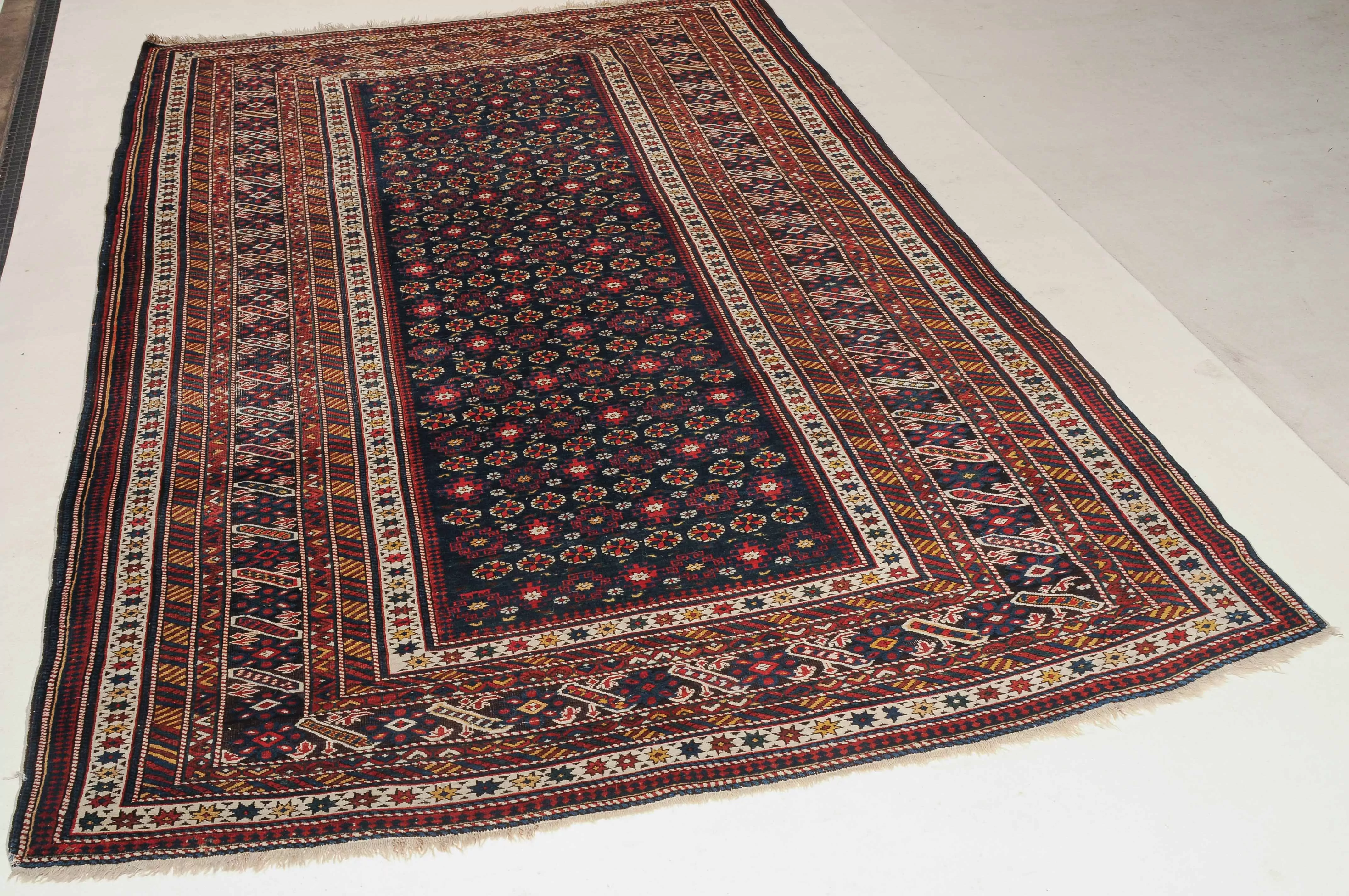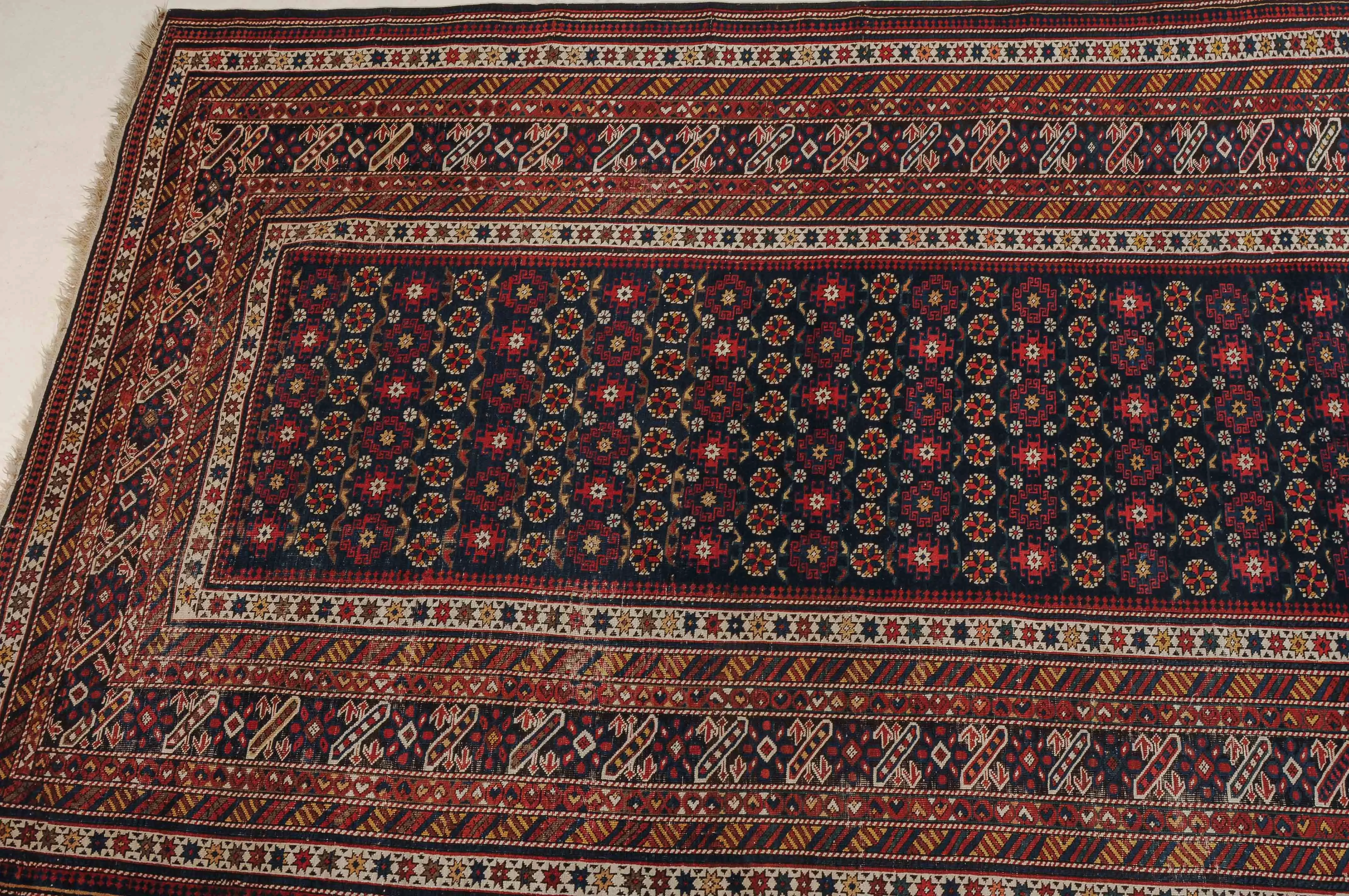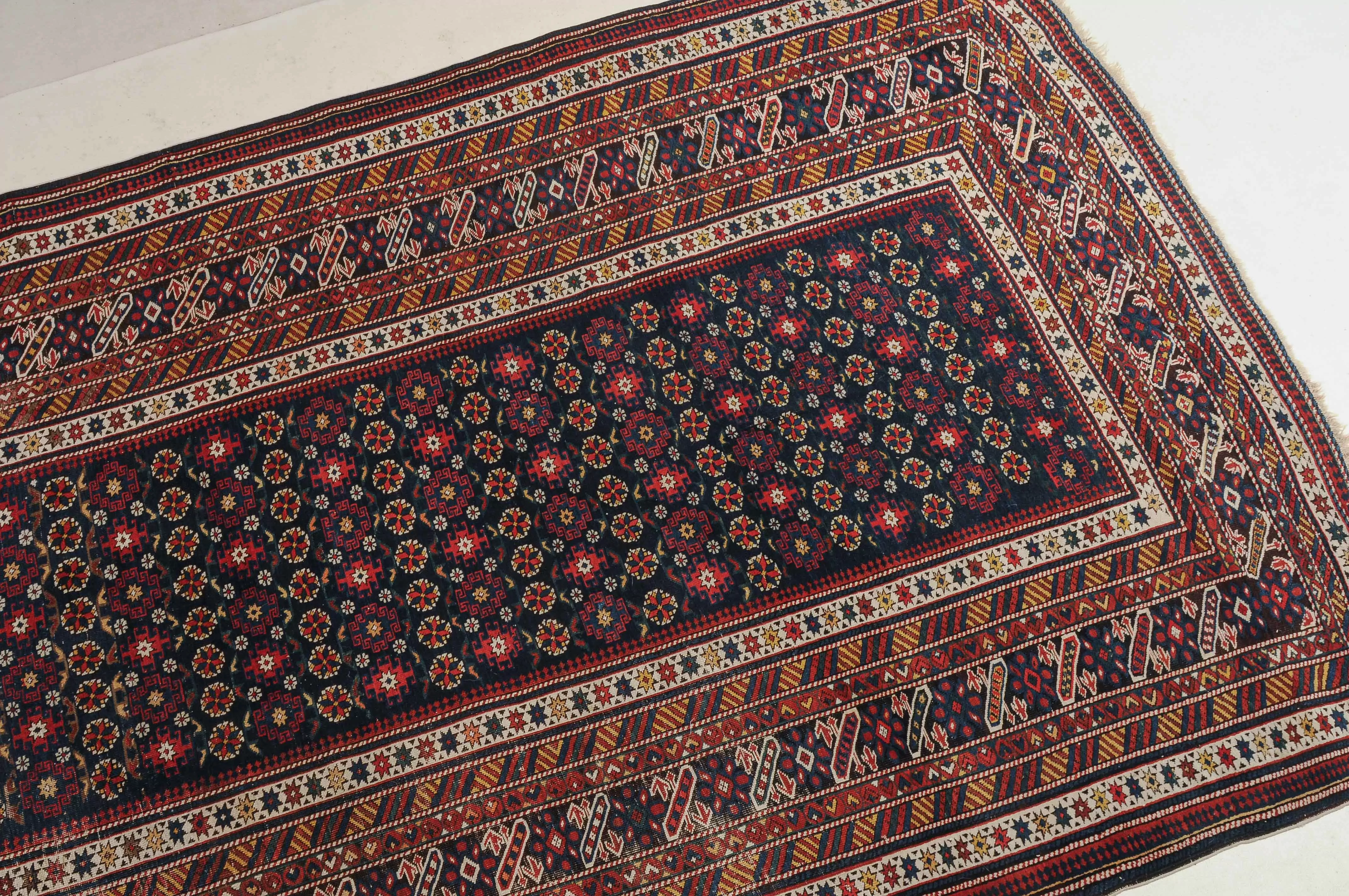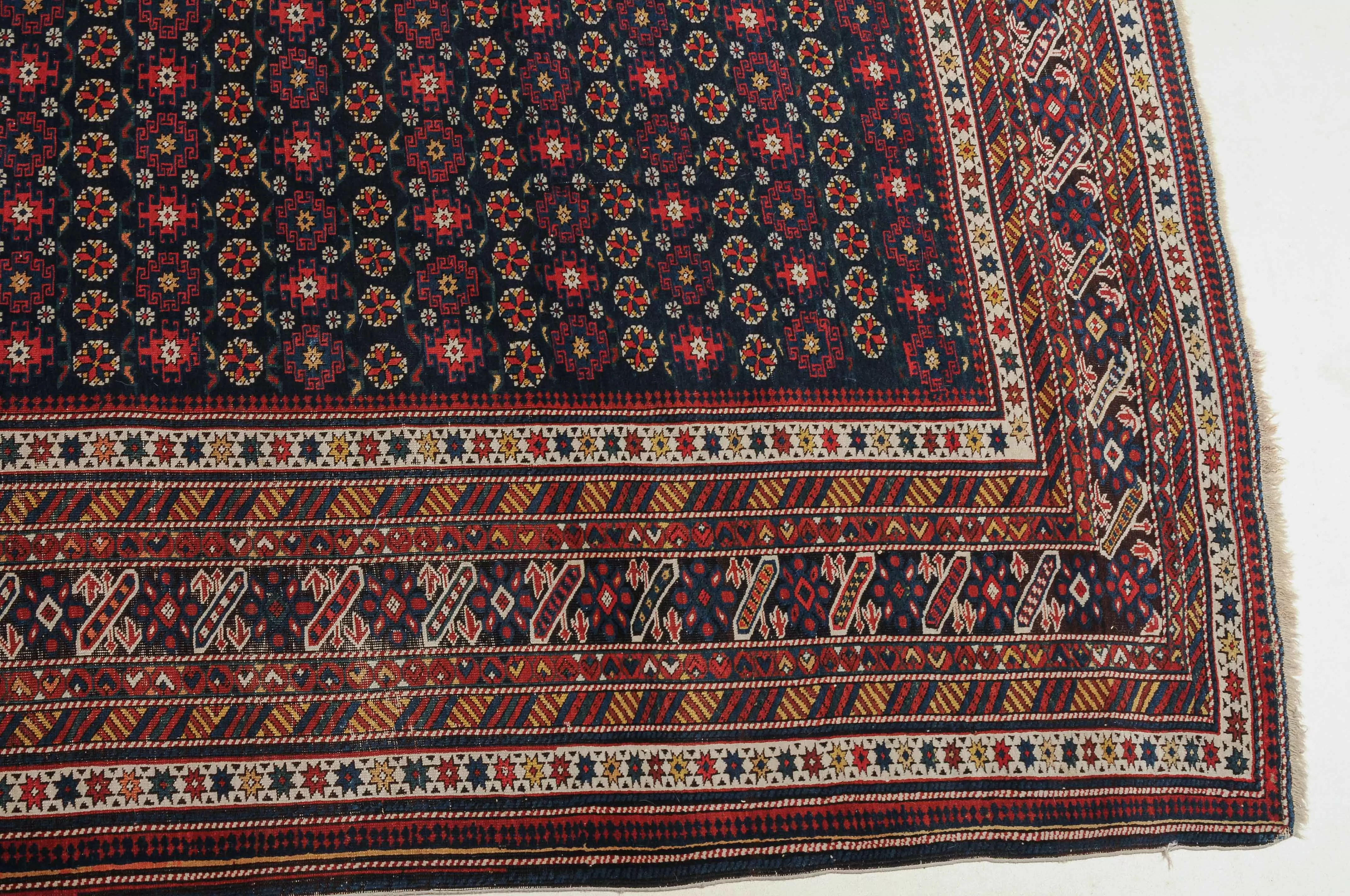 NO-Kaukasus, um 1900. Im langgezogenen nachtblauen Mittelfeld sind in horizontalen Reihen Tschitischi-Elemente auf dekorative Weise angelegt. Eine reziproke Medachyl-Aussenborte sowie Stern- und Streifenborten umgeben die ebenfalls nachtblaue, charakteristische Tschitschi-Bordüre. Gebrauchsspuren. 184x275 cm (ft. 6.1x9.1).