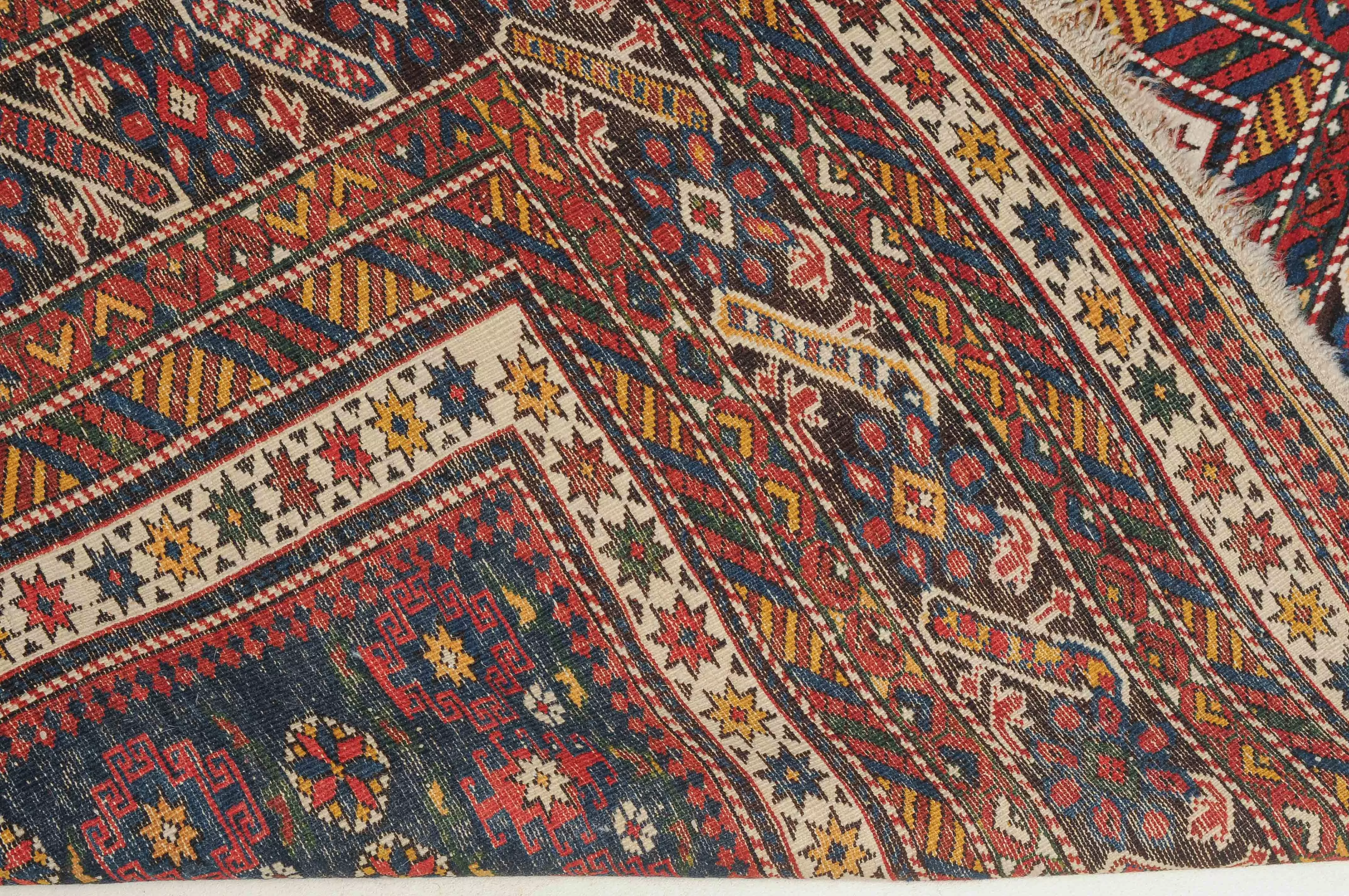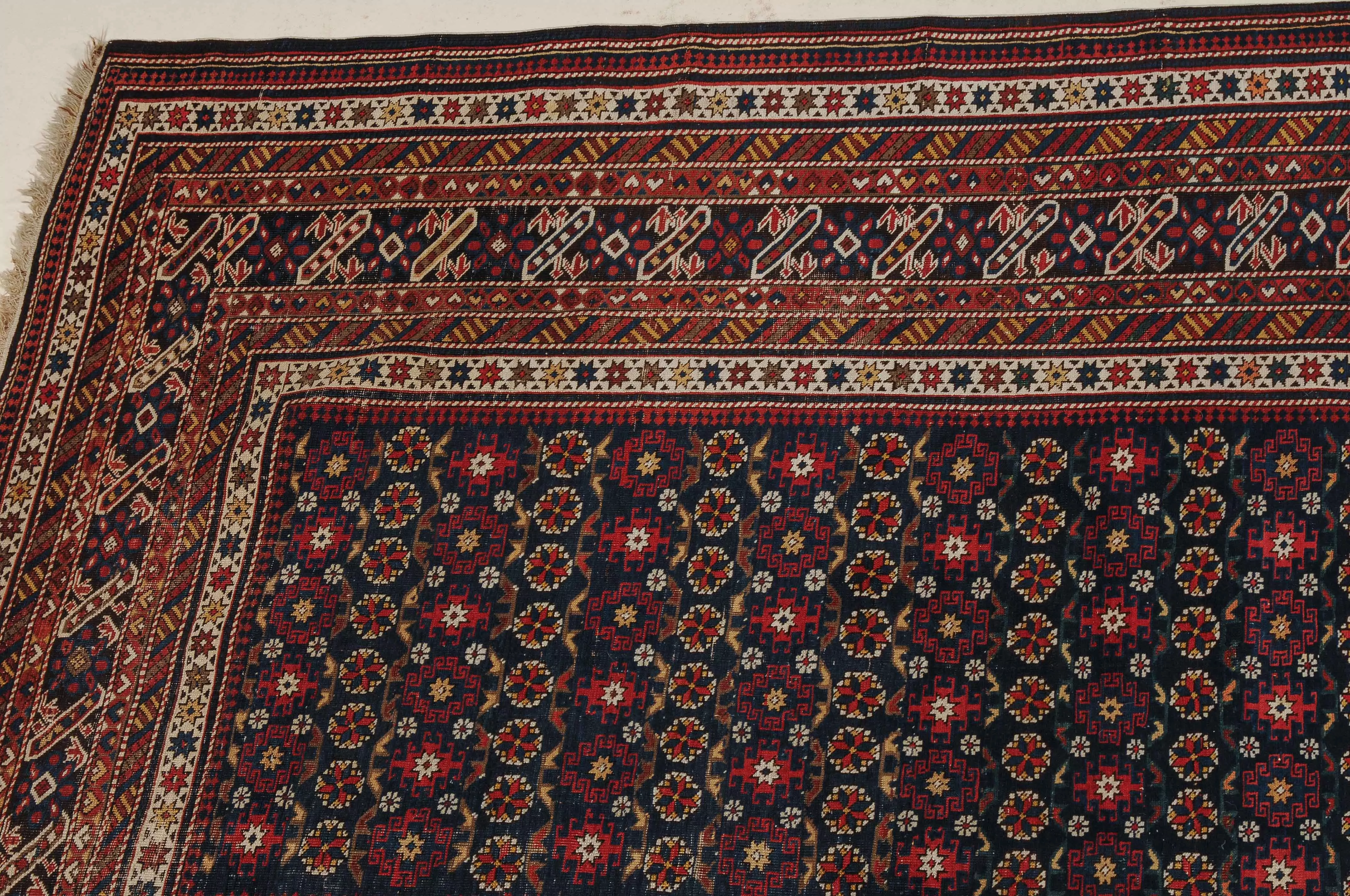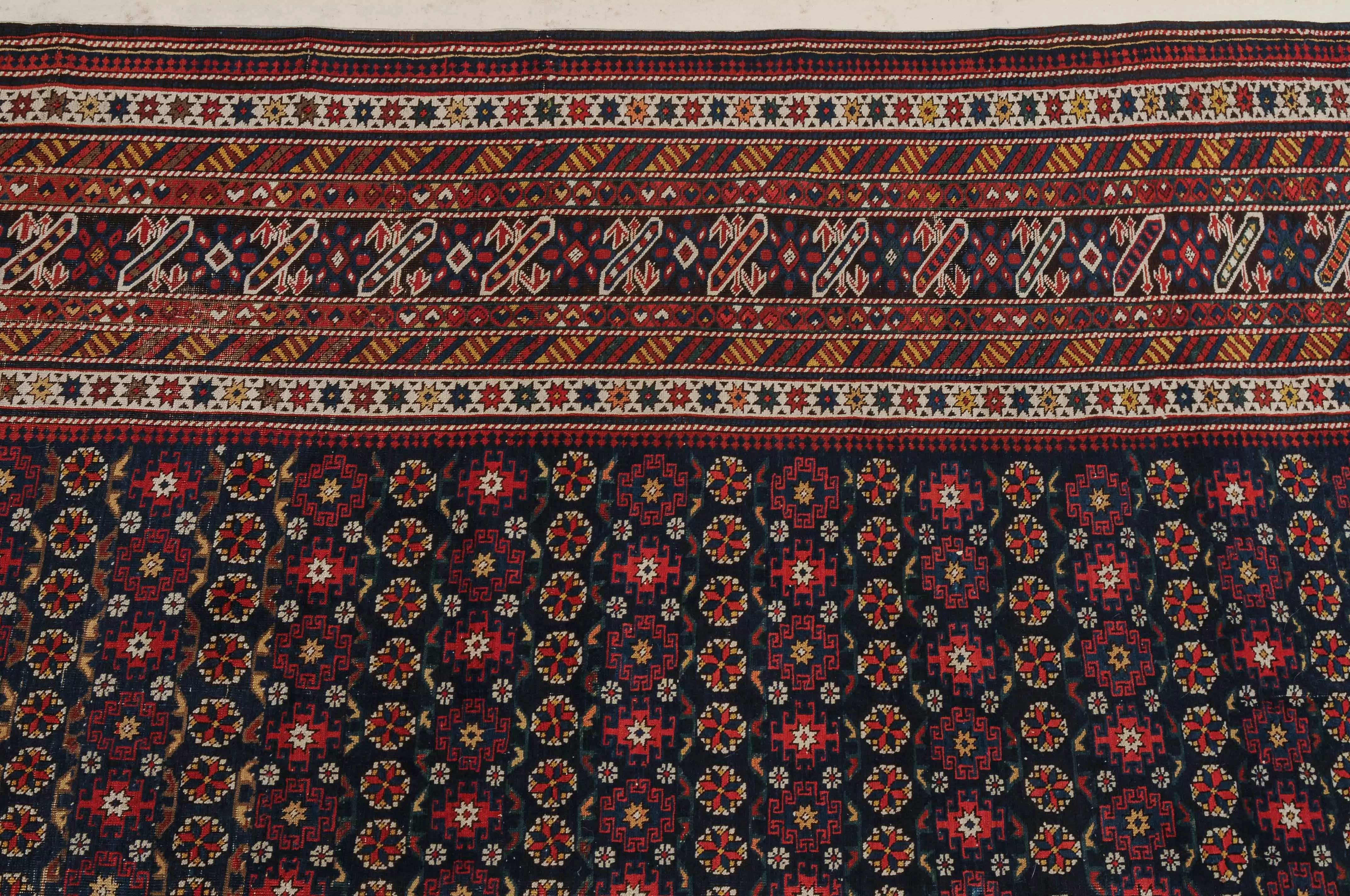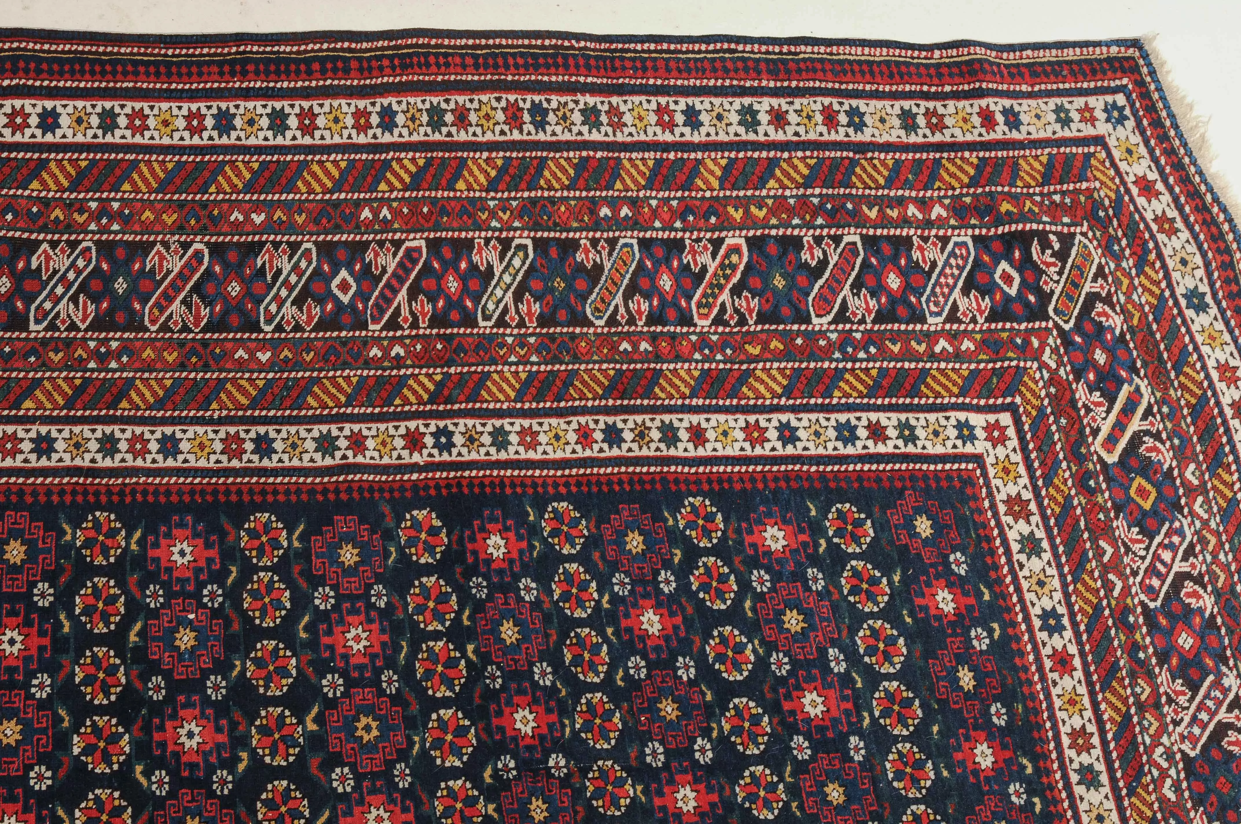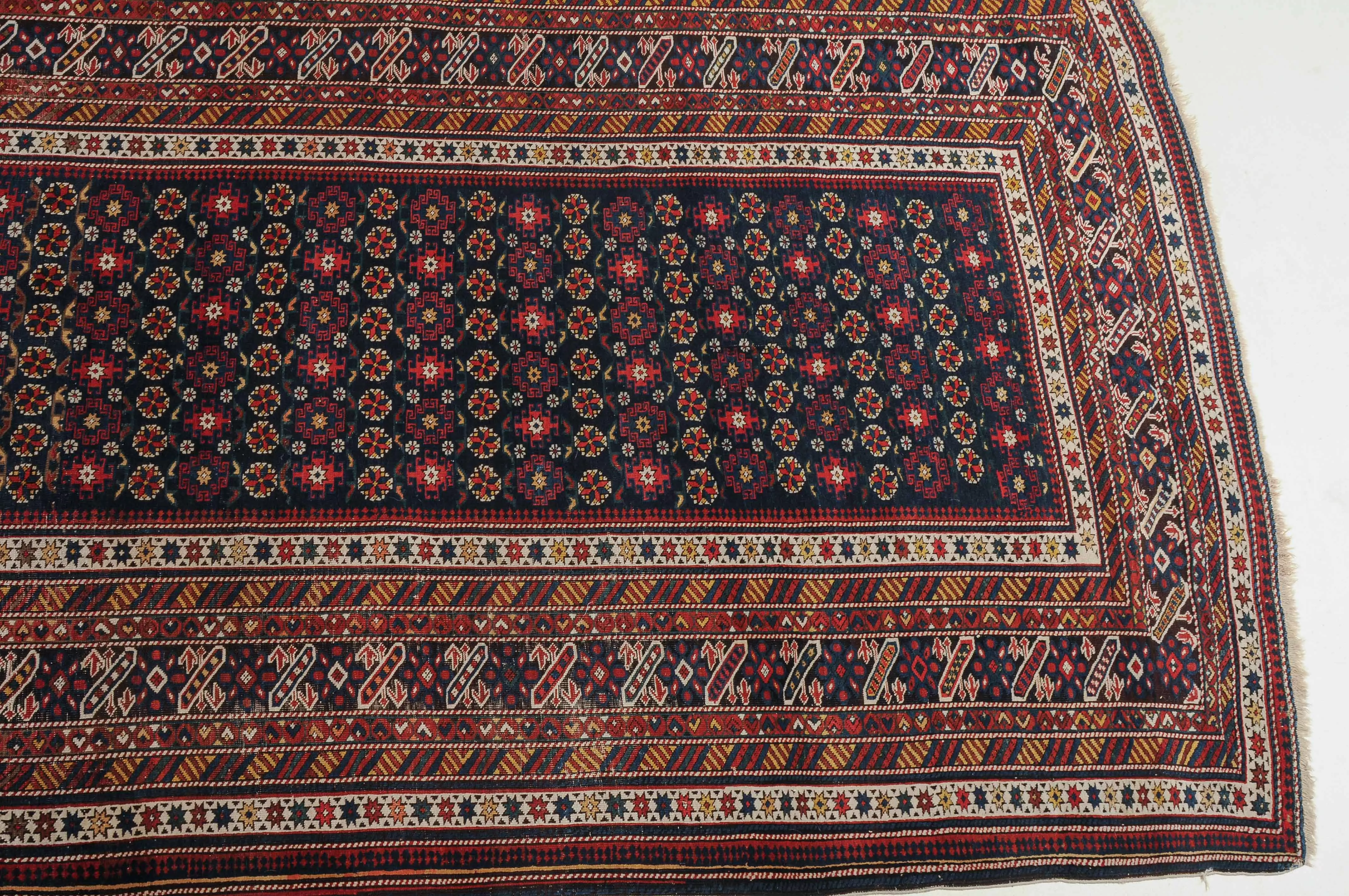 NO-Kaukasus, um 1900. Im langgezogenen nachtblauen Mittelfeld sind in horizontalen Reihen Tschitischi-Elemente auf dekorative Weise angelegt. Eine reziproke Medachyl-Aussenborte sowie Stern- und Streifenborten umgeben die ebenfalls nachtblaue, charakteristische Tschitschi-Bordüre. Gebrauchsspuren. 184x275 cm (ft. 6.1x9.1).