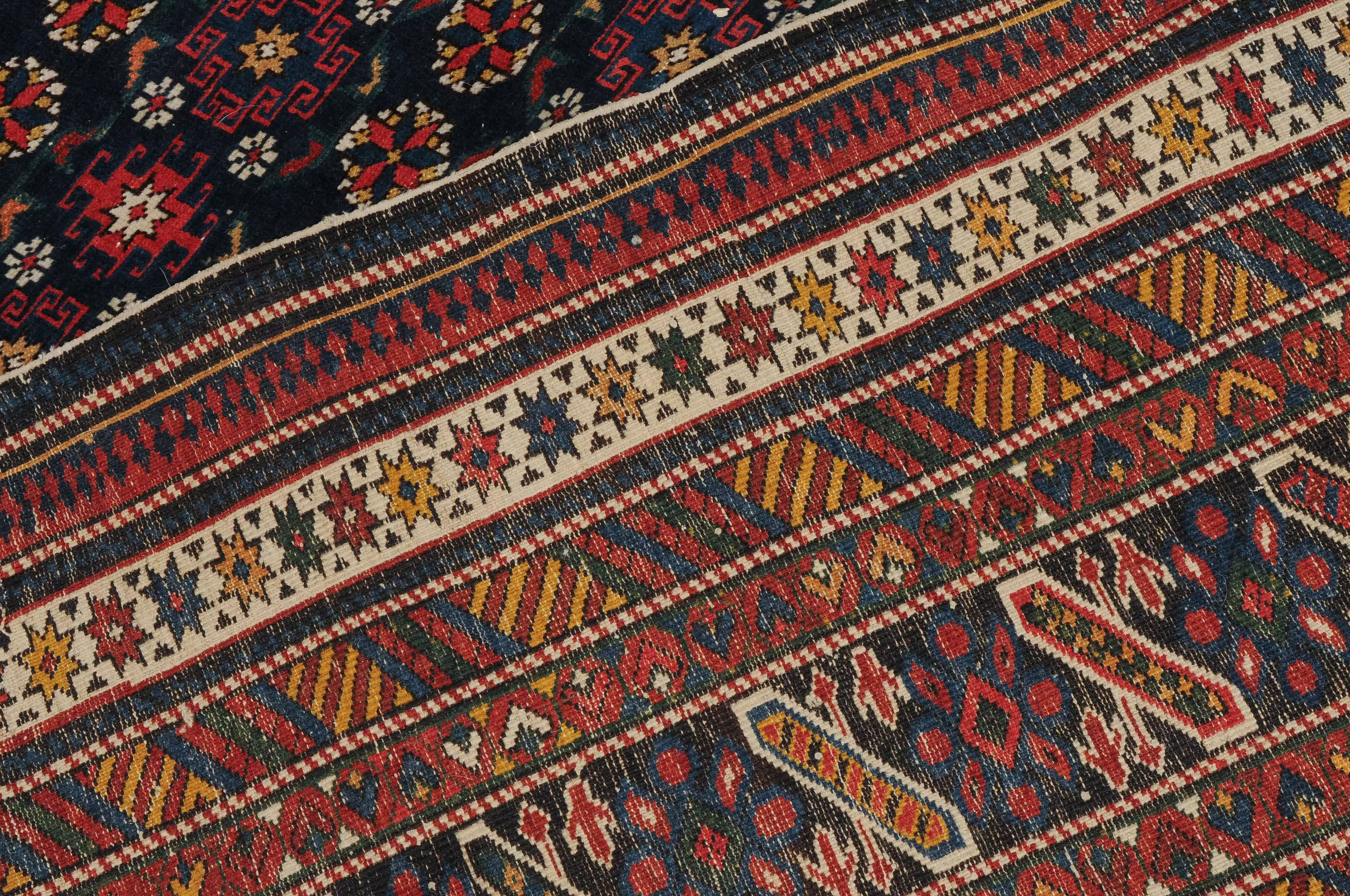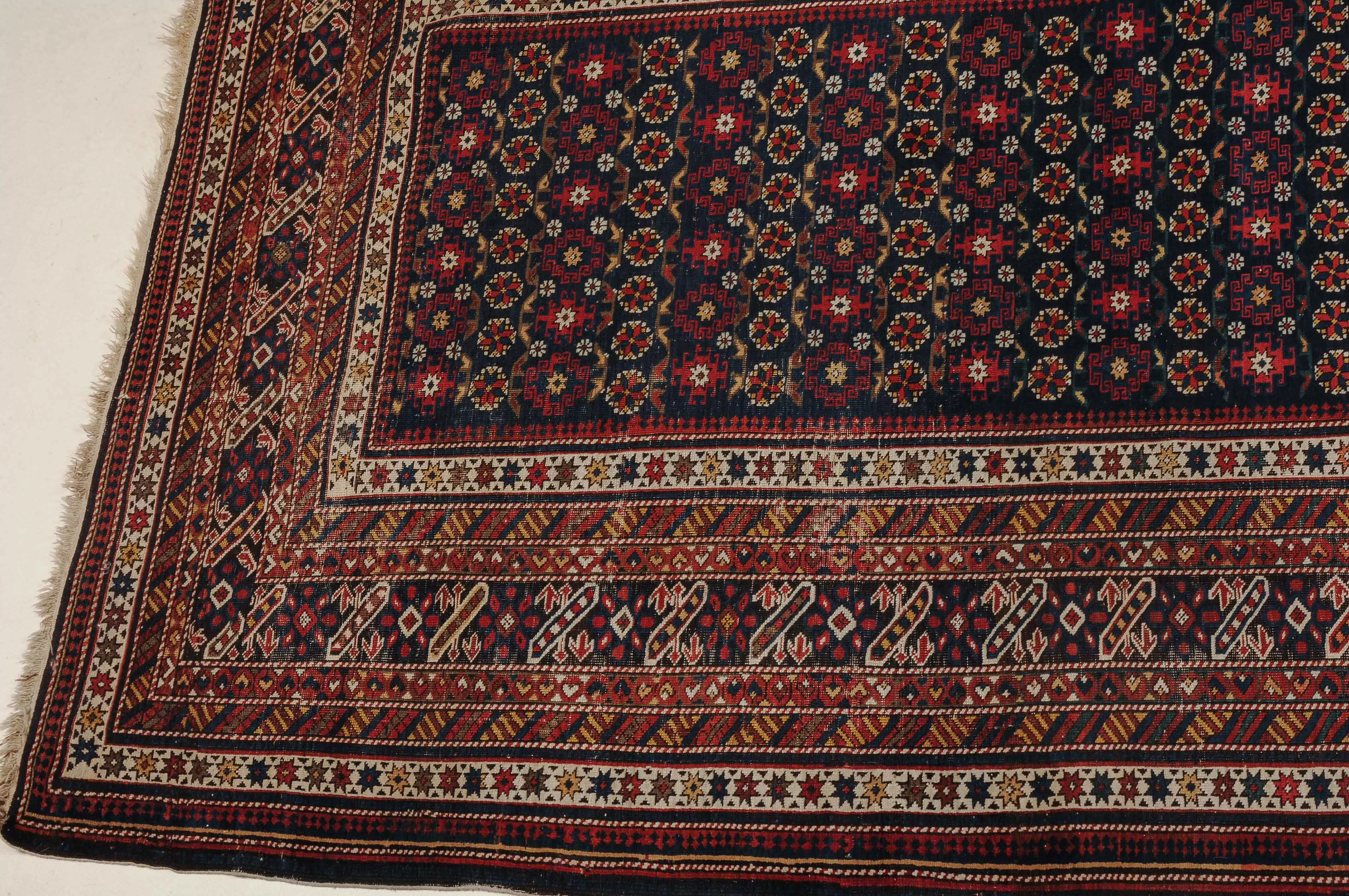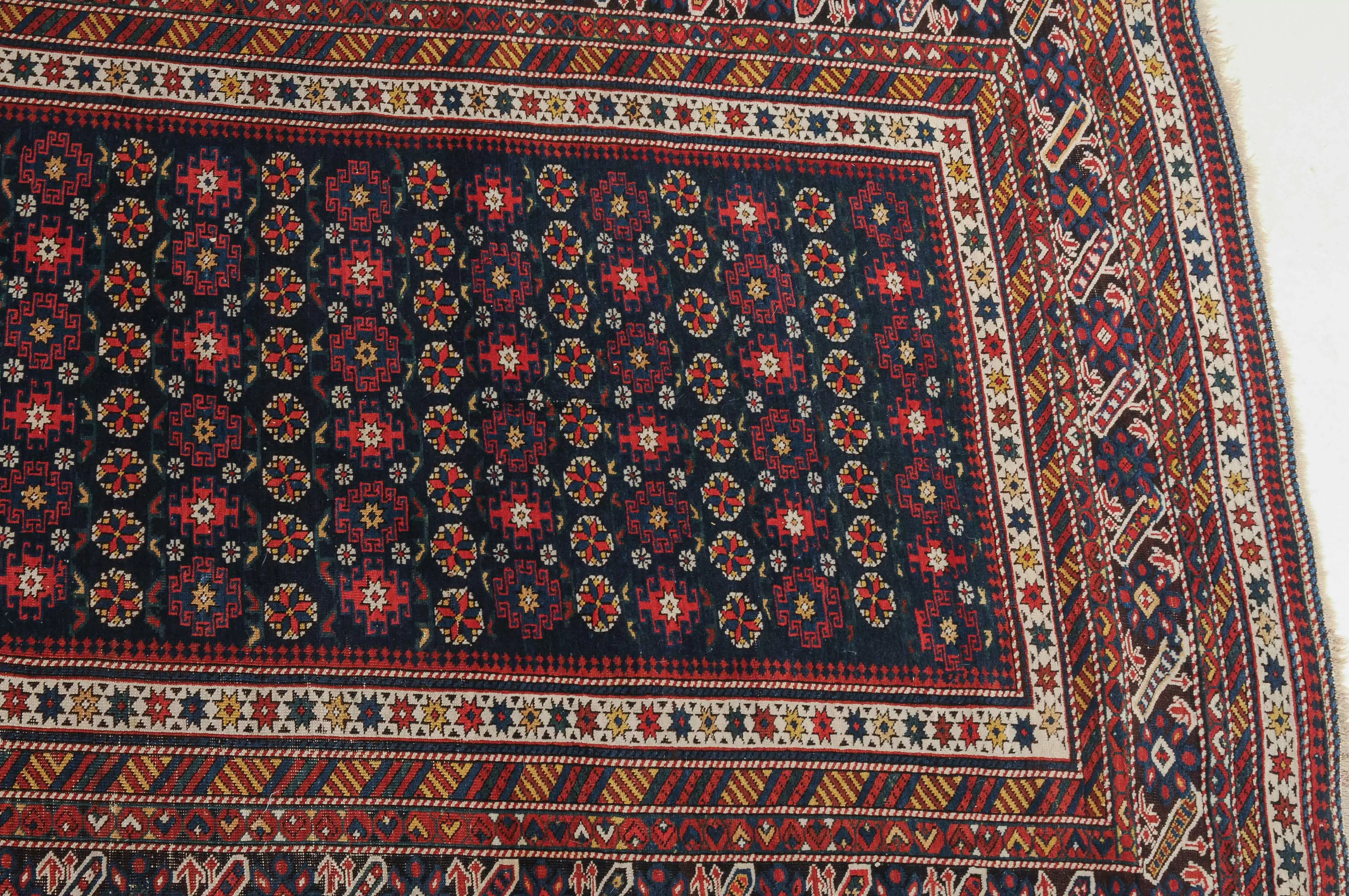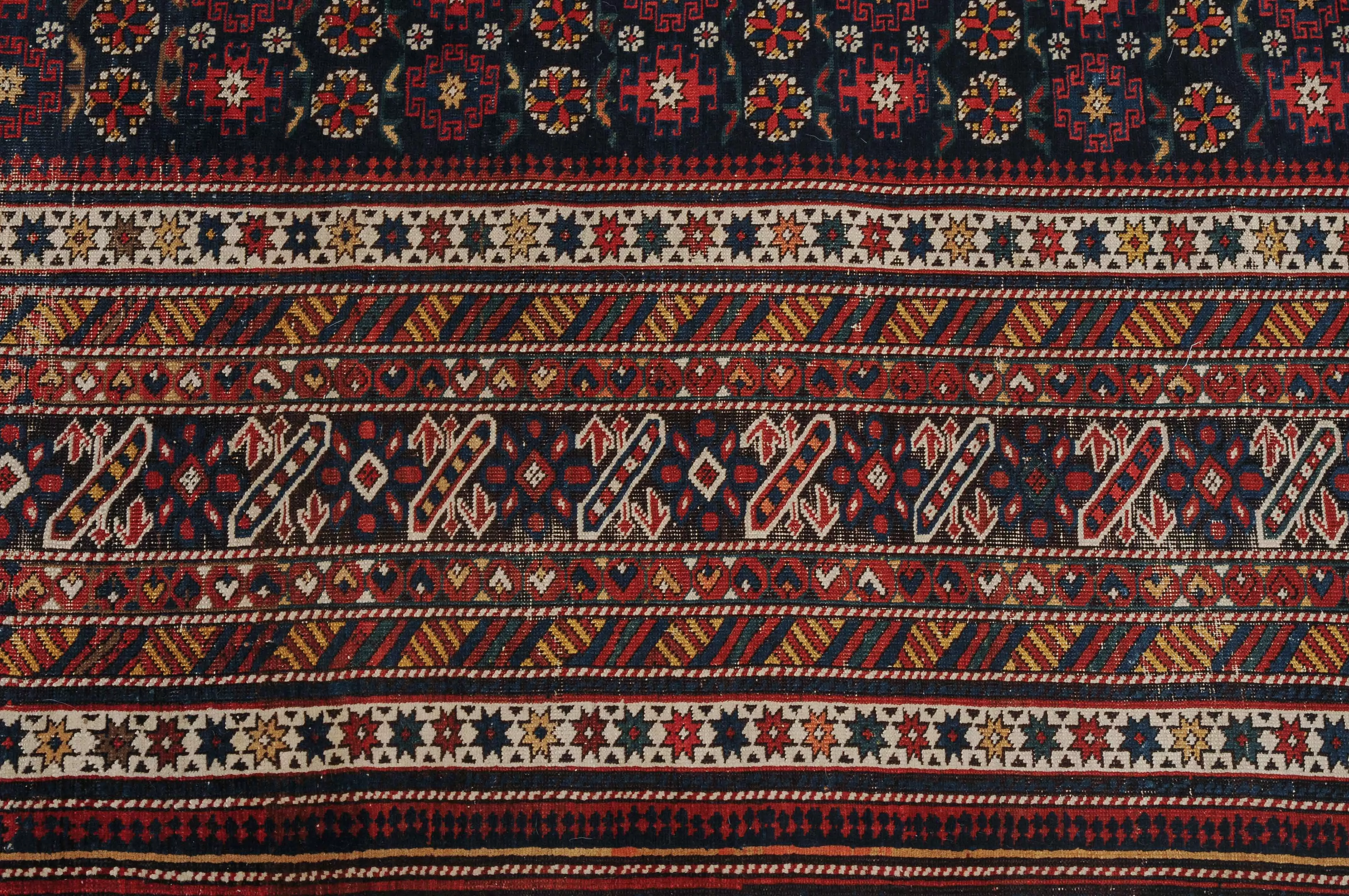 NO-Kaukasus, um 1900. Im langgezogenen nachtblauen Mittelfeld sind in horizontalen Reihen Tschitischi-Elemente auf dekorative Weise angelegt. Eine reziproke Medachyl-Aussenborte sowie Stern- und Streifenborten umgeben die ebenfalls nachtblaue, charakteristische Tschitschi-Bordüre. Gebrauchsspuren. 184x275 cm (ft. 6.1x9.1).