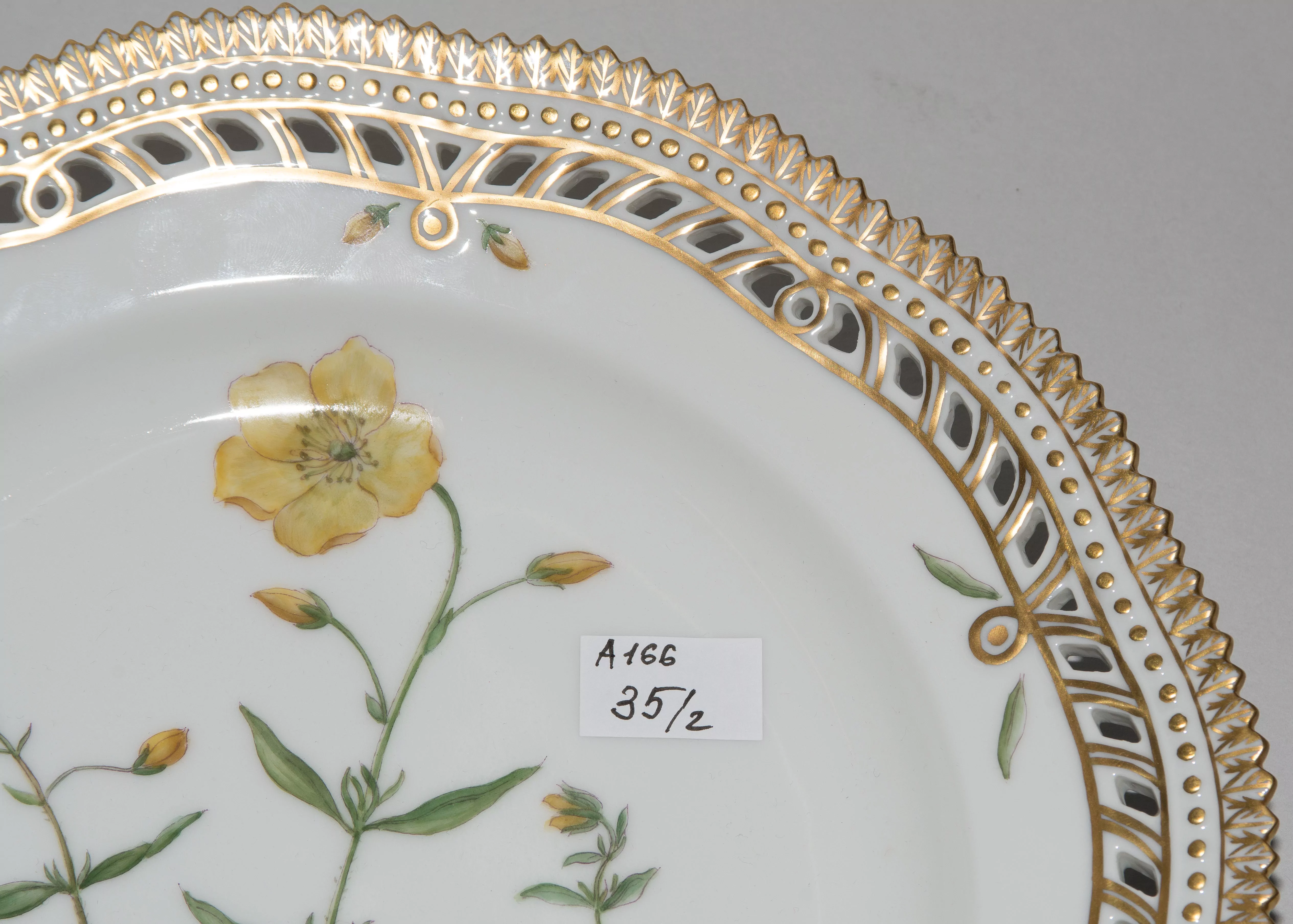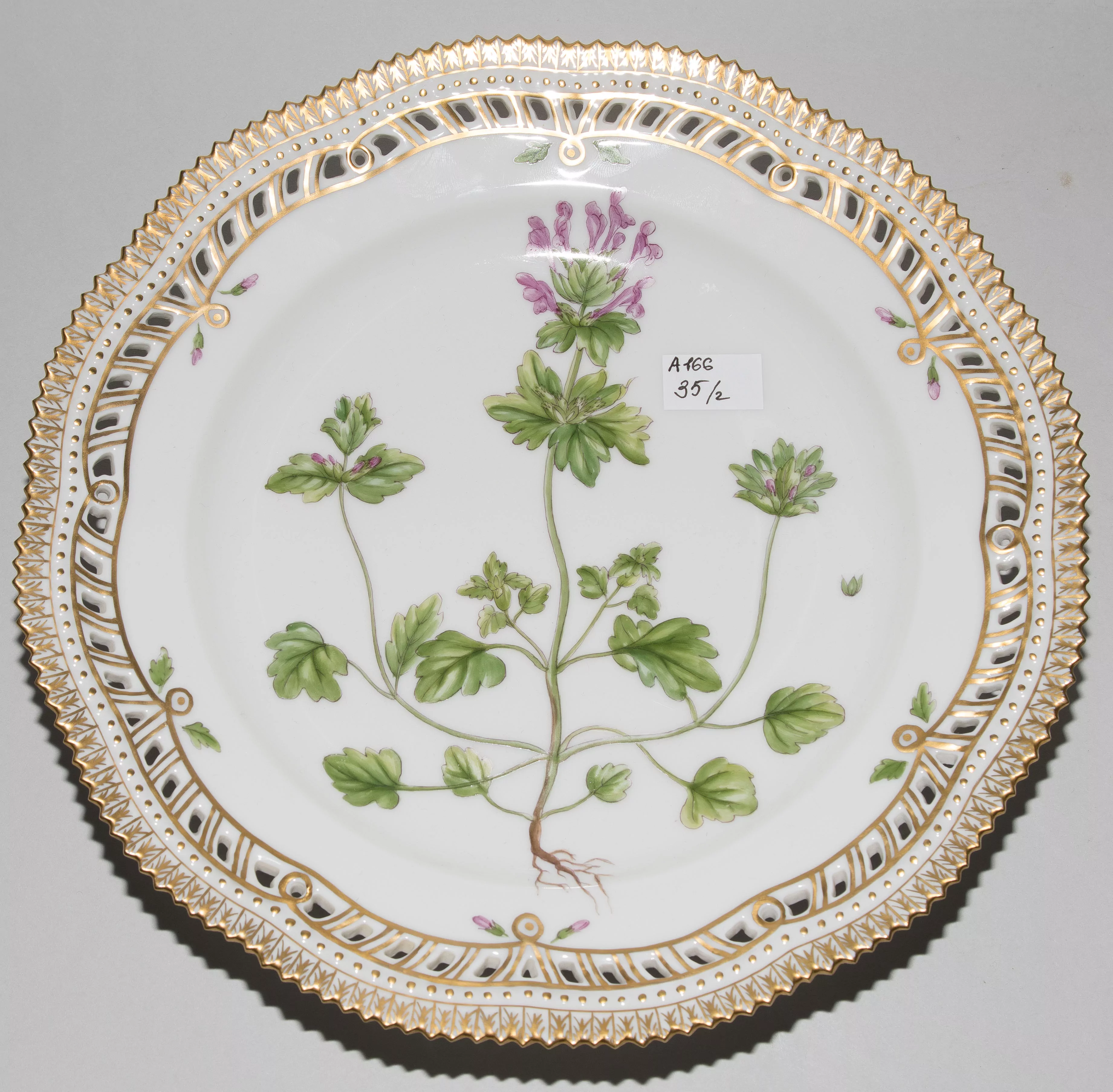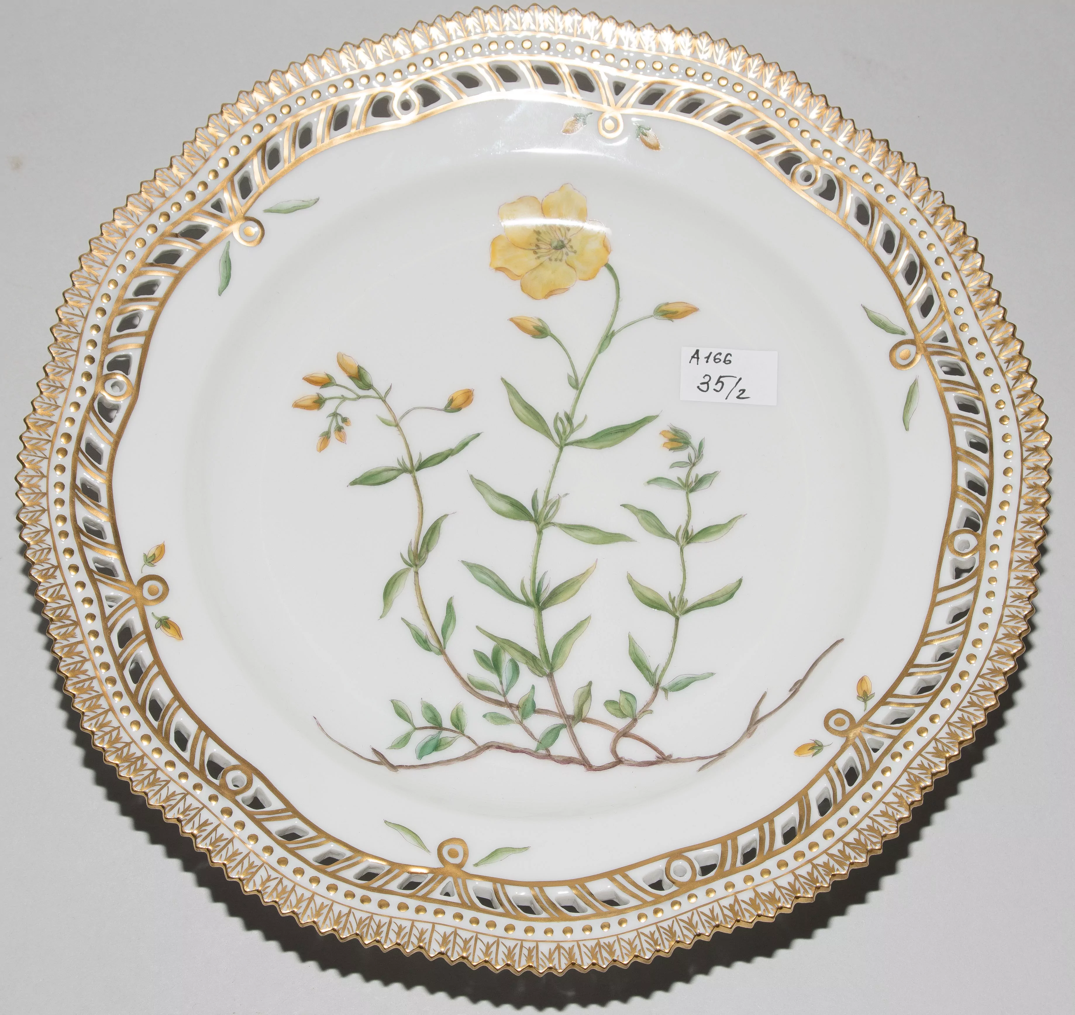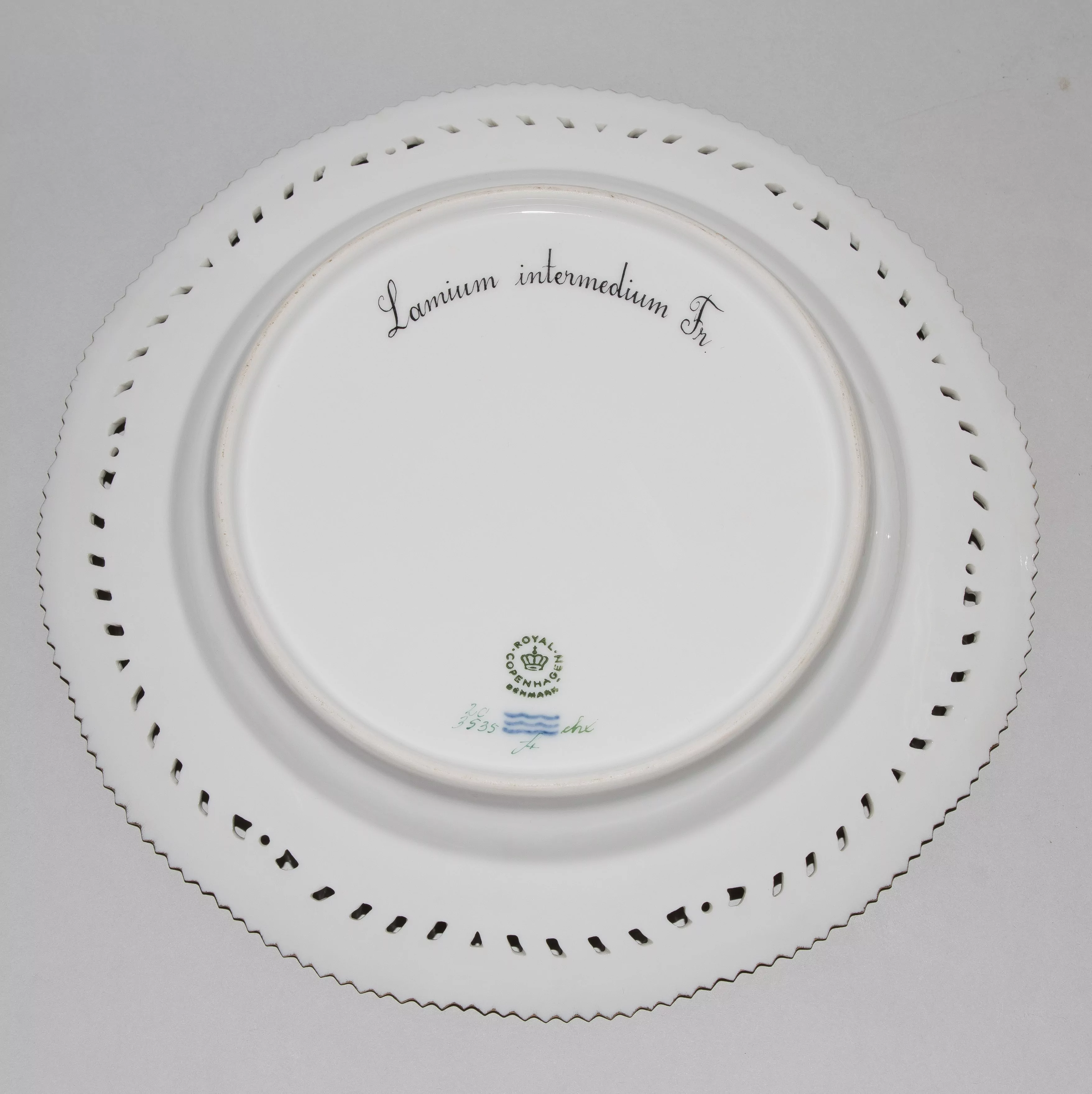 1969–73. Porzellan. Manufakturmarke, grüne Nummern "20/3553" und "20/3553/3535". Im Spiegel Pflanzendarstellung in polychromer Malerei. Goldstaffierung. Reliefierter und gezackter Rand. Durchbruchdekor. Rückseitig bezeichnet "Cistus Helianthemum L." und "Lamium intermedium Fr.". D 25 cm.