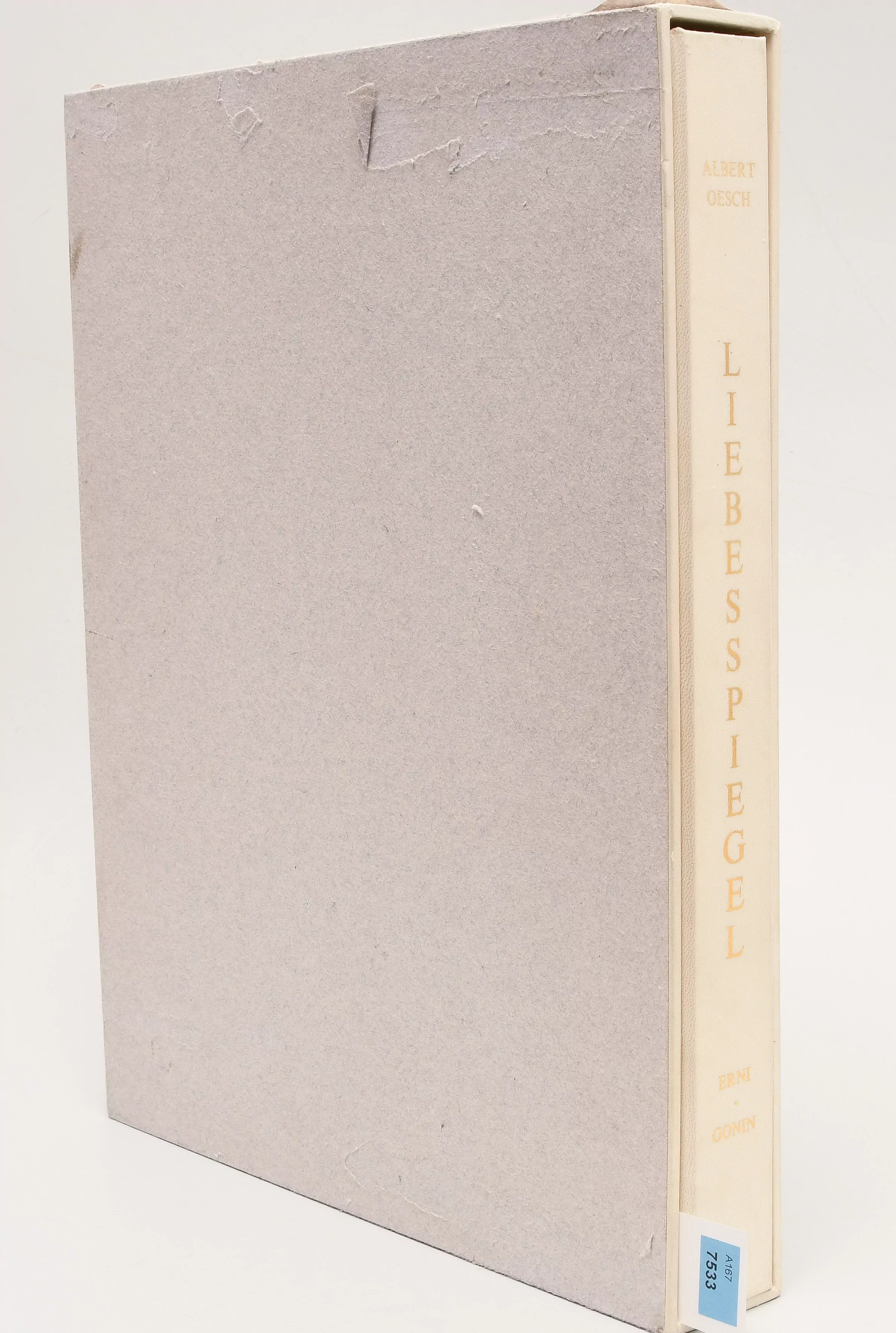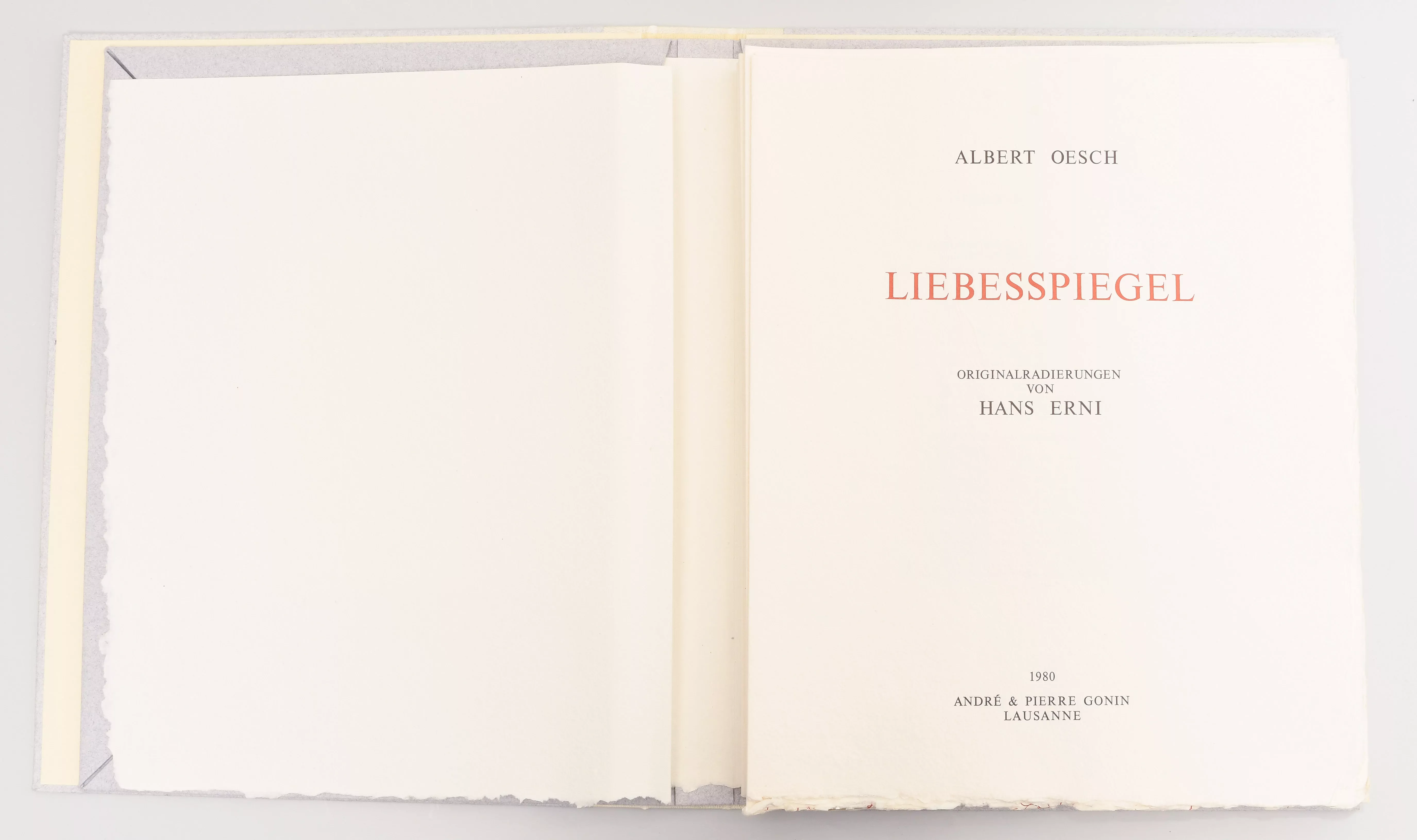 Liebesspiegel. Lausanne, Gonin 1980. Fol. (39x31 cm). Mit Original-Radierungen von Erni illustriert. Lose Lagen in Orig.-Umschlag in Halbpergamentchemise in Schuber. 1 von 117 (total 135) Ex. Von A. und P. Gonin, Erni und Oesch im Impressum signiert.