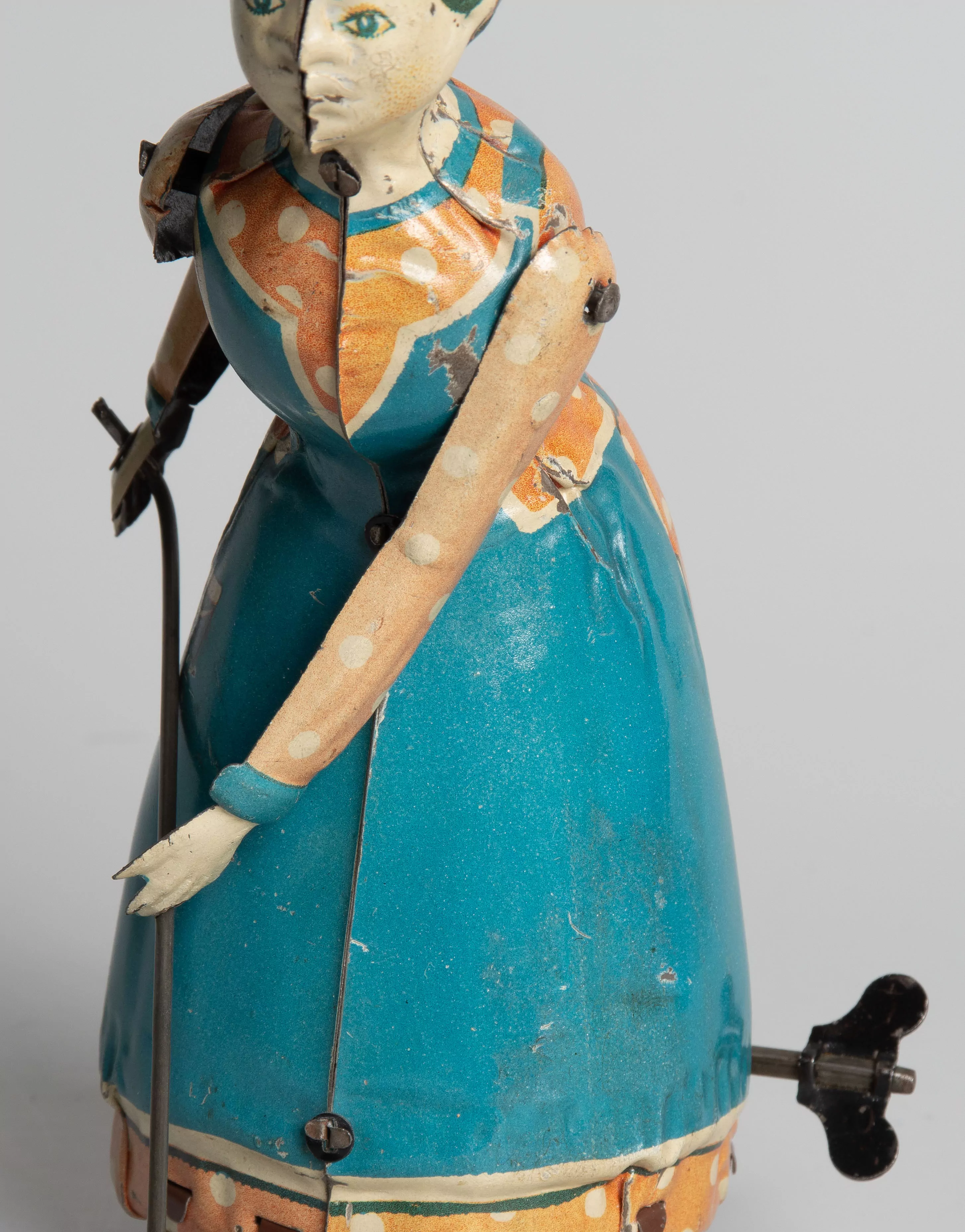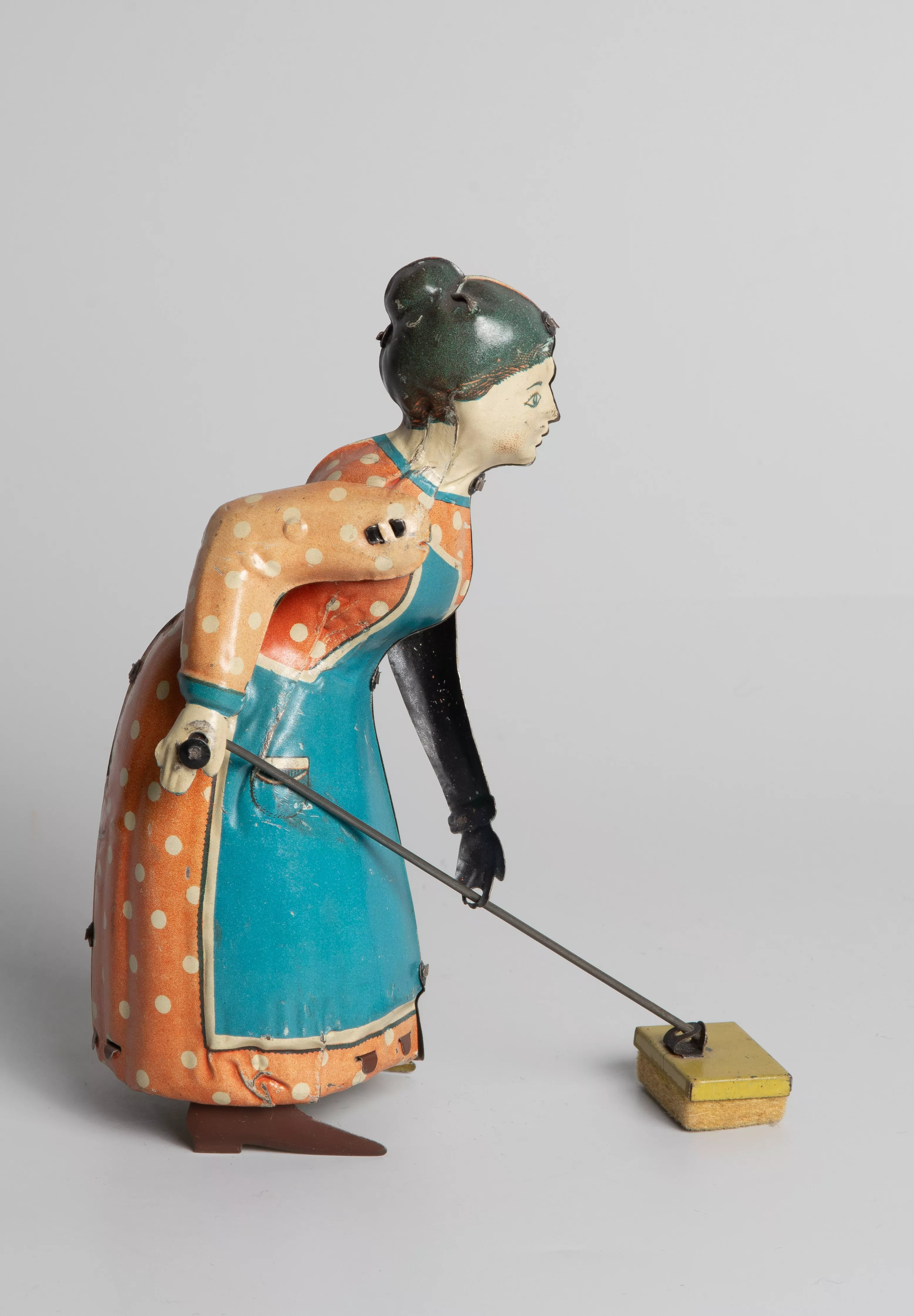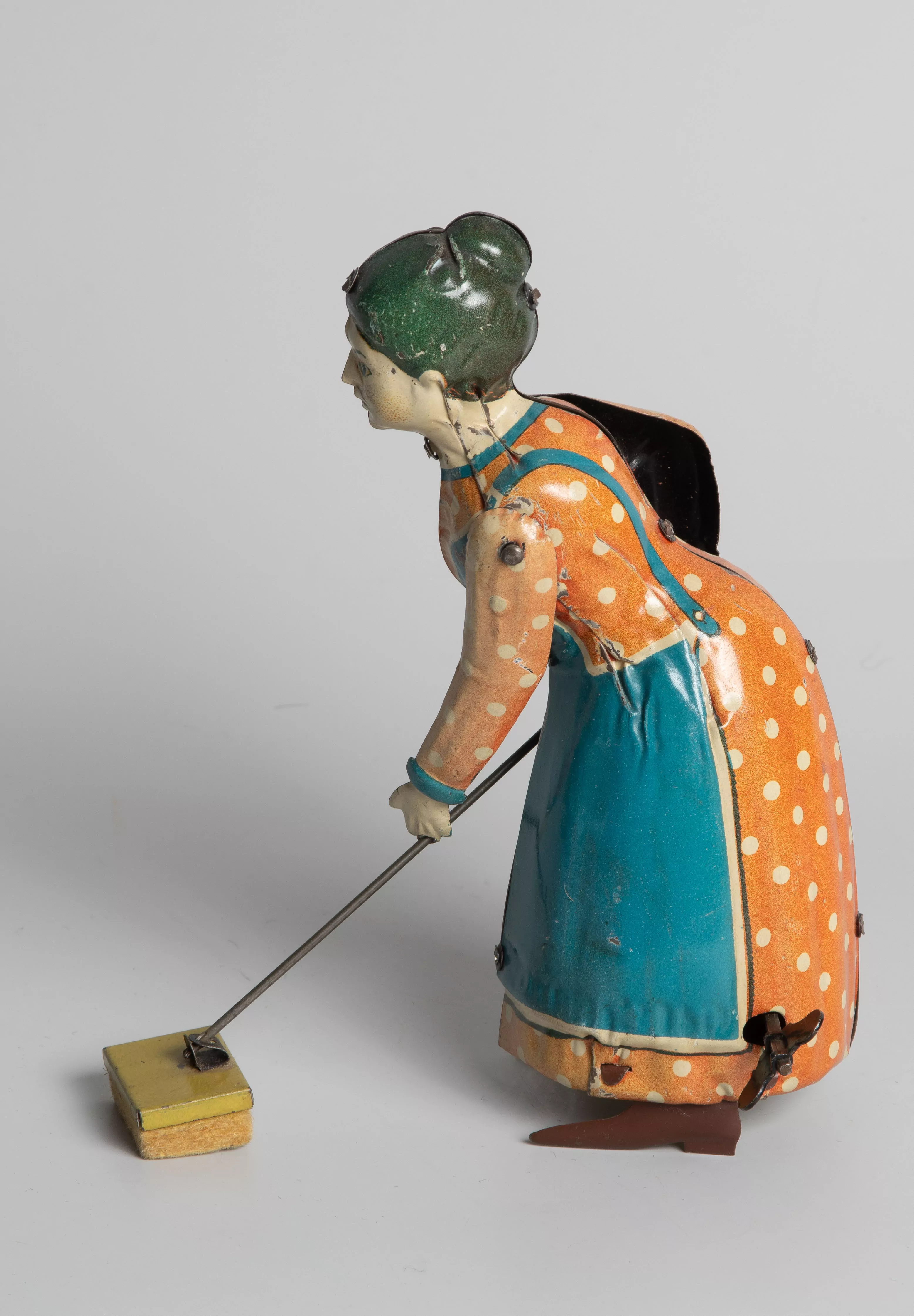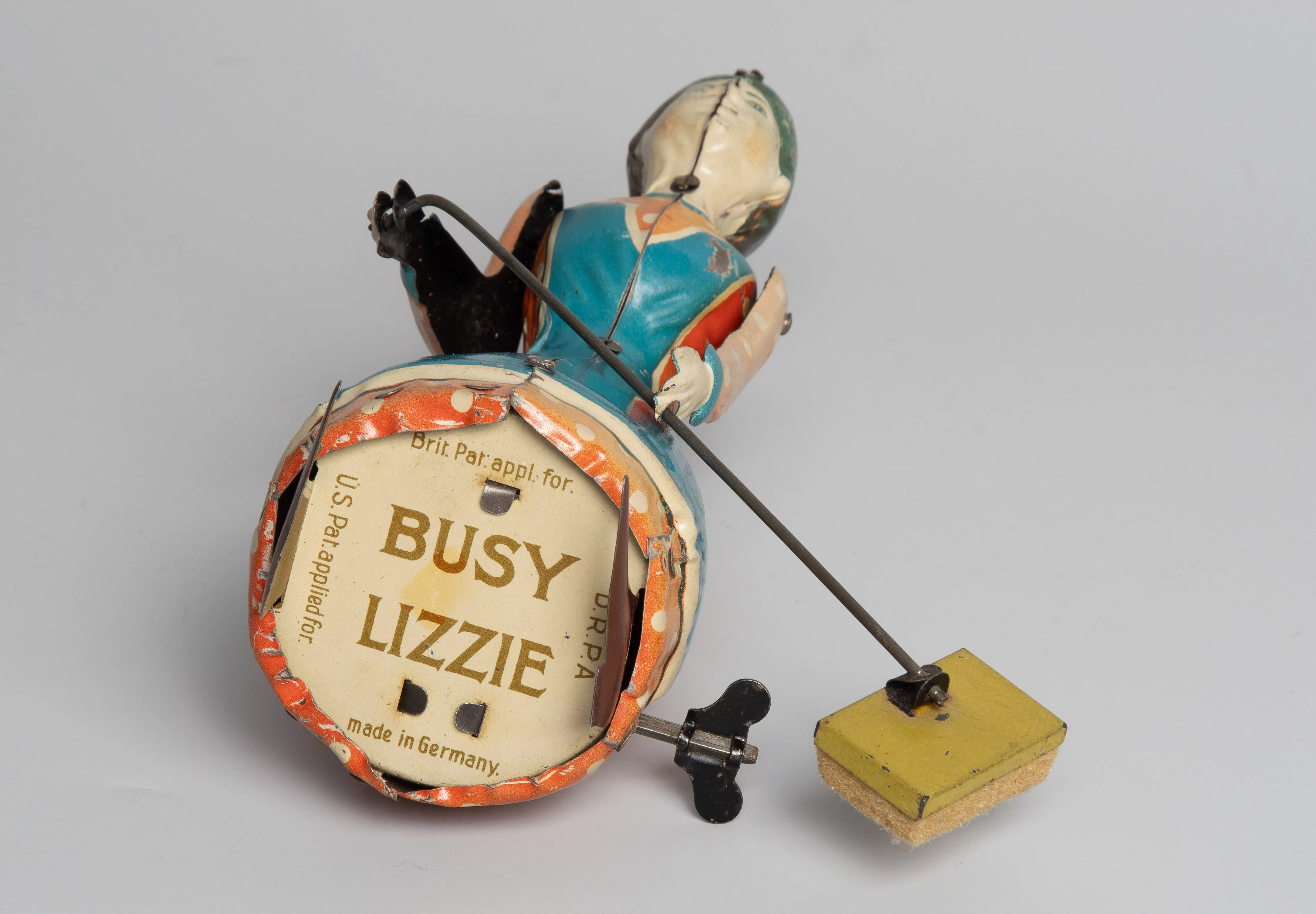 Deutschland, um 1920/30. Am Boden bezeichnet: "BUSY LIZZIE, made in Germany". Blech, farbig lackiert und lithographiert. Frau mit Teppichkehrer. Uhrwerkantrieb. H 17,5 cm. Puppenstuben-Teppich assortiert.