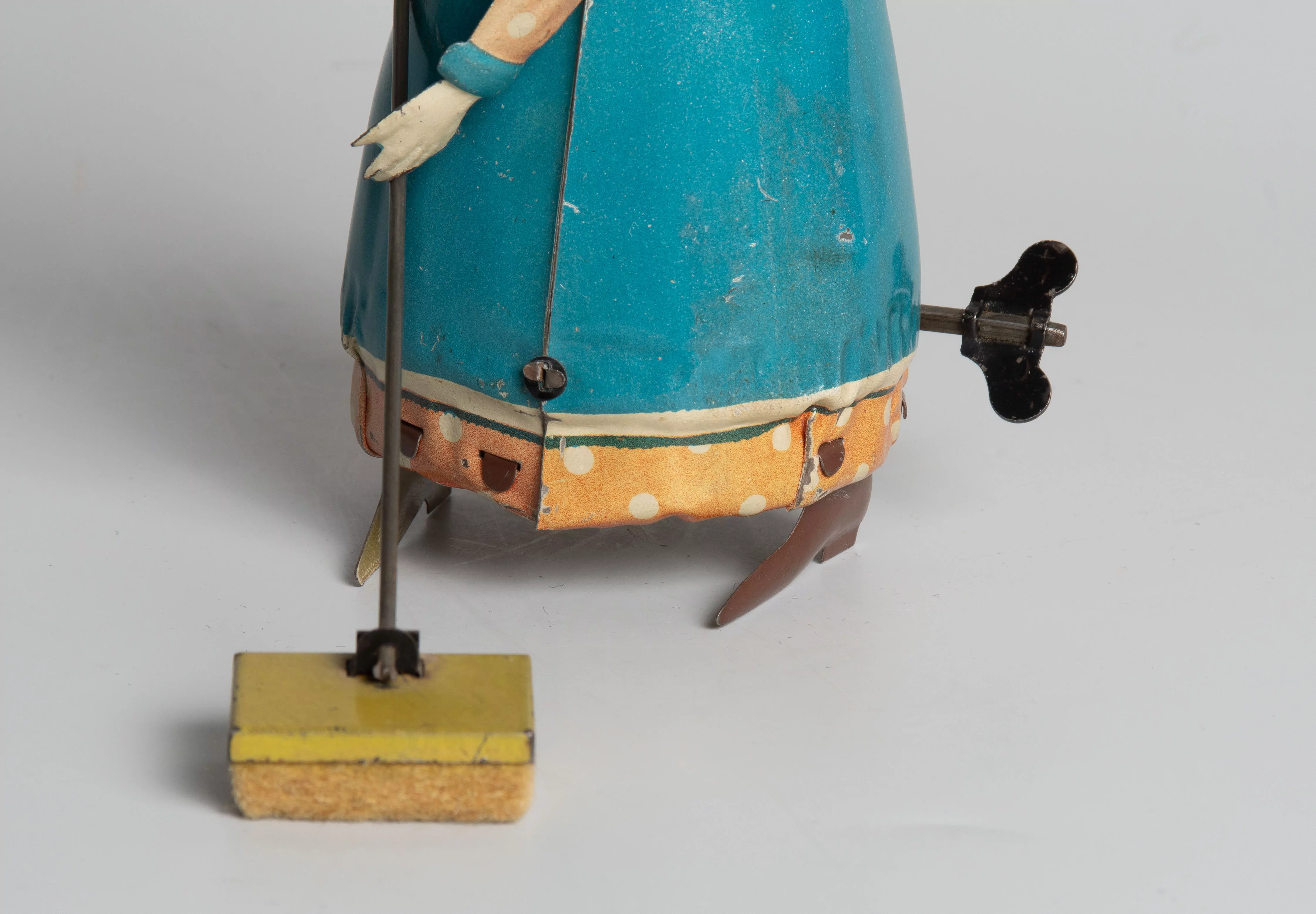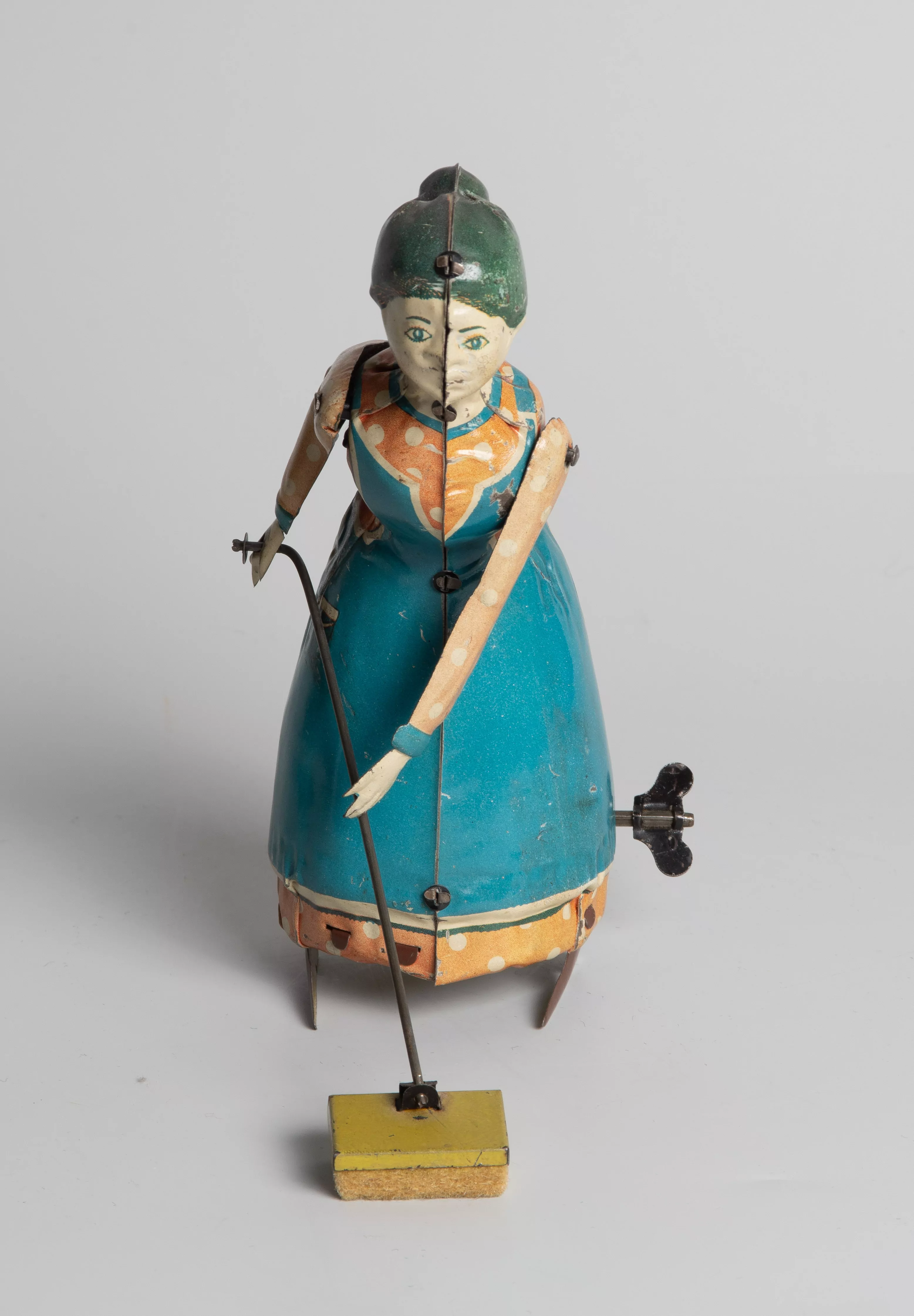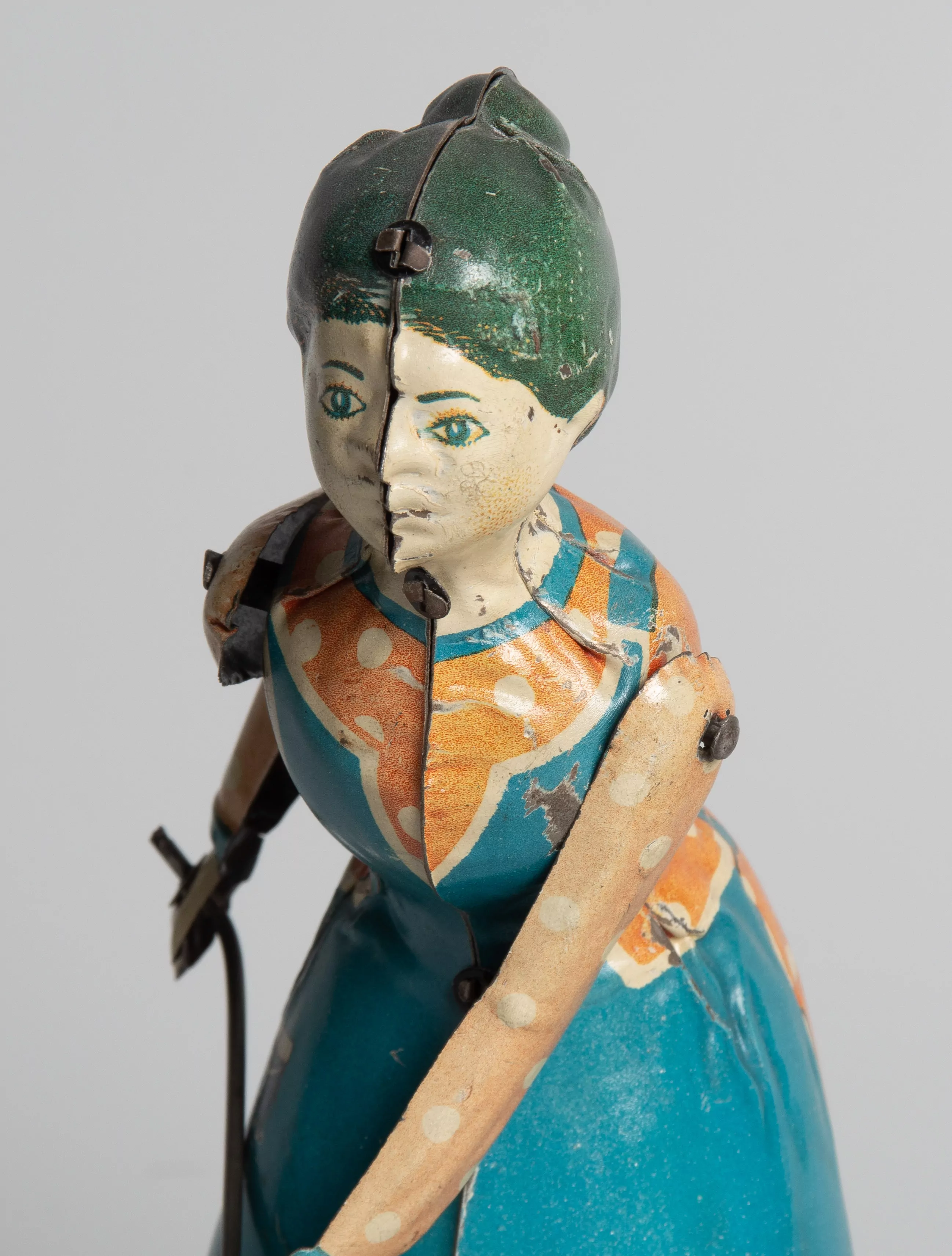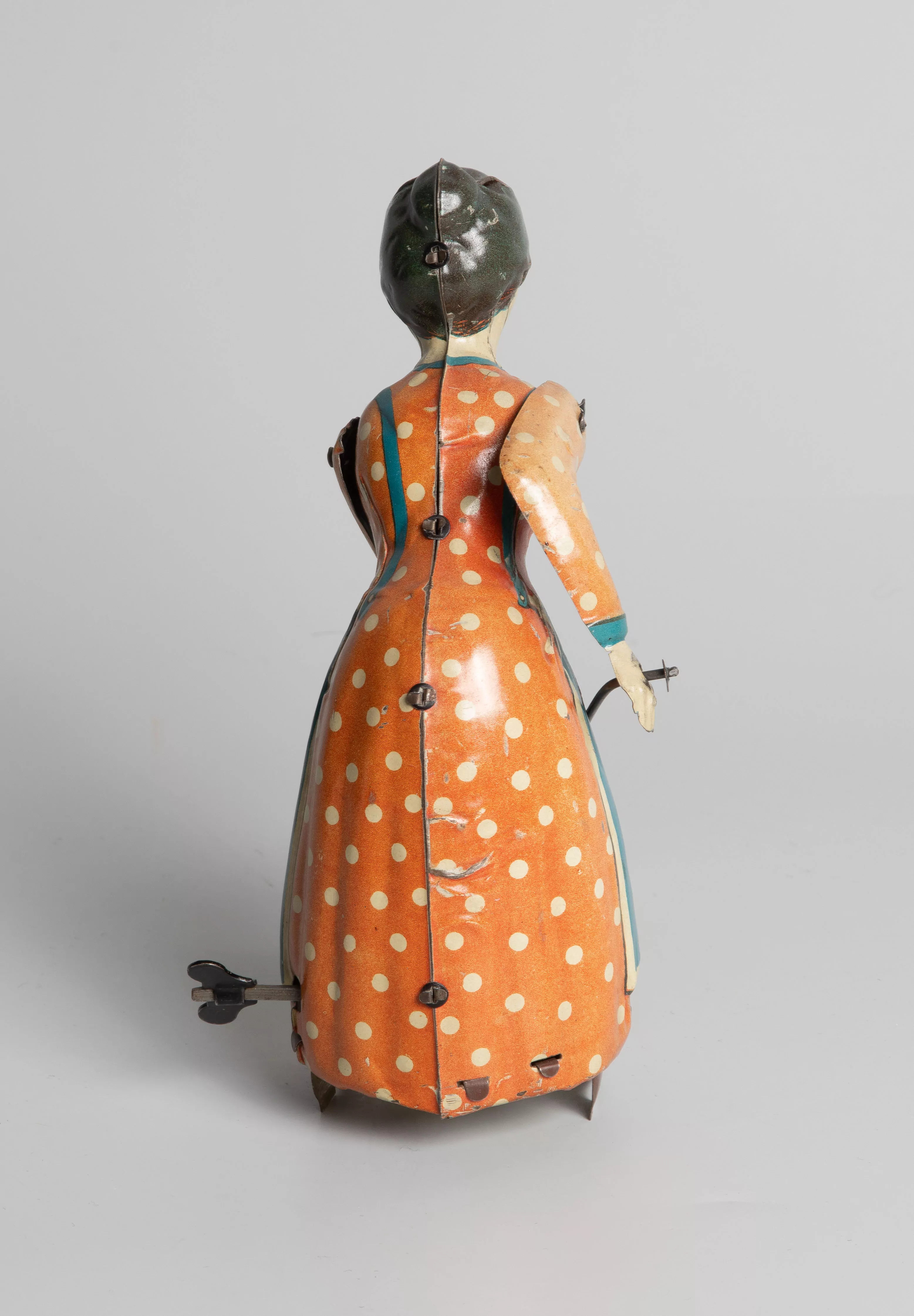 Deutschland, um 1920/30. Am Boden bezeichnet: "BUSY LIZZIE, made in Germany". Blech, farbig lackiert und lithographiert. Frau mit Teppichkehrer. Uhrwerkantrieb. H 17,5 cm. Puppenstuben-Teppich assortiert.