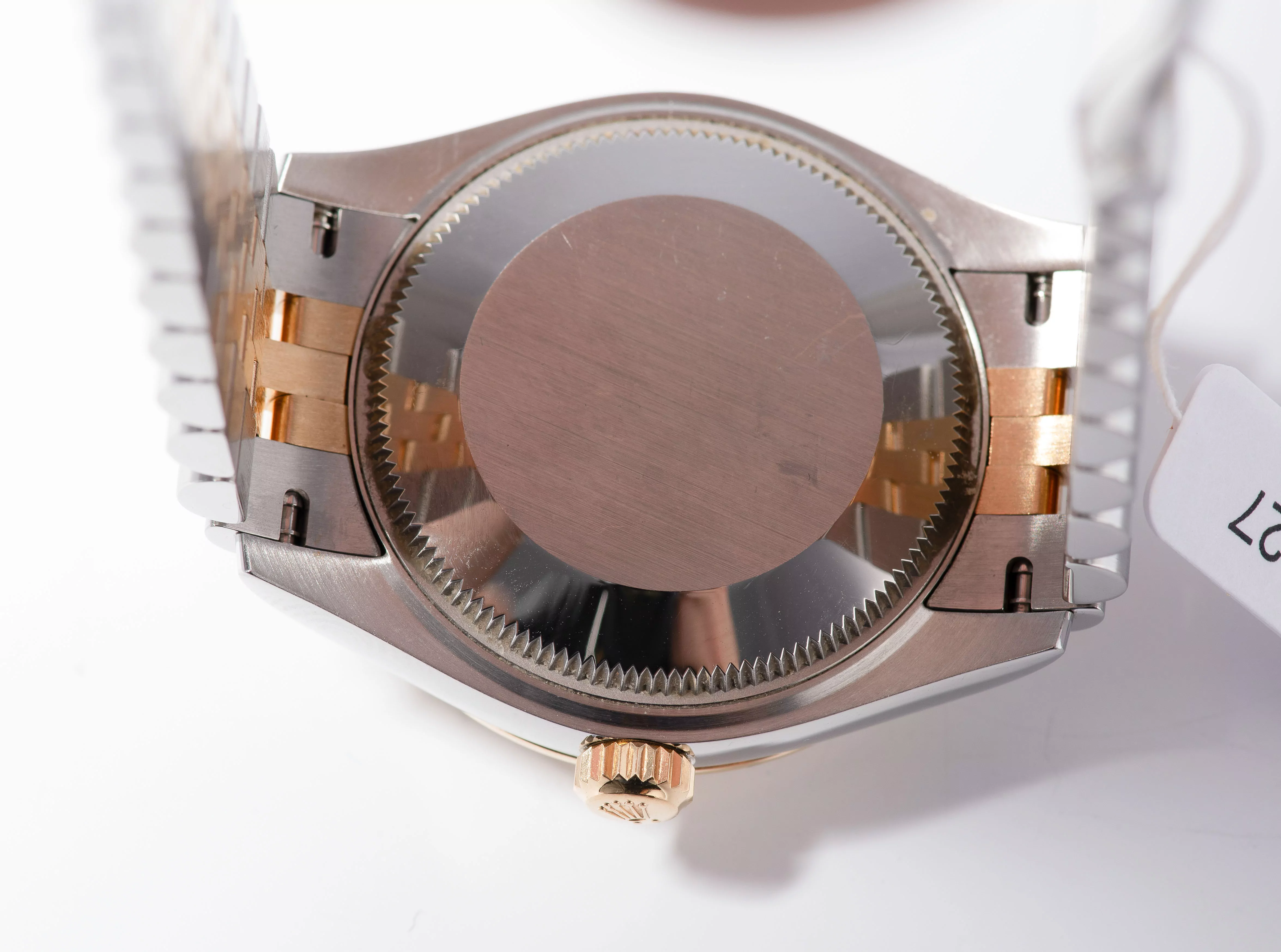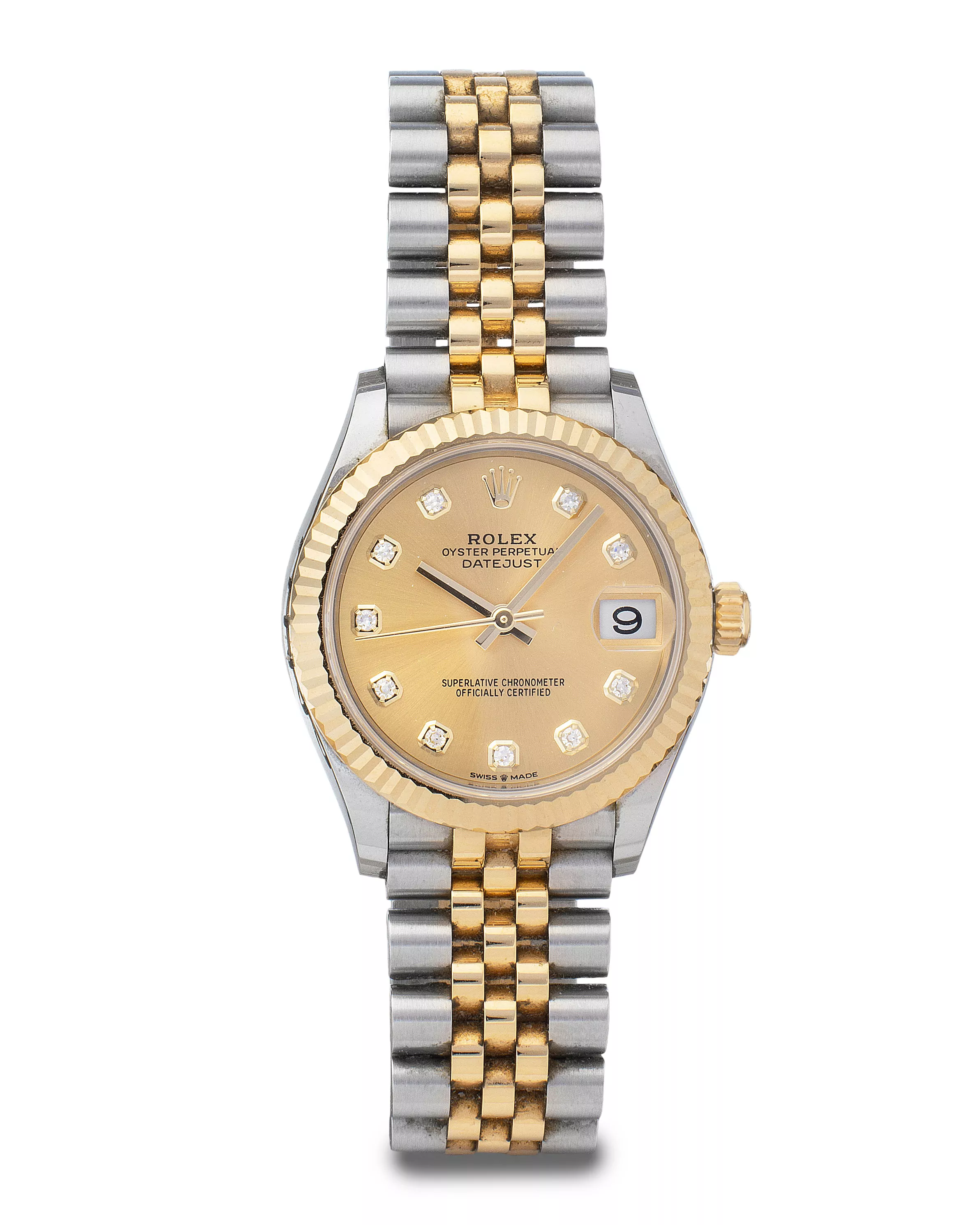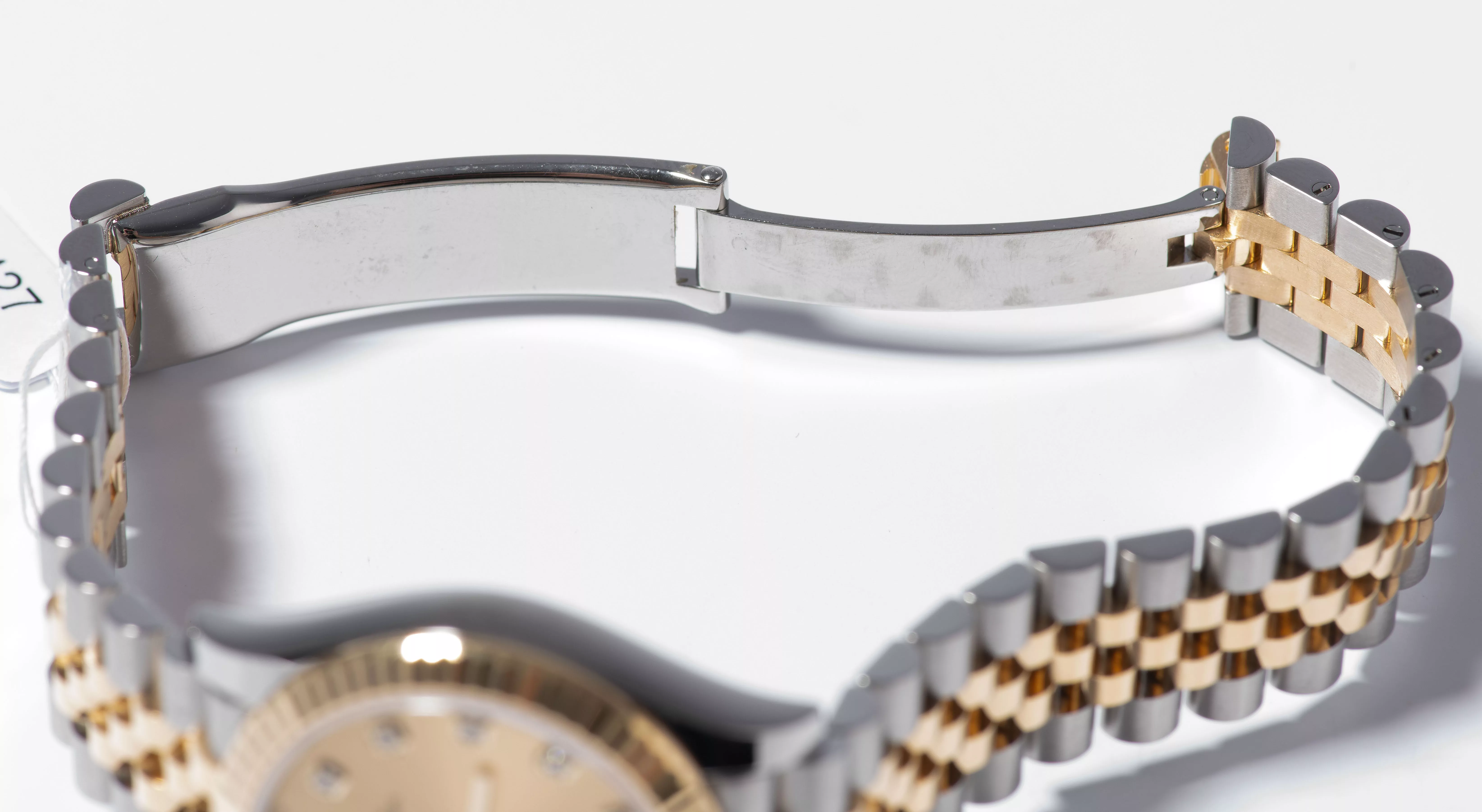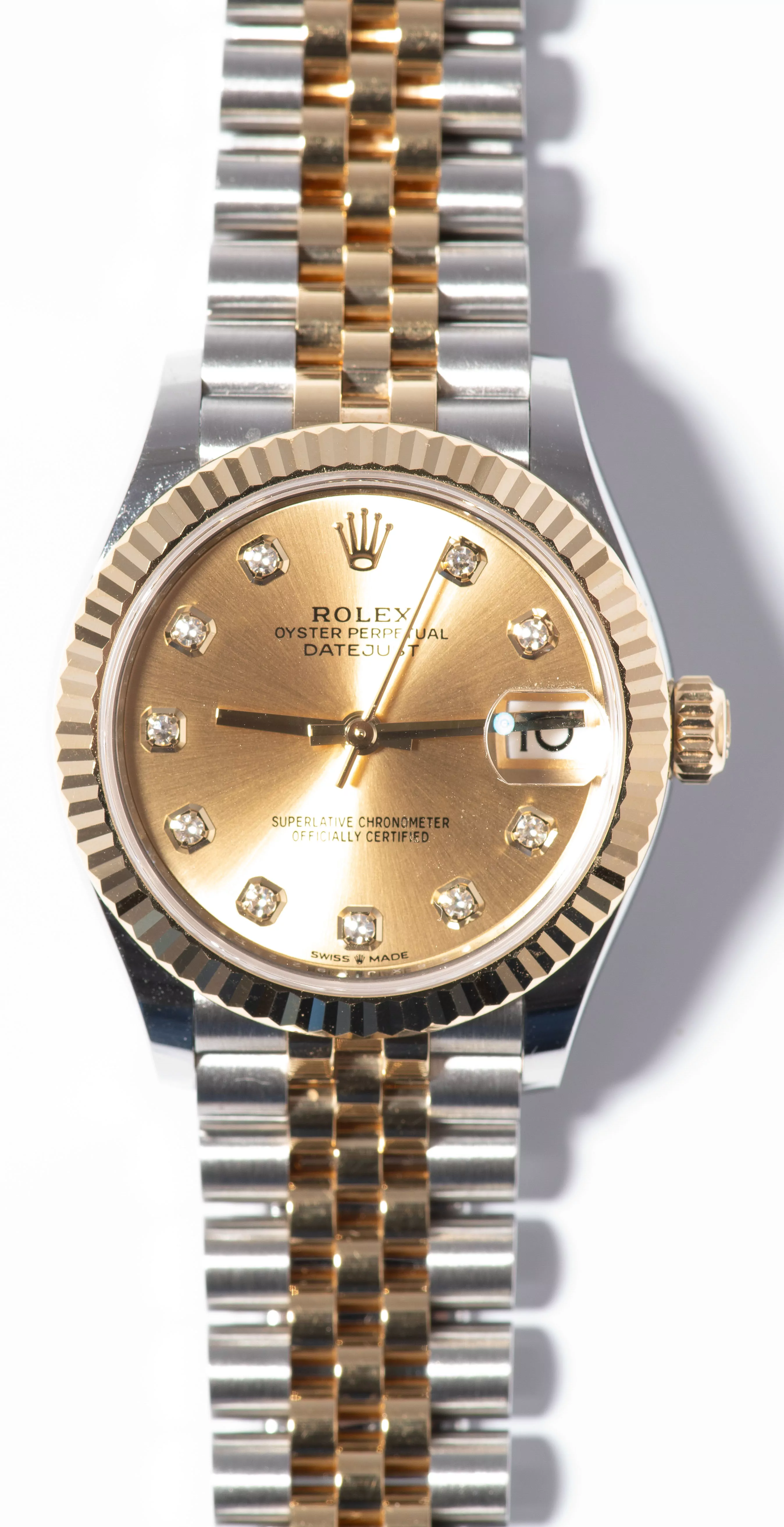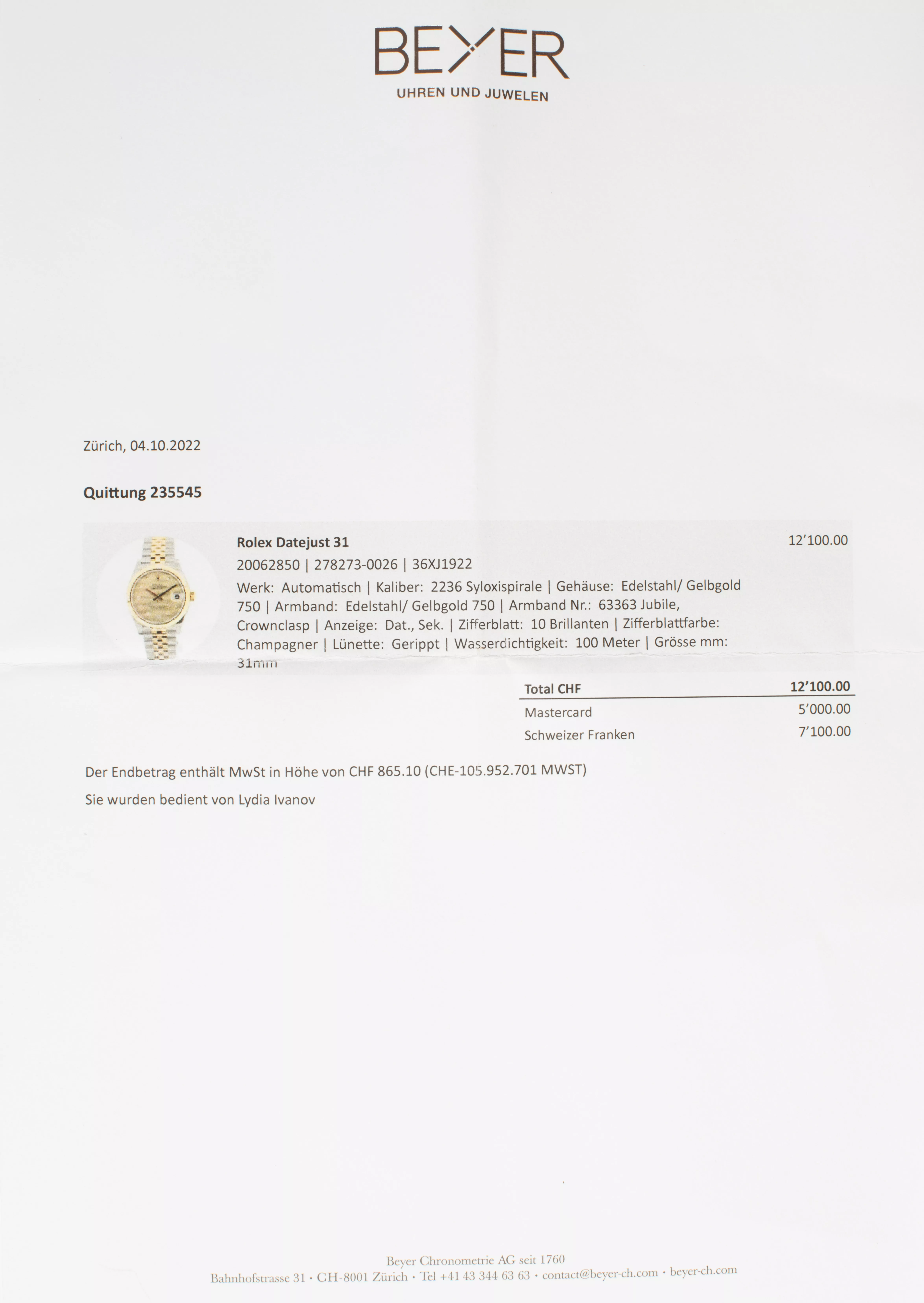 Ref. 278283. Serien Nr. 36XJ1922. Gelbgold/Edelstahl. Gehäuse 30 mm, geriffelte Lünette. Automatik Kal. 2236. Champagnerfarbenes Zifferblatt mit Radialschliff, aufgesetzten Diamant-Indizes, Stabzeigern und Zentralsekunde. Datum bei 3 Uhr. Saphirglas mit Zykloplupe. Bicolor Jubilee-Band mit Faltschliesse. Funktionstüchtig. Neuwertig. Mit Rechnung von Beyer und Zertifikat und Box vom Oktober 2022.