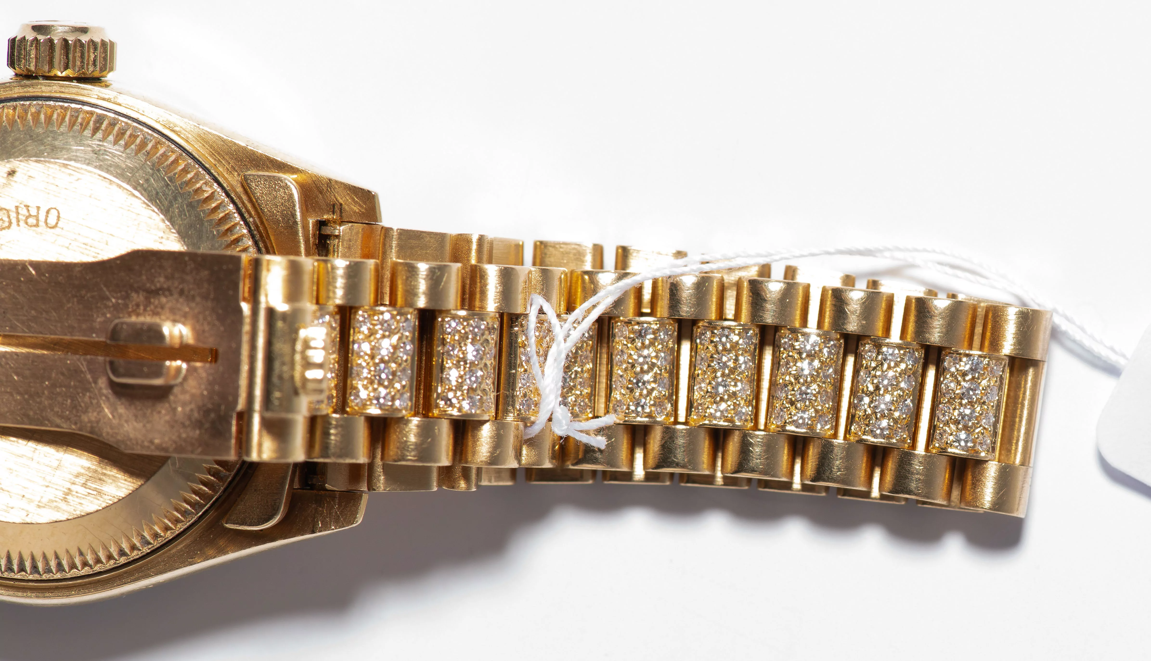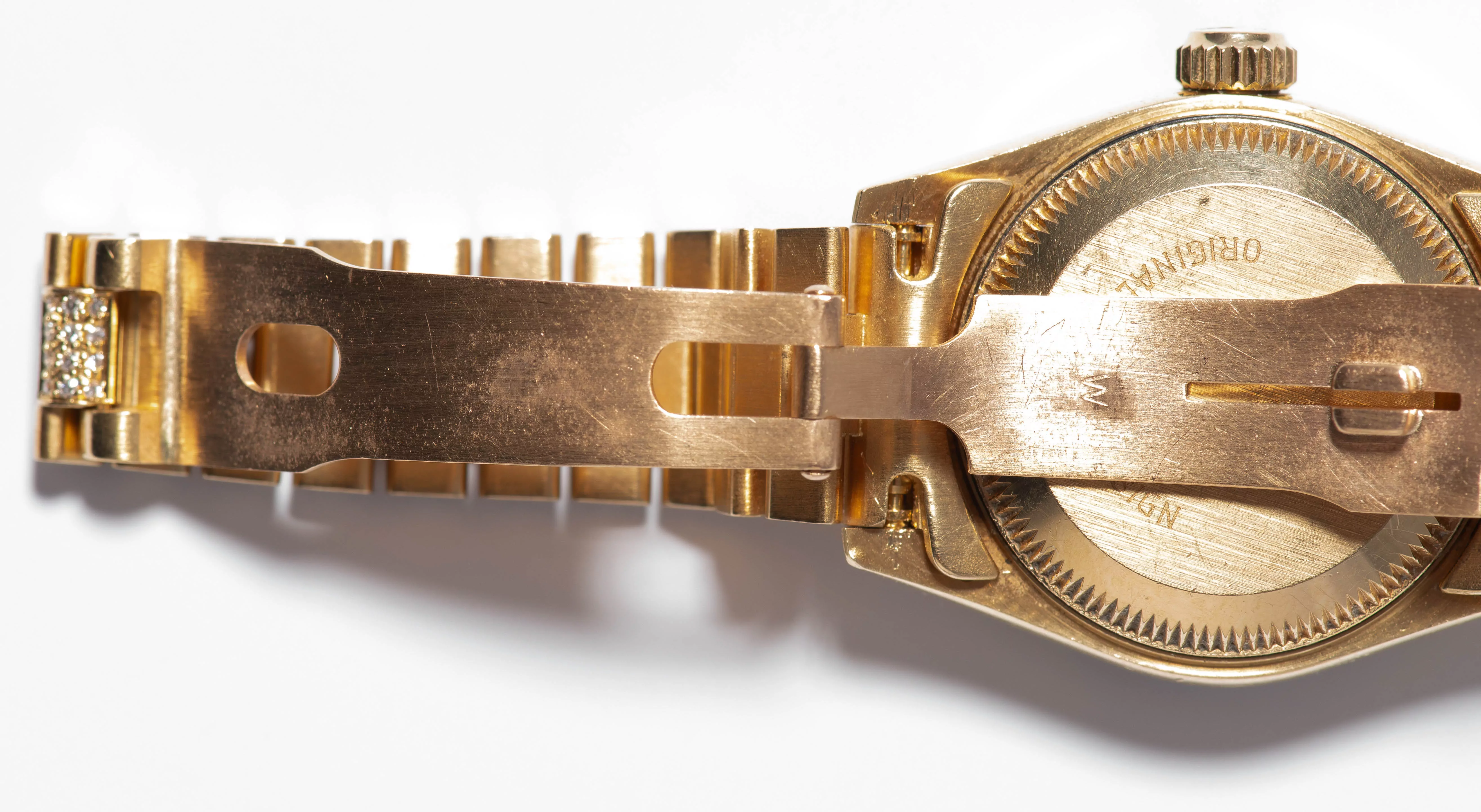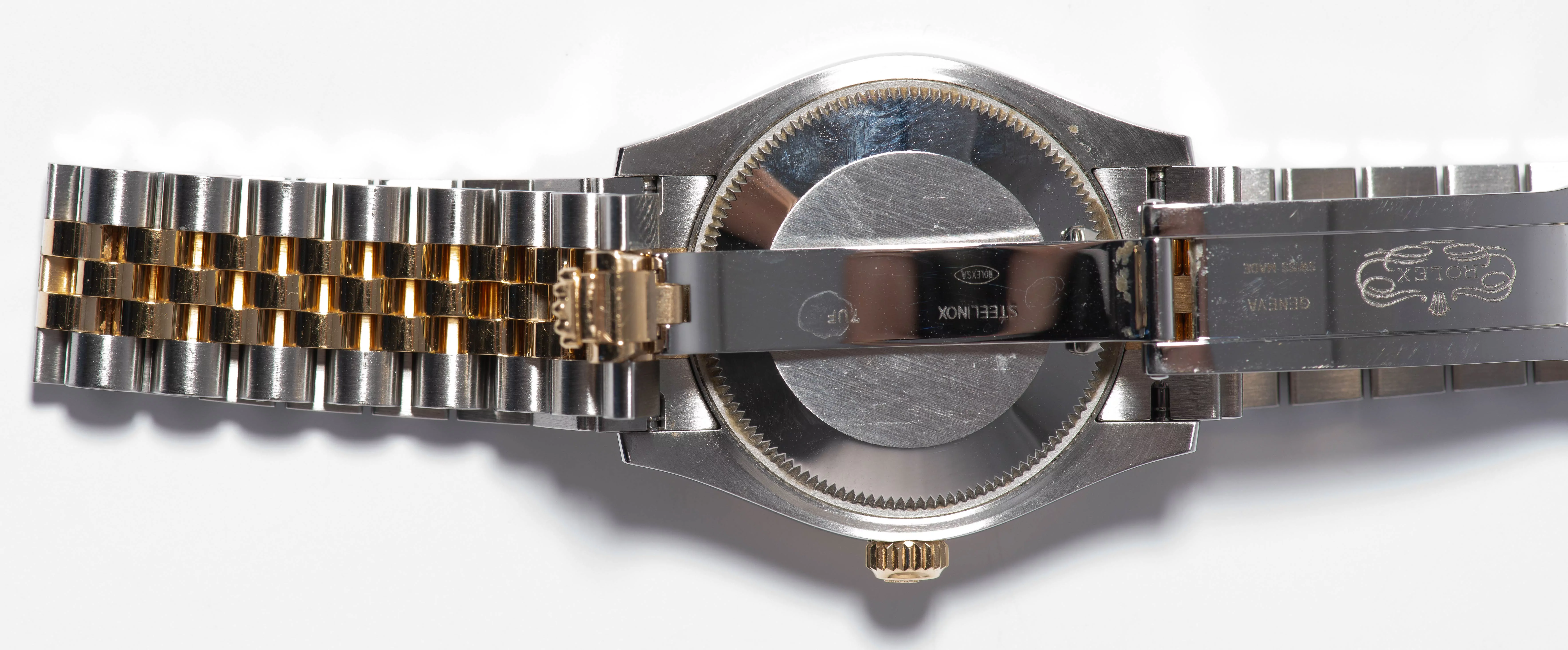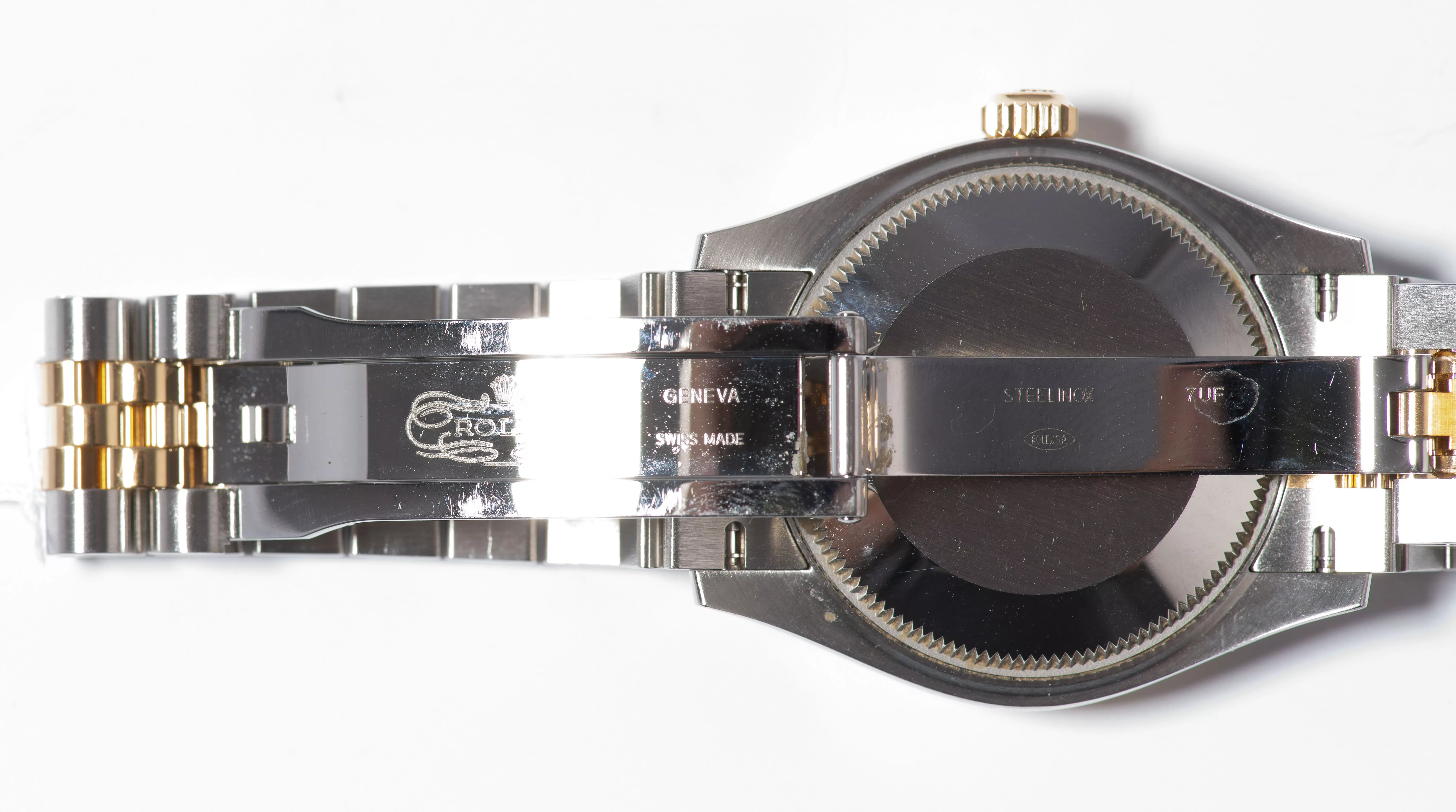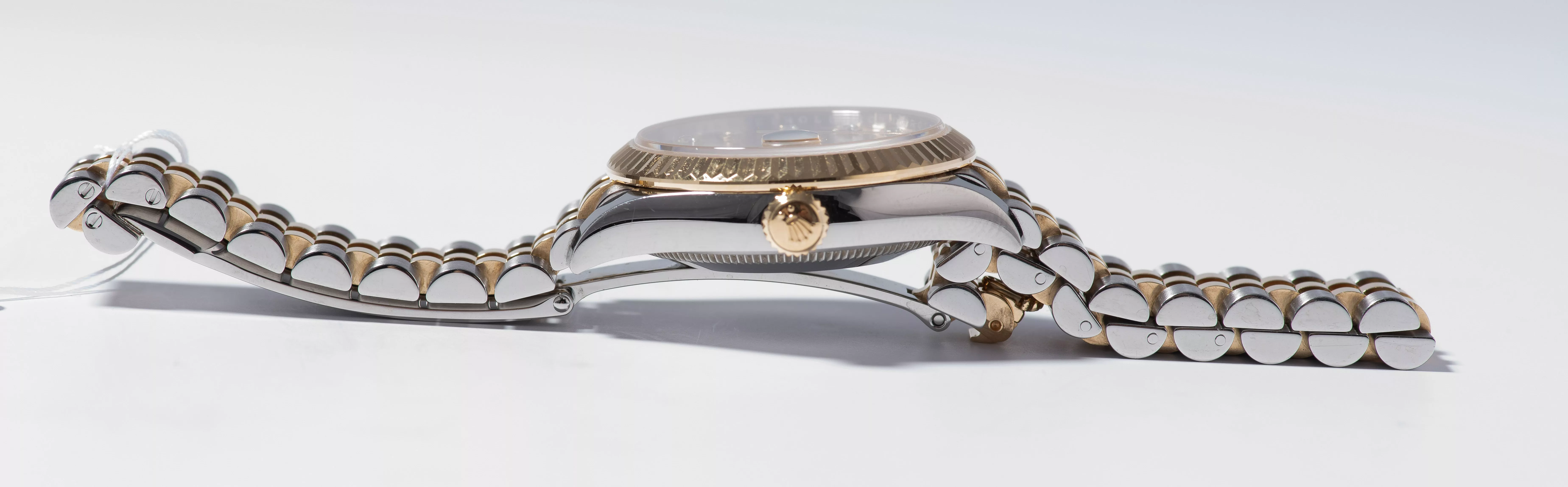 Ref. 278283. Serien Nr. 36XJ1922. Gelbgold/Edelstahl. Gehäuse 30 mm, geriffelte Lünette. Automatik Kal. 2236. Champagnerfarbenes Zifferblatt mit Radialschliff, aufgesetzten Diamant-Indizes, Stabzeigern und Zentralsekunde. Datum bei 3 Uhr. Saphirglas mit Zykloplupe. Bicolor Jubilee-Band mit Faltschliesse. Funktionstüchtig. Neuwertig. Mit Rechnung von Beyer und Zertifikat und Box vom Oktober 2022.