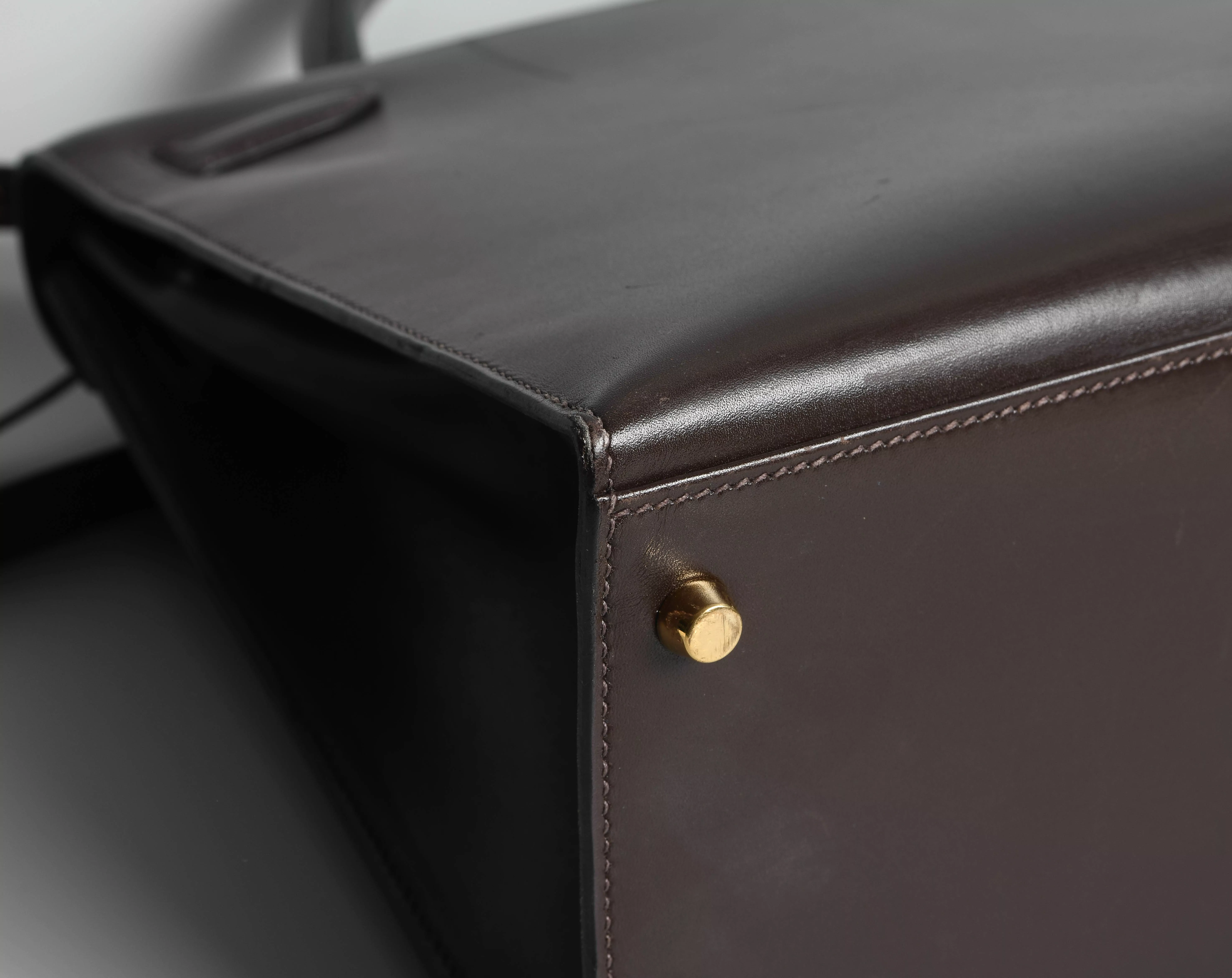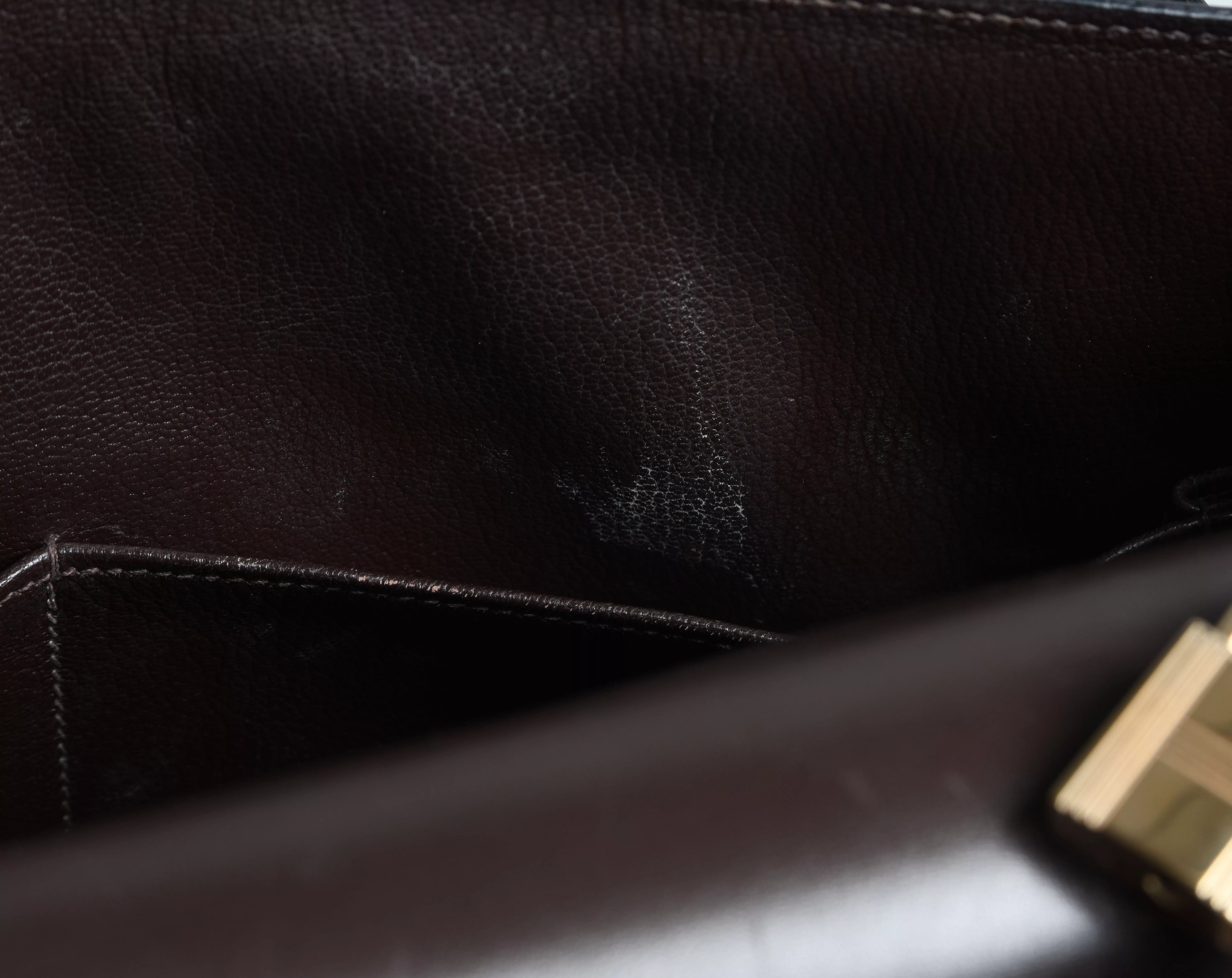 2006. Aus dunkelbraunem Glattleder. Goldfarbene Metallbeschläge. Schloss und Clochette mit zwei Schlüsseln. Abnehmbarer Schulterriemen. Mit Schutzbeutel. 35x25x13 cm.