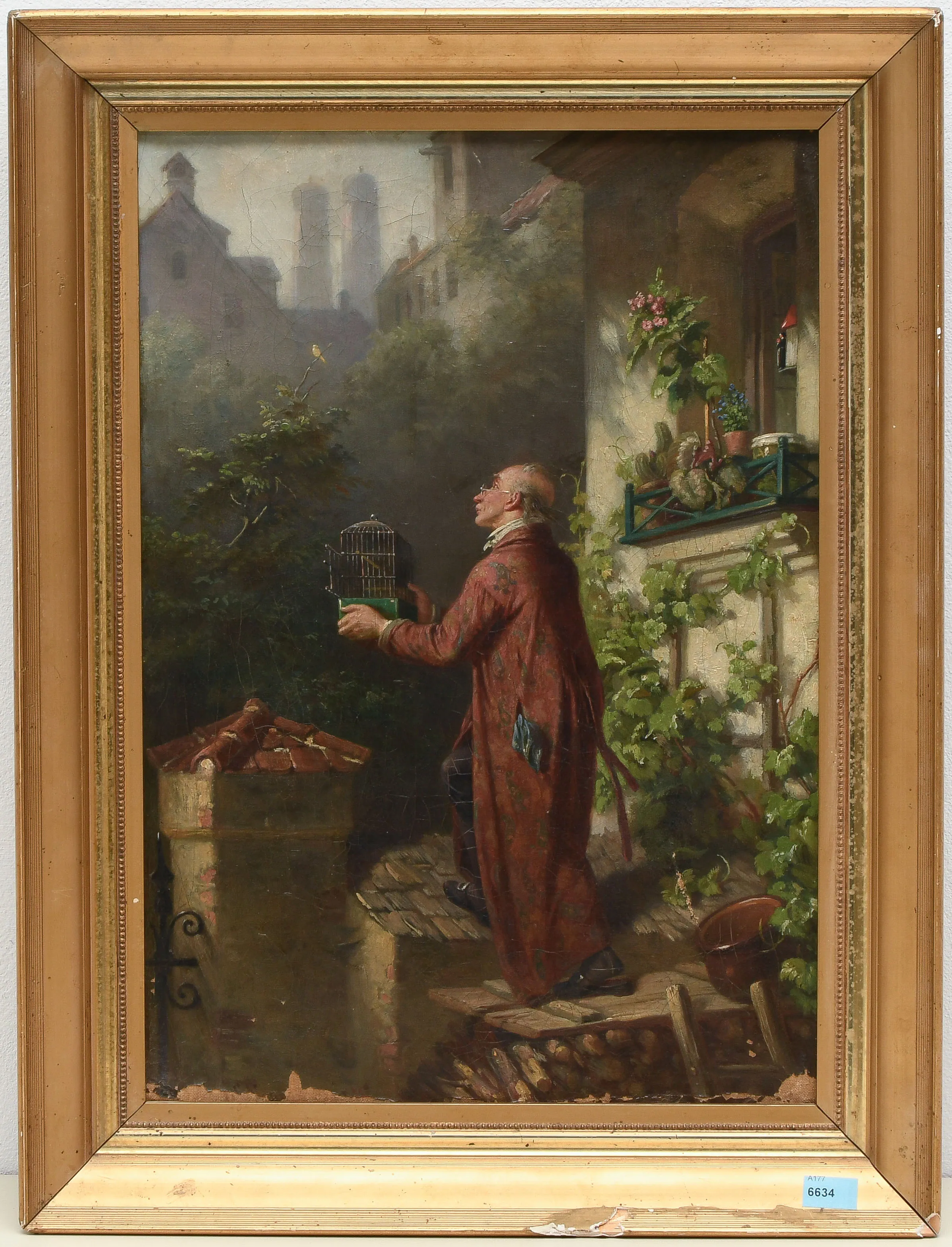 Der entflogene Kanarienvogel. Öl auf Leinwand. Unten links Reste einer Signatur und allenfalls Datierung. Verso altes Galerienetikett der Jordan, Marsh & Co, Boston. 47x33 cm. Gerahmt.