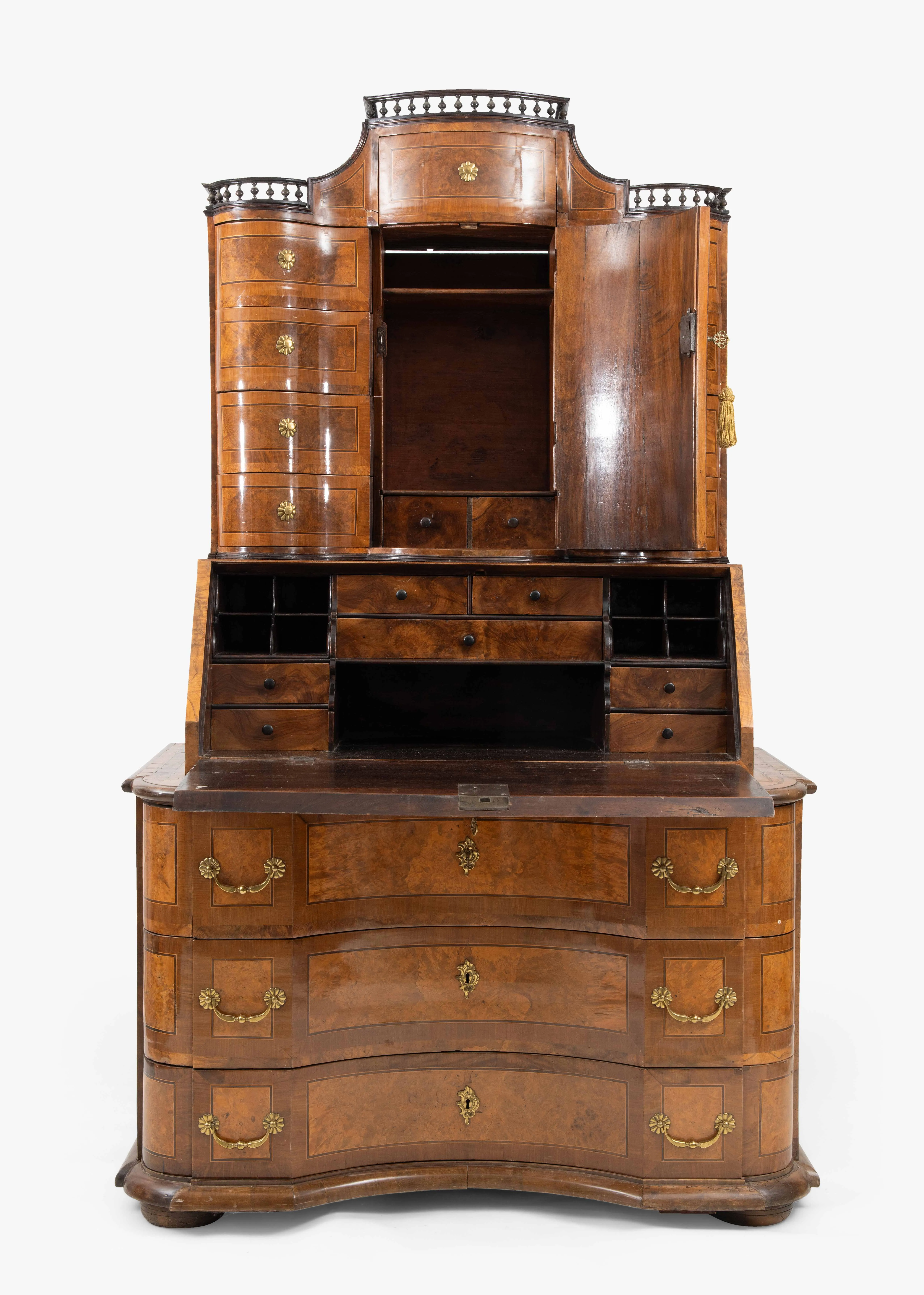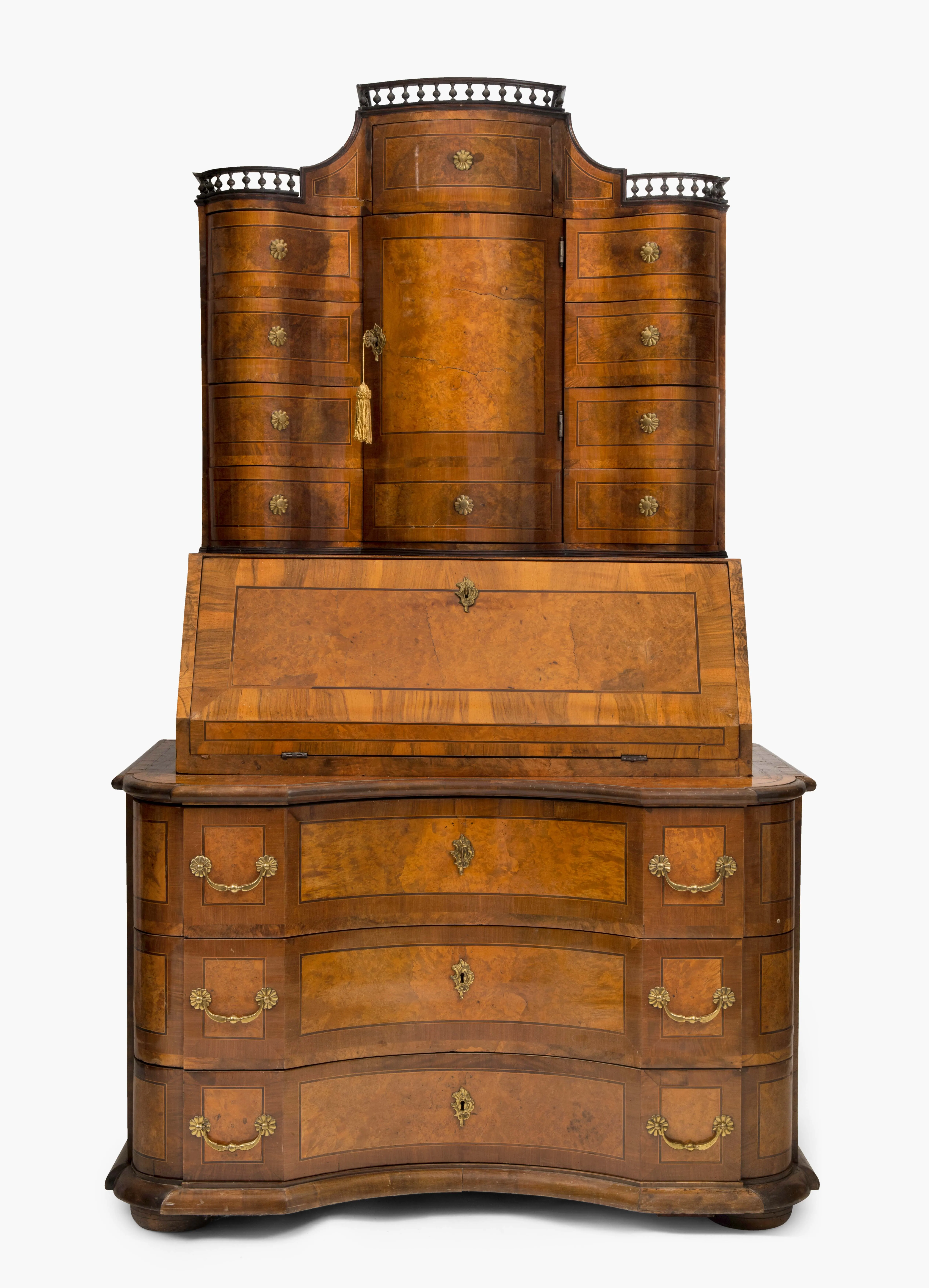 Bern, Mitte 18.Jh. Nussbaum- und Maserholz furniert. Kommode mit dreischübiger, geschweifter Front und Scheintraversen. Sockel und Blatt mit Wulstprofilen. Geschrägte, aufklappbare Schreibplatte. Innen sieben Schubladen und Fächer. Schubladenaufsatz mit zentraler, gebauchter Türe. Zehn Schubladen, innen zwei kleine Schubladen und Fächer. Geschweifter Giebel mit umlaufender Balustergalerie. Messingbeschläge. 124 x 73, Höhe 210 cm.