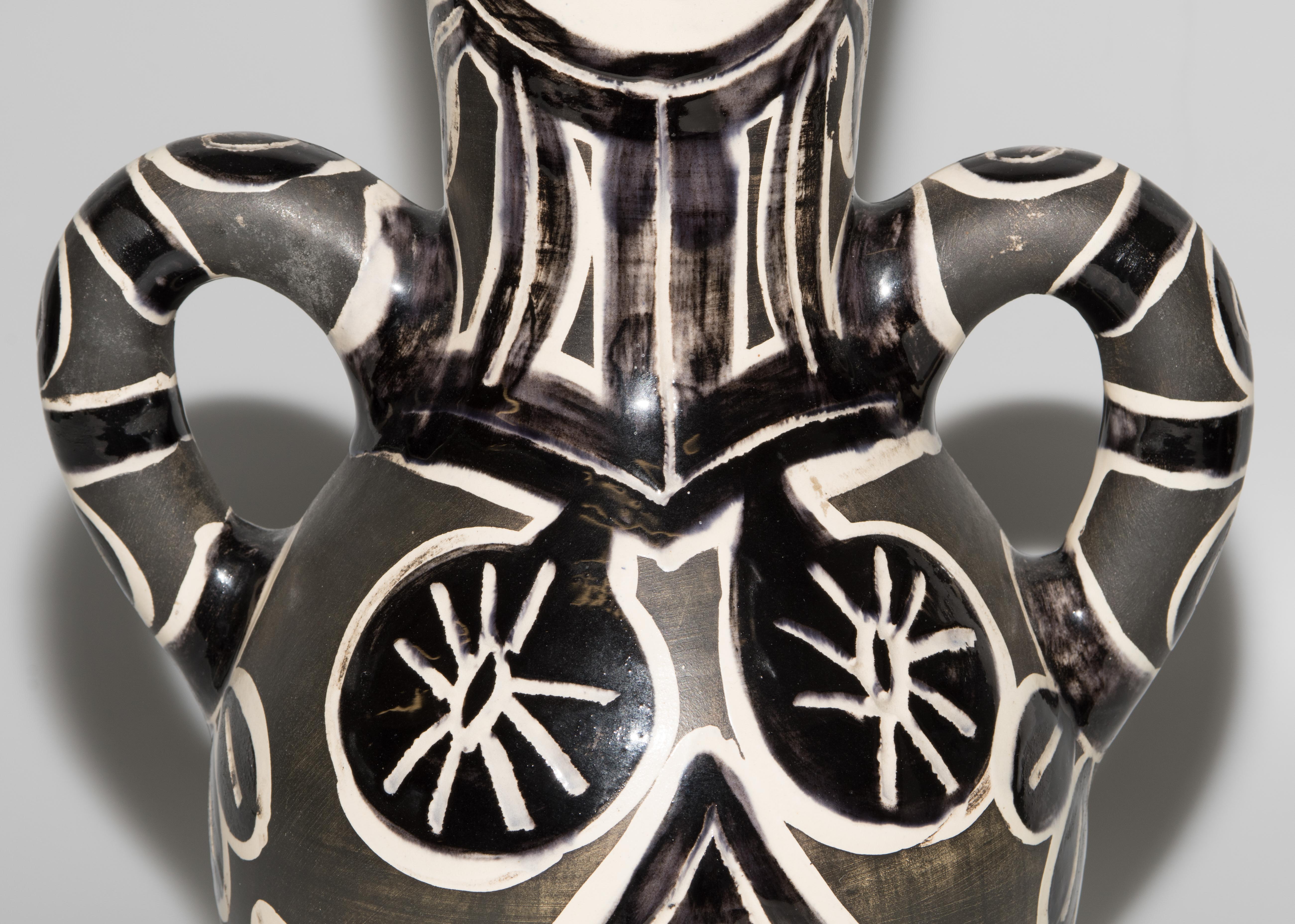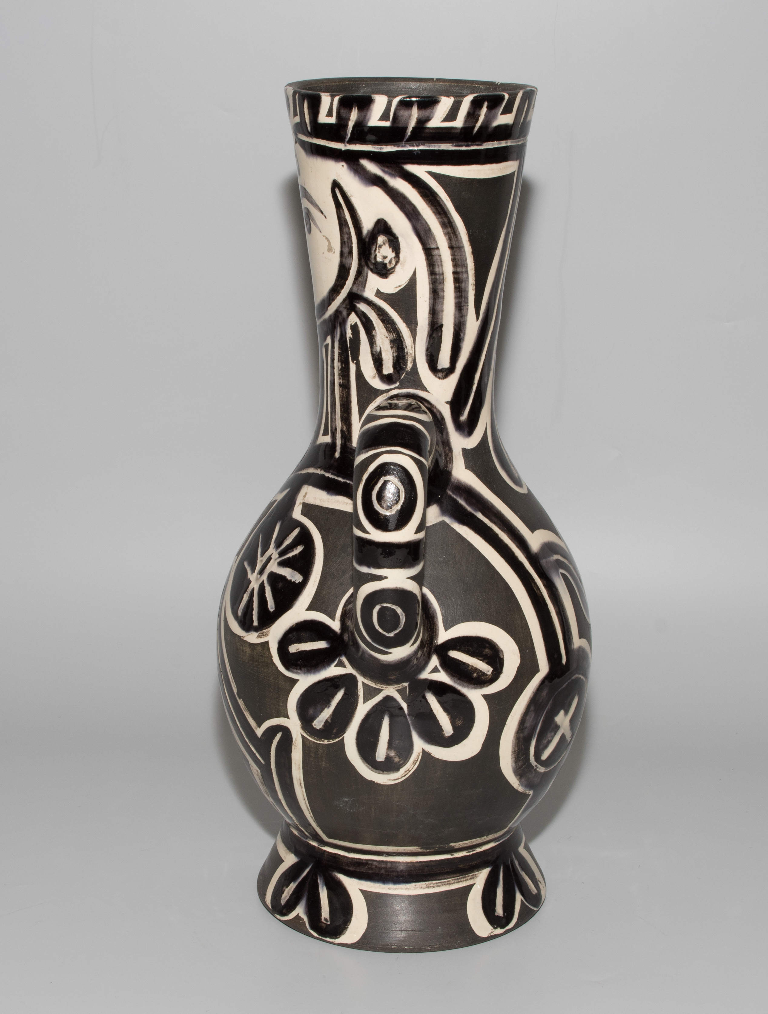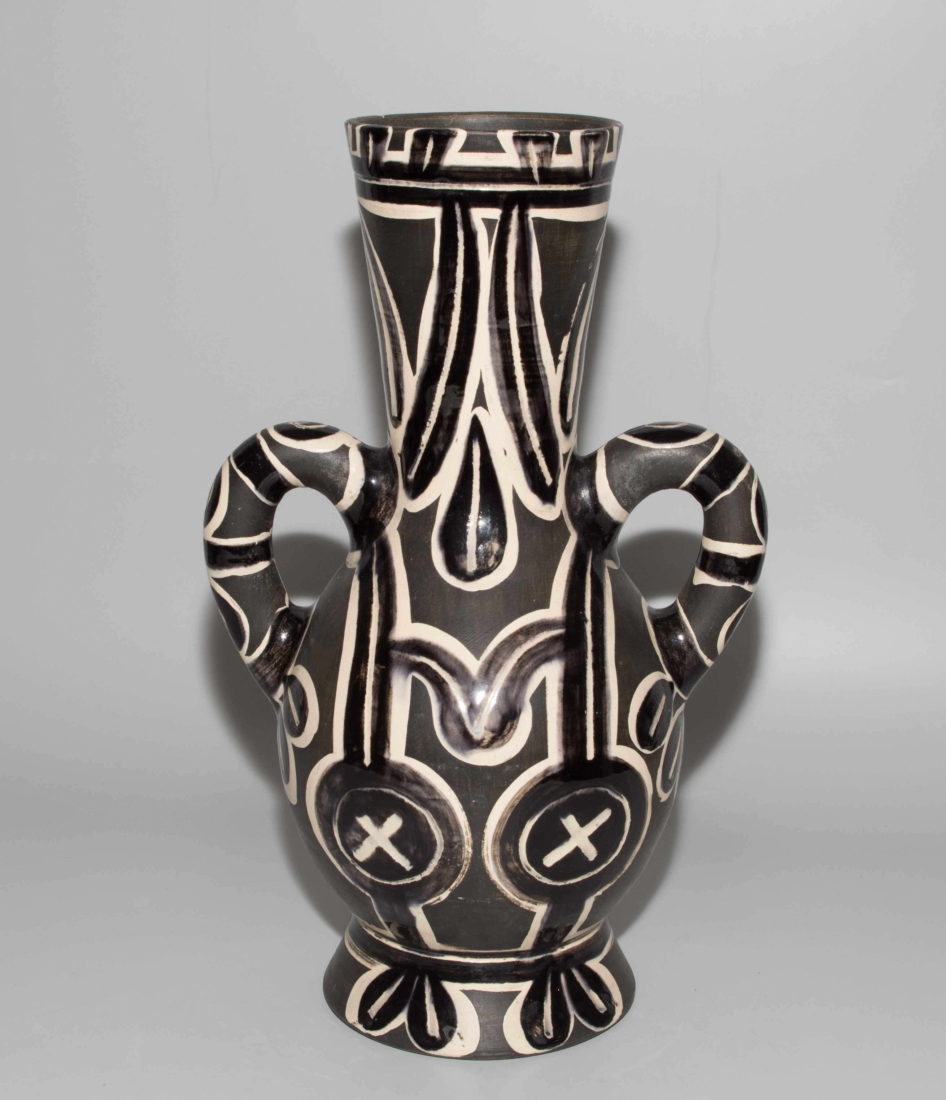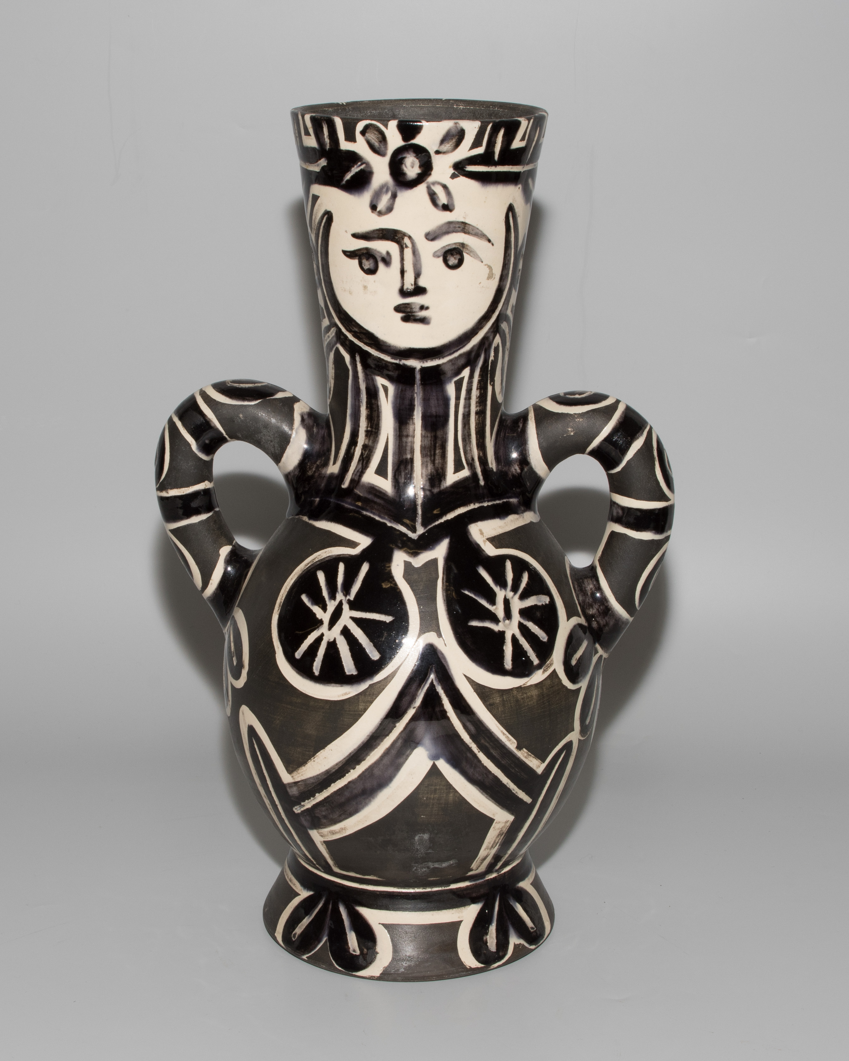"Vase with two high handles". 1953. Keramikvase. Auf dem Boden bezeichnet: "Edition Picasso" und mit Stempel: "Edition Picasso" und "Madoura feu". Eines von 400 Exemplaren. H 39 cm. -Patina.