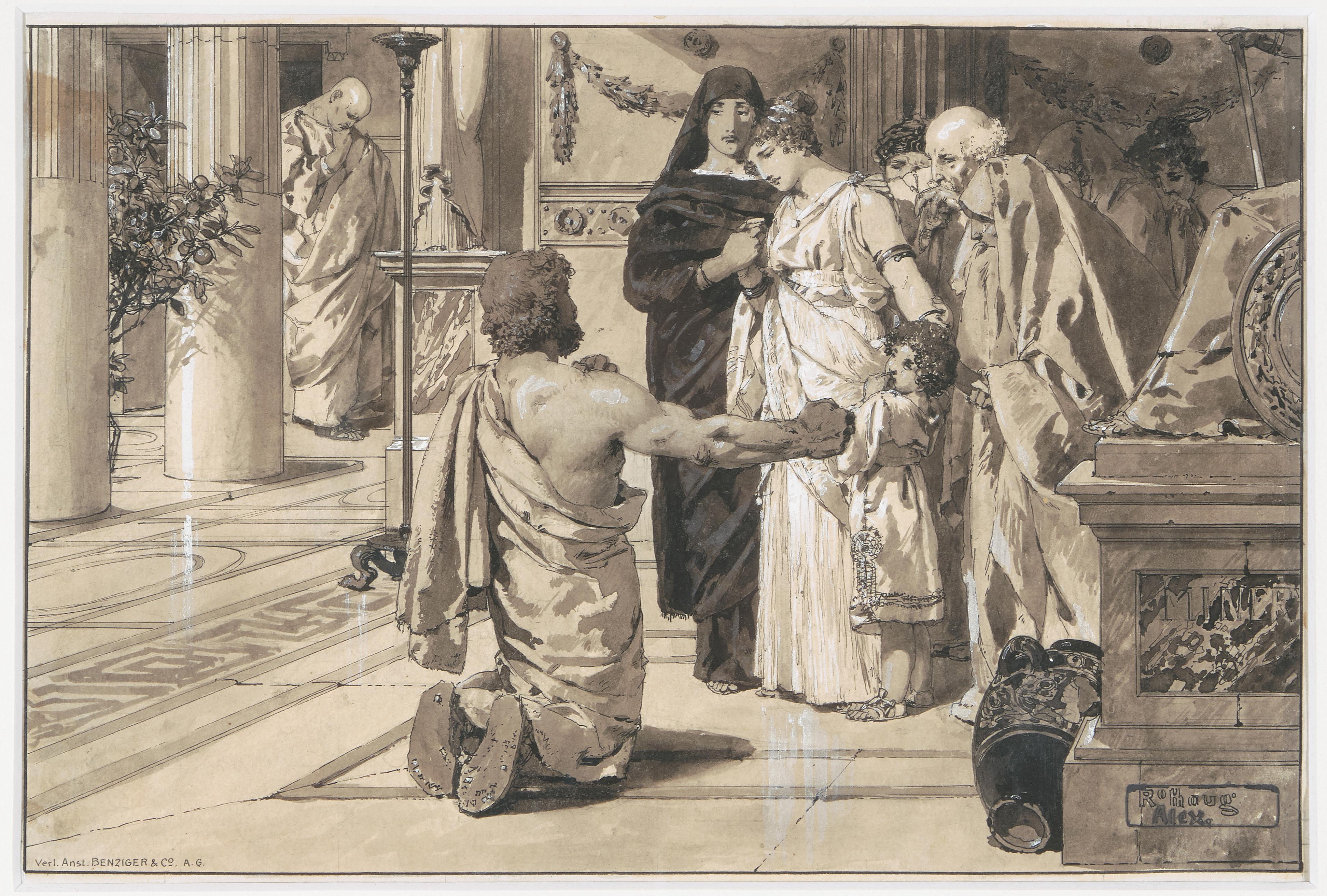 Ursus bittet Pomponia darum, Lygia beschützen zu dürfen. Tuschfederzeichnung, laviert und weiss gehöht. Unten rechts signiert. 19,3x29,3 cm. Gerahmt.