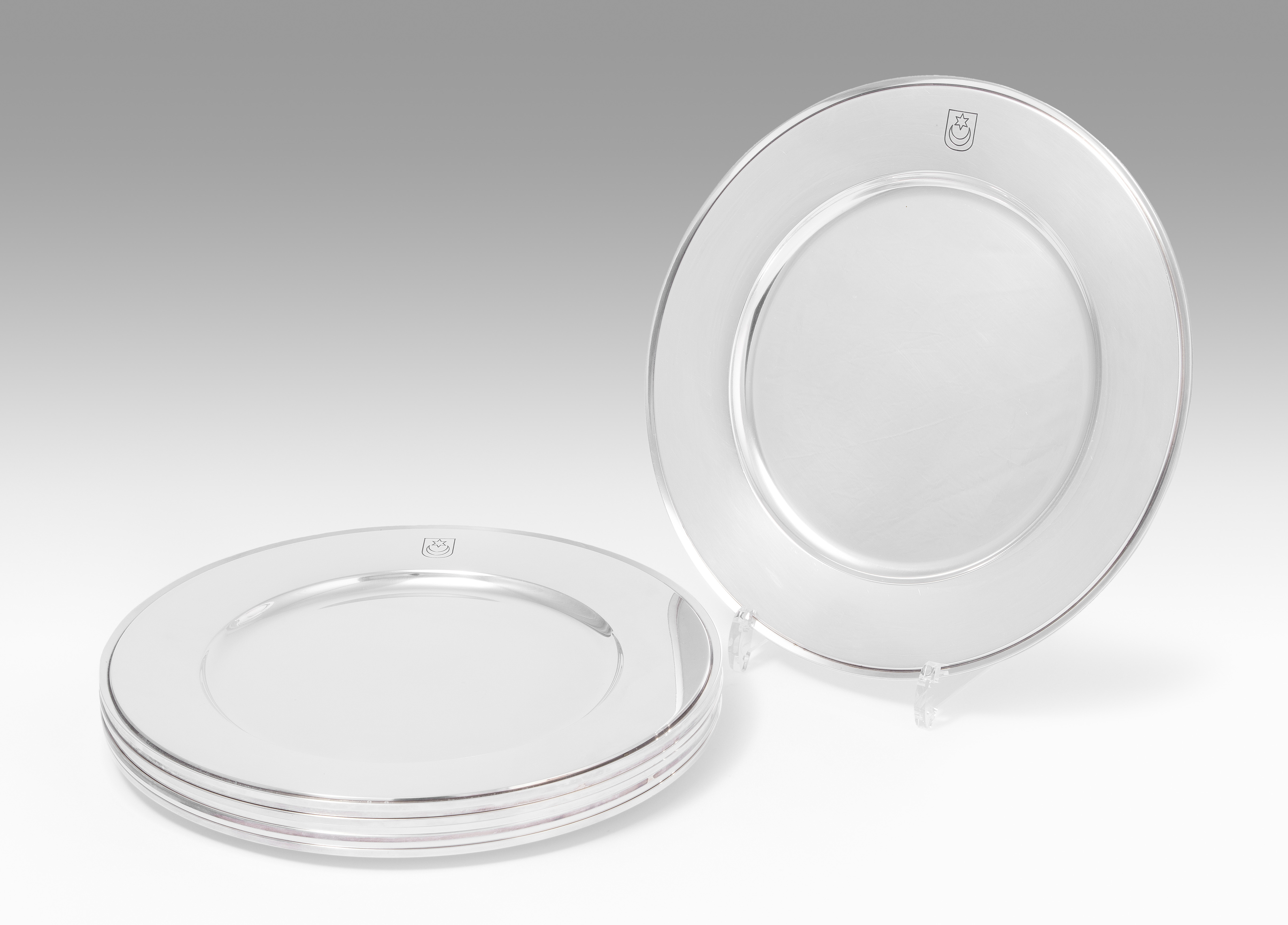Dänemark, 2. Hälfte 20.Jh. Silber. Herstellermarke Georg Jensen, Design Harald Nielsen, "Pyramide", Nr. 600 Y. Blanke Rundformen, Fahne mit Wappen-Gravur. Hersteller-, Meistermarke, Feingehalt 925. D 28 cm, zus. ca. 4760 g.