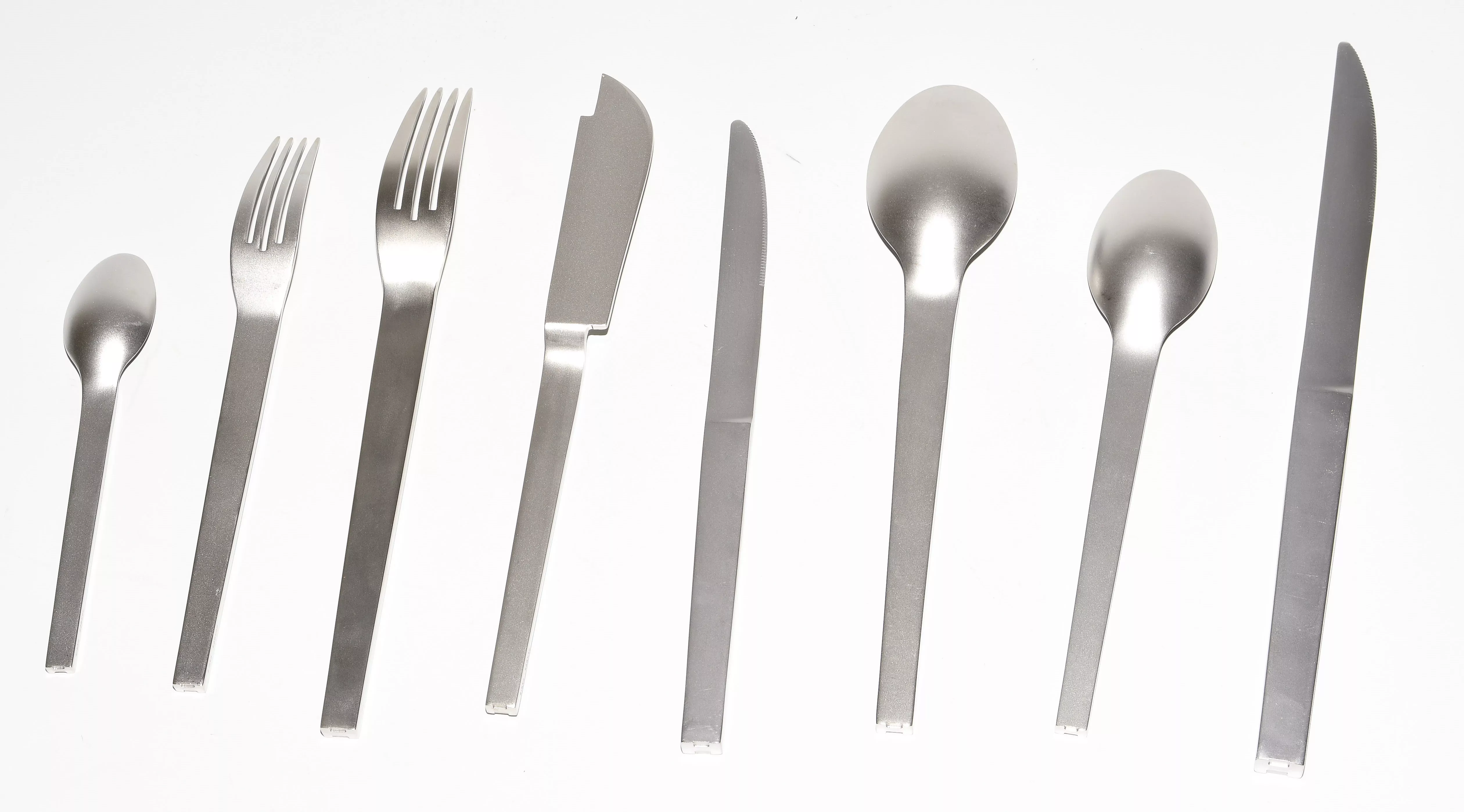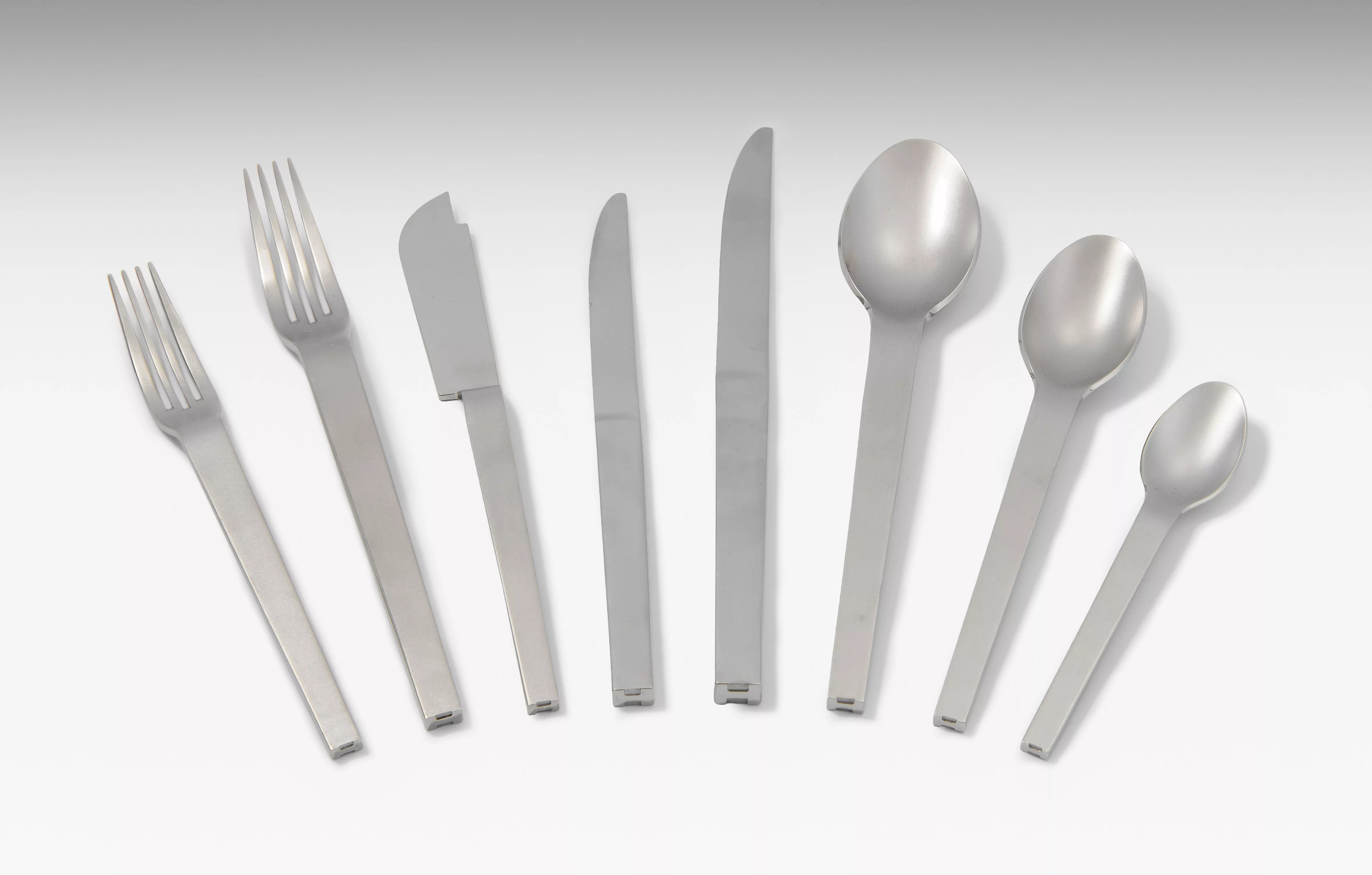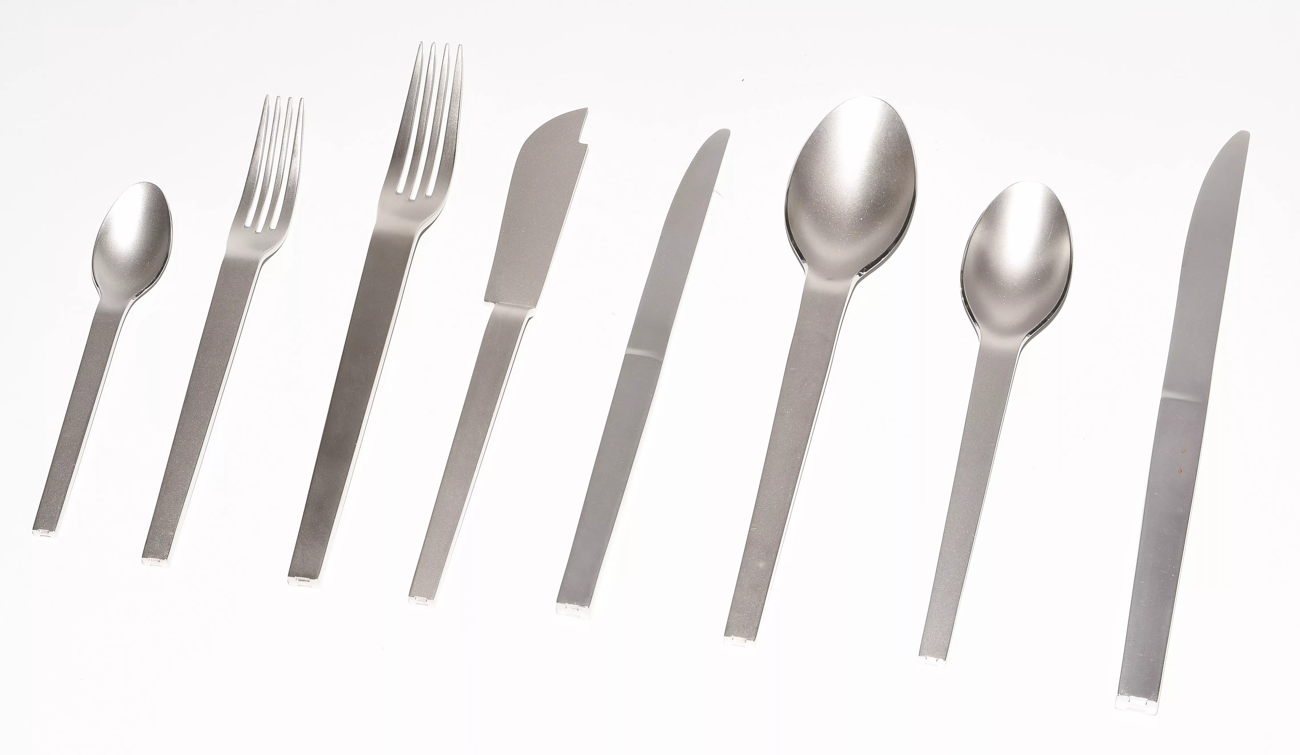 2.Hälfte 20.Jh. Edestahl, poliert. Bestand: 8 Mokkalöffel, 8 Dessertlöffel, 8 Suppenlöffel, 8 Tafelmesser, 8 Dessertmesser, 8 Fischmesser, 8 Tafelgabeln, 8 Dessertgabeln. Mit Originalverpackung. Total 64 Teile.