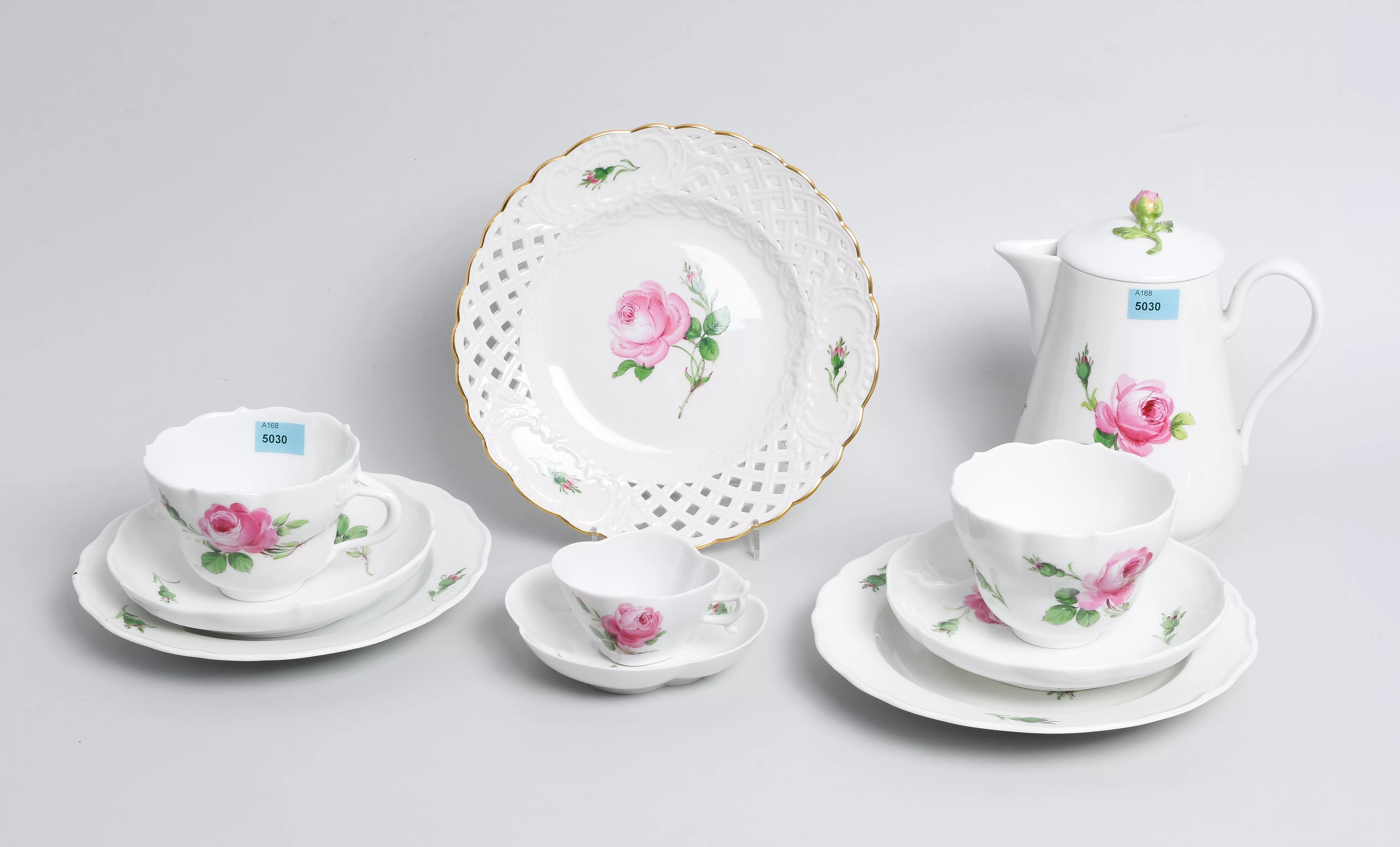Um 1900. Porzellan. Unterglasurblaue Schwertermarke mit Knäufen und ohne Knäufe. Dekor "Rote Rose". Bestand: 1 Kanne, 2 Gedecke, 1 Mokkatasse mit Untertasse (mit Chip), 1 Teller mit Durchbruchdekor. H (Tasse) 5,5 cm.
